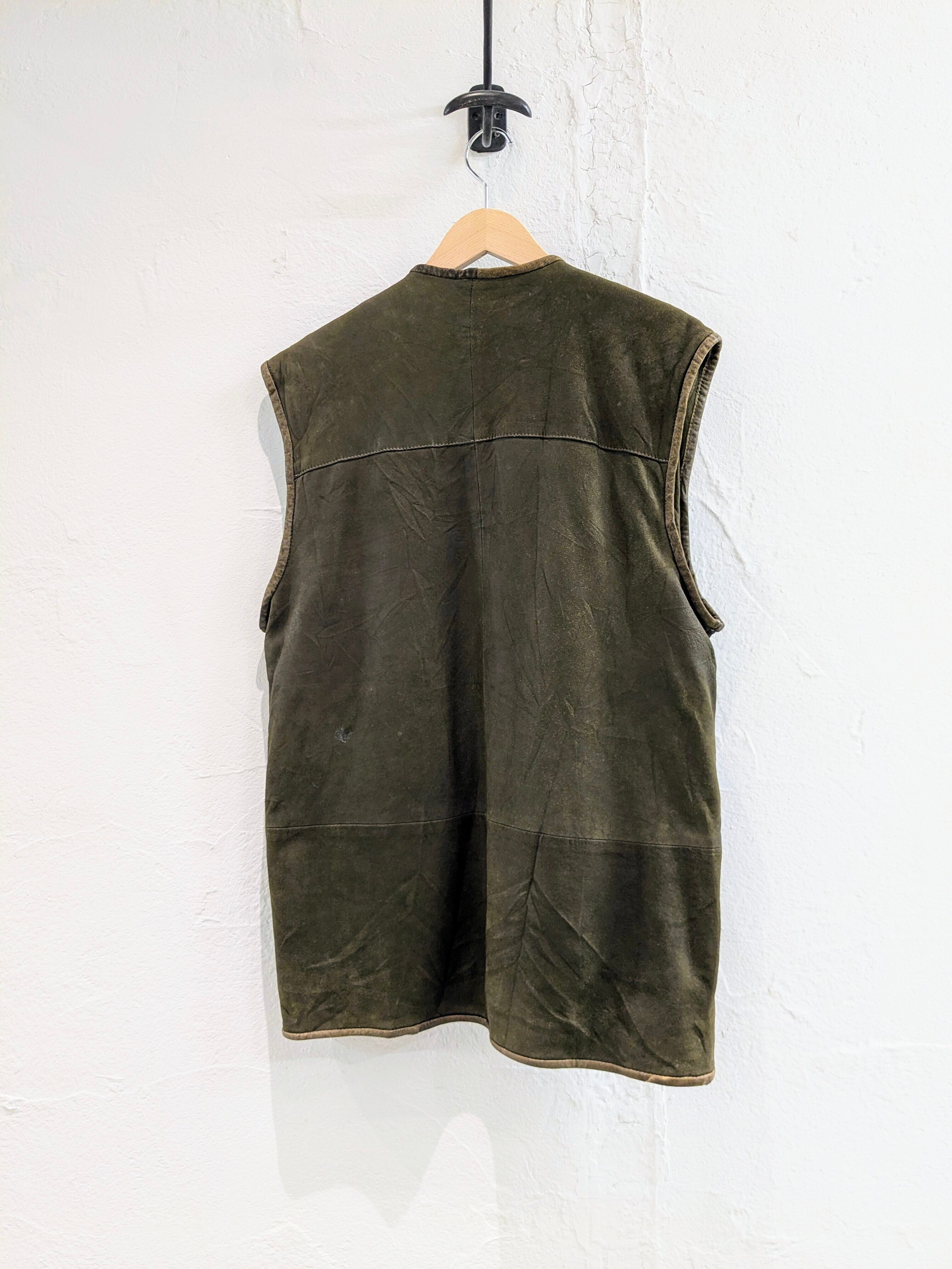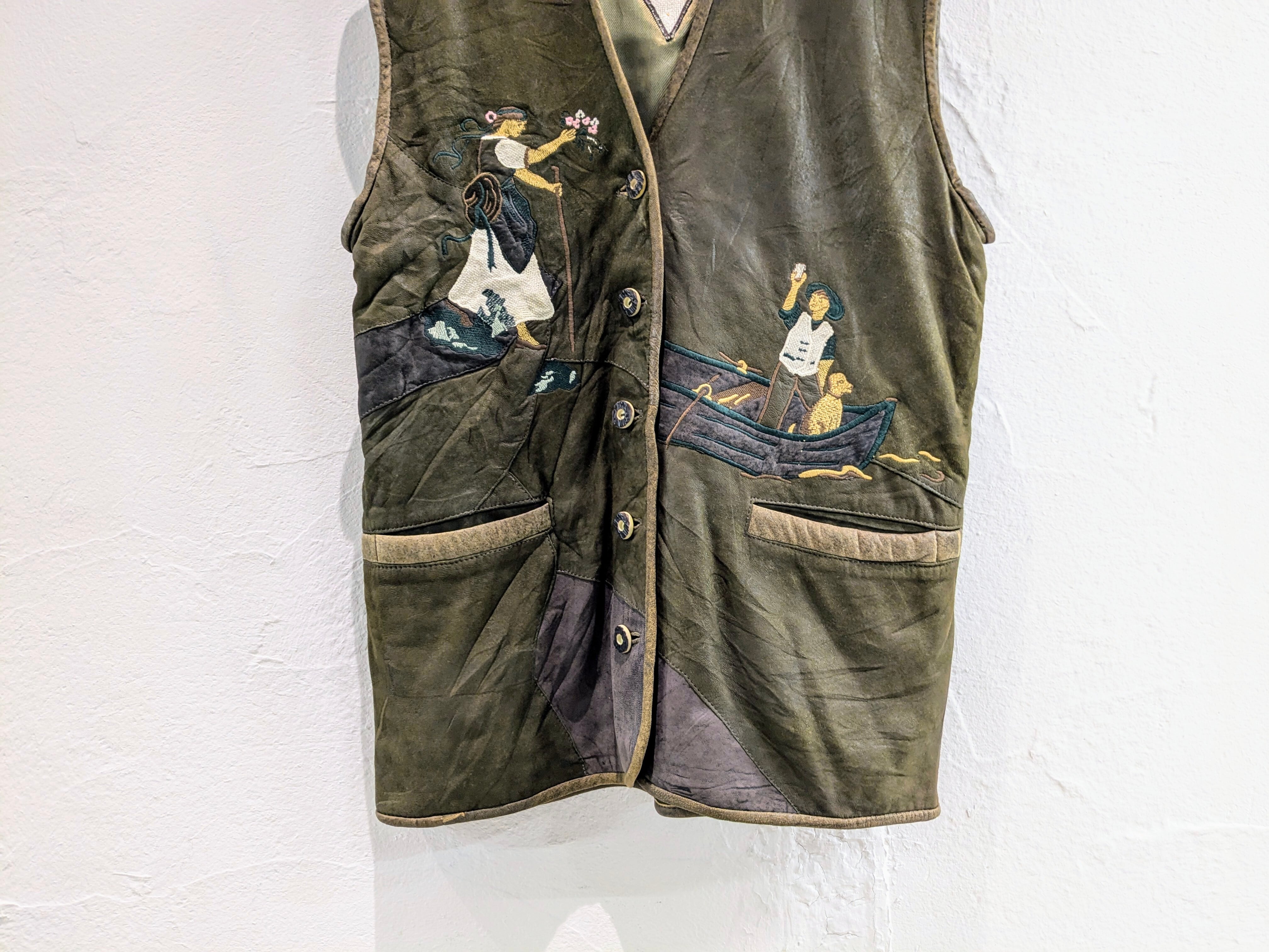 Echtes leder(エヒテス レーダァ)は、メンズ向けのドイツのレザーウェアブランドです。ユーロレザーウェアでよく見られる「Echt leder 本革表記」の刻印と品質表記が特徴です。しっかりと肉厚のレザーに対して、繊細な刺繍がとても綺麗に入った一着。腕周りなども大きく開いているので、アウター、ジャケットなどの上から羽織るのもいいかと。