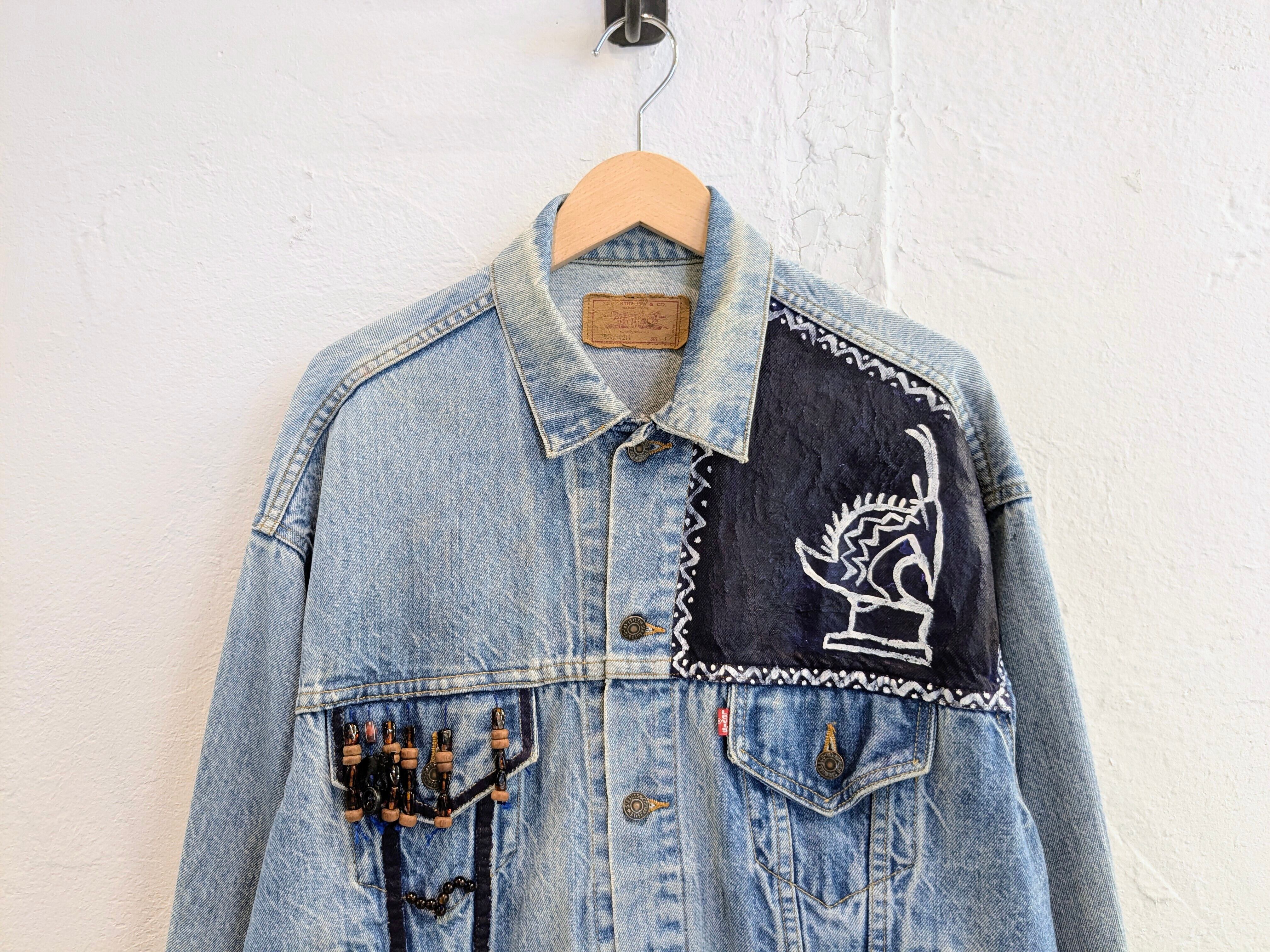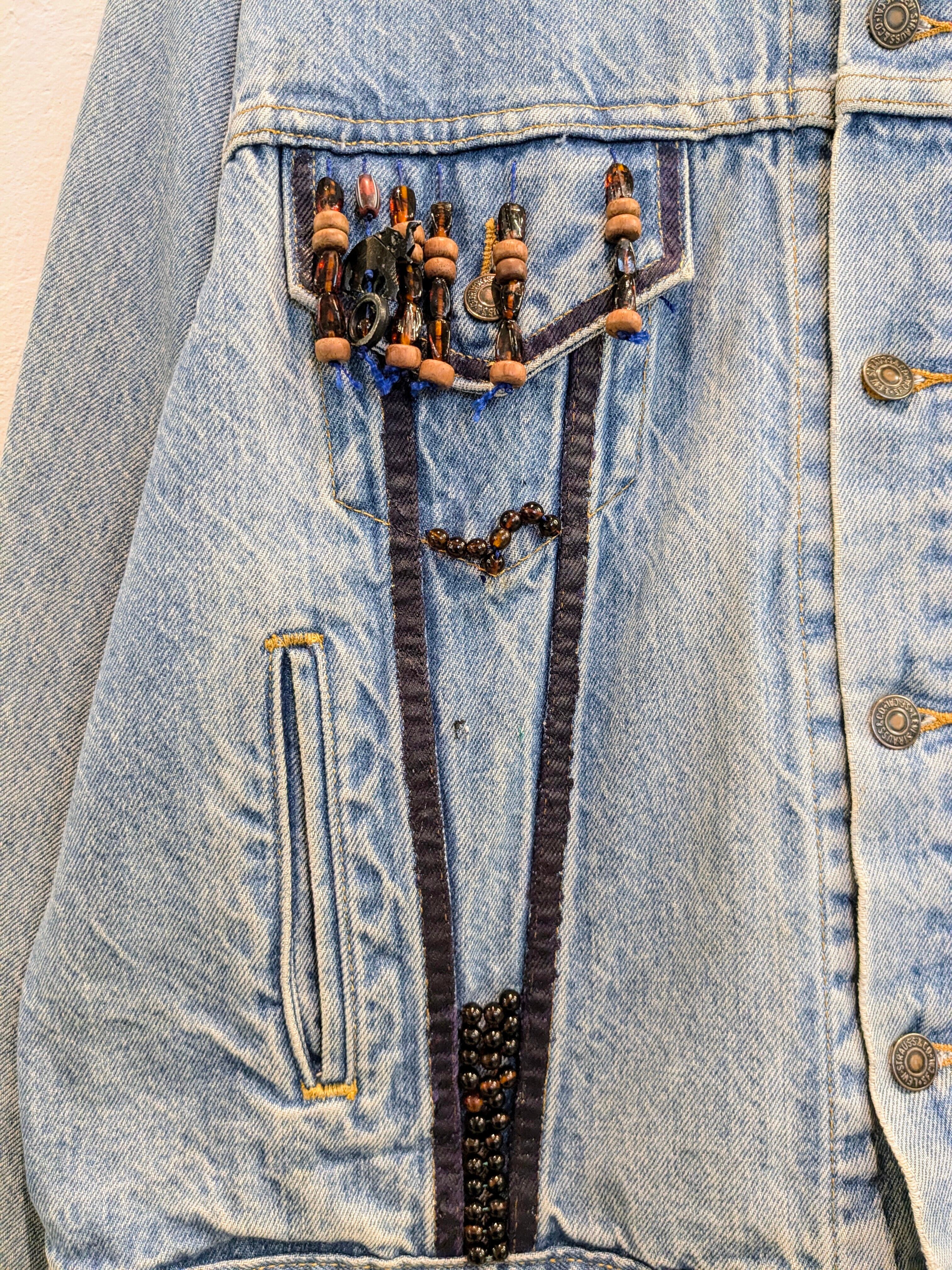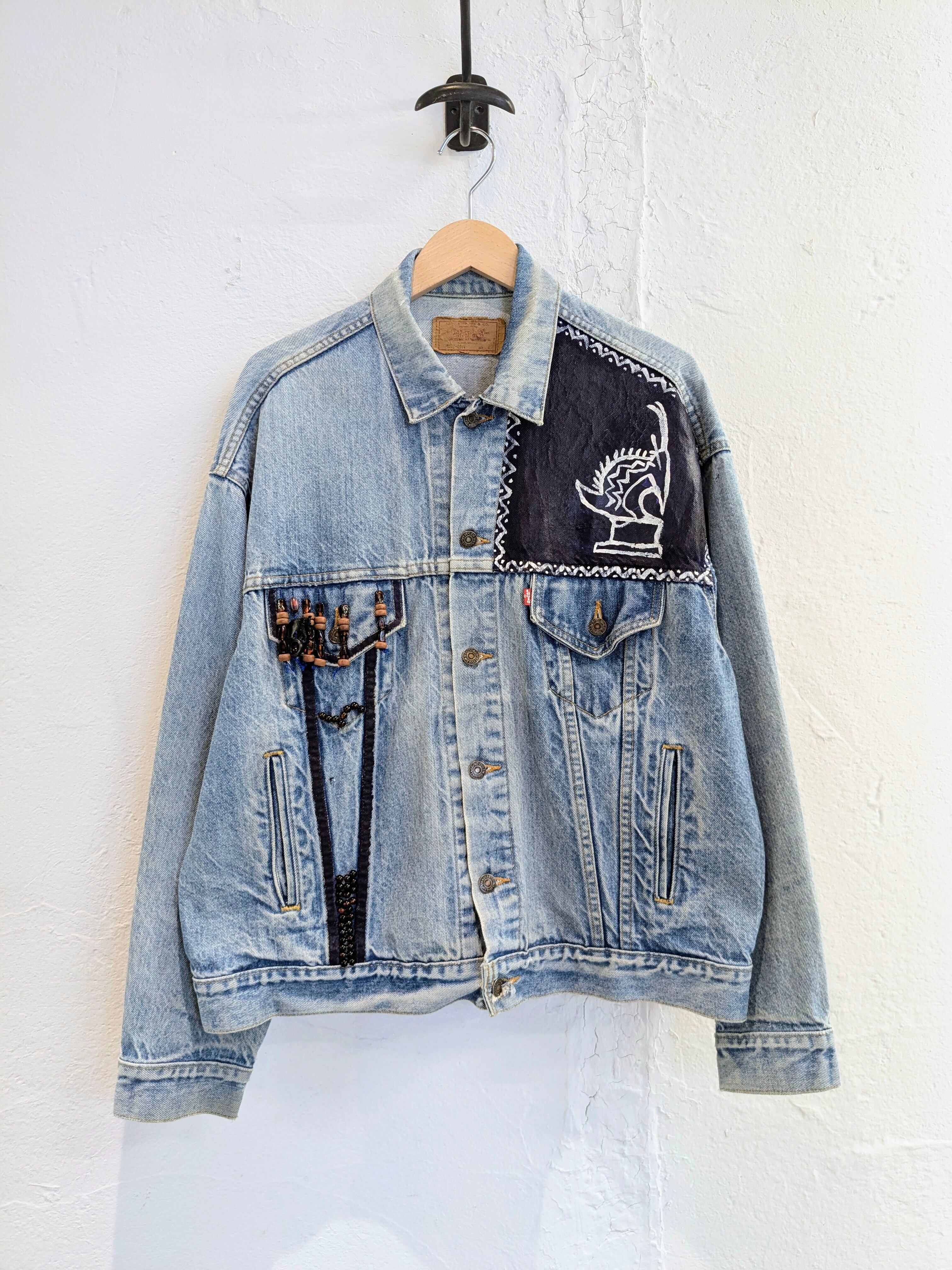 90's、アメリカ製のデニムジャケットがリメイクされている一着です。唯一無二の一点物のデザイン。ペンキ?でのイラスト、ウッドビーズなどを使用したフリンジデザインなど東洋の雰囲気も少し感じられます。