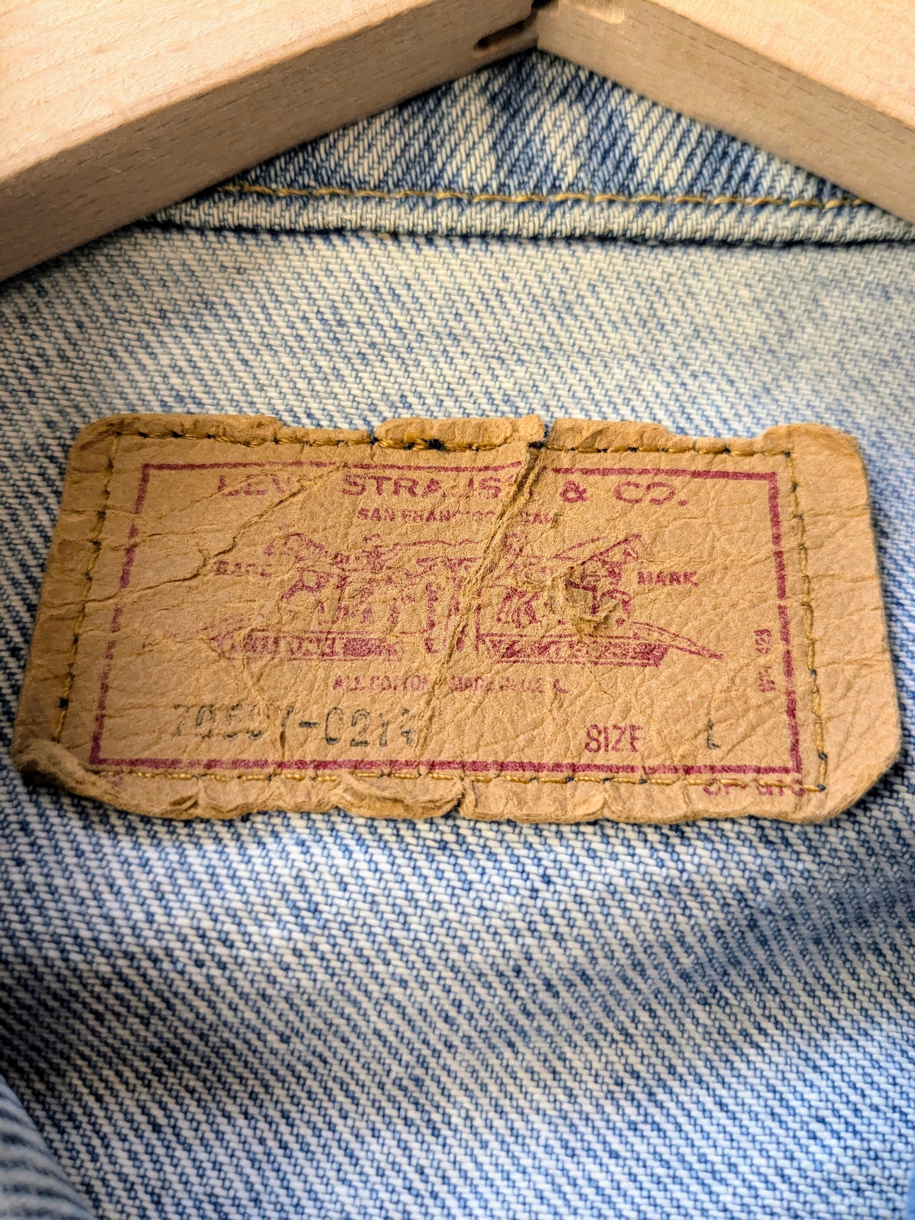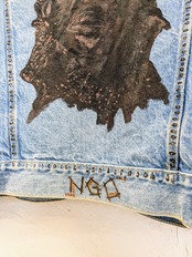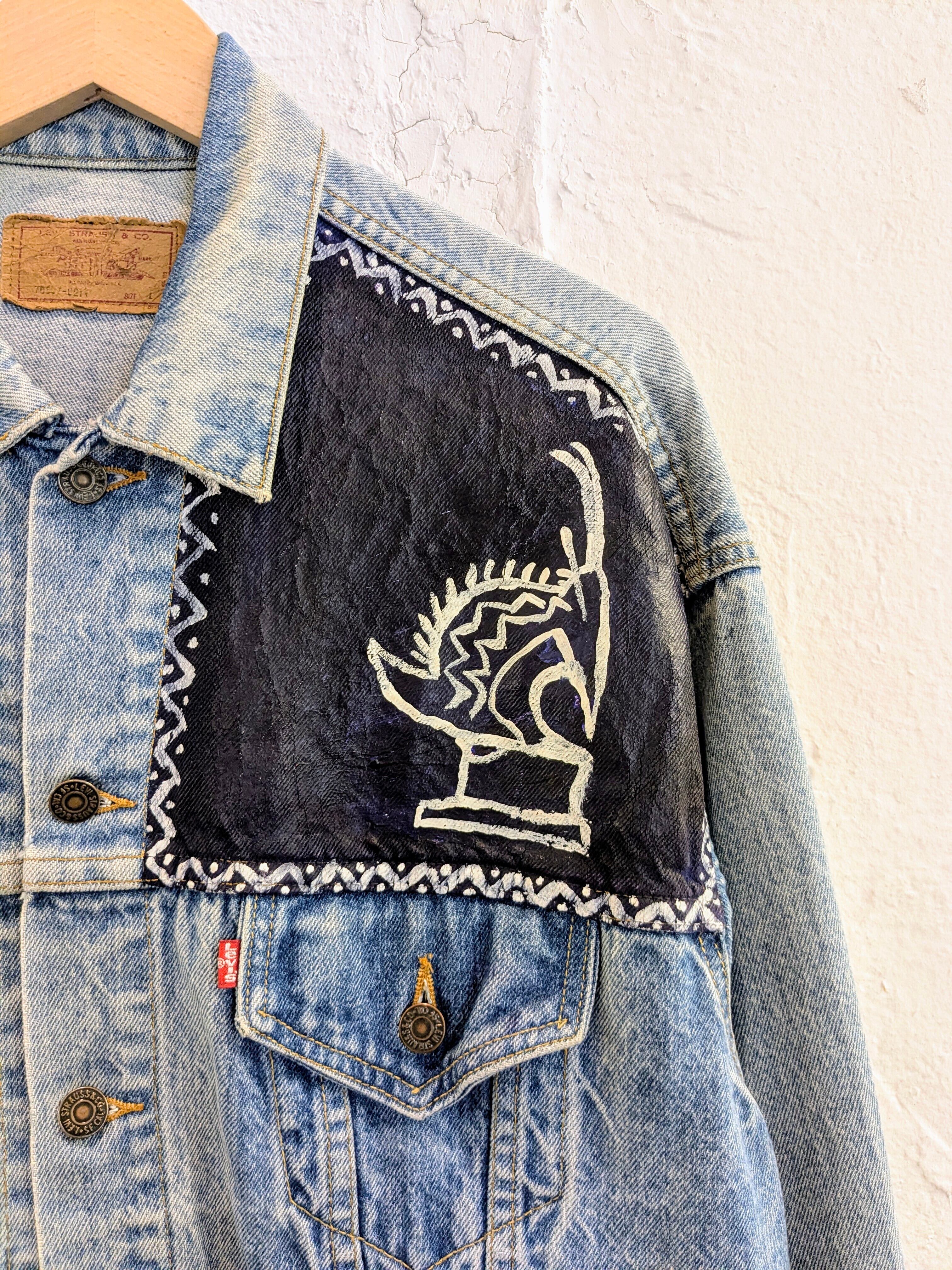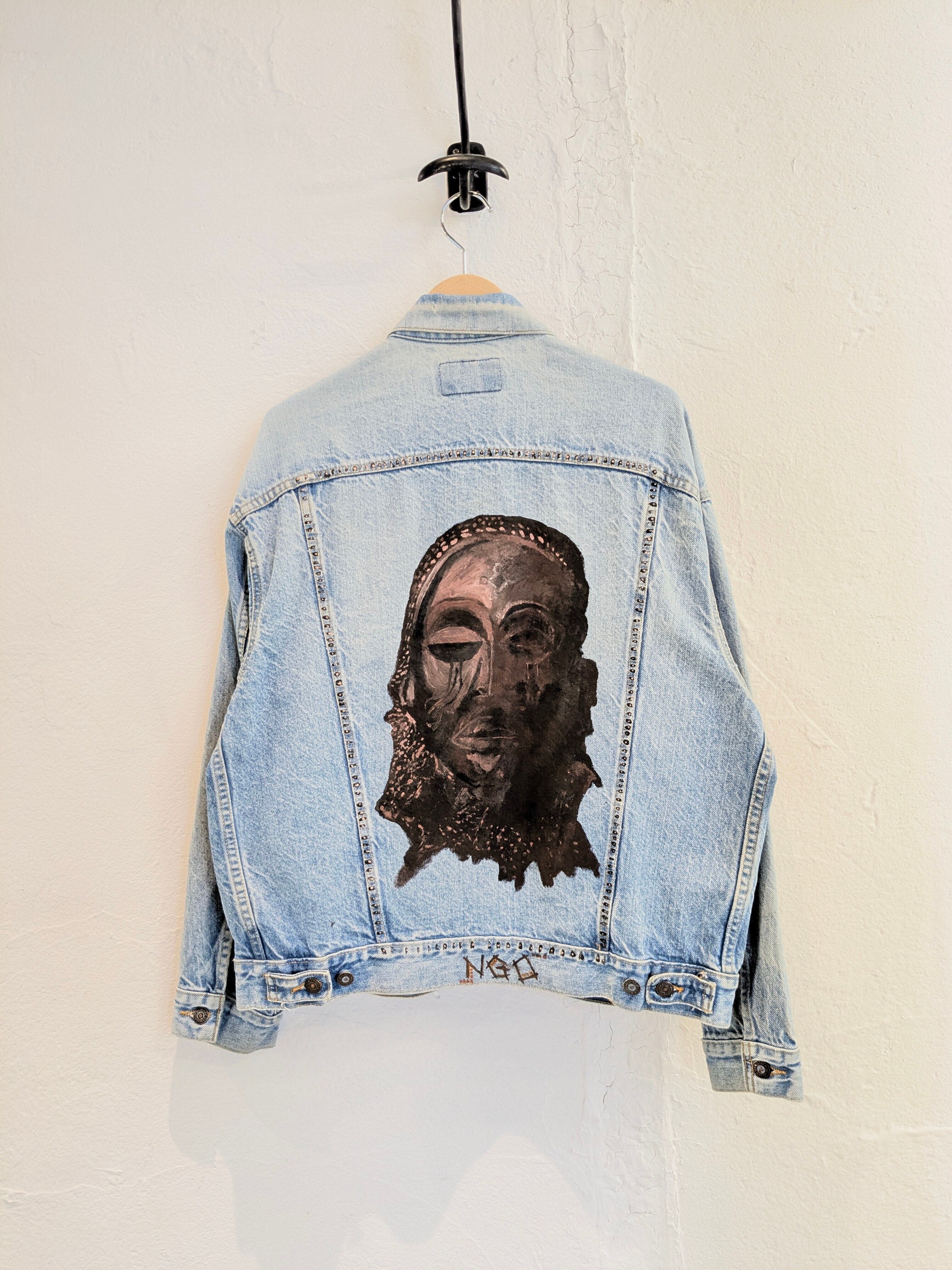 90's、アメリカ製のデニムジャケットがリメイクされている一着です。唯一無二の一点物のデザイン。ペンキ?でのイラスト、ウッドビーズなどを使用したフリンジデザインなど東洋の雰囲気も少し感じられます。