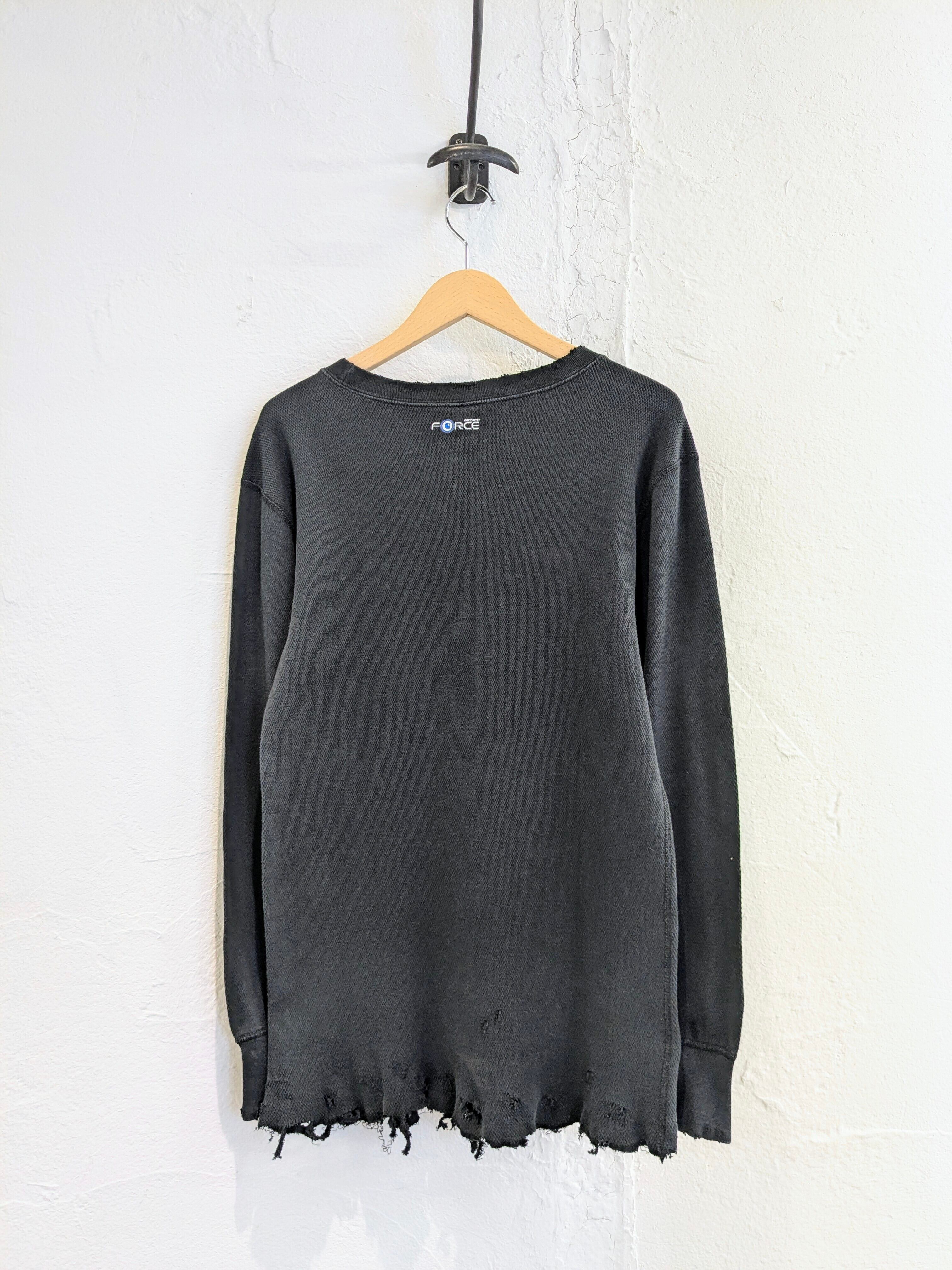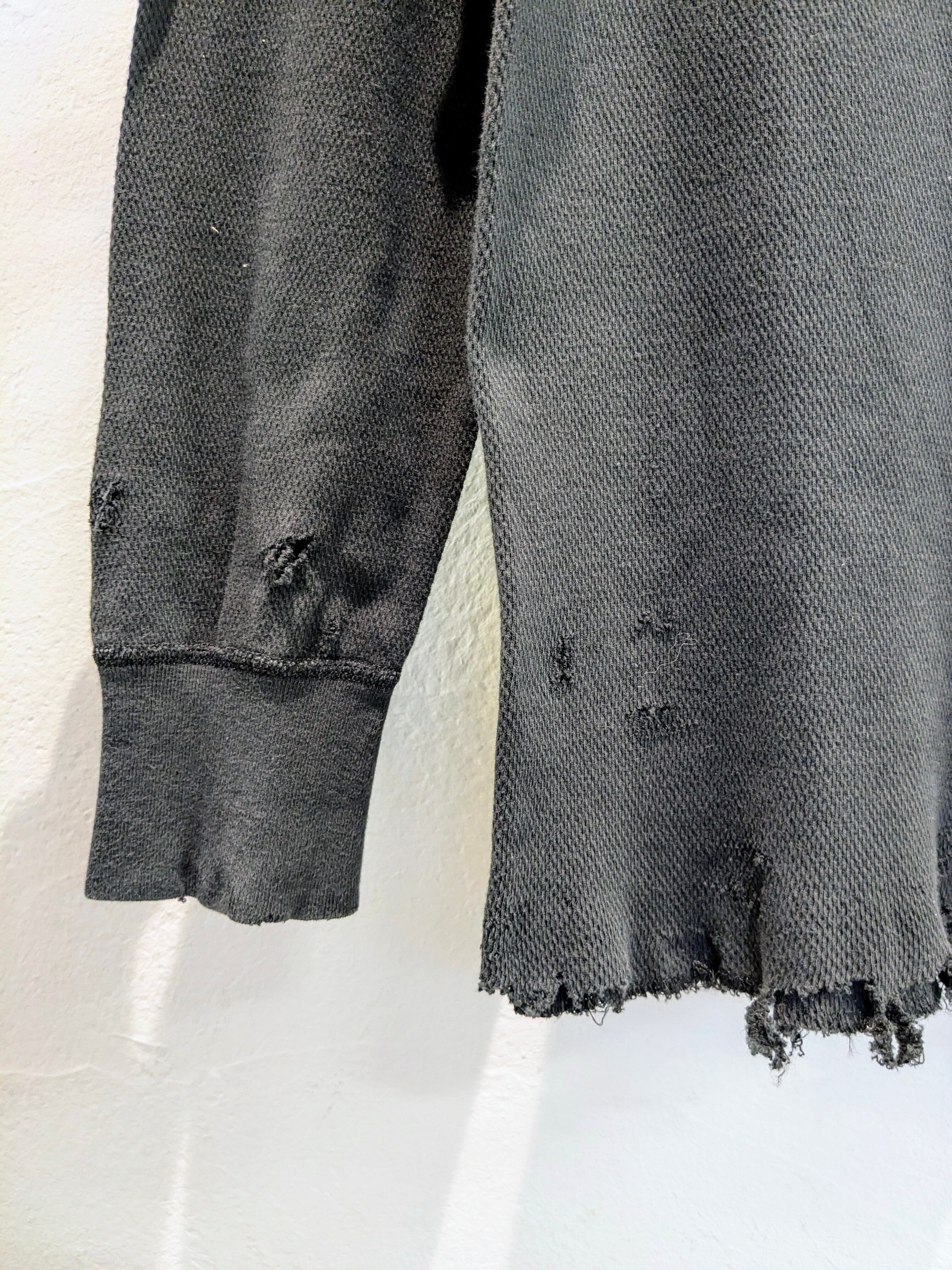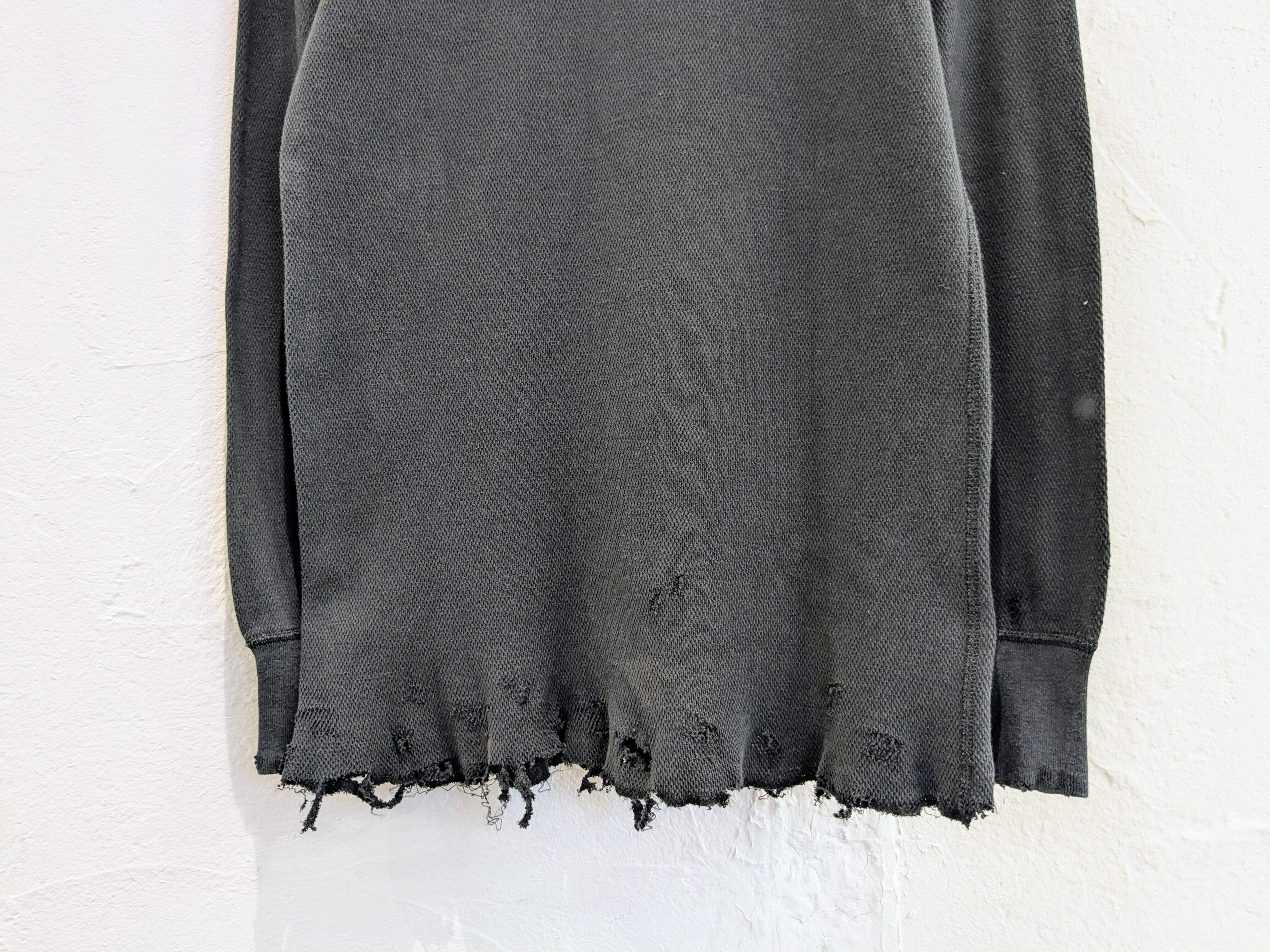 レイヤードに使いたいという希望から作っていただいたシリーズ。シャツ、ニット、ブルゾンなどの裾からダメージ部分が見えるように個人的には使えたらと思っていますが、生地がしっかりしているので、一枚着としても使えてしまう万能なアイテム。やりすぎていないデザインがまたちょうどいい。