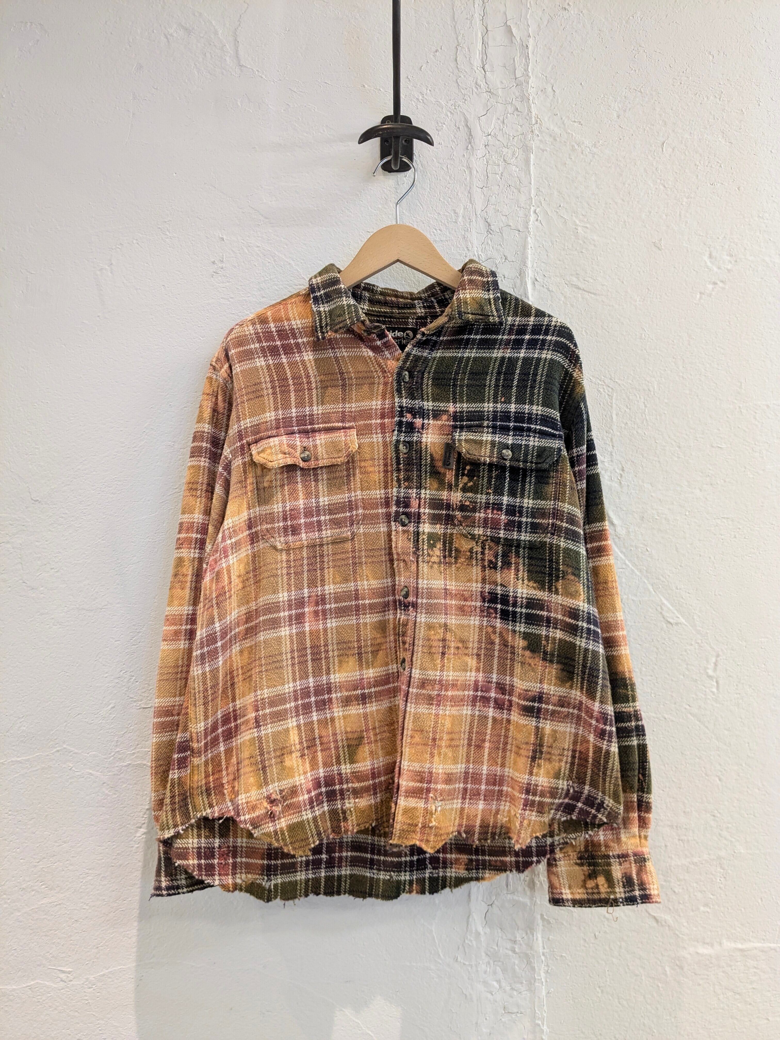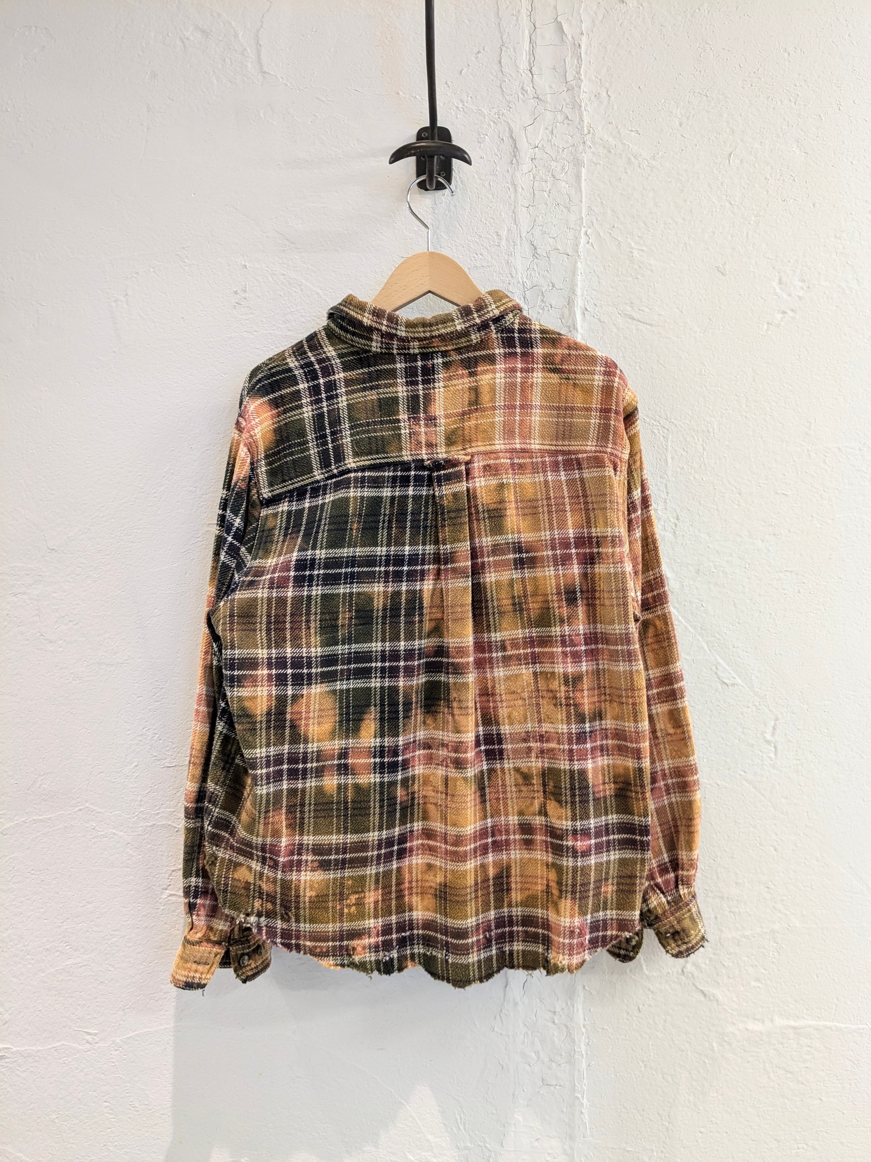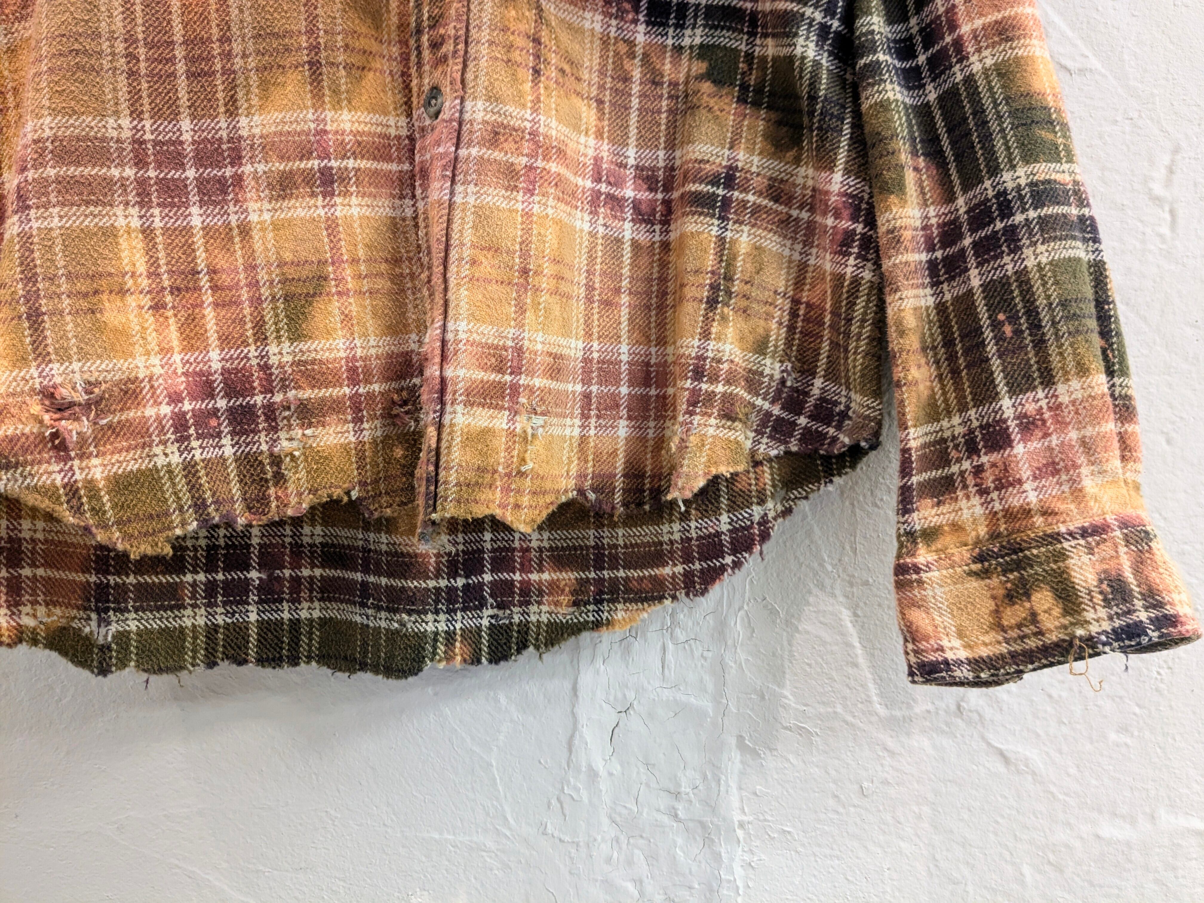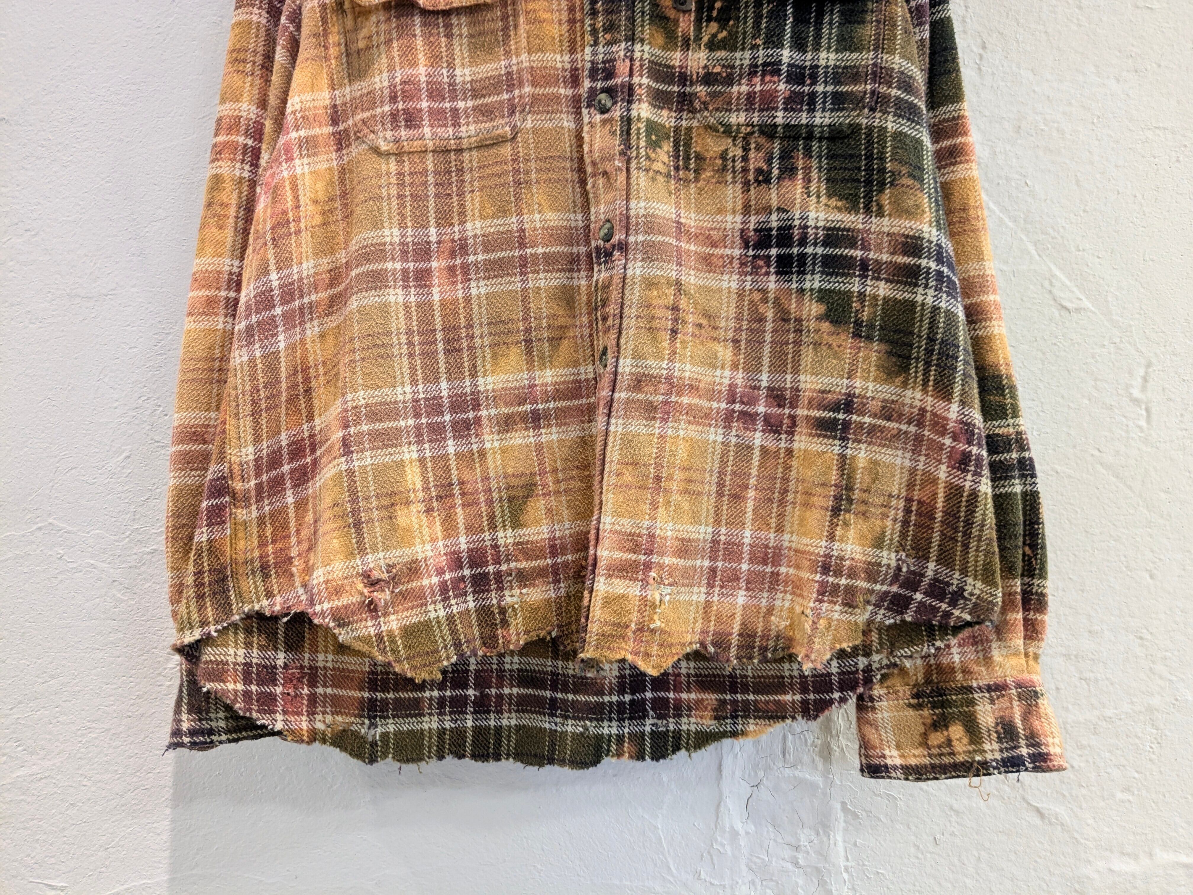 ブリーチによるフェード加工、襟、袖、裾などにダメージの加工が施されたボロネルシャツ。裾に関しましては、直線ではなくあえてランダムに切断してあります。