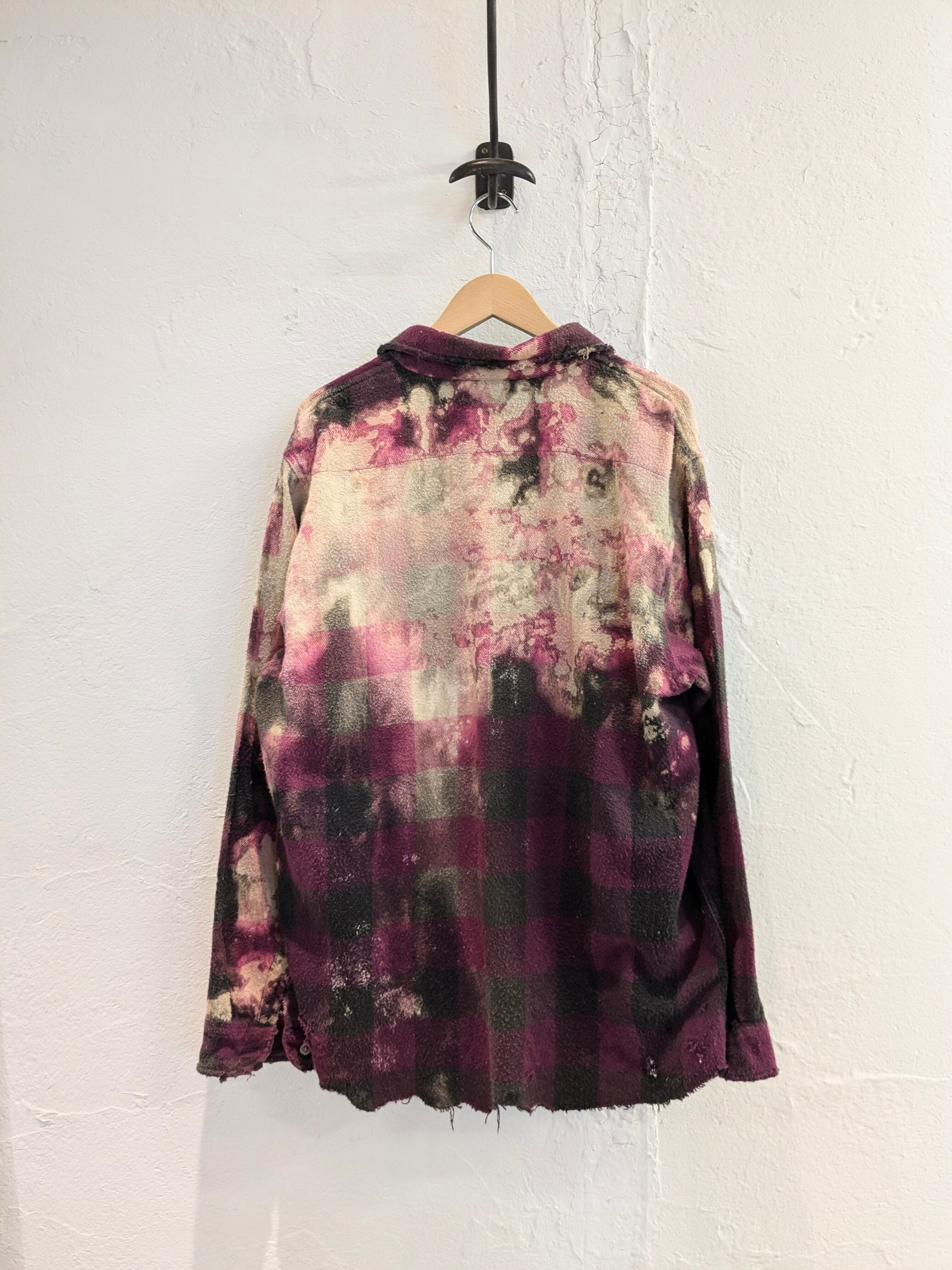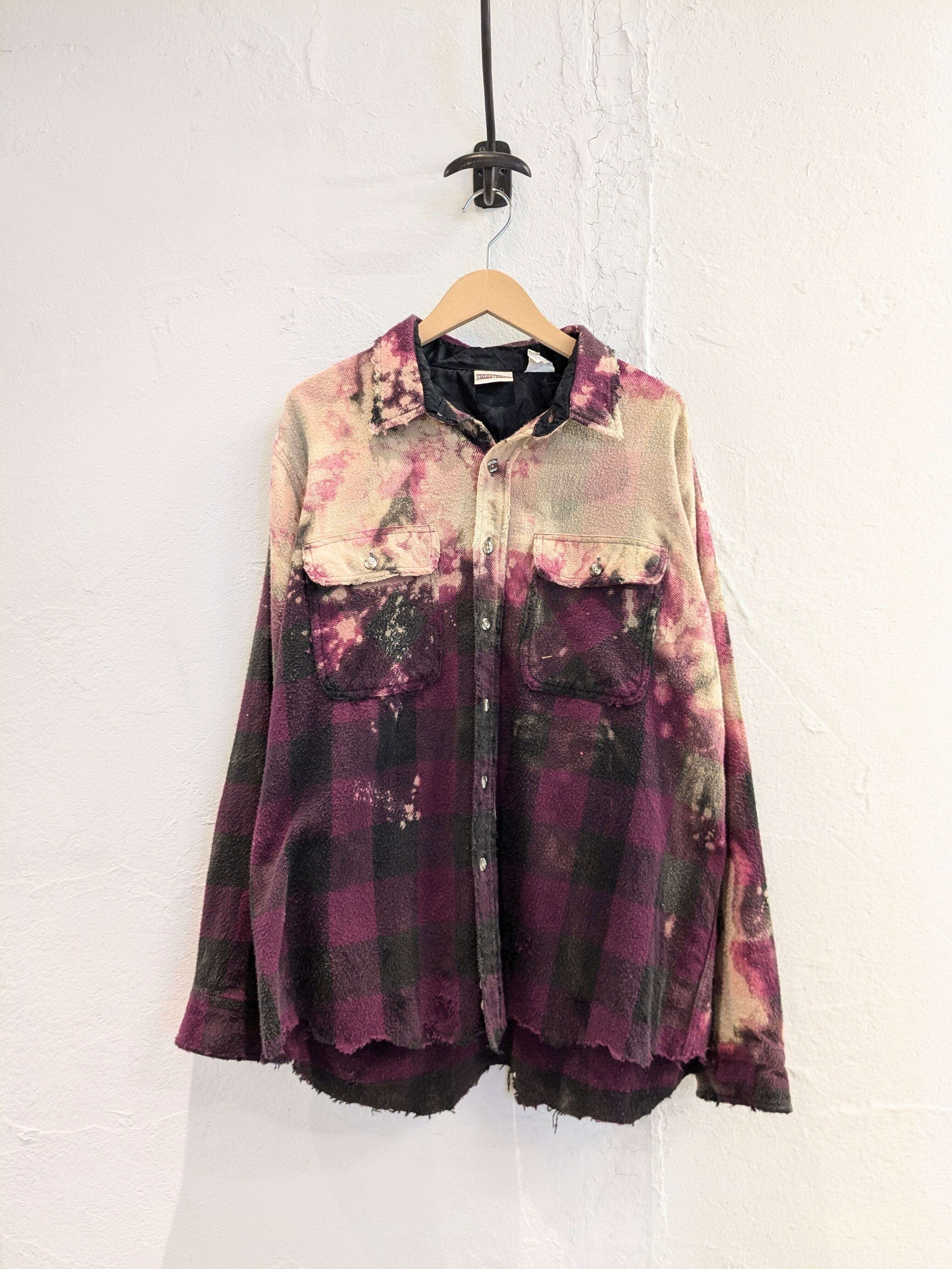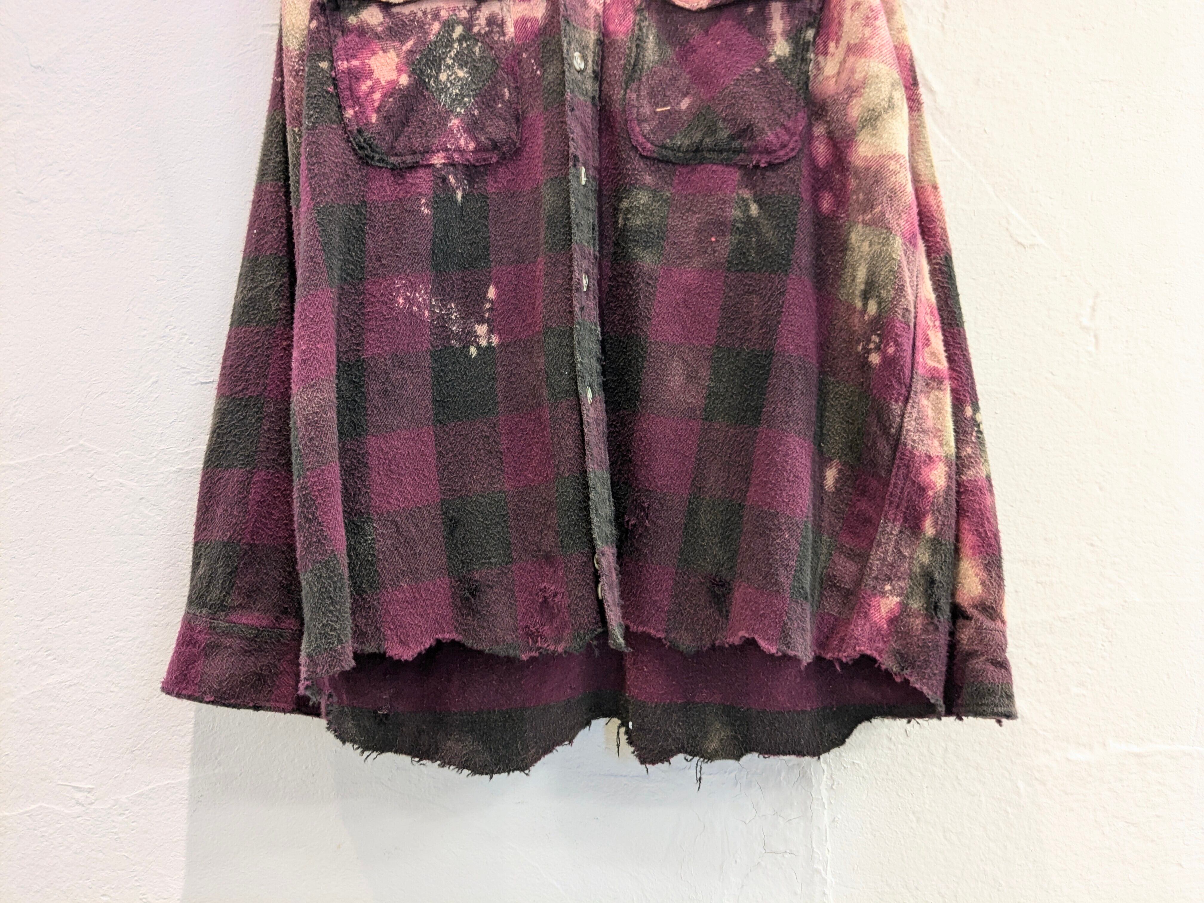 ブリーチによるフェード加工、襟、袖、裾などにダメージの加工が施されたボロネルシャツ。裾に関しましては、直線ではなくあえてランダムに切断してあります。