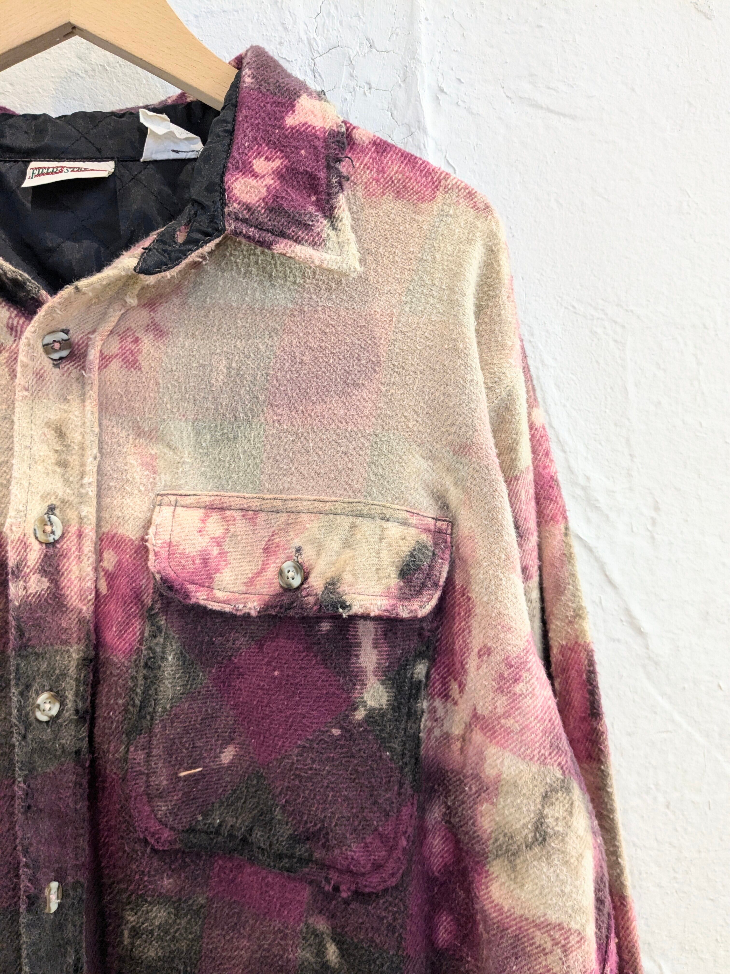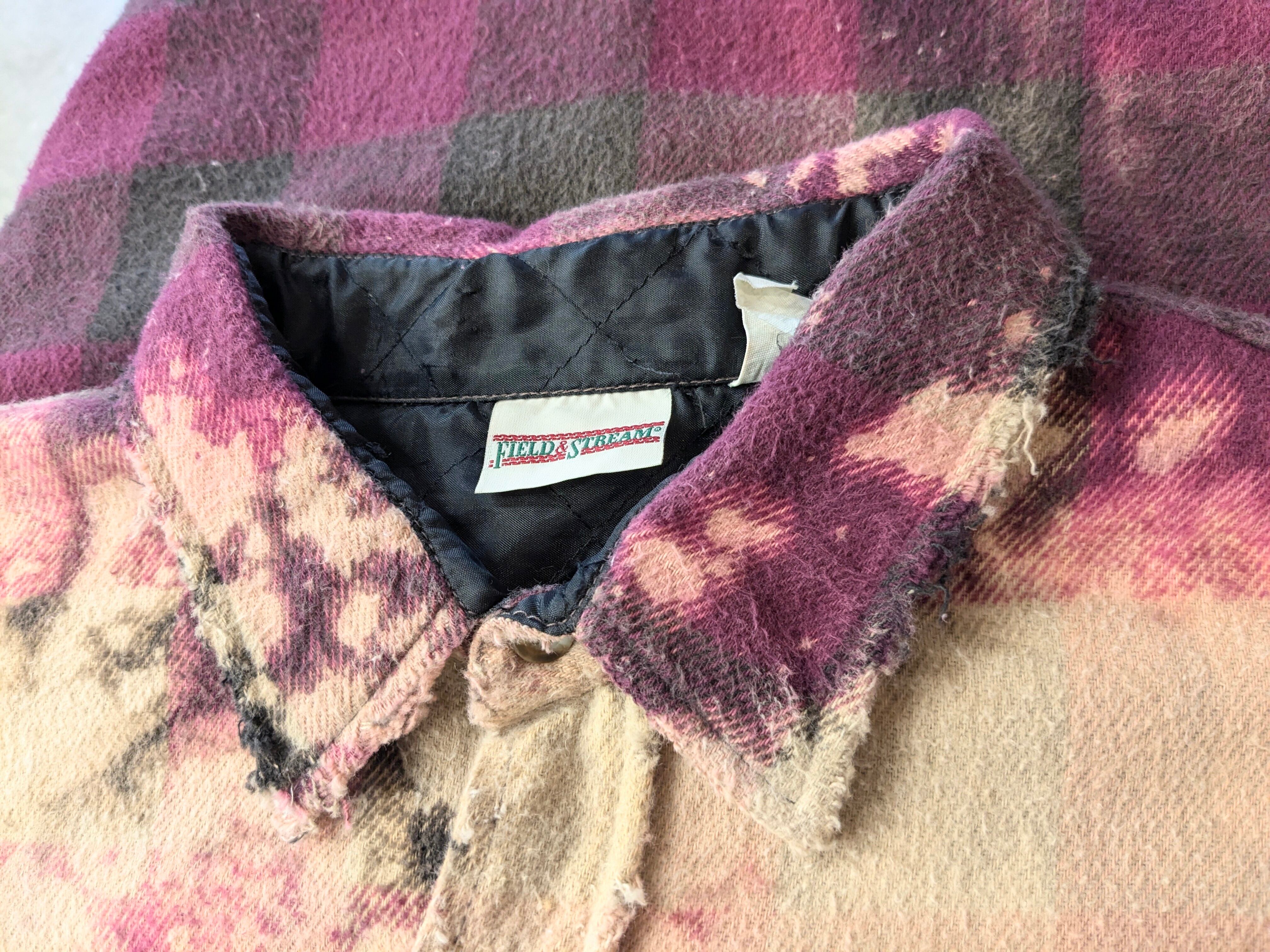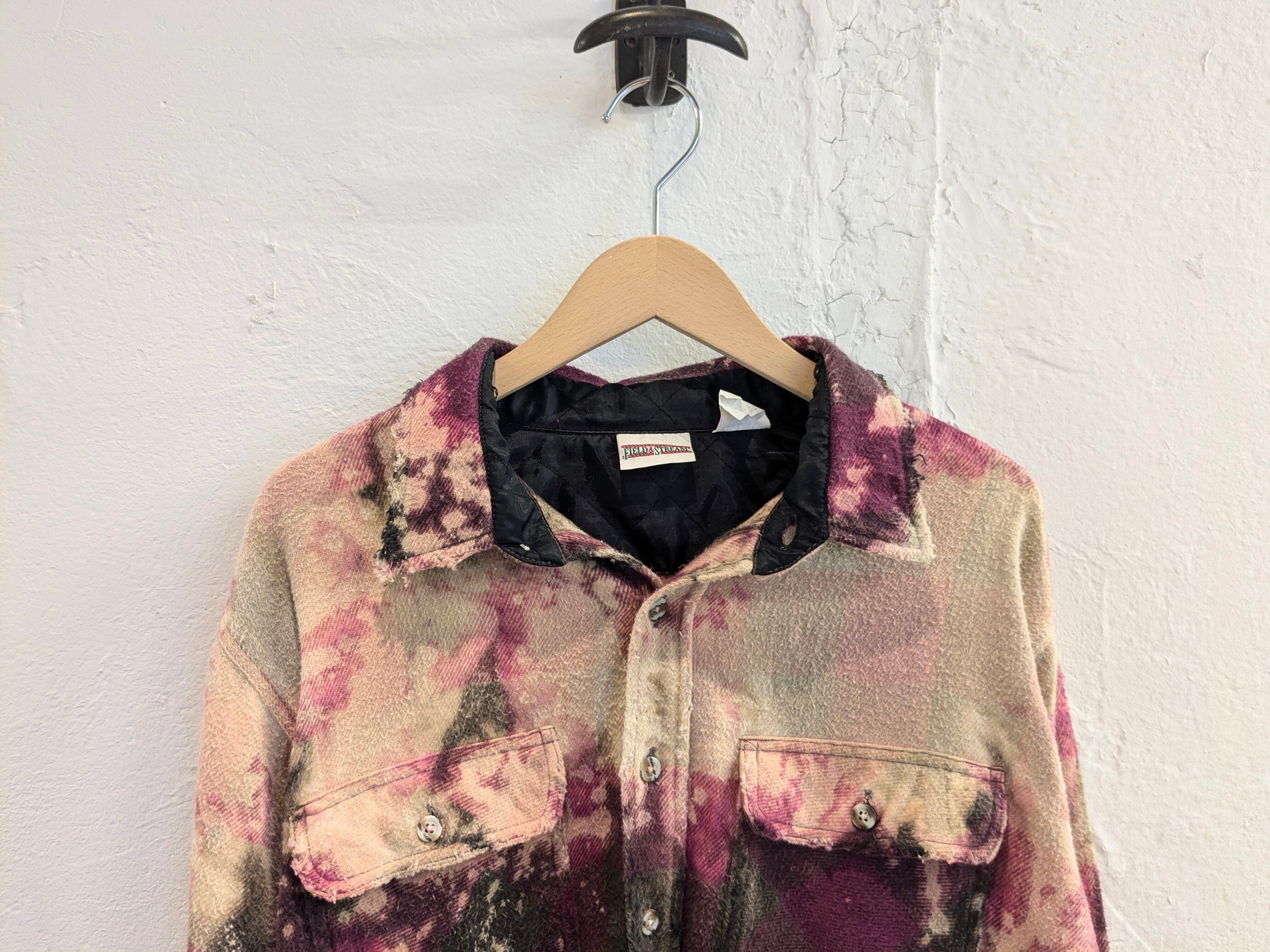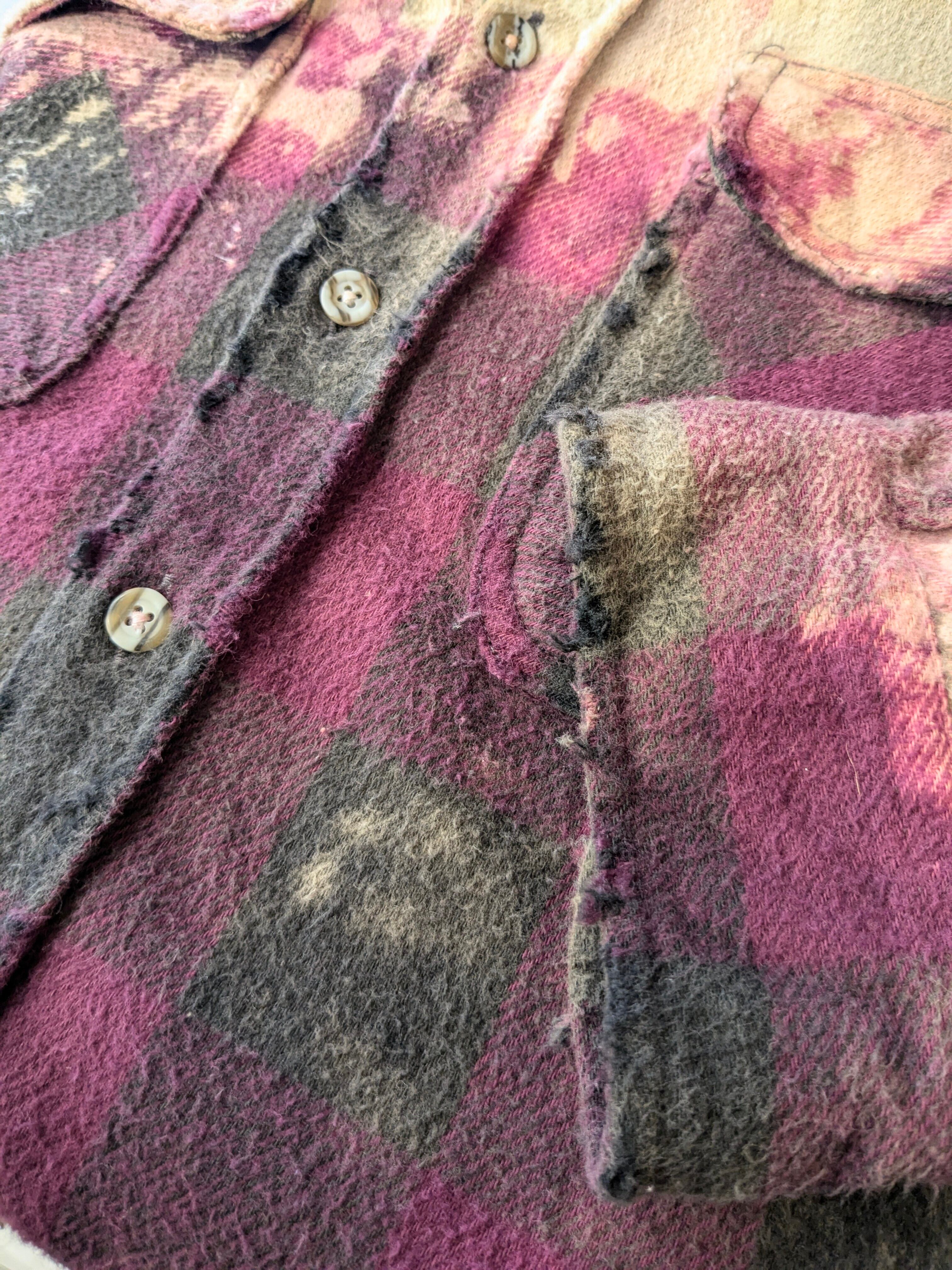 ブリーチによるフェード加工、襟、袖、裾などにダメージの加工が施されたボロネルシャツ。裾に関しましては、直線ではなくあえてランダムに切断してあります。