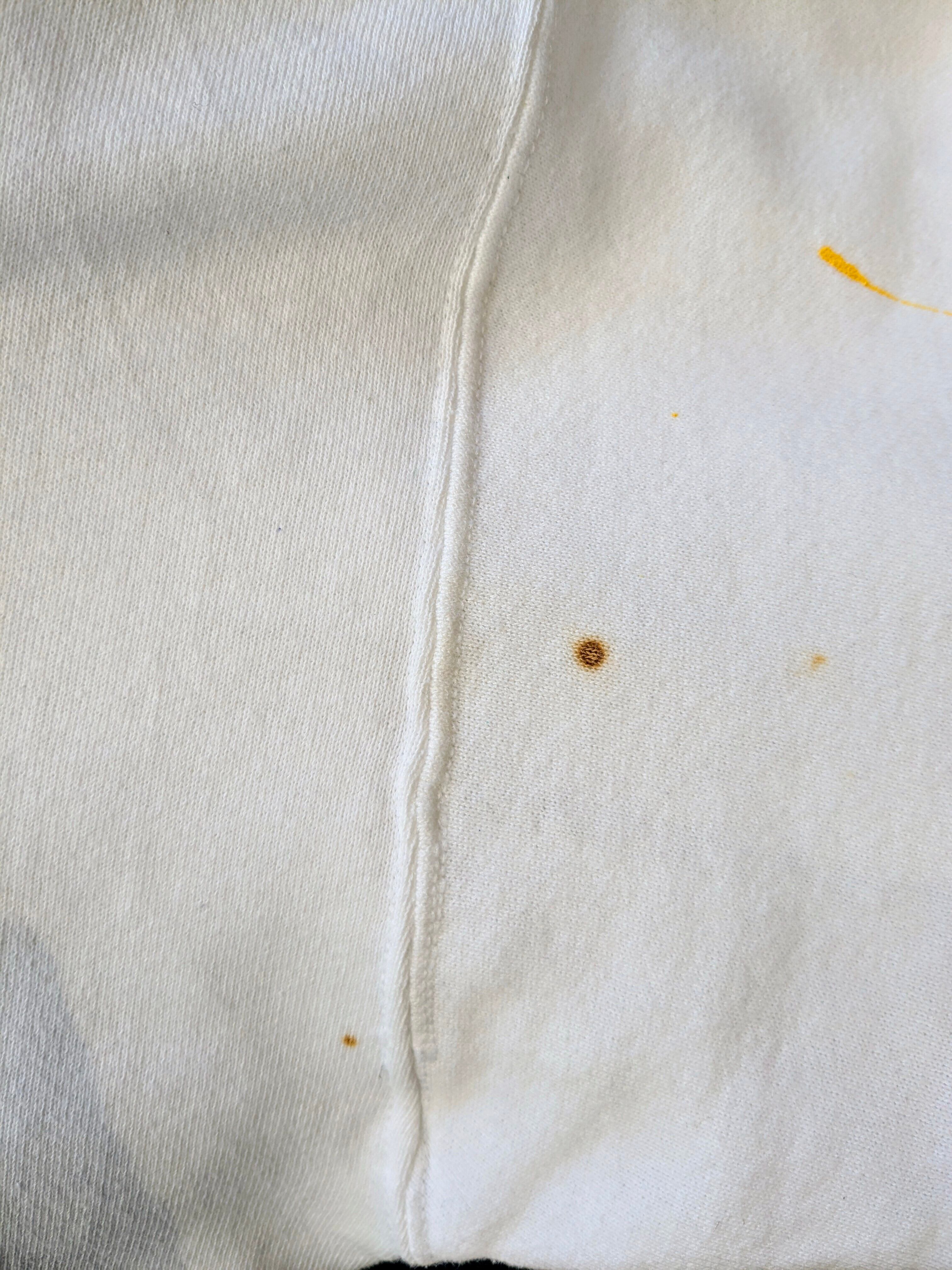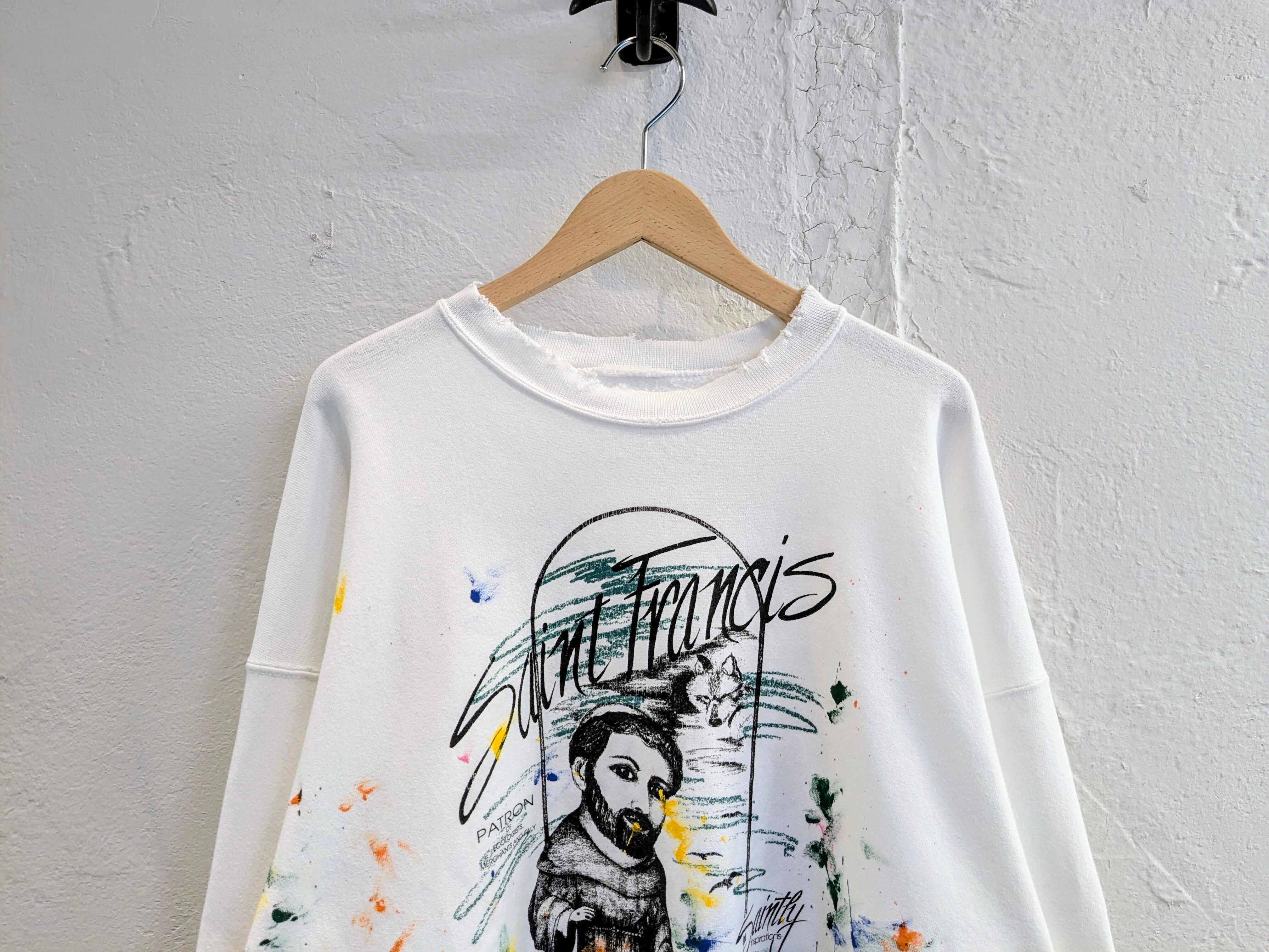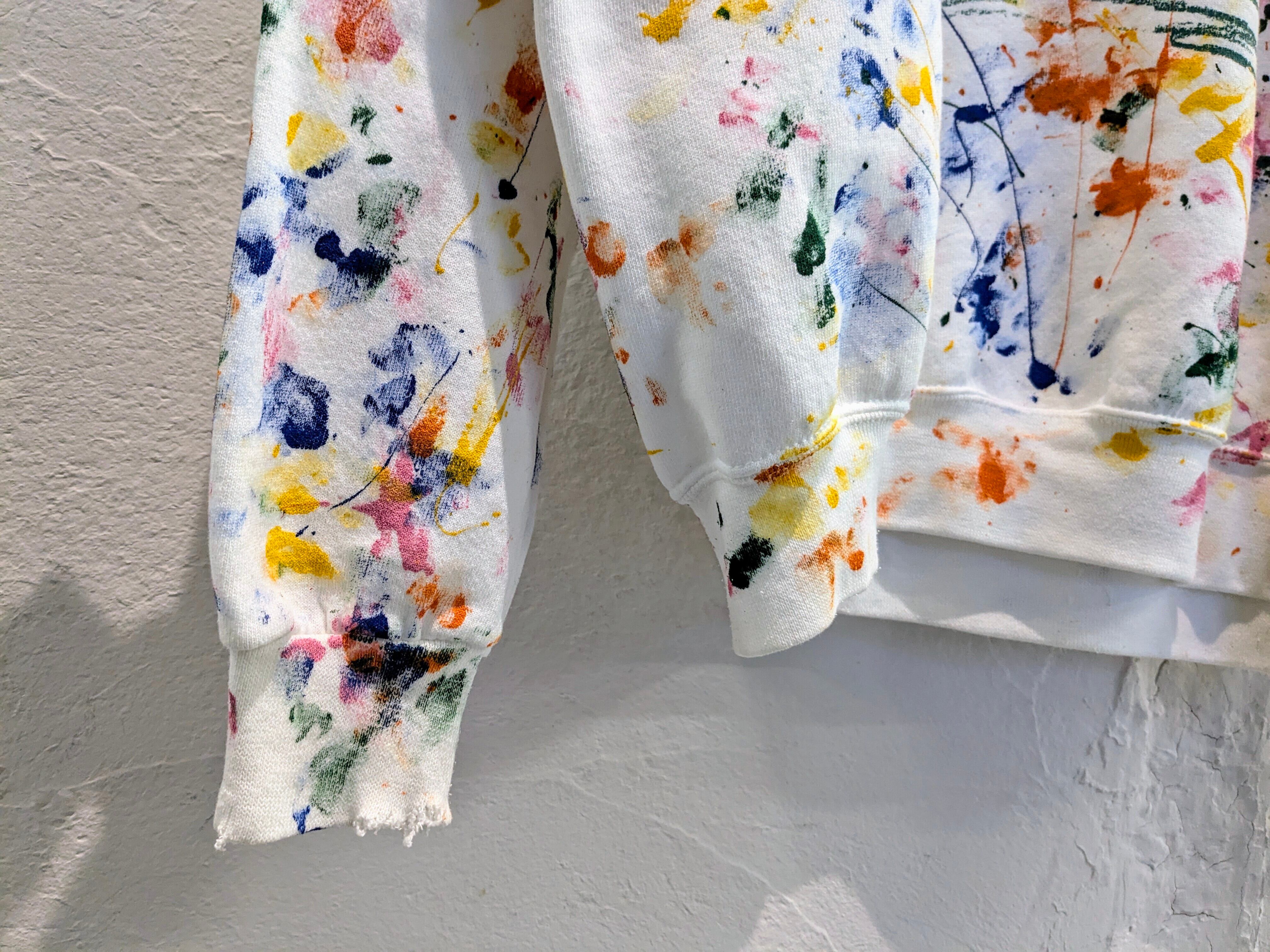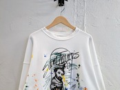 カラフルなアーティスティクなデザインで仕上がった一着。首、袖には程よくダメージが入っており雰囲気抜群です。元々のボディの汚れがあります。