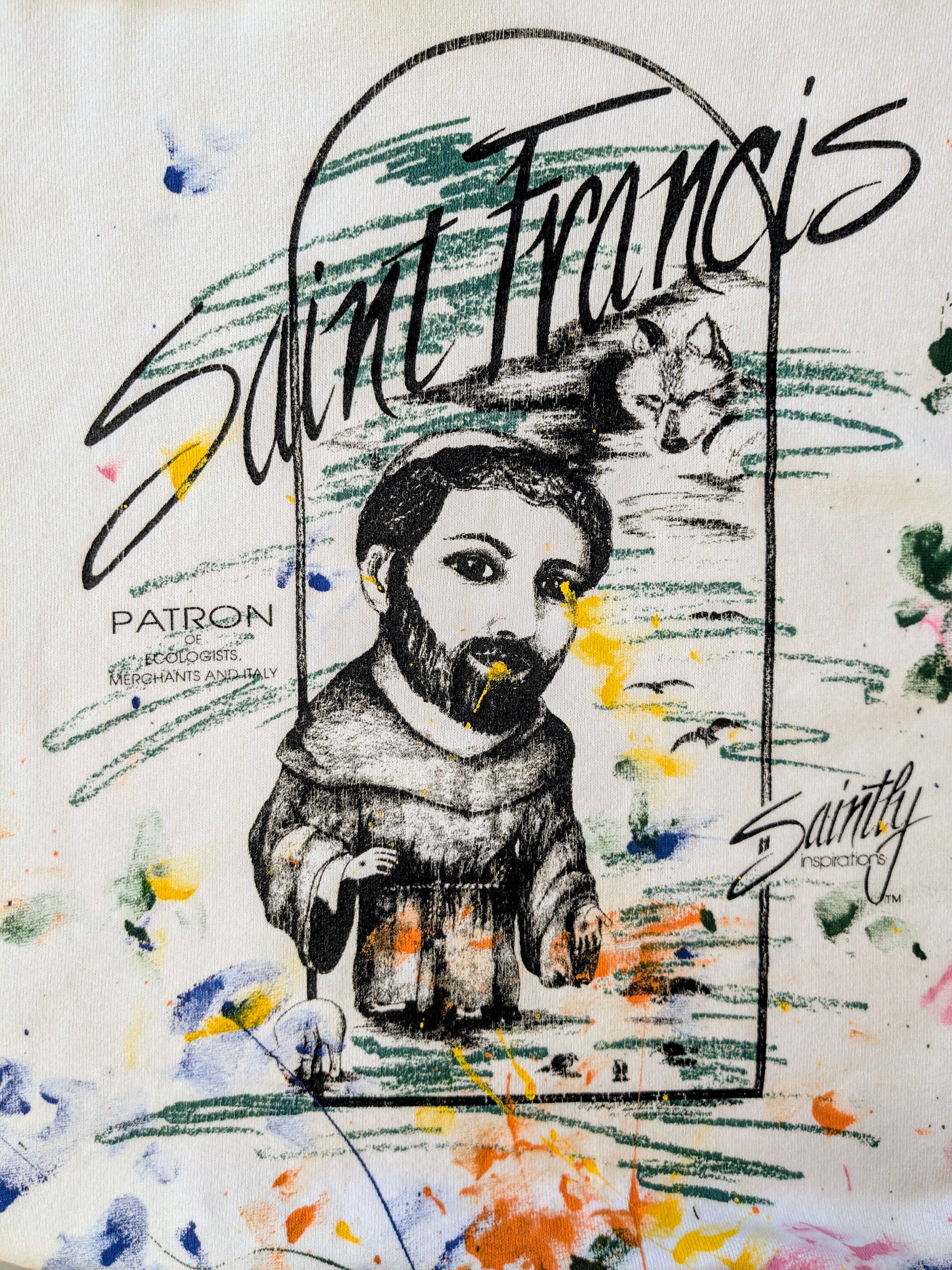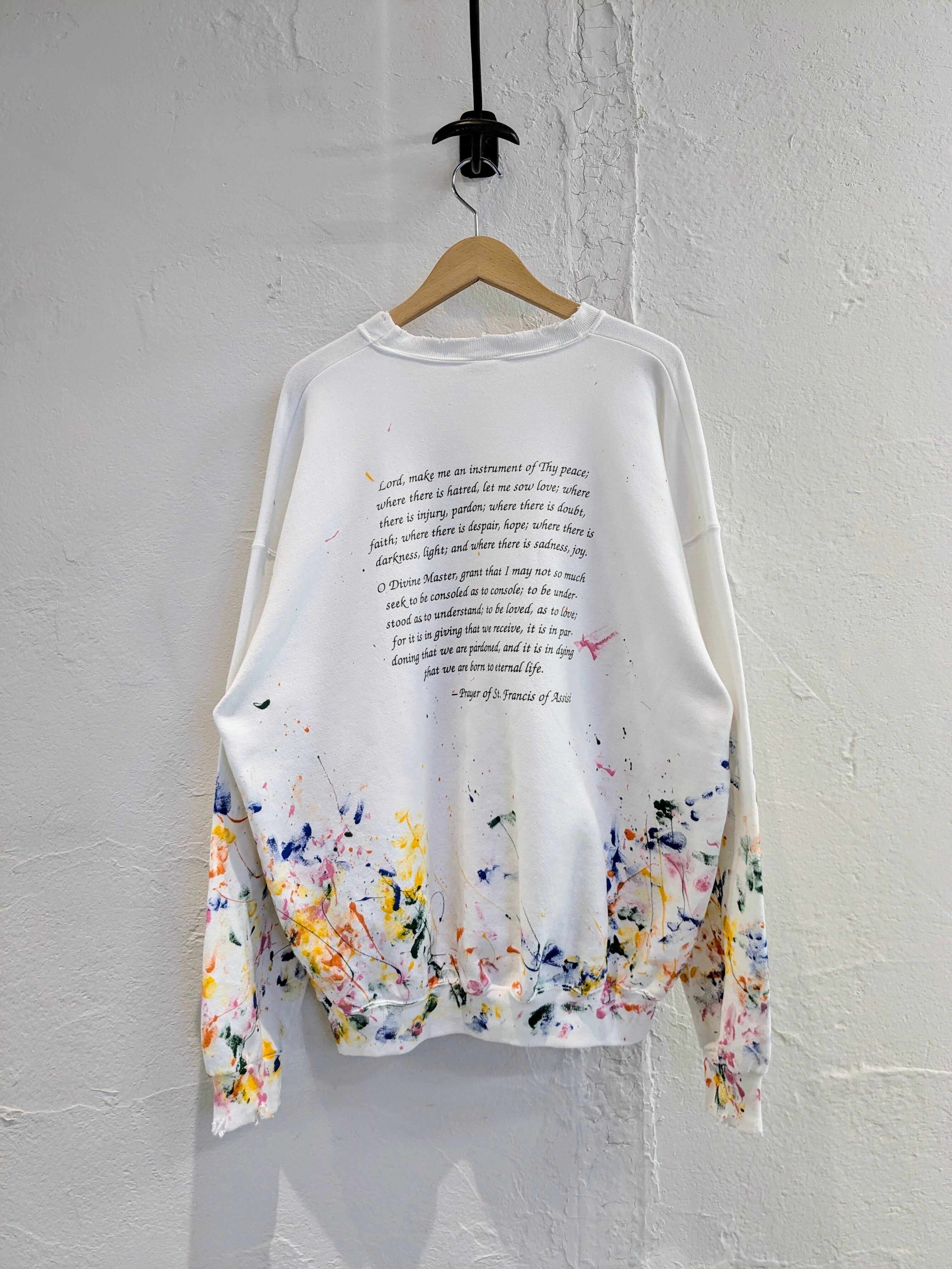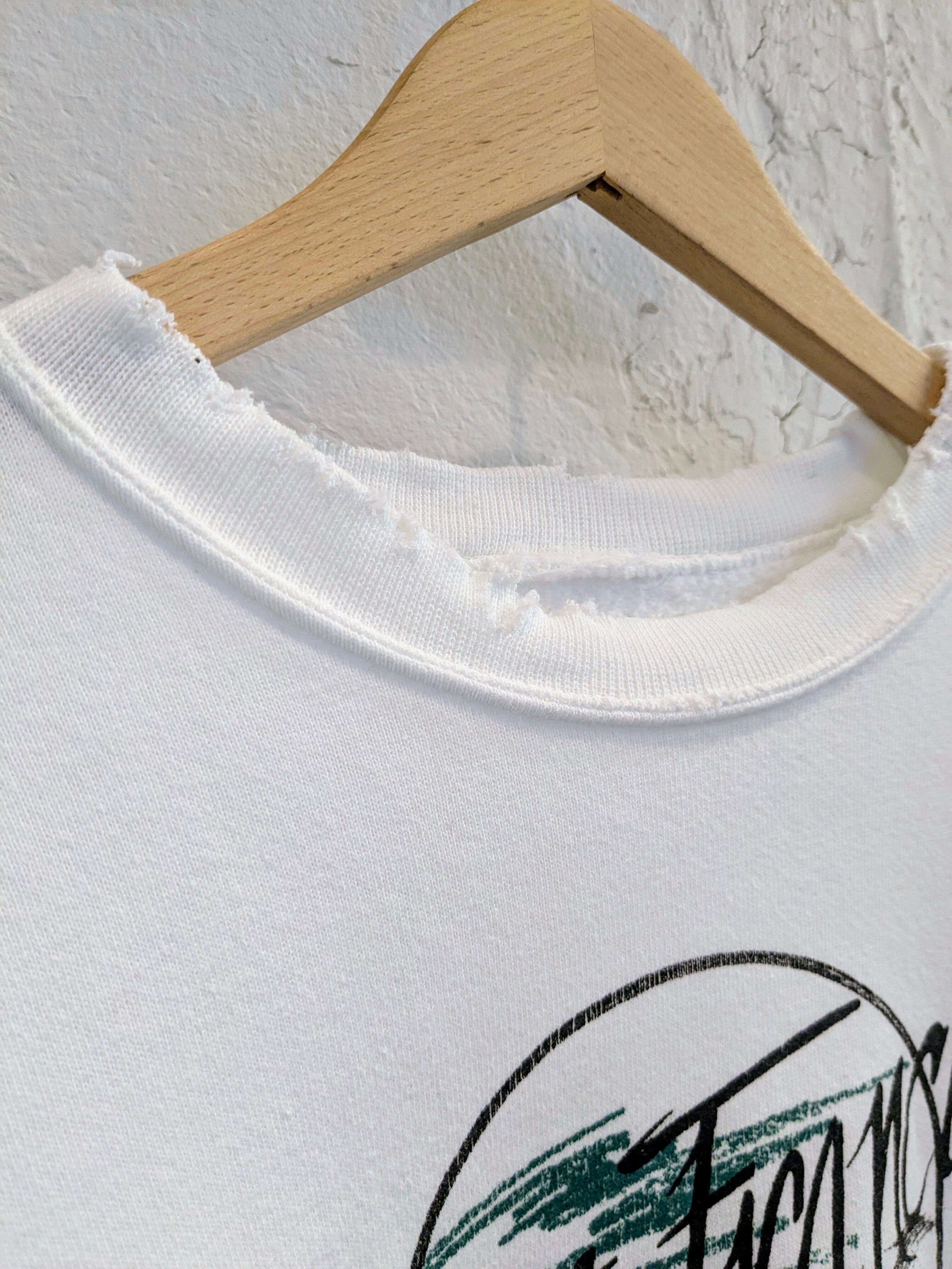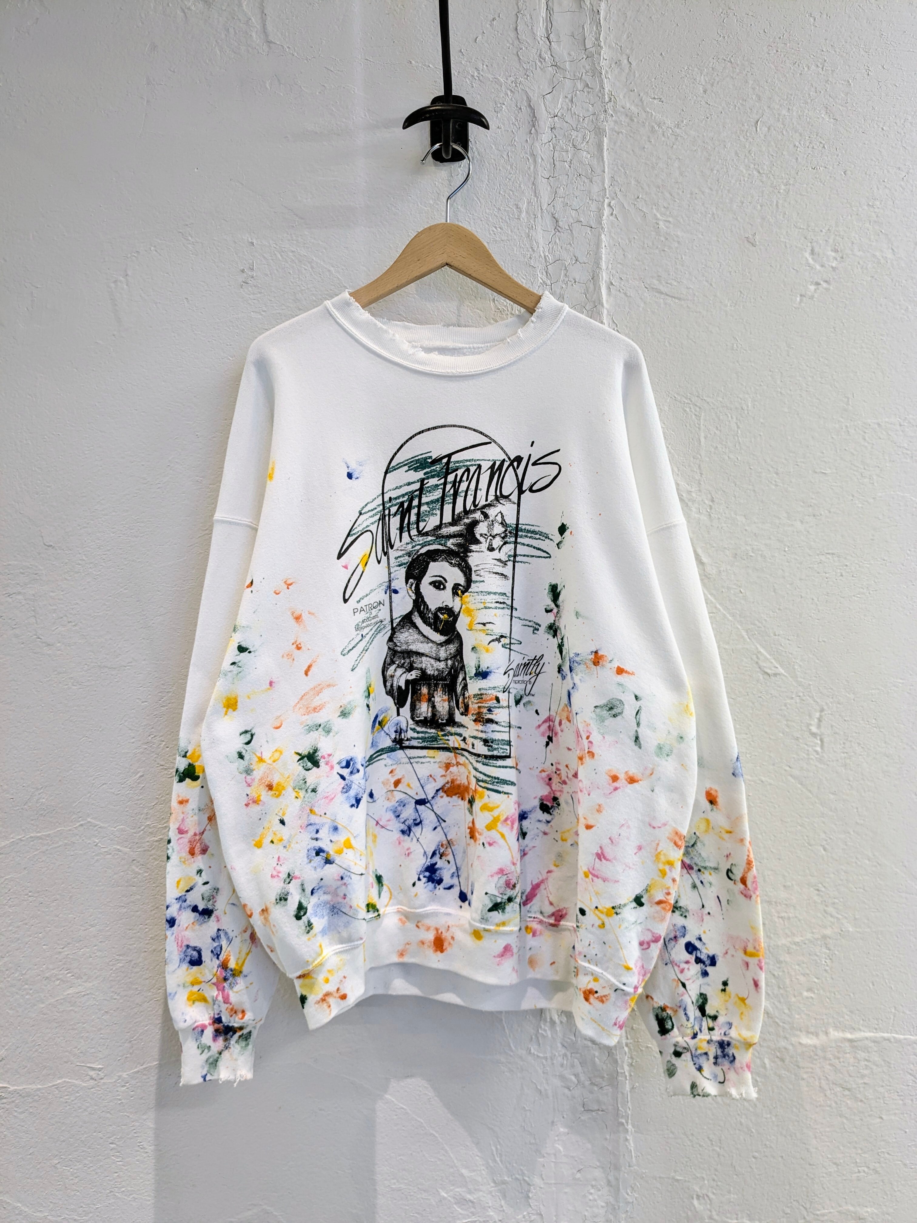 カラフルなアーティスティクなデザインで仕上がった一着。首、袖には程よくダメージが入っており雰囲気抜群です。元々のボディの汚れがあります。