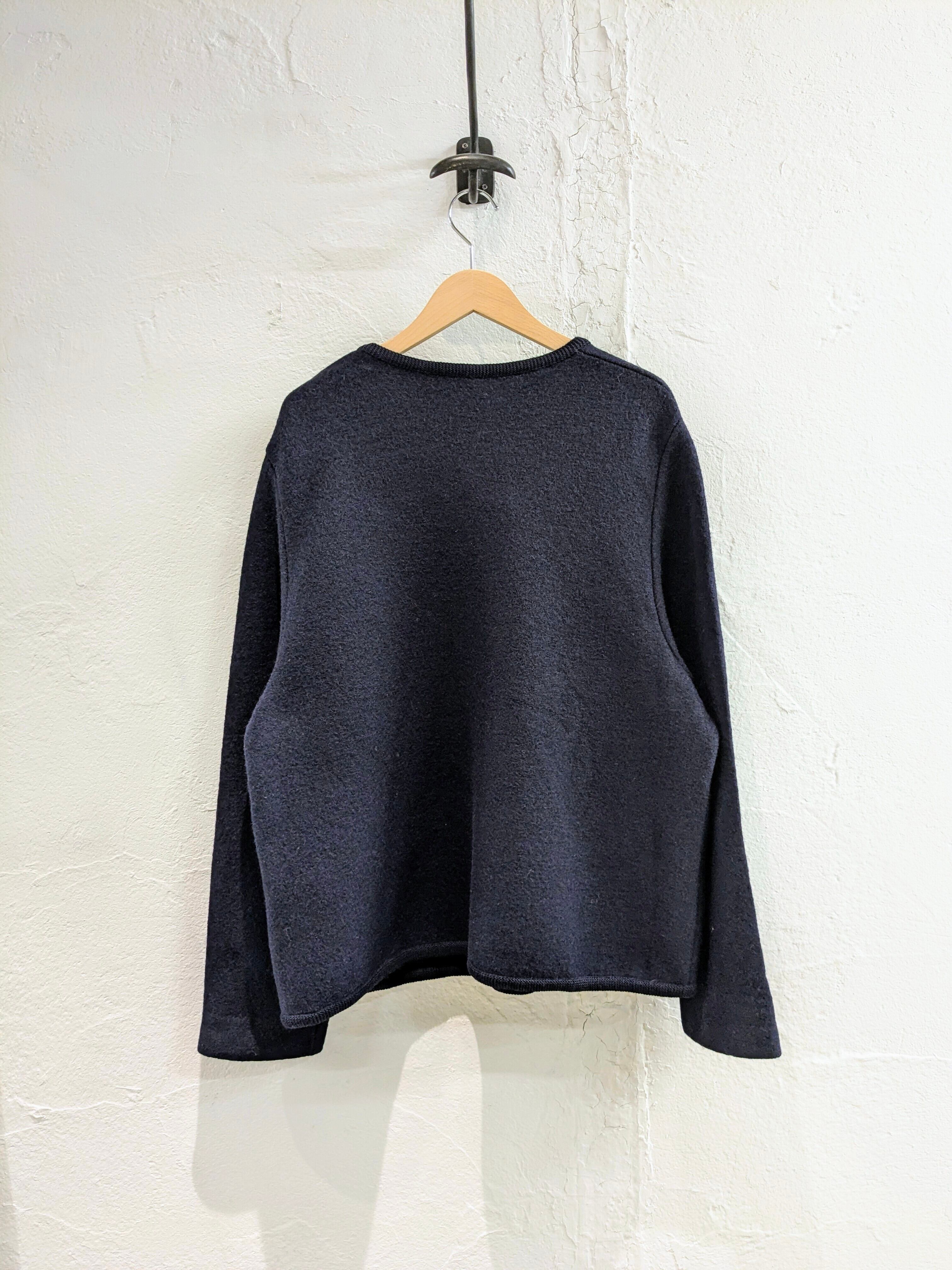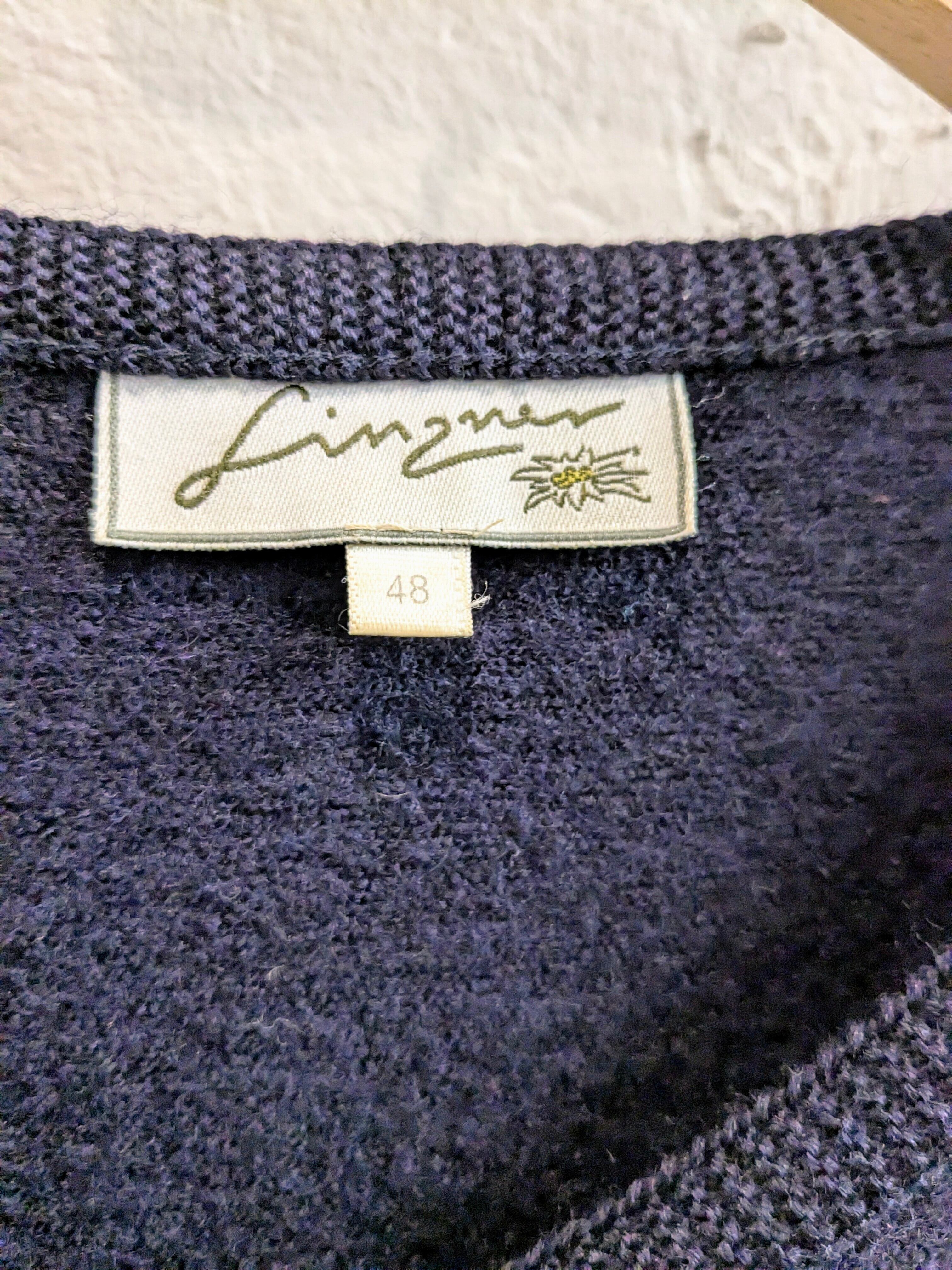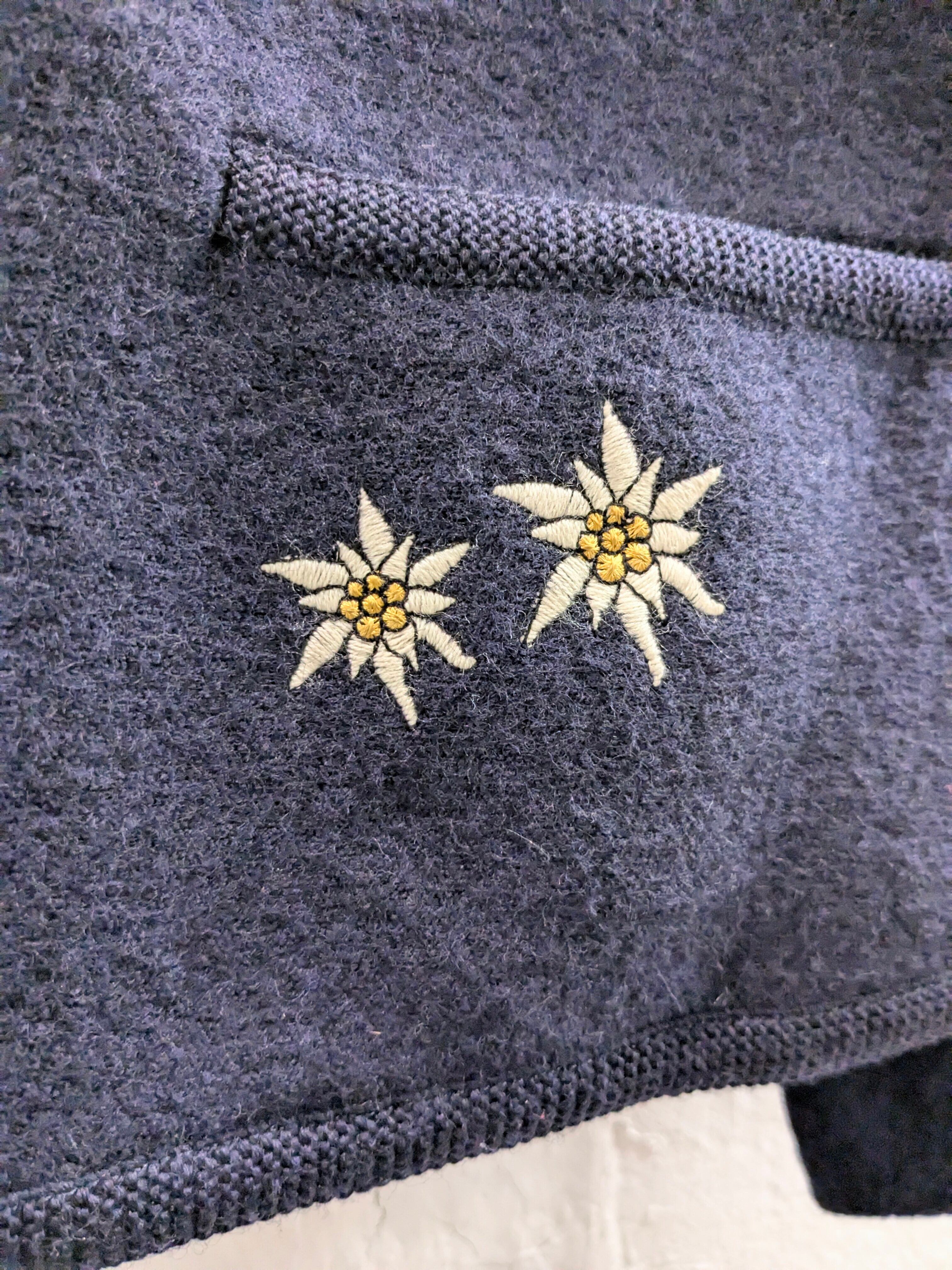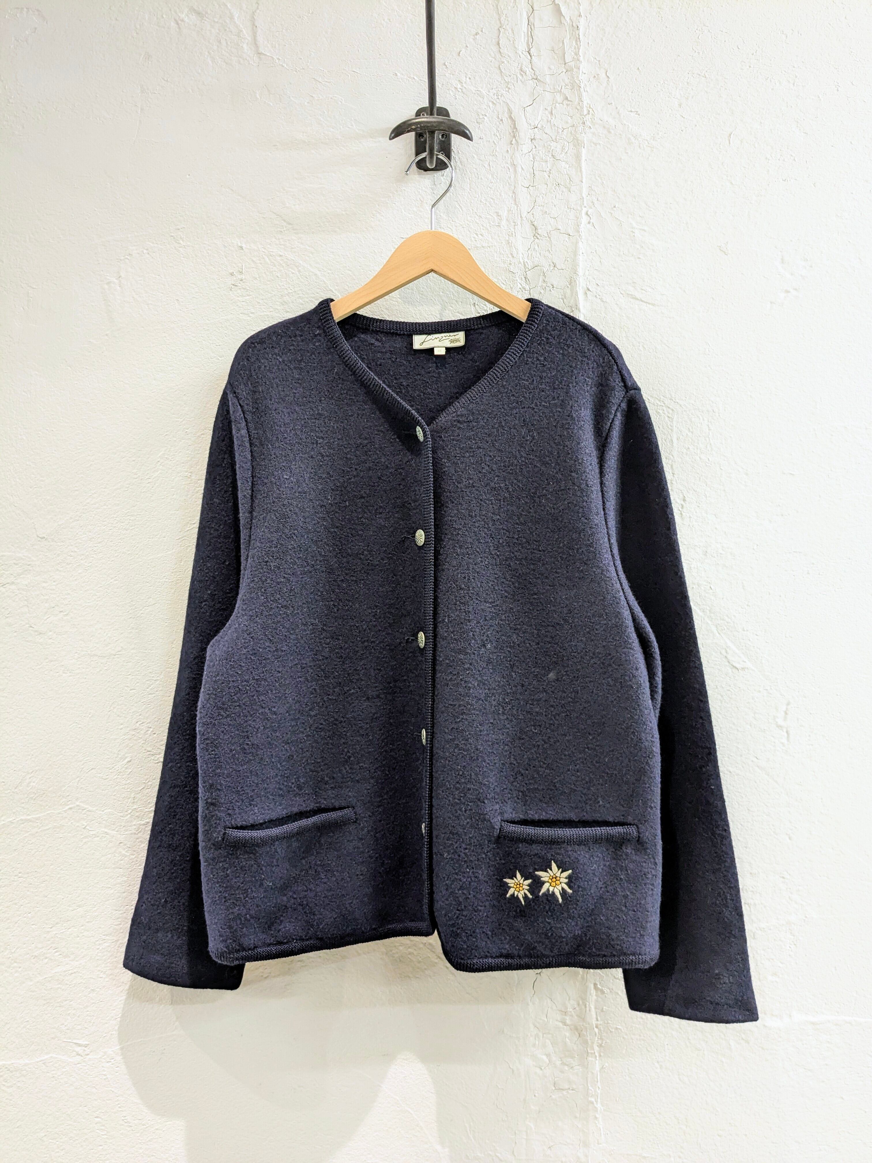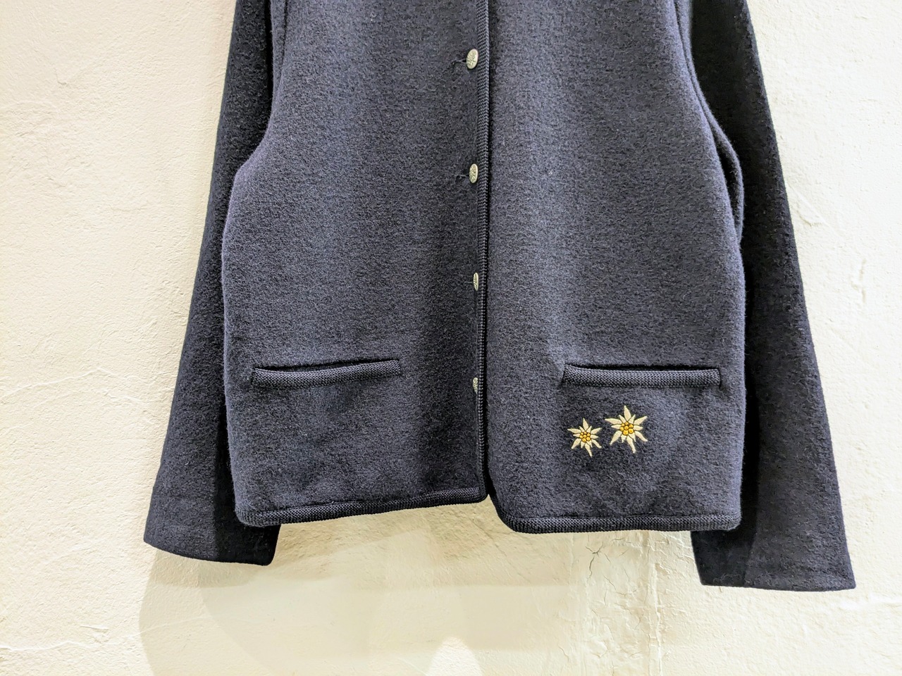 フラワー刺繍の入ったチロリアンジャケット。刺繍も裾、ポケット付近にあり主張が強すぎないデザインがまたお洒落な一着。チロリアンジャケットは、カーディガン、ジャケットの中間くらいの作りなのが、程よい抜け感などがあり、個人的にはとても好きです。こちらはボタンも花柄のモノをしようしており、細部までこだわっているデザインとなっています。とても軽く、暖かくオススメ。