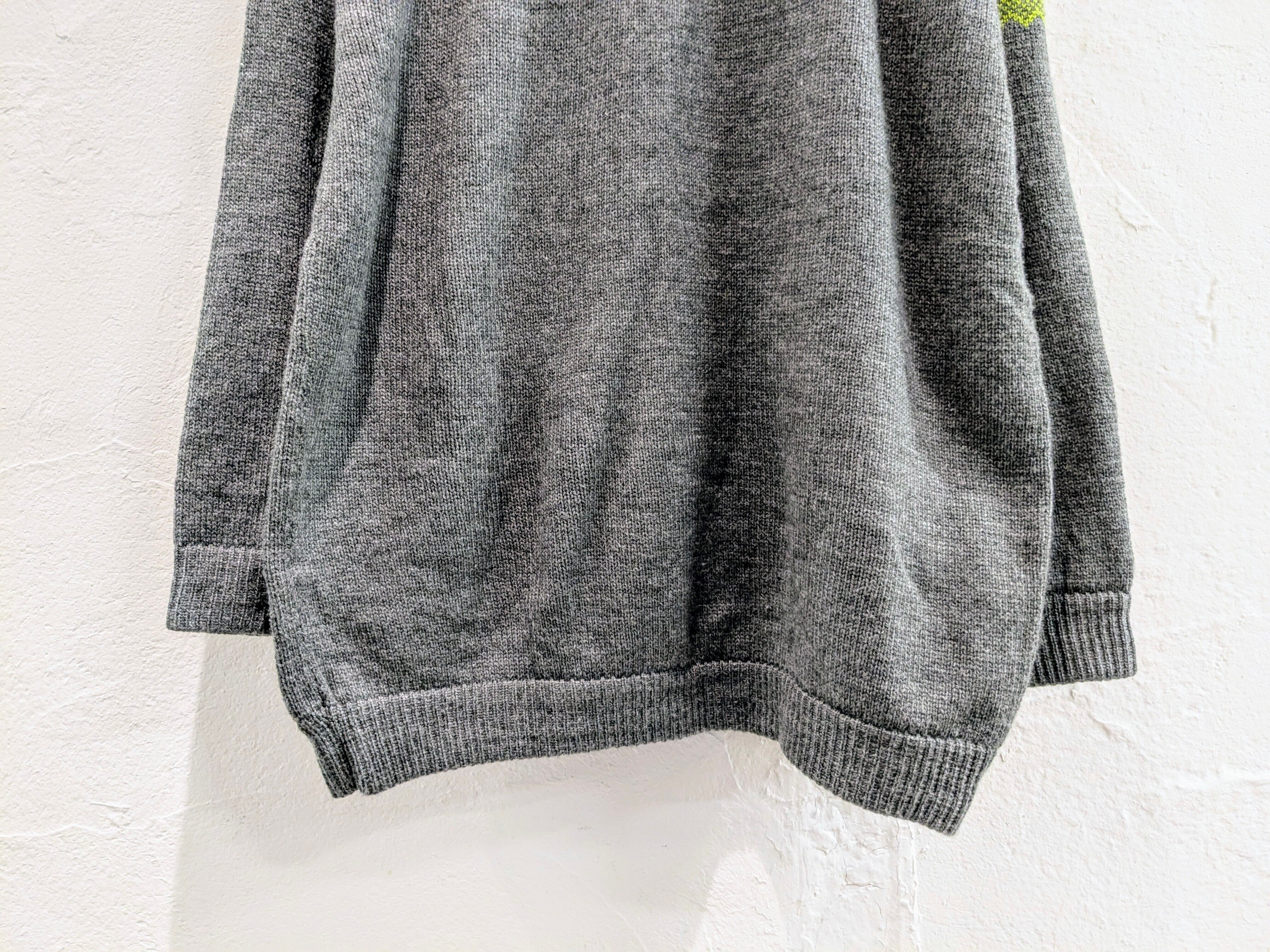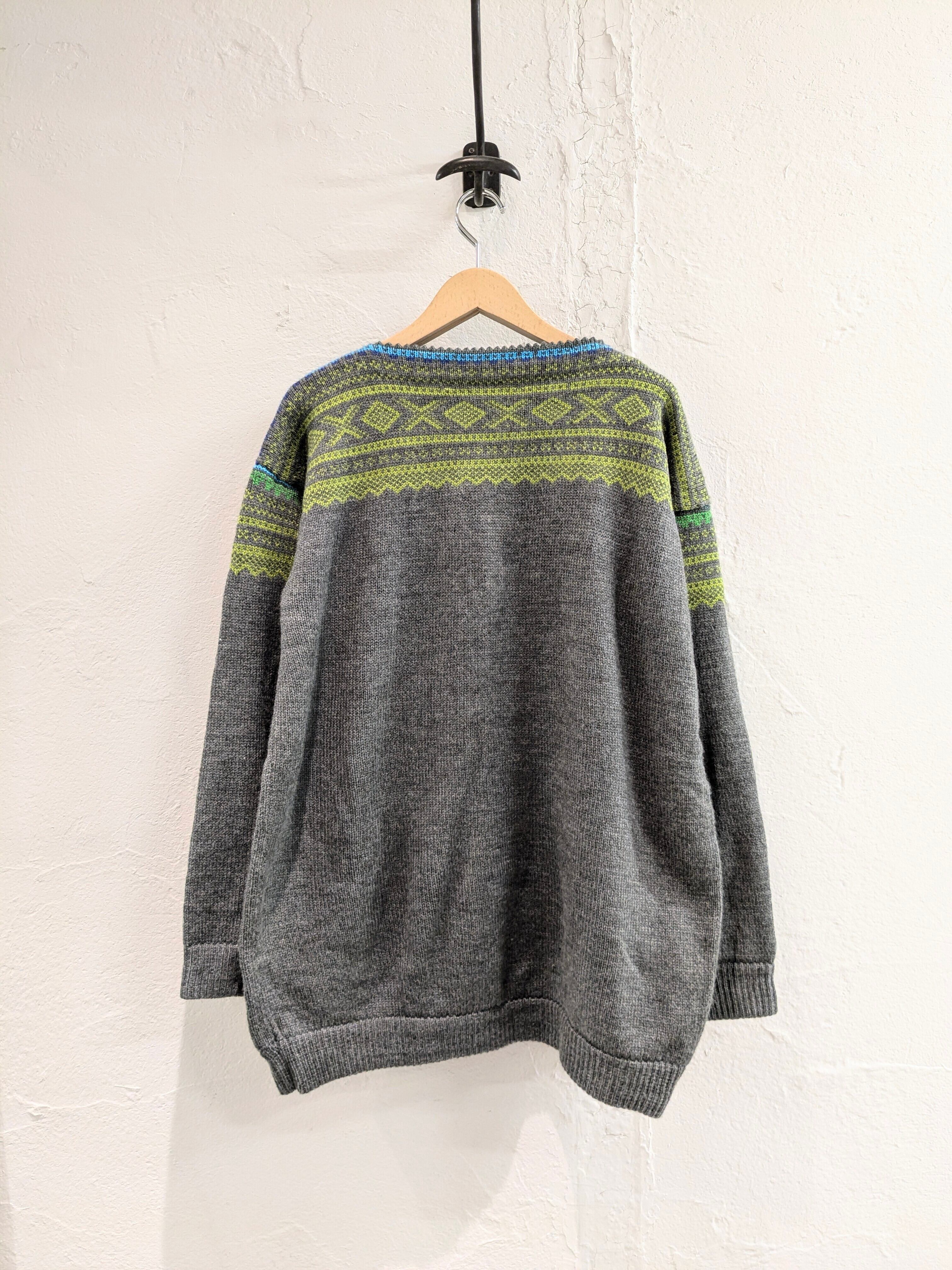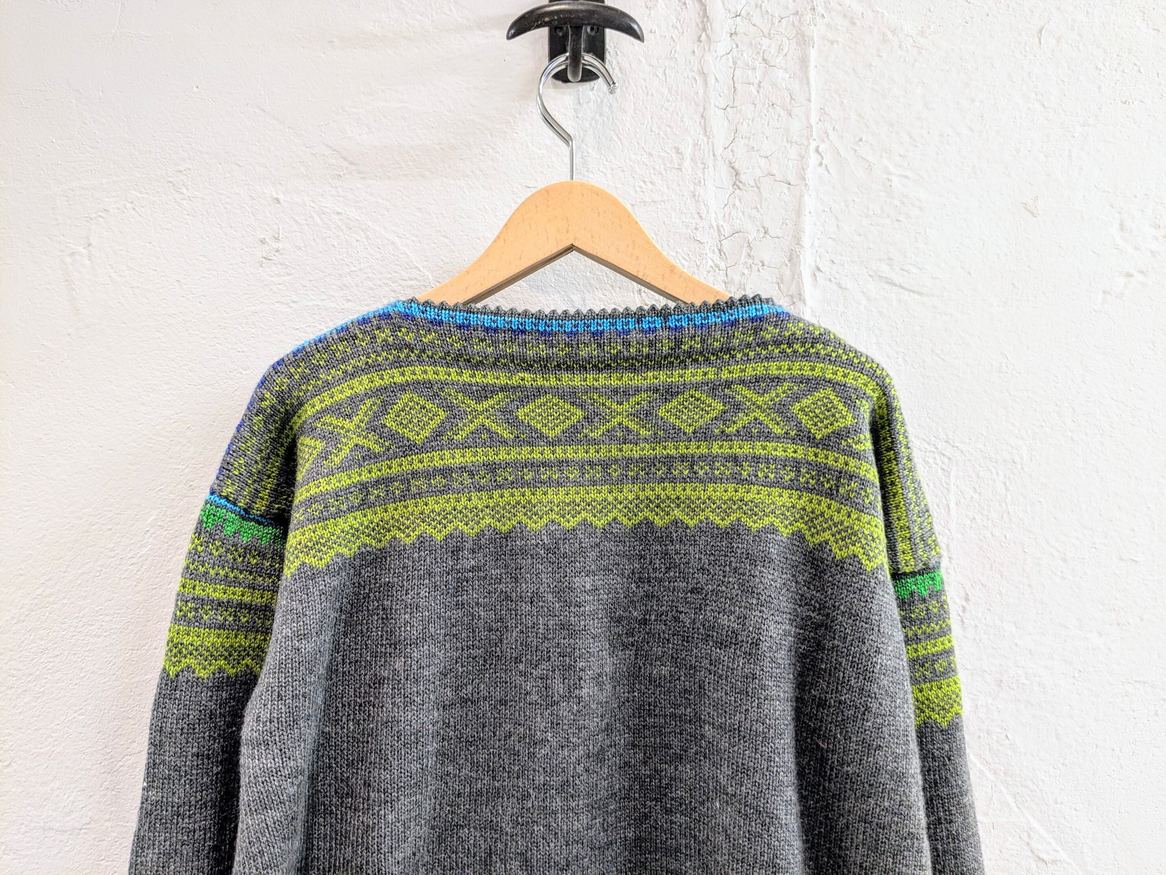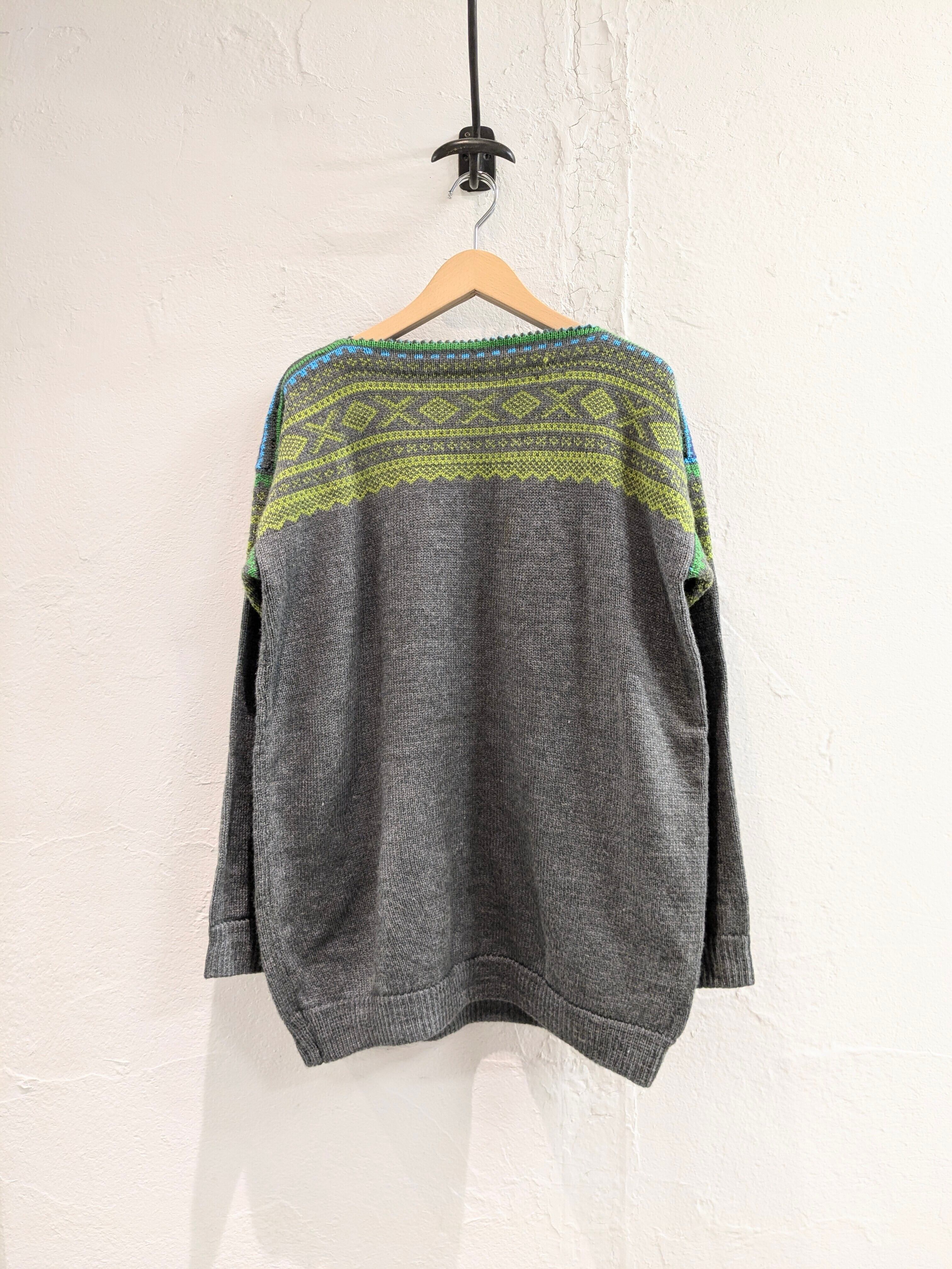 ボートネックのエスニックパターンの入ったニットになります。サイズ感はたっぷりしており、また生地感自体はとても柔らかく着やすくなっています。若干汚れあり。