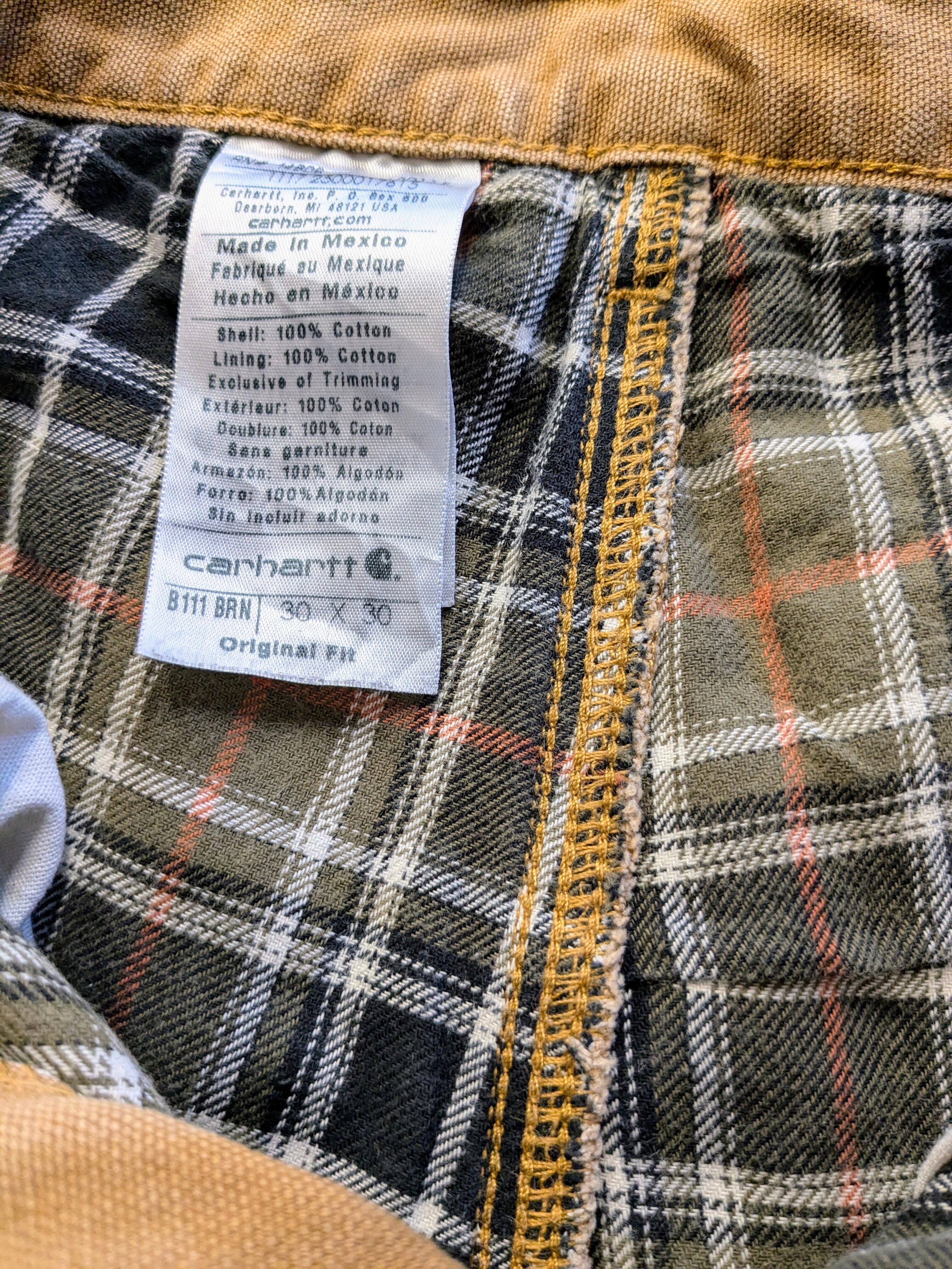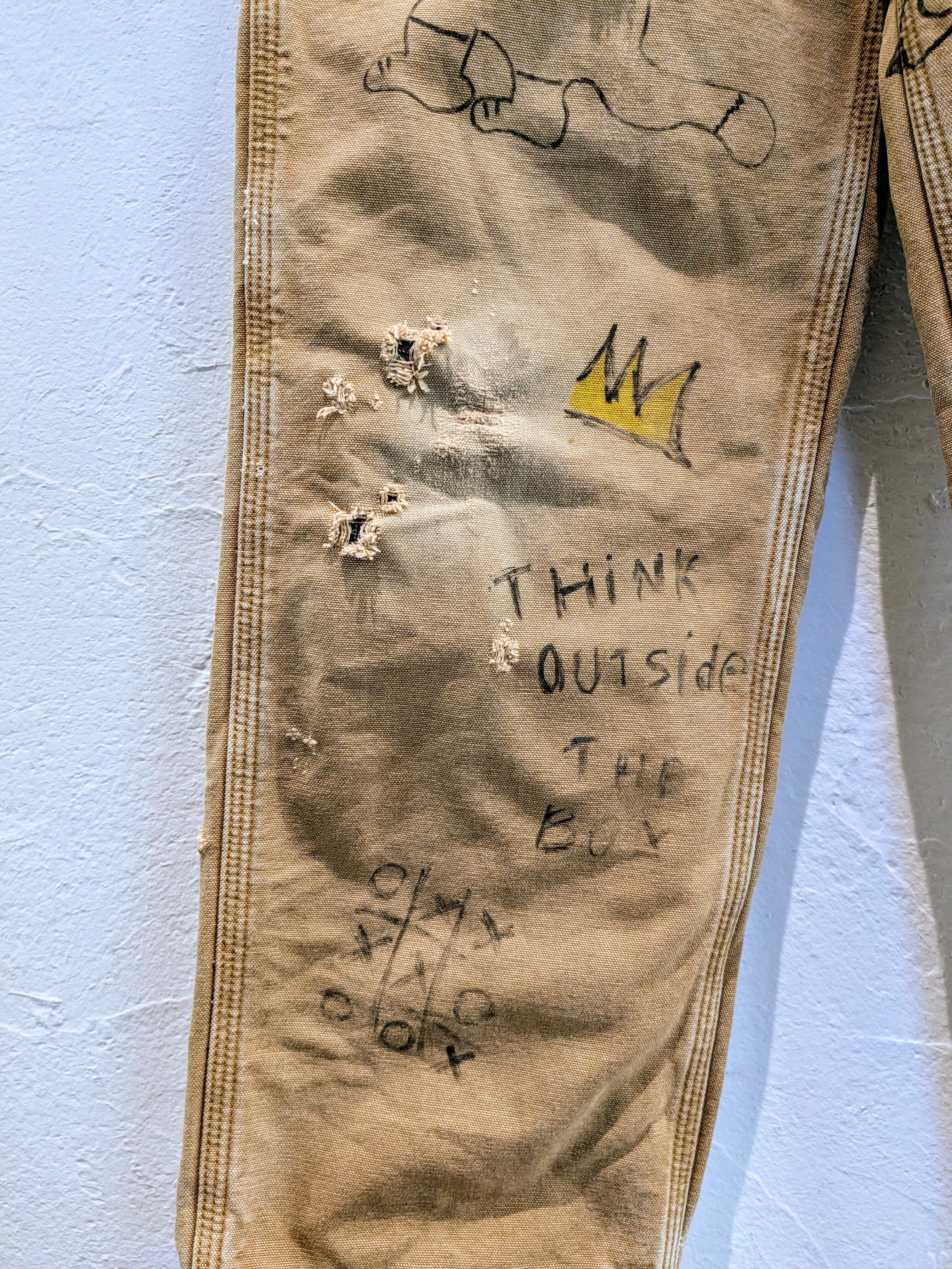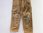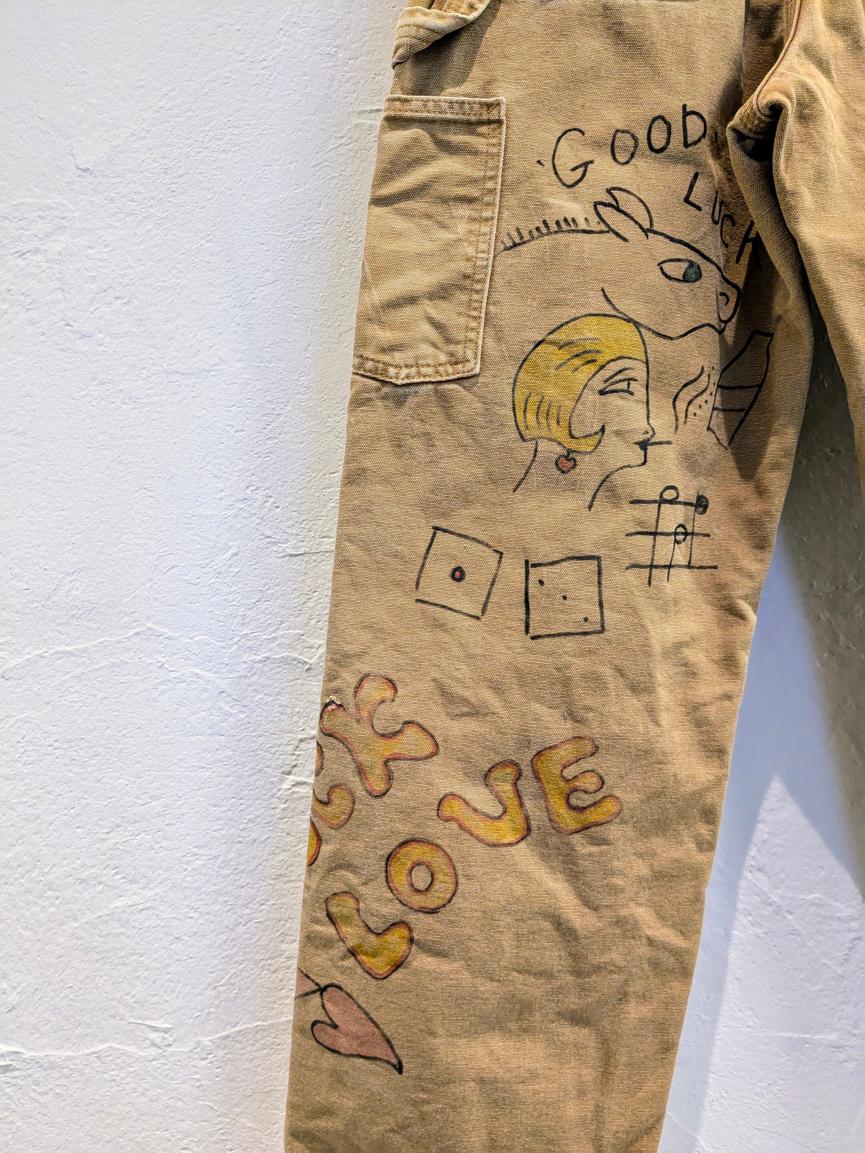 カーハートのダックパンツに手描きデザインがされたこちら。メモリアルパンツ風に仕上ったこちら。唯一無二の一点モノとなっています。ダメージ、色落ちなどは元々のボディのモノになります。裏地に、チェックのブランケットが貼ってあるのも珍しいかと。ダメージのところから少しですが、チェックが覗いています。手洗い推奨。