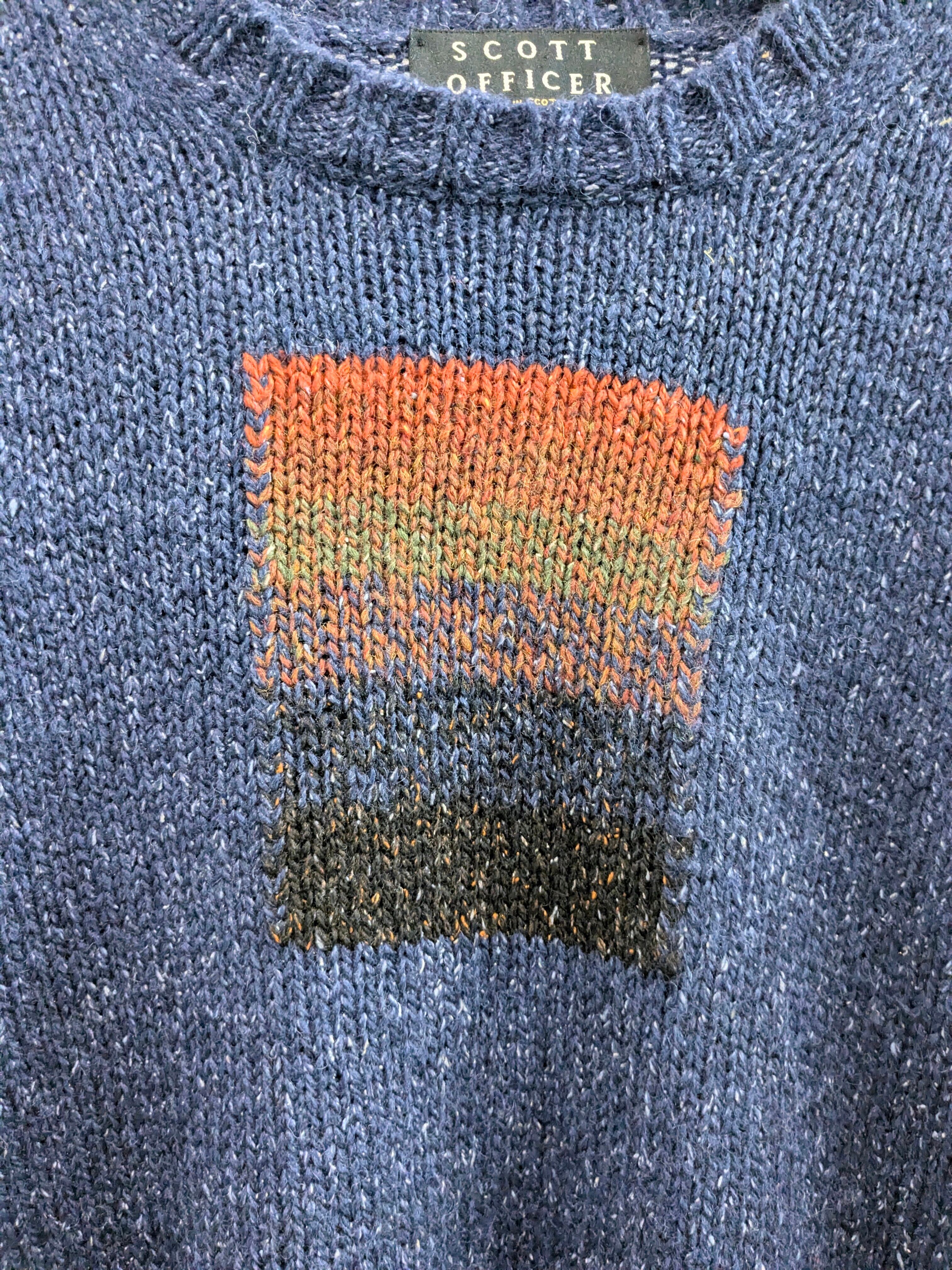 抽象画のようなデザインが編み込まれたデザインニット。大きすぎないほどよいデザインの感じがまたちょうどいい一着。また、スコットランド製というのも嬉しいポイント。スコットランドのニットは良質な糸と美しい色、丁寧な編みが特徴で、肌触りがよく、保温性に優れており、軽くて、暖かい、汗などの吸湿速乾性に優れています。さらにこちらは、シルクが入っておりチクチク感もなく滑らかな着心地となっています。