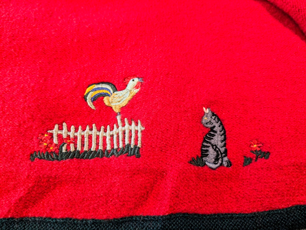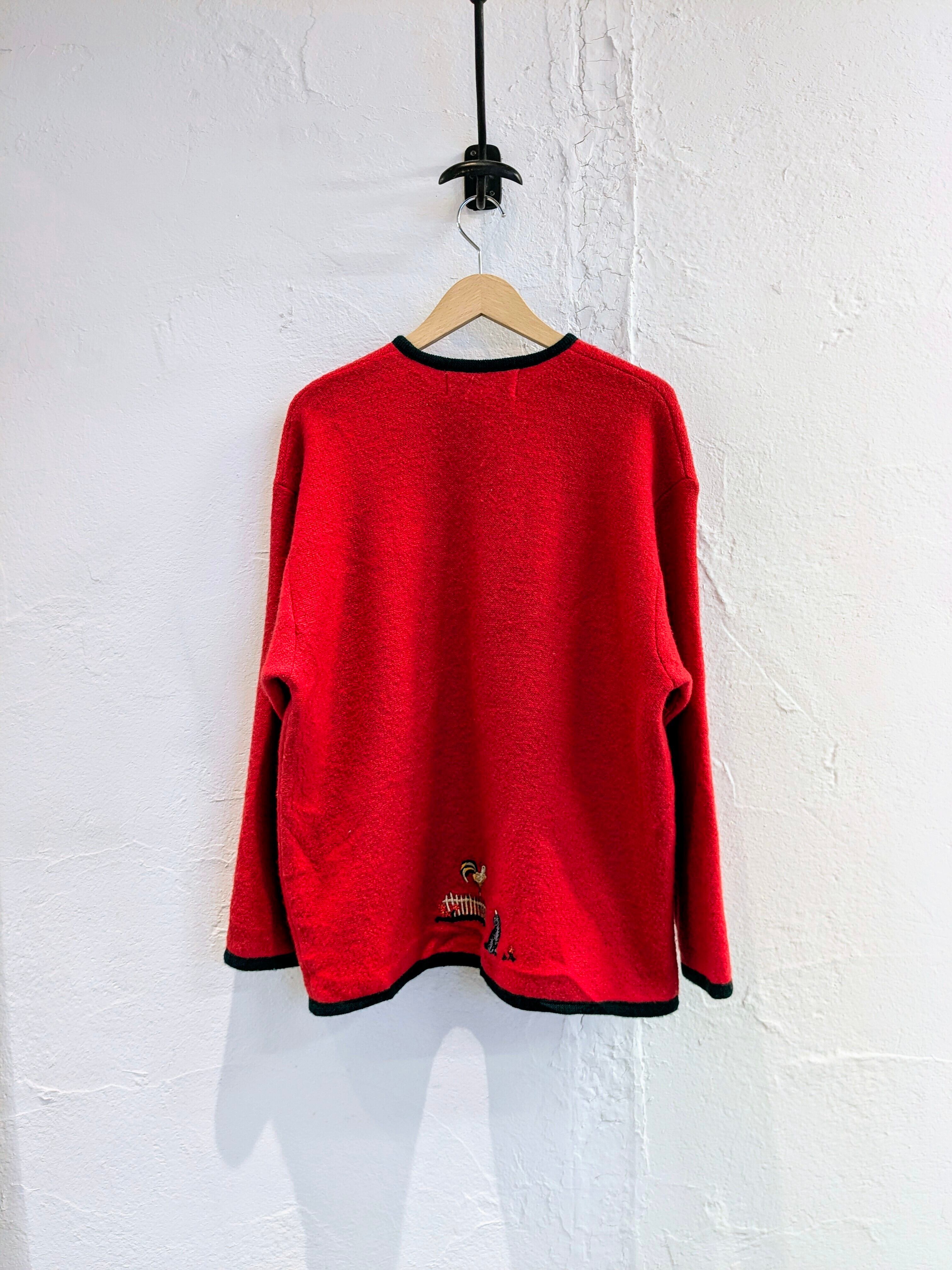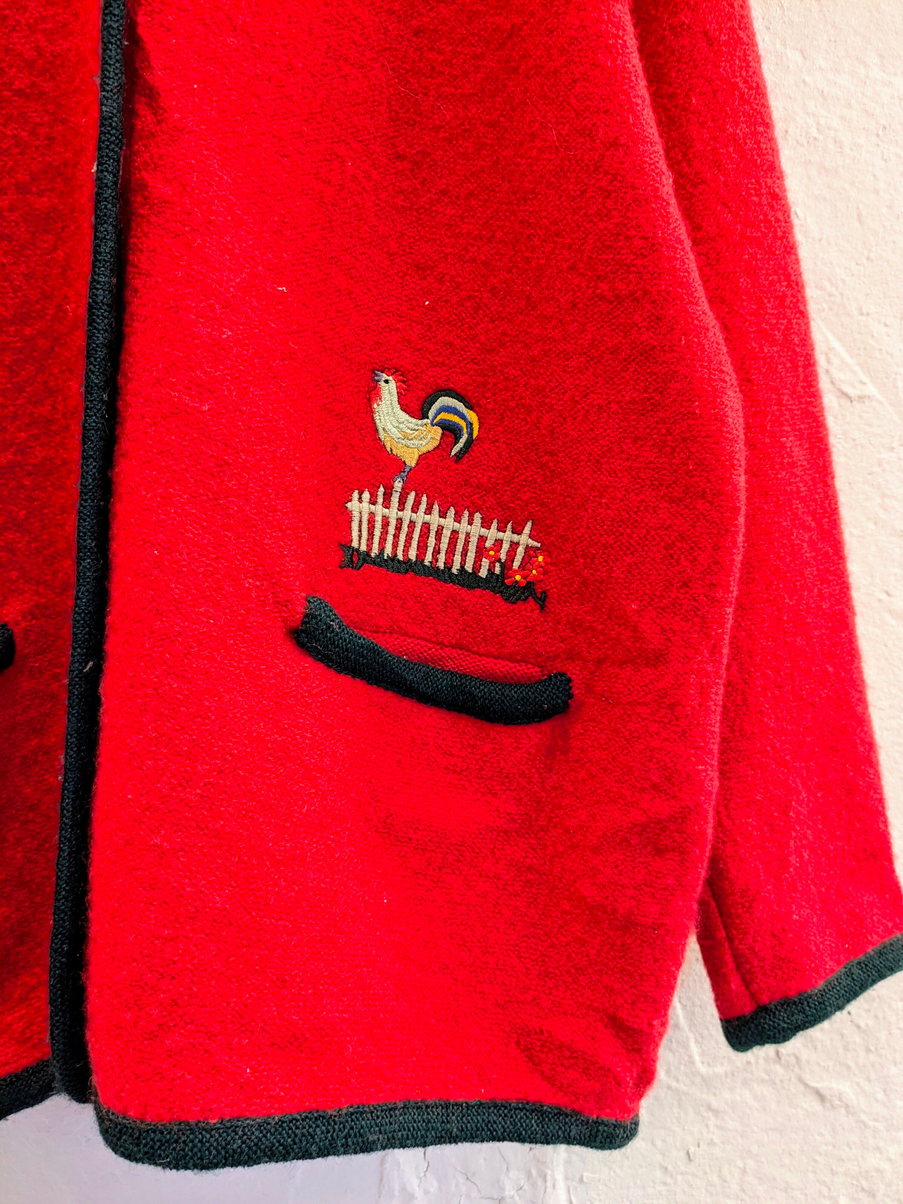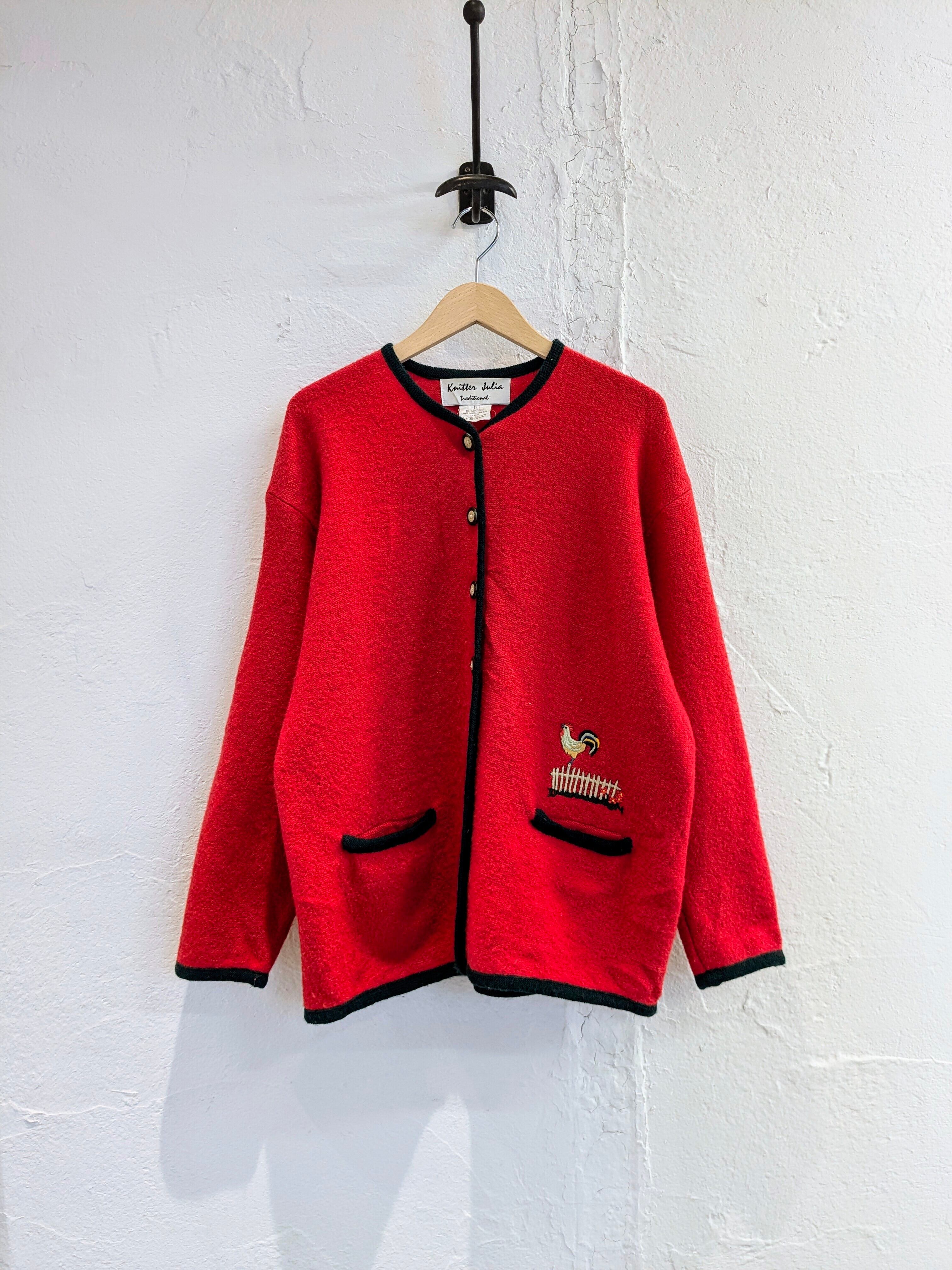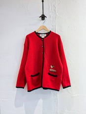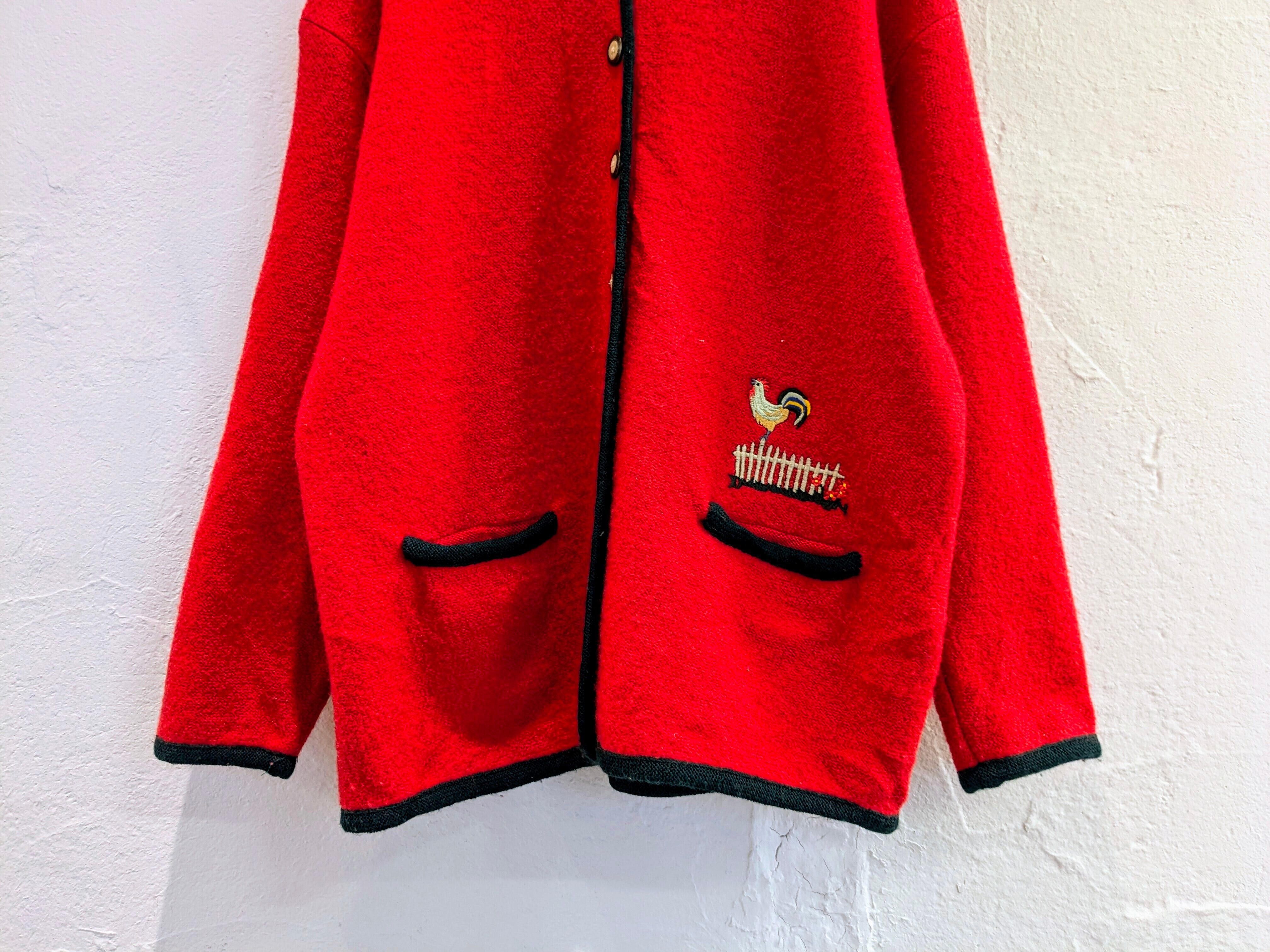 ニワトリとネコが刺繍されたデザインのチロリアンジャケット。裾のほうにひっそりといるところがさり気ないデザインでとても可愛いです。素材もとても柔らかく、軽いのでジャケットですが、カーディガン感覚でお使いいただけます。