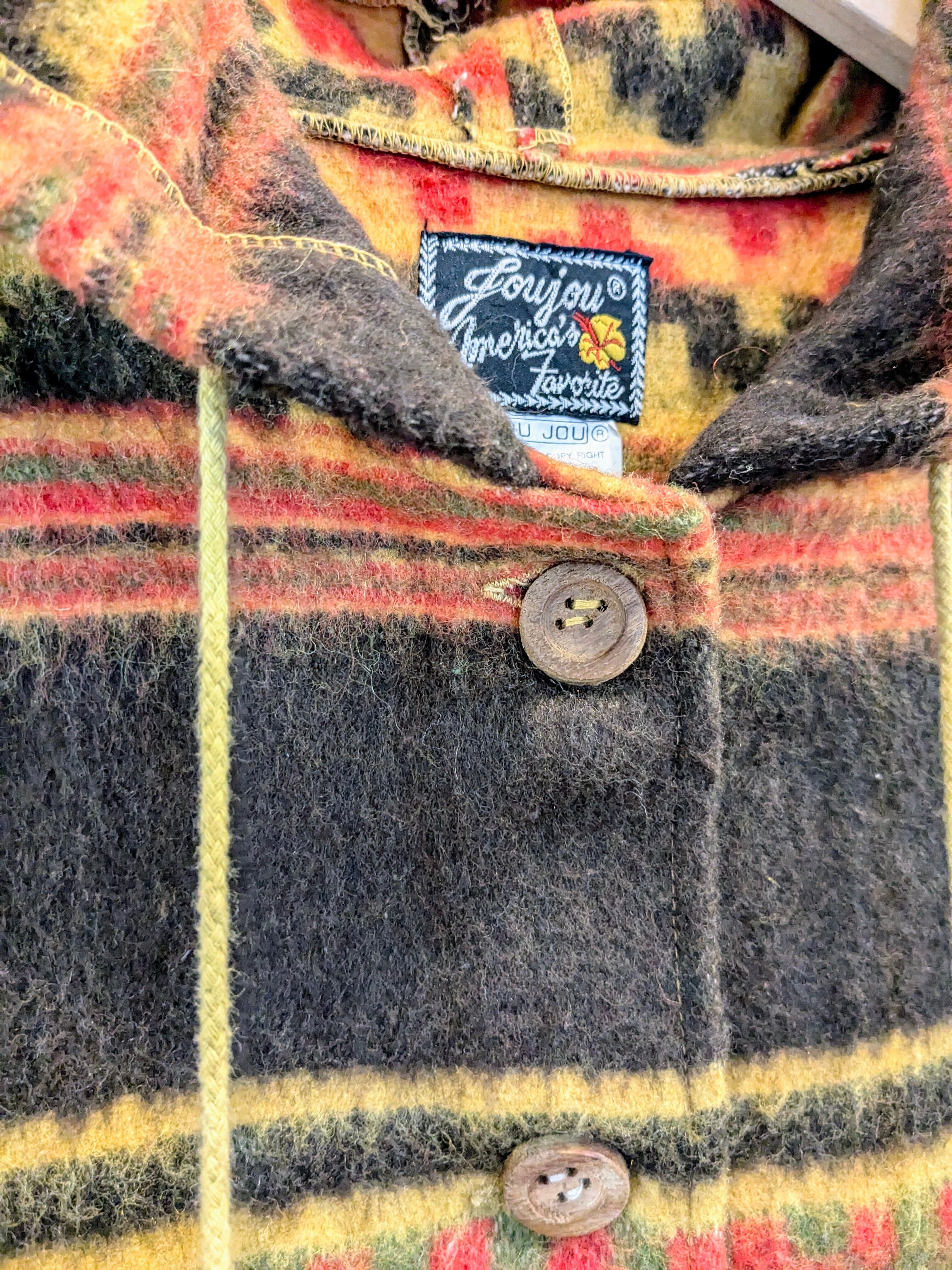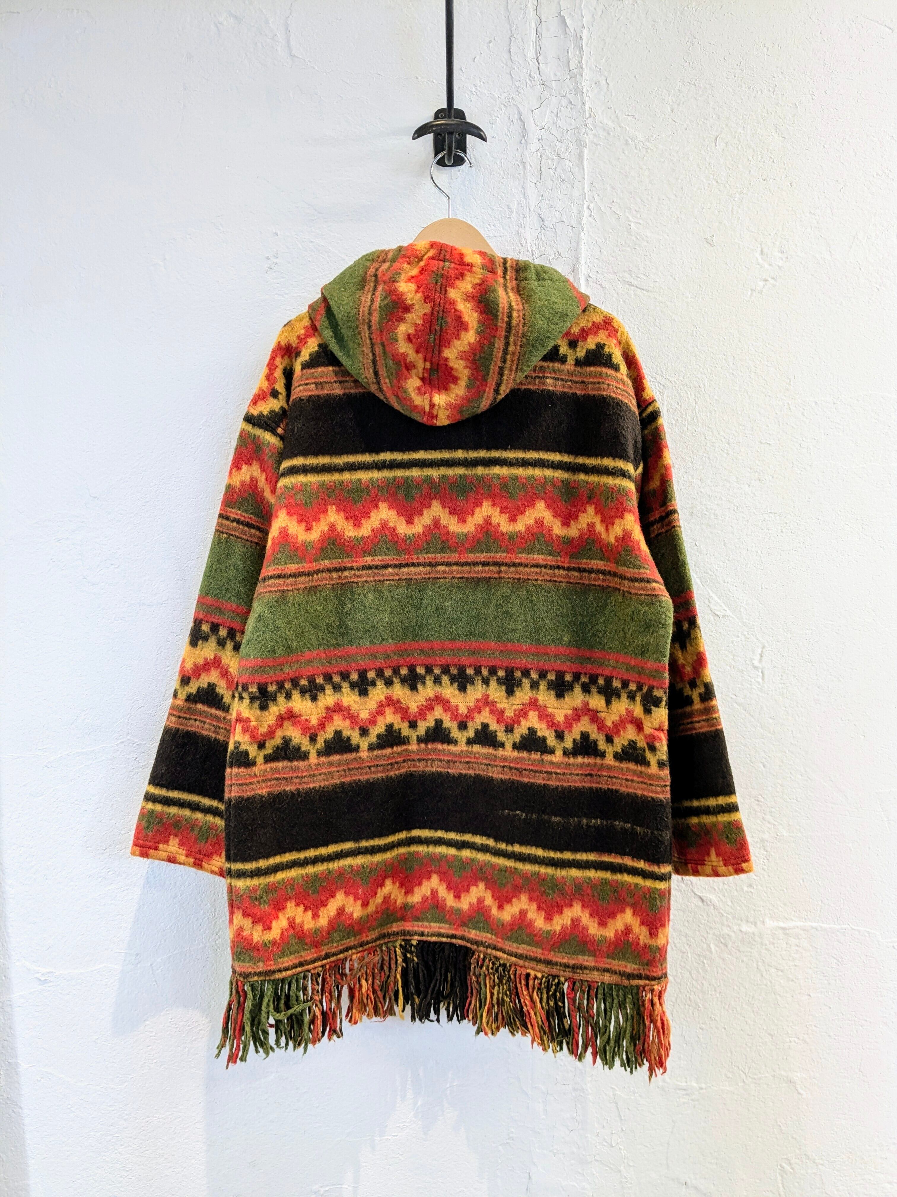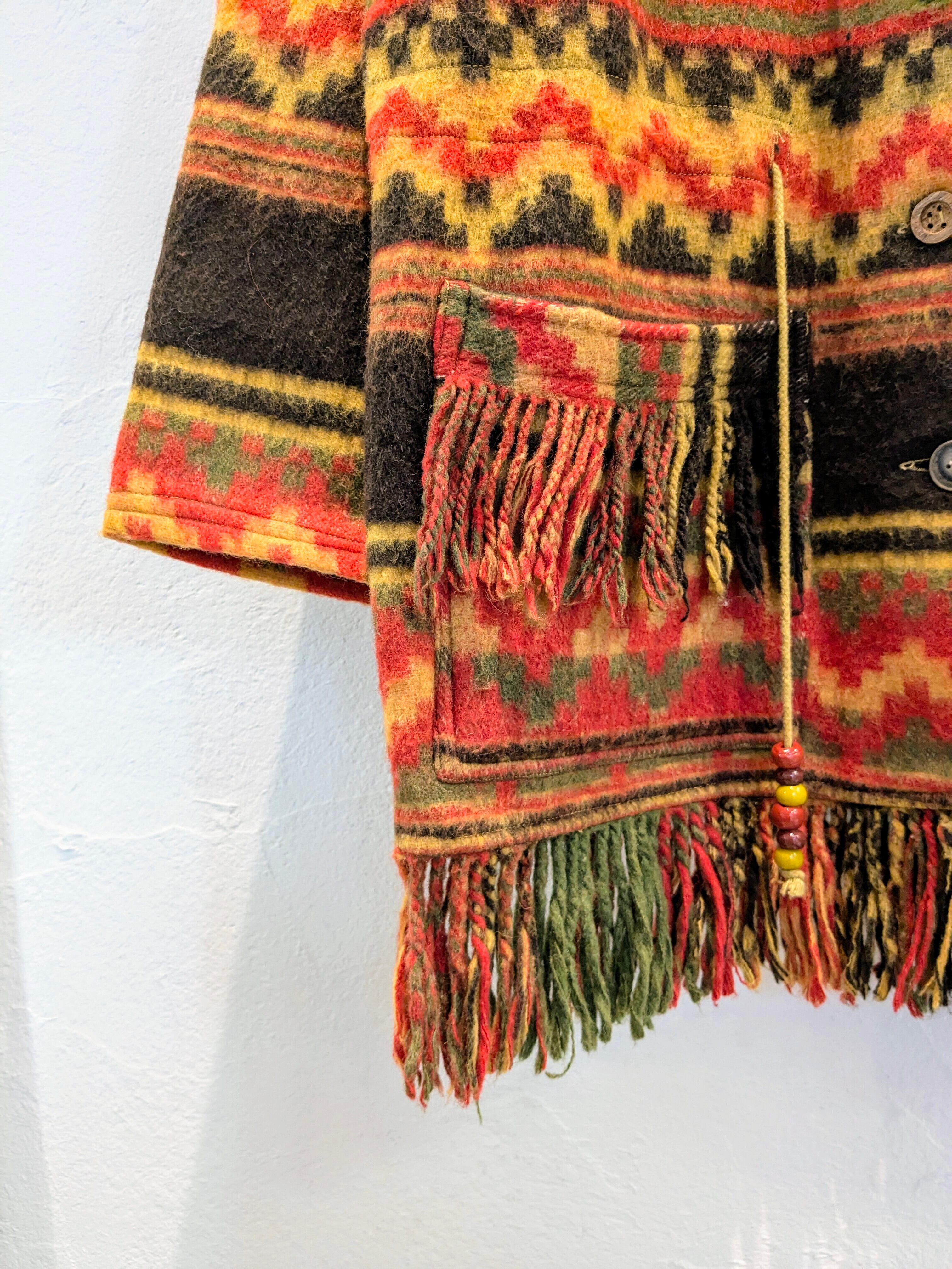 とてもデザイン性が高く、お洒落なコートになっています。各ドローコードには、ビーズのようなモノが通っており、ボタンはウッドボタン、裾、ポケットにはフリンジが付いたデザインとなります。色合いも鮮やかでとても存在感ある一着となります。