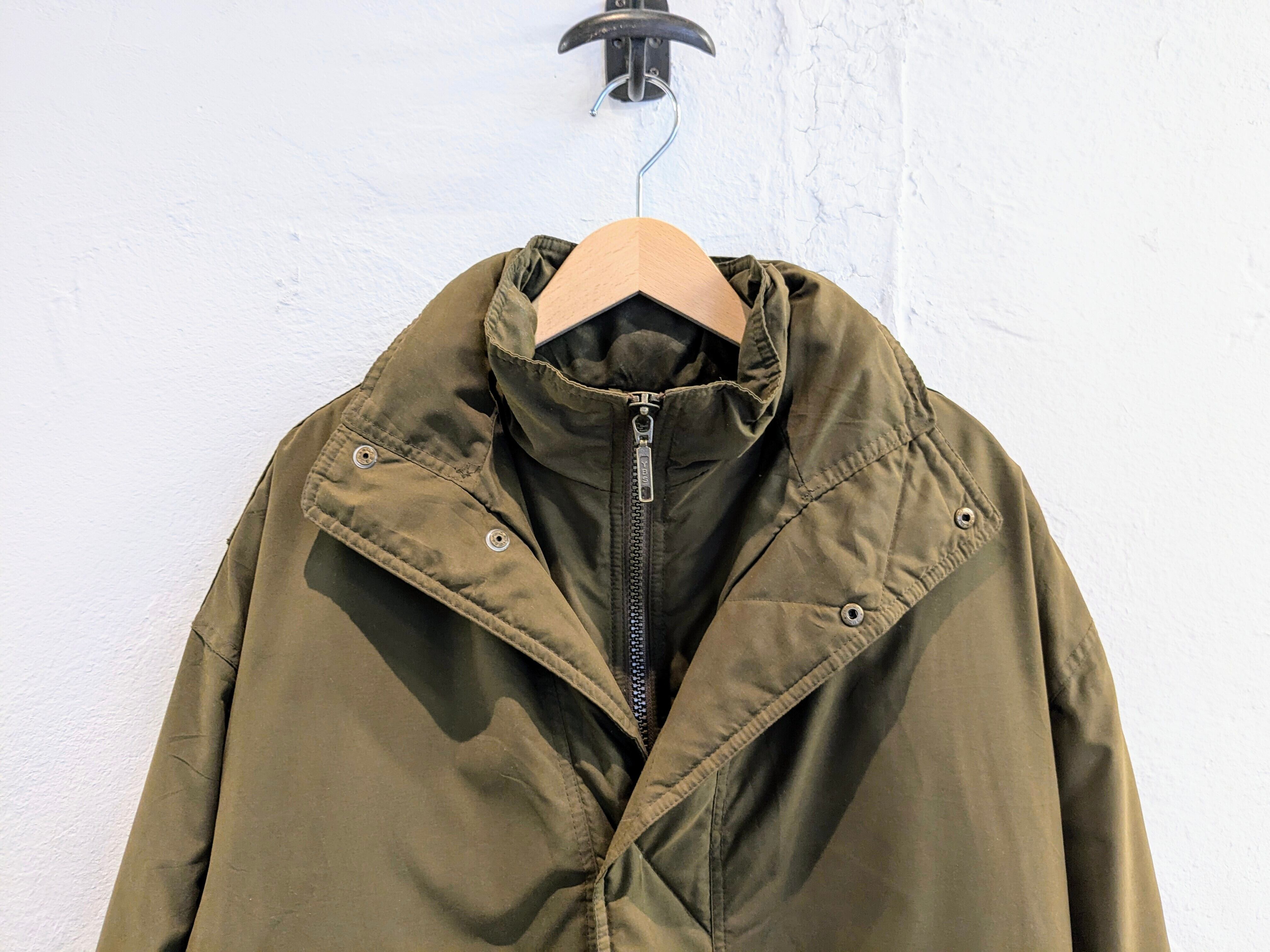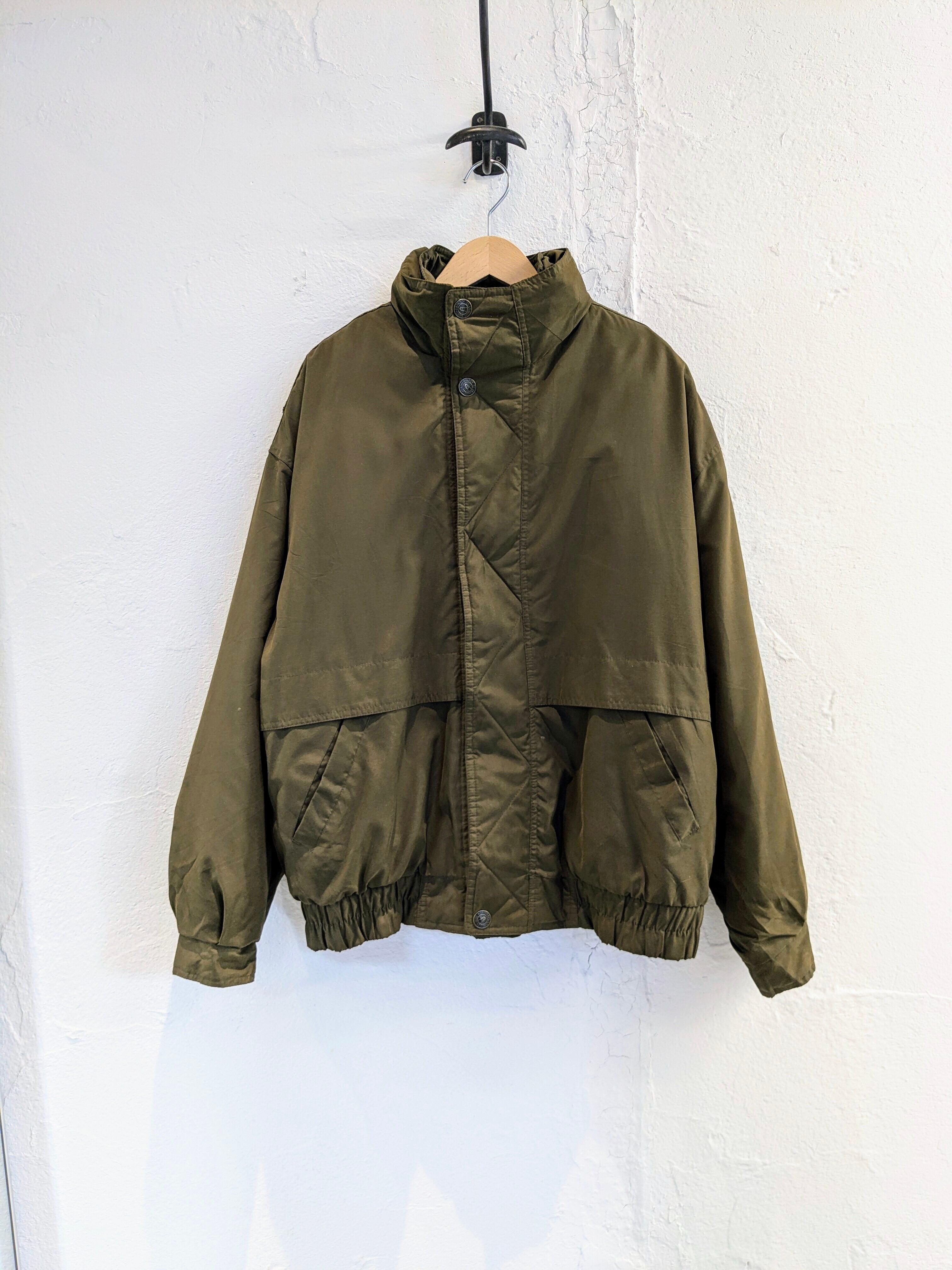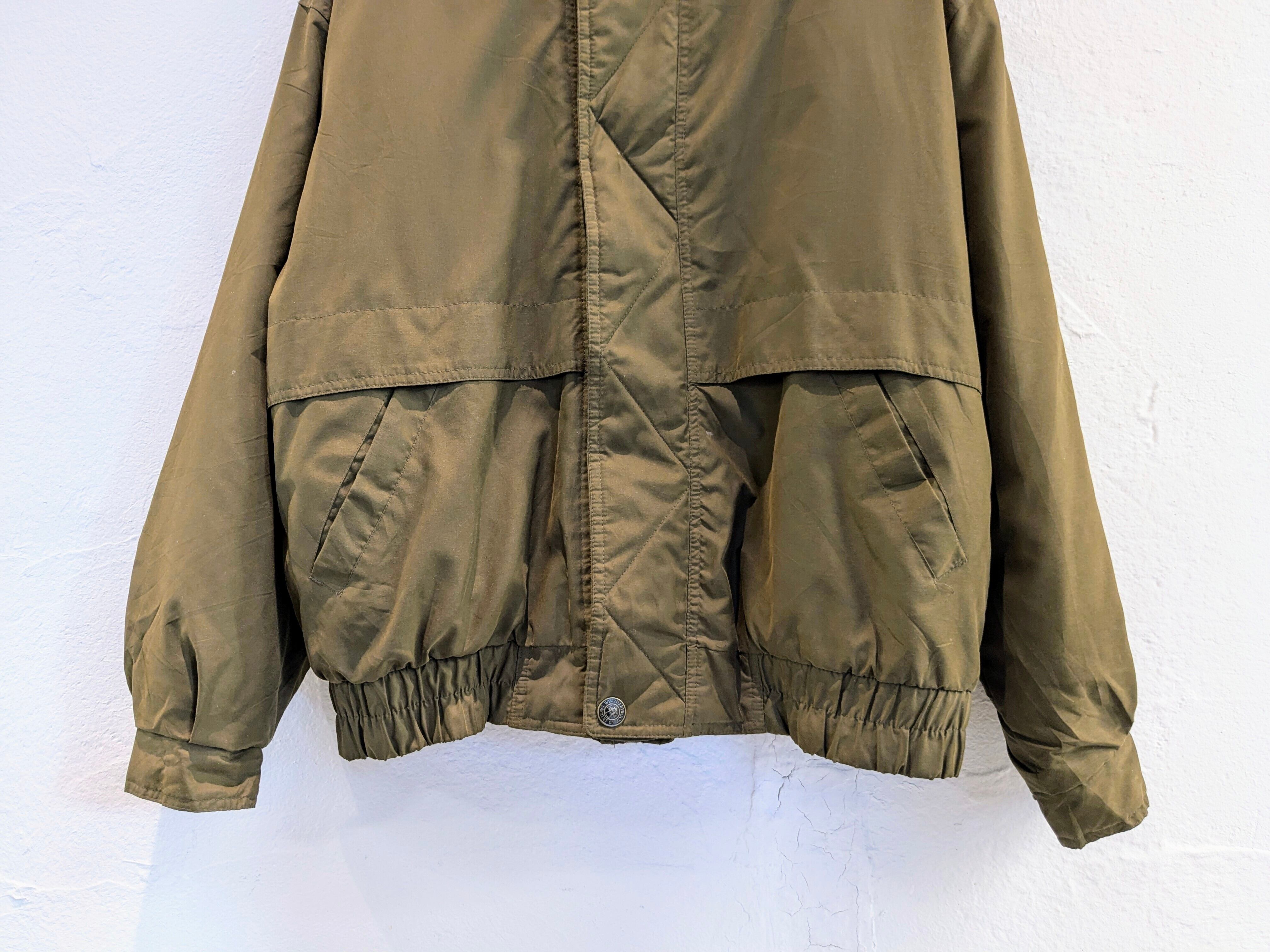 マットな生地感で上品さがある中綿のブルゾン。前立てもあり、ジップを覆ってくれるので正面からの風に強く保温性に優れています。襟には簡易のフードが収納されており、軽めの雨、雪にはこちらで防ぐことができます。腕周りにはアクションプリーツも入っているので、動きづらいなどはなく、快適に着ていただけます。色抜け、汚れがあります。