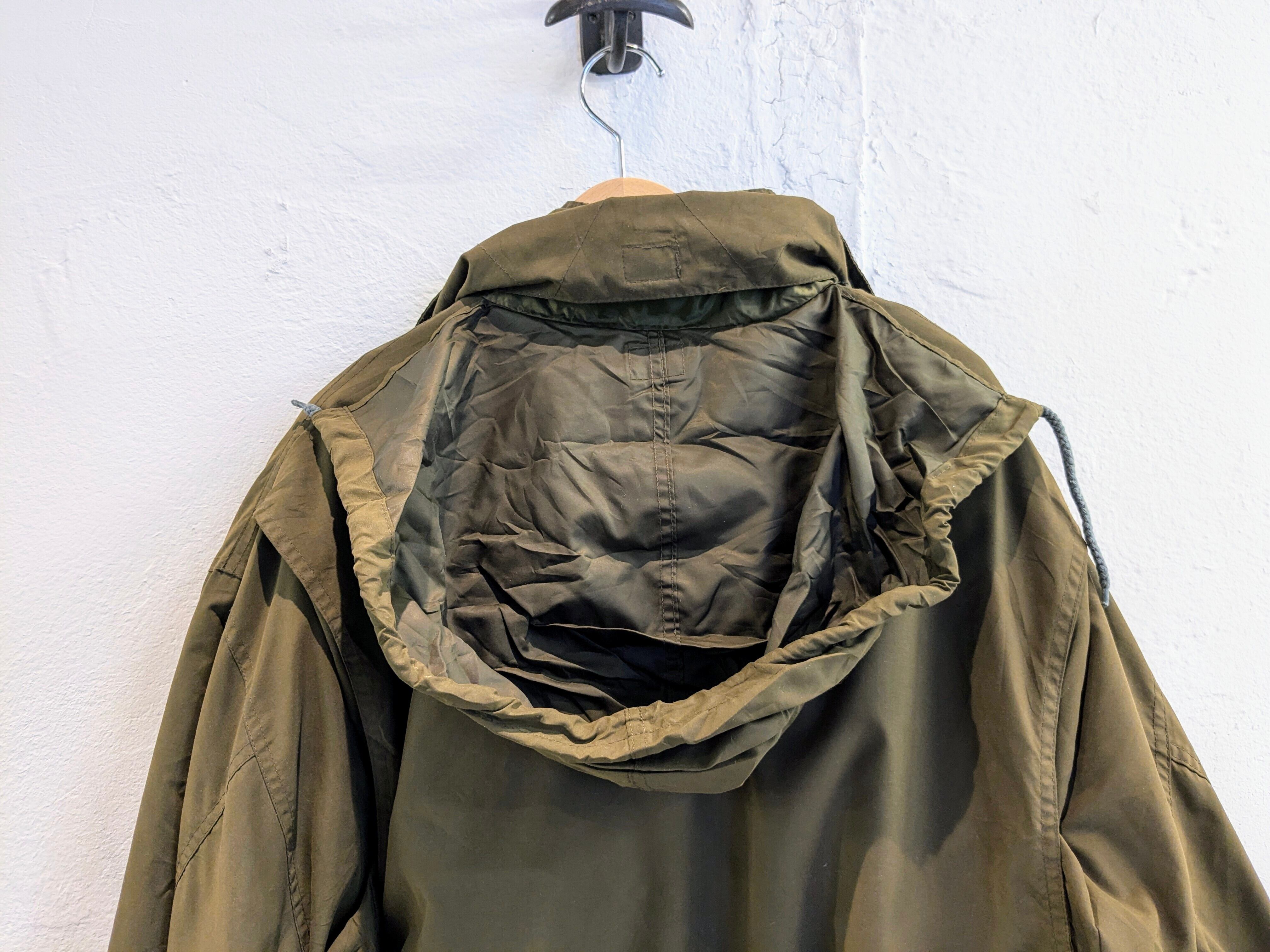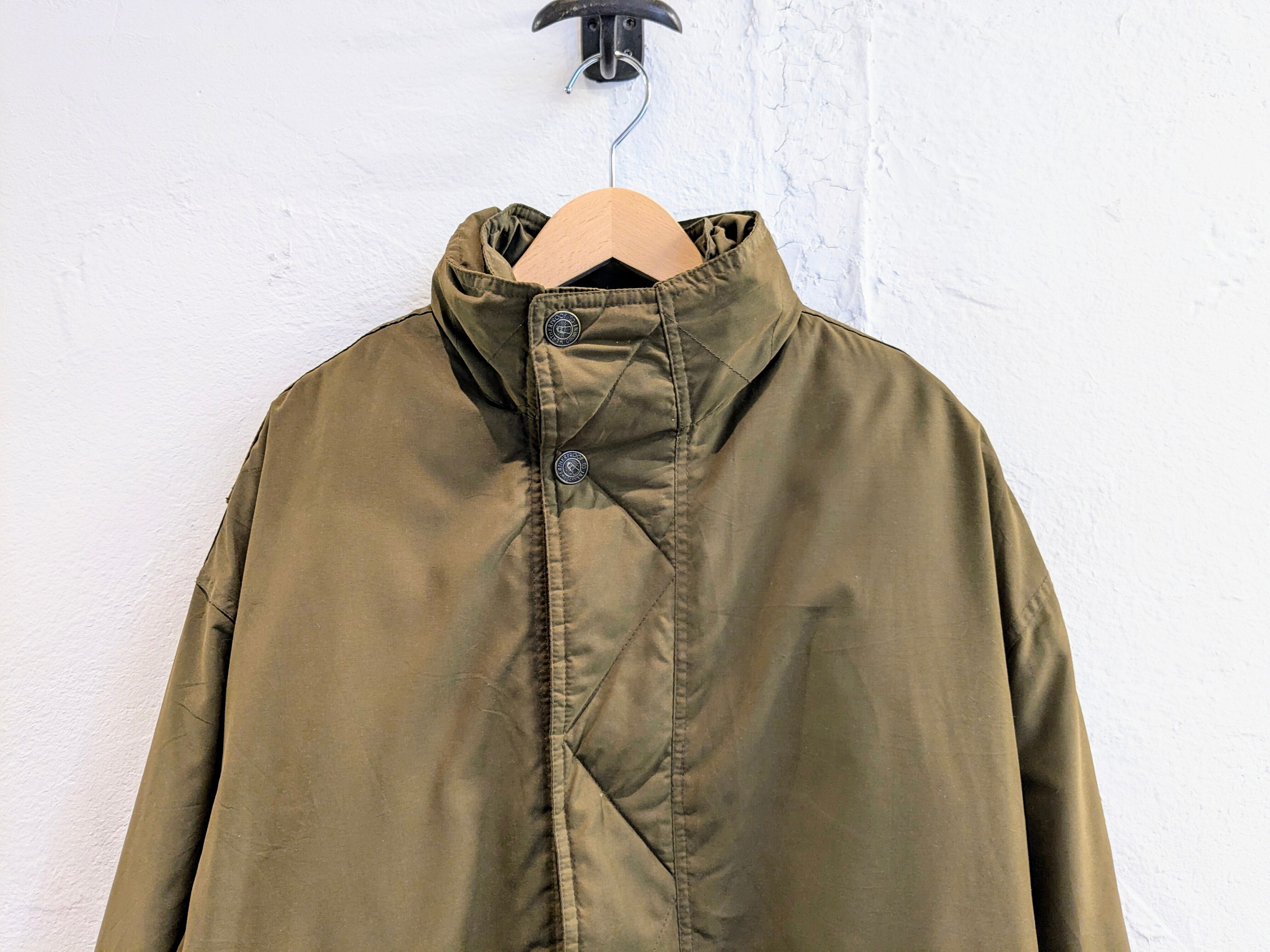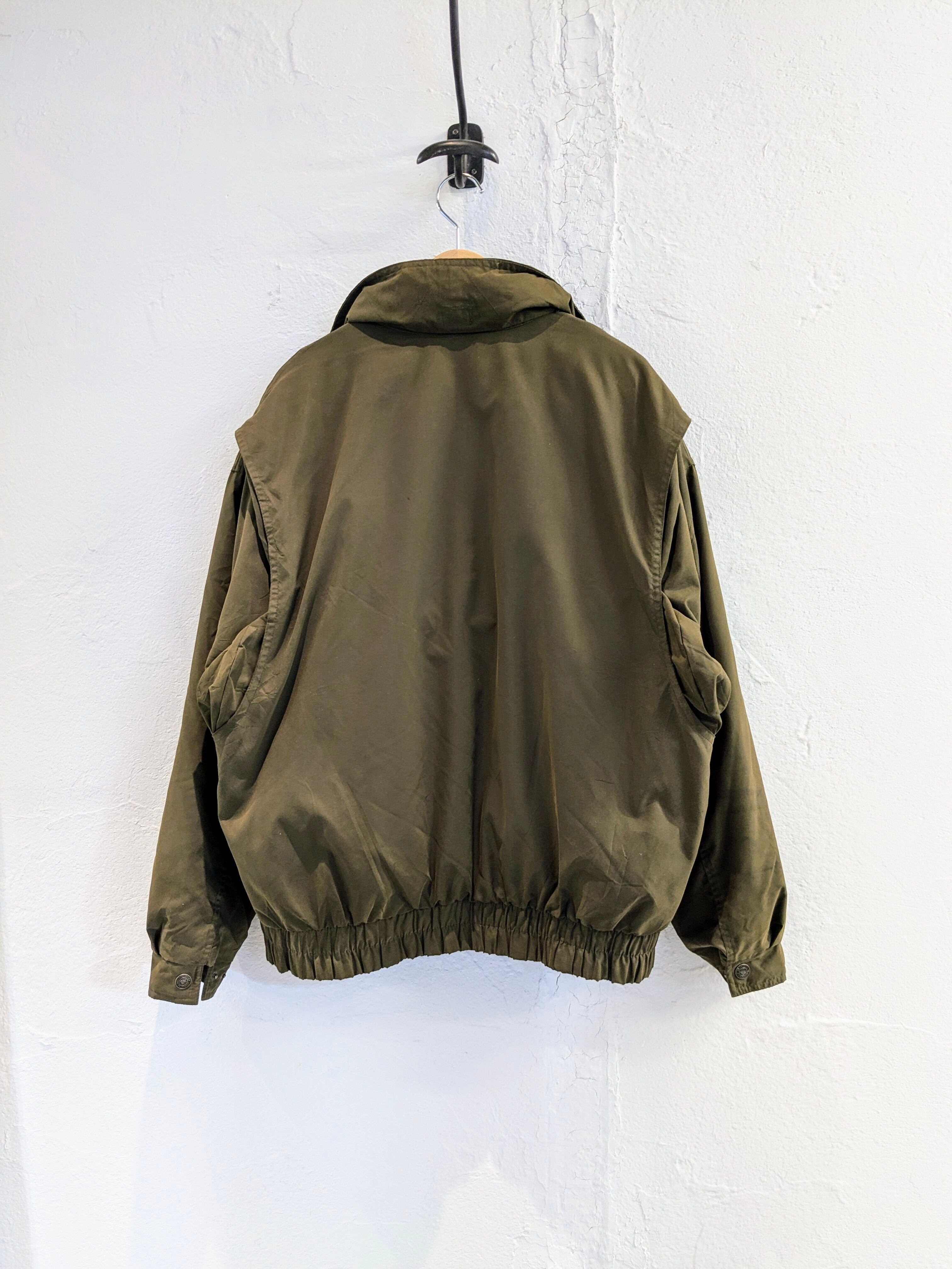 マットな生地感で上品さがある中綿のブルゾン。前立てもあり、ジップを覆ってくれるので正面からの風に強く保温性に優れています。襟には簡易のフードが収納されており、軽めの雨、雪にはこちらで防ぐことができます。腕周りにはアクションプリーツも入っているので、動きづらいなどはなく、快適に着ていただけます。色抜け、汚れがあります。