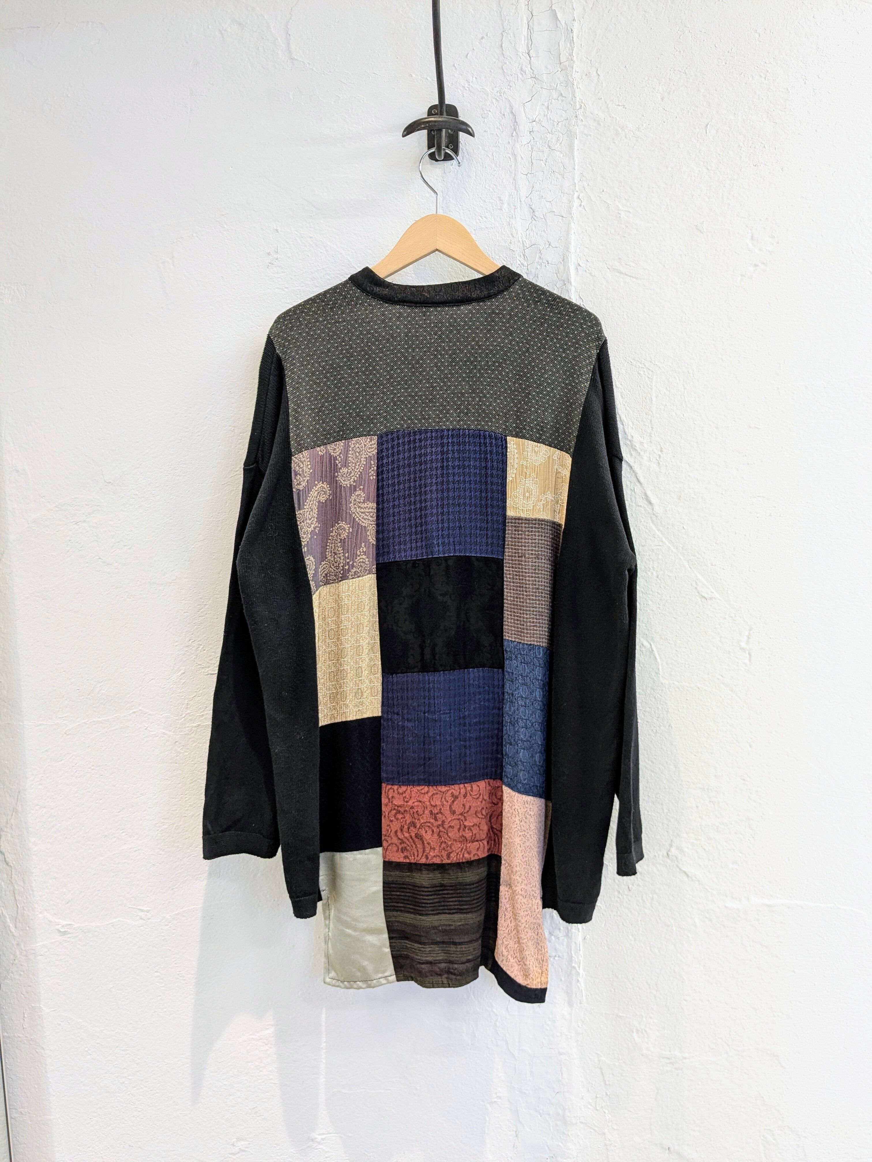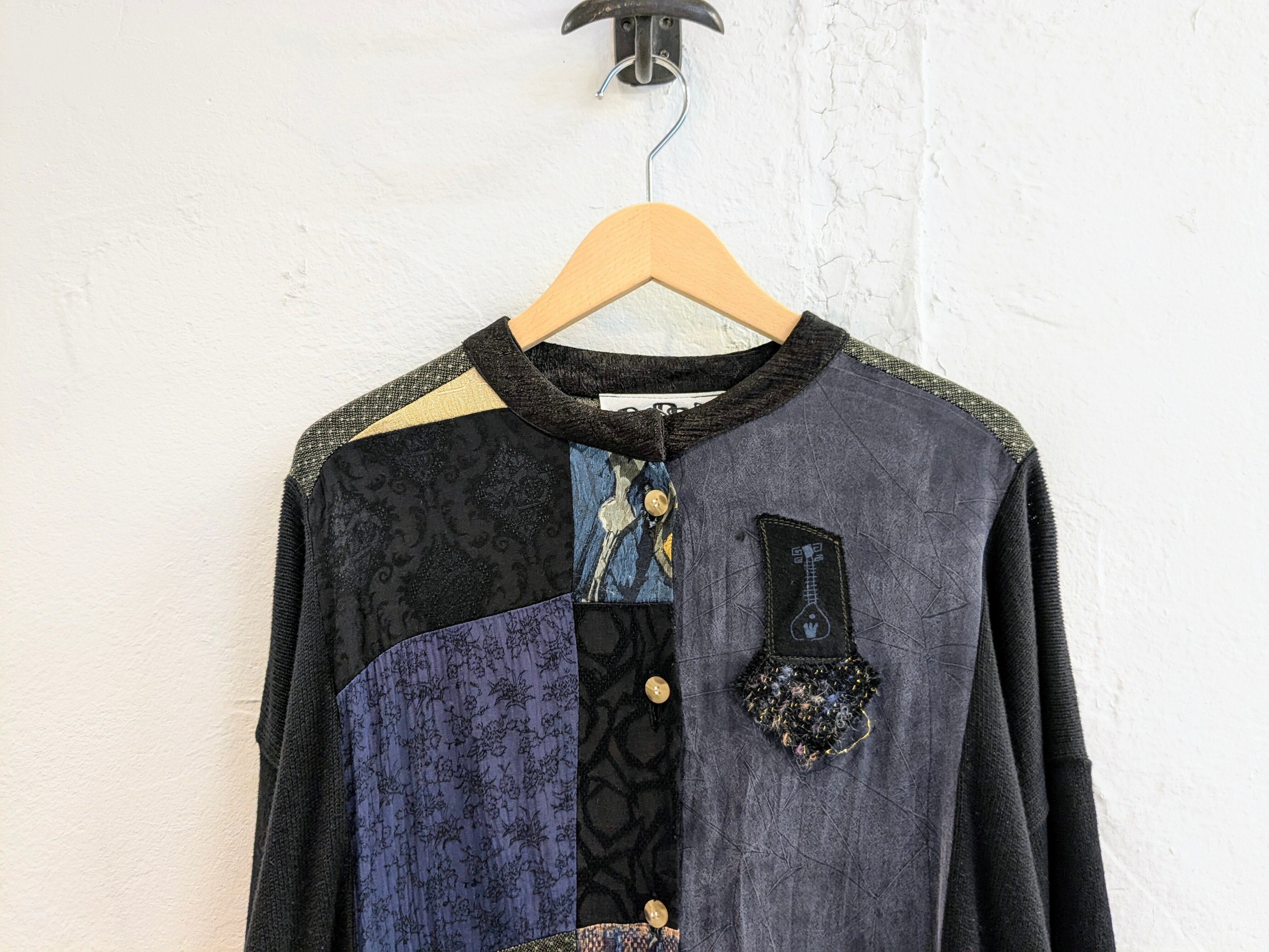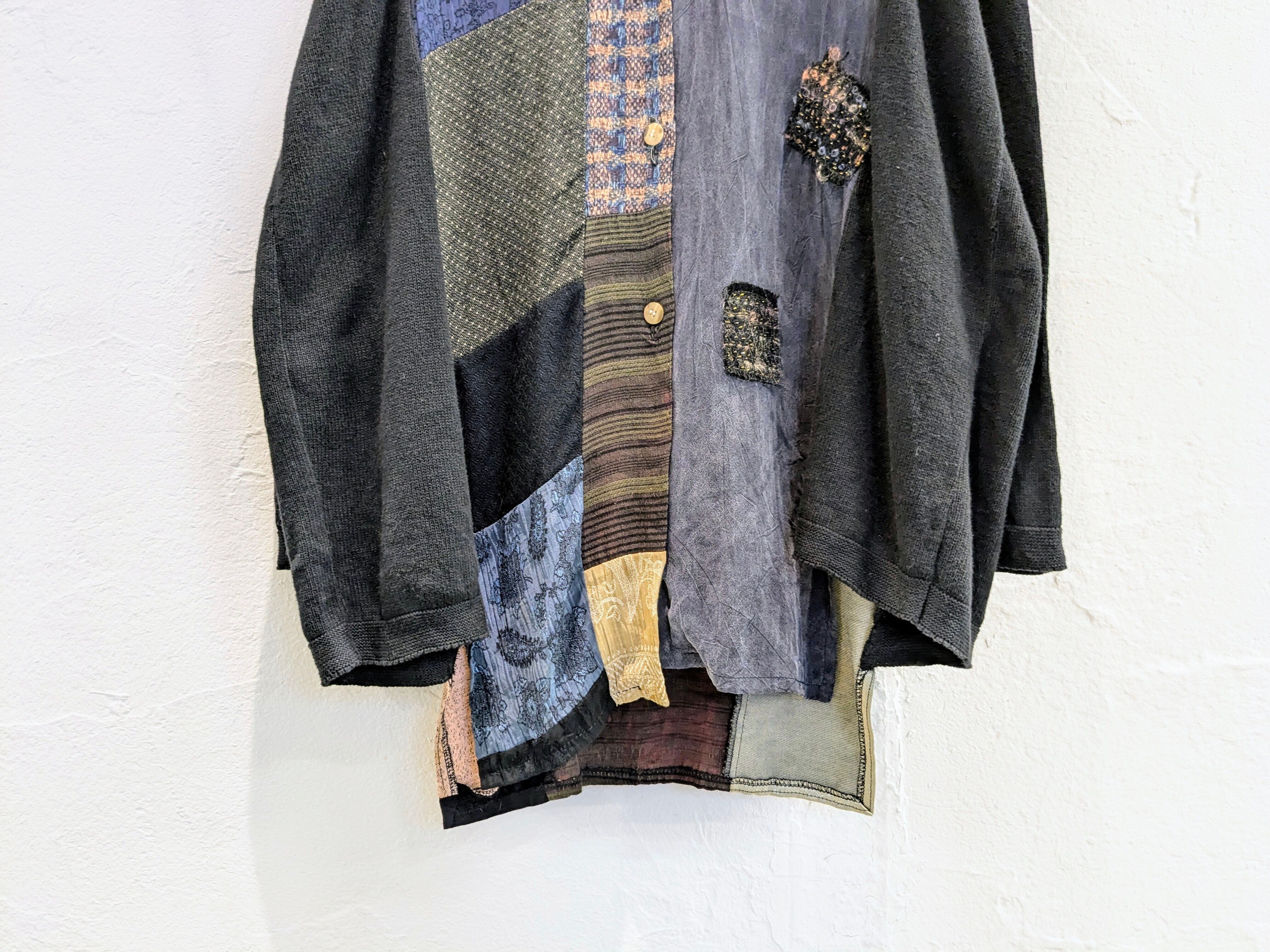肩から袖がニット生地に切り替わり、真ん中はパッチワークのデザイン、ニットとシャツ生地の部分は長さも違っていたりとデザインが盛り込まれた一着。生地的には柔らかくドレープがありますので、落ち感だったり、上品さが出たりします。上に羽織った時には、パッチワークしか見えませんが脱いだ時にまた違った表情が見えます。あまり見ないデザインかと。