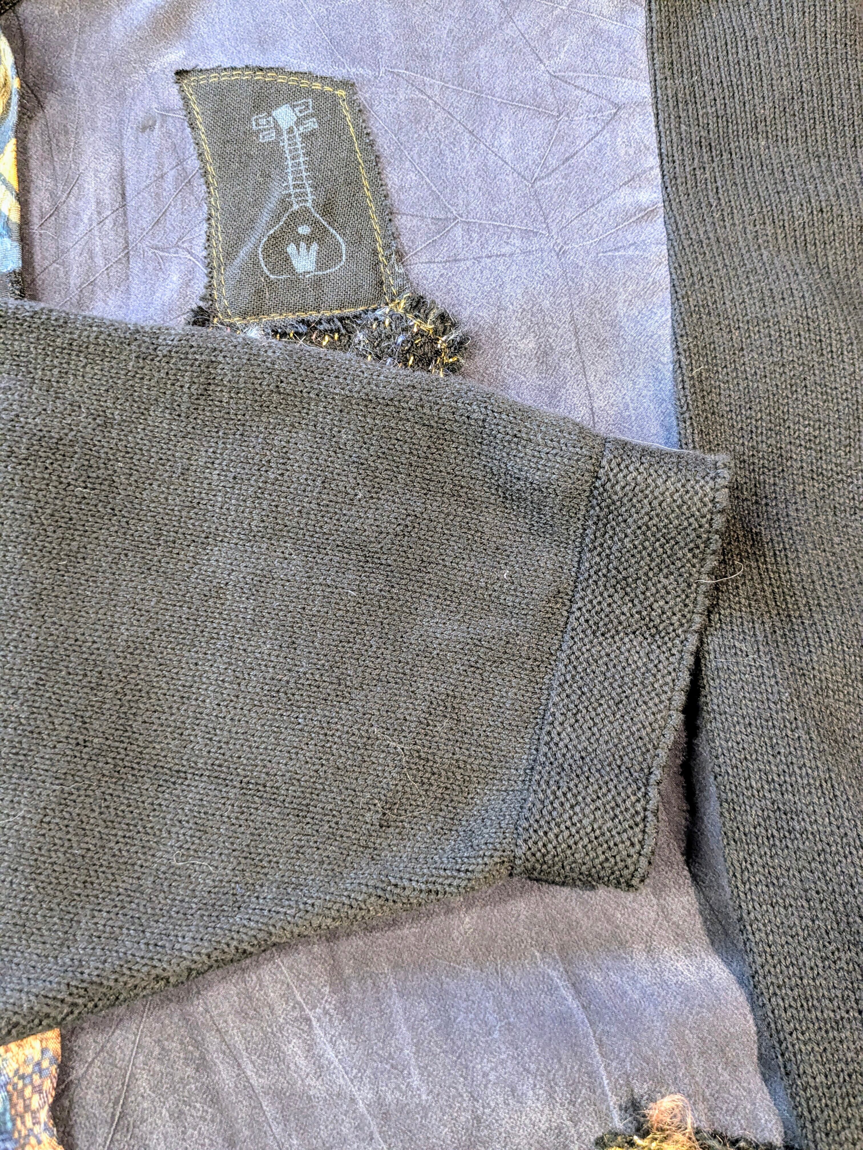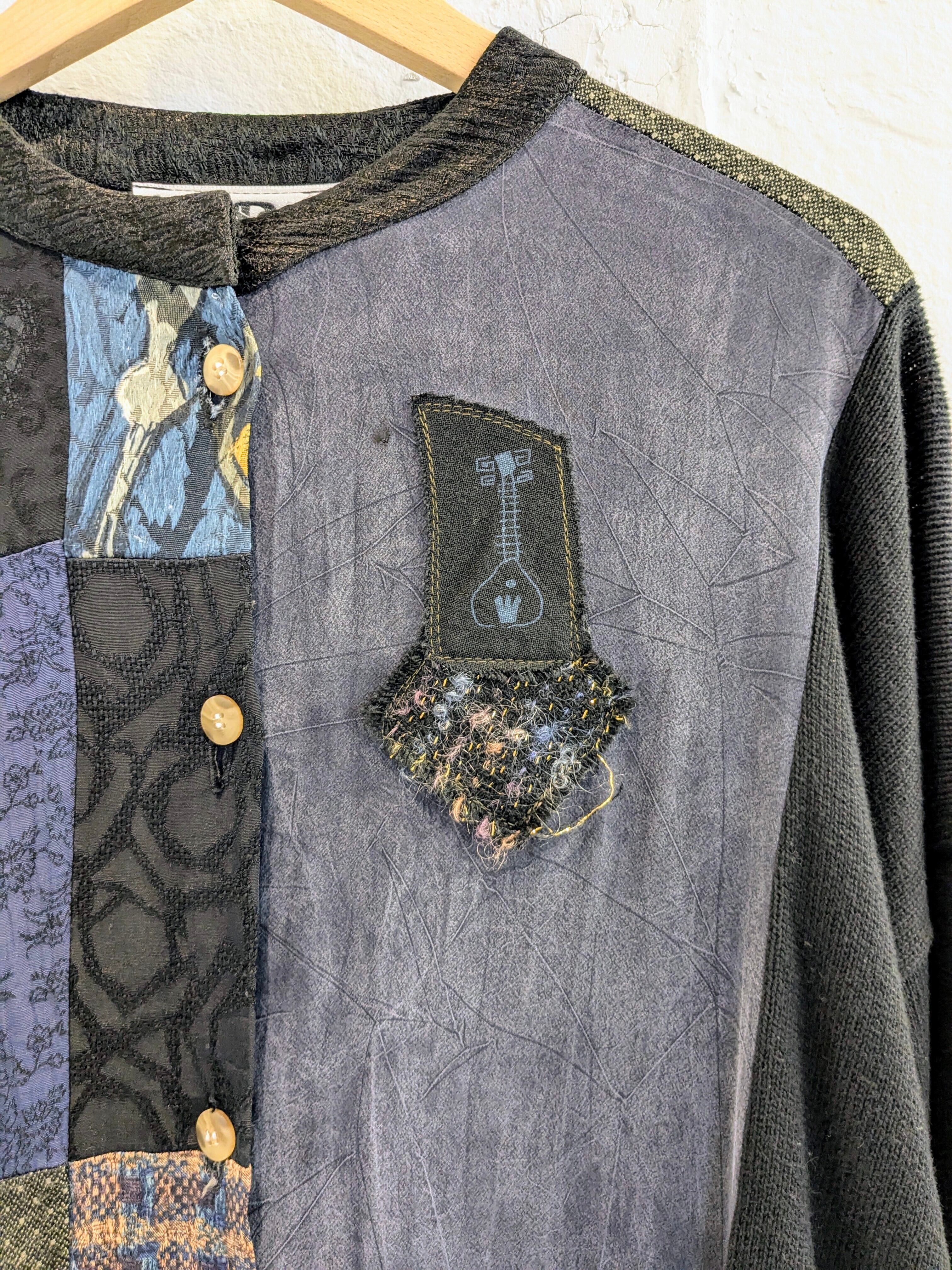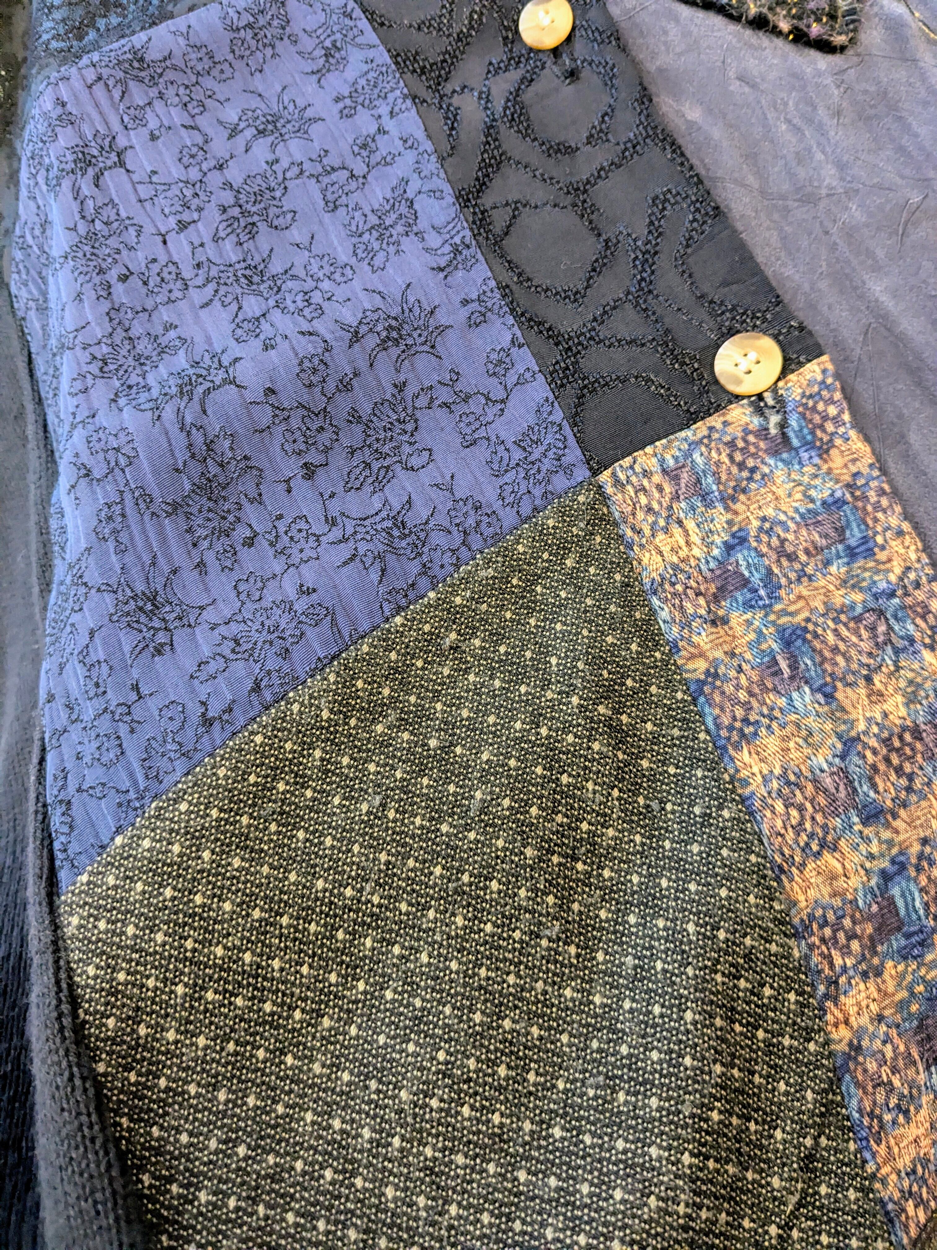 肩から袖がニット生地に切り替わり、真ん中はパッチワークのデザイン、ニットとシャツ生地の部分は長さも違っていたりとデザインが盛り込まれた一着。生地的には柔らかくドレープがありますので、落ち感だったり、上品さが出たりします。上に羽織った時には、パッチワークしか見えませんが脱いだ時にまた違った表情が見えます。あまり見ないデザインかと。
