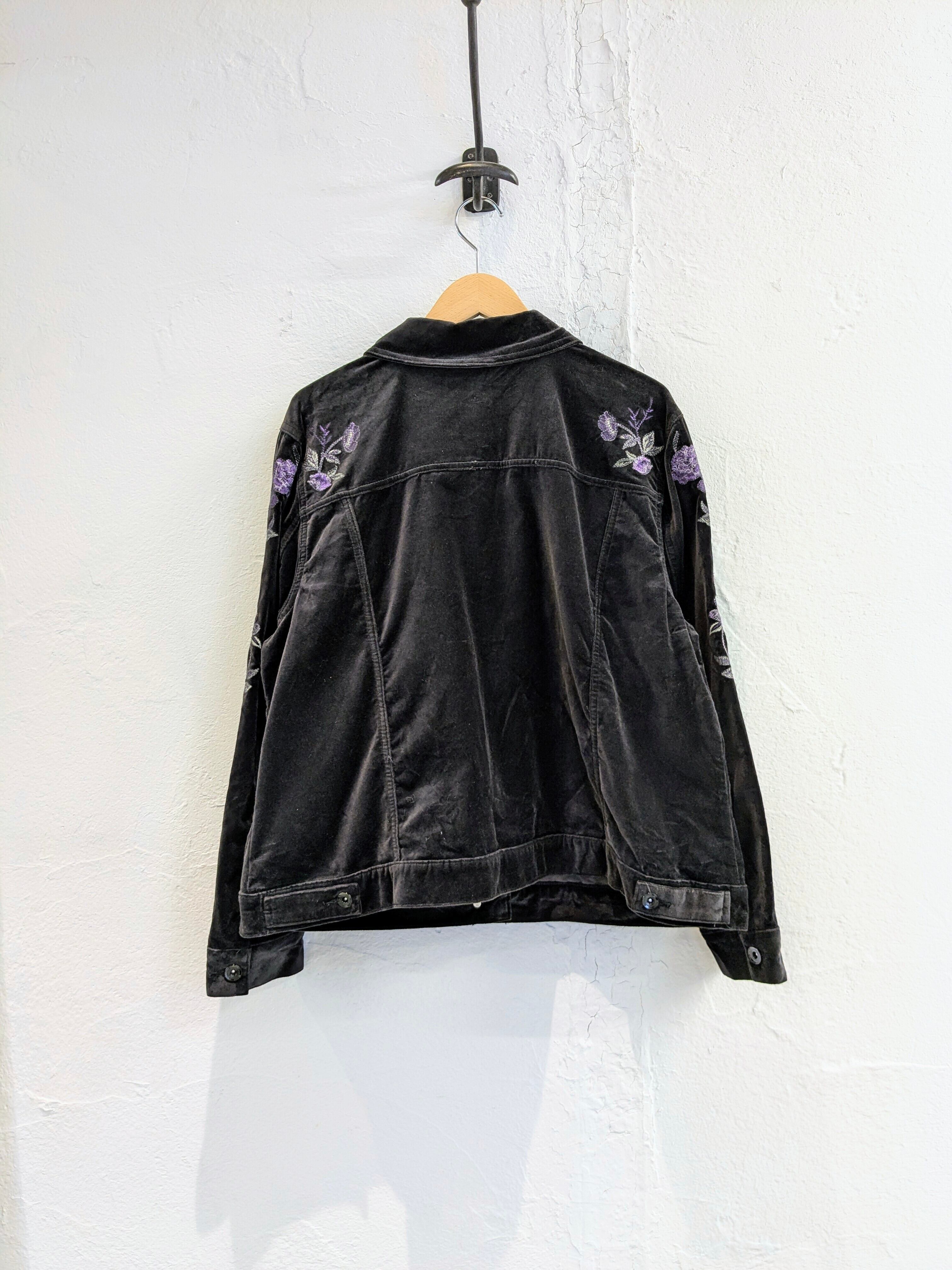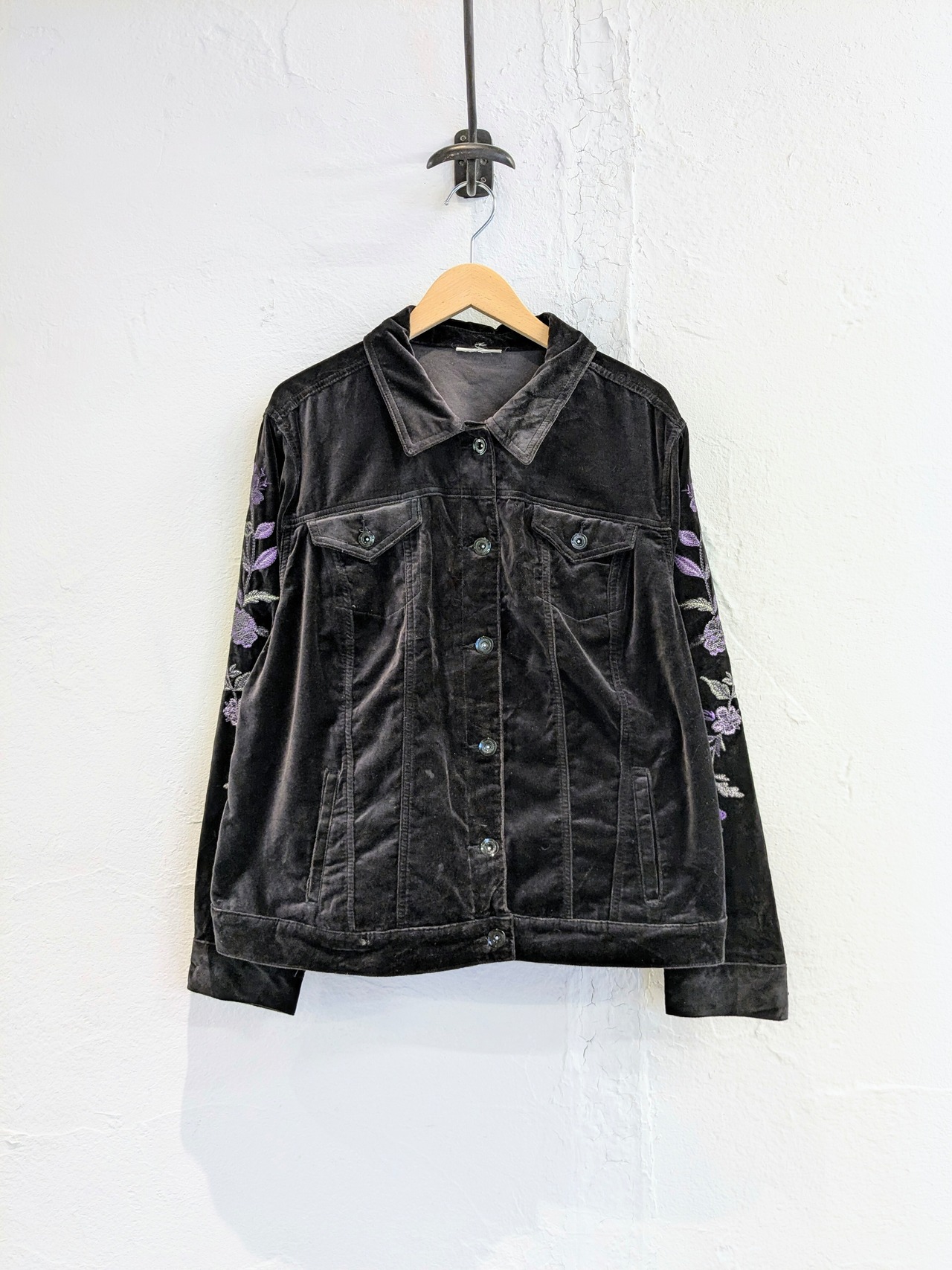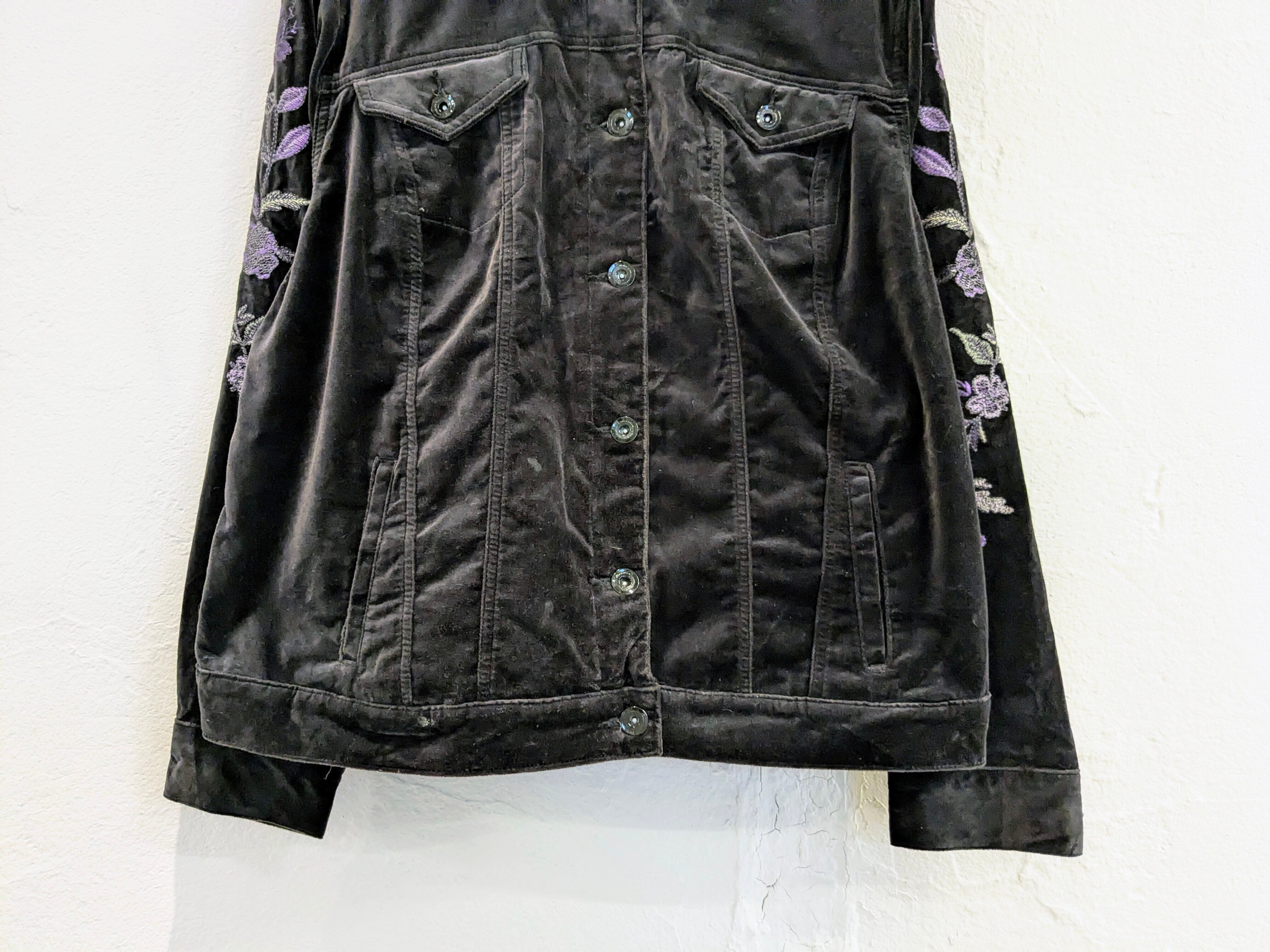 両袖に花の刺繍が施されています。上品さもあり、どこか悪そう、毒々しい色合いがまたカッコいい一着。この上にアウターももちろん着ていただけます。袖の刺繍を活かすなら、ダウンベストなどがおすすめ。