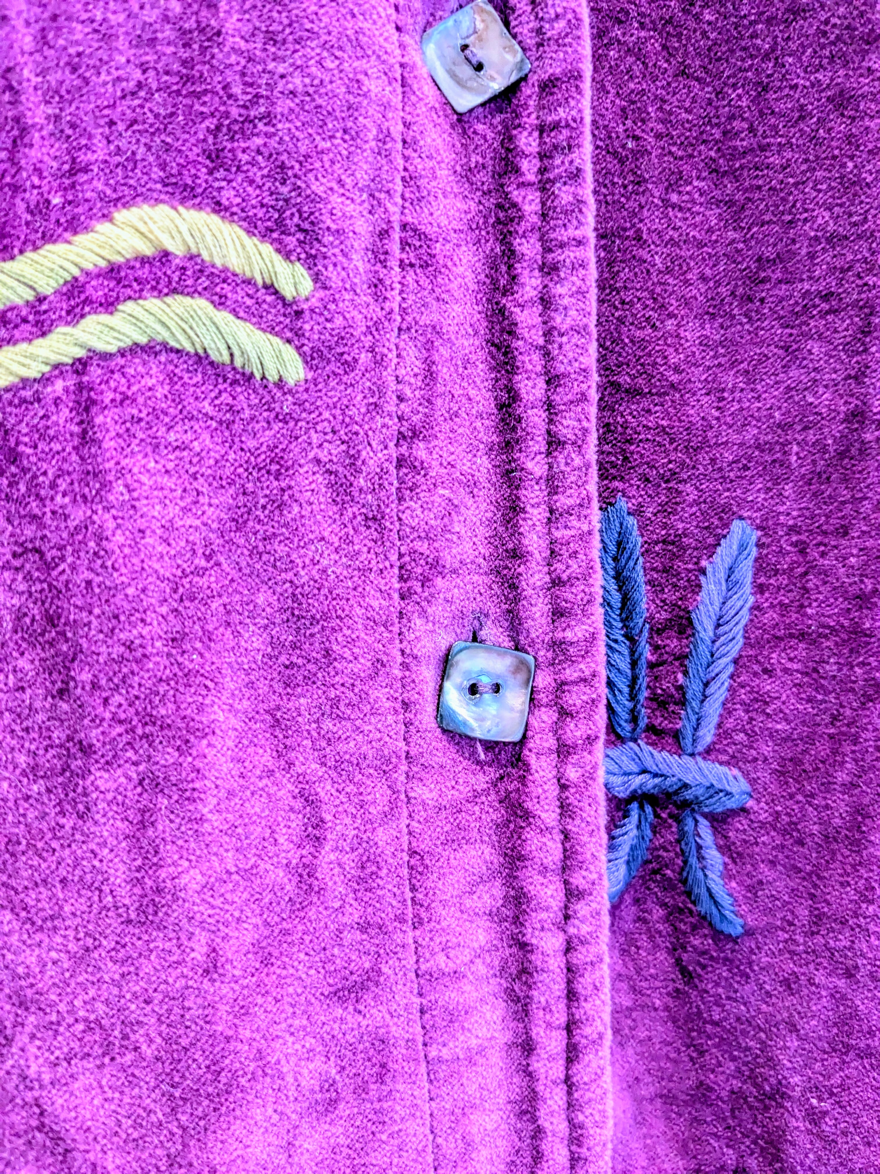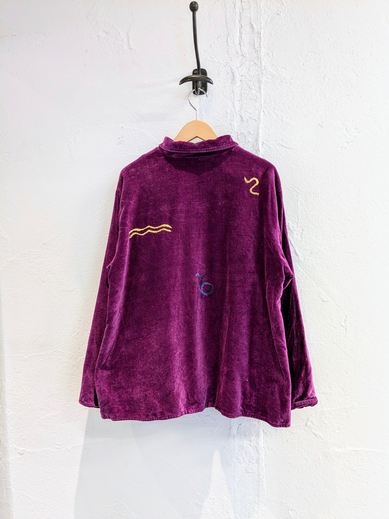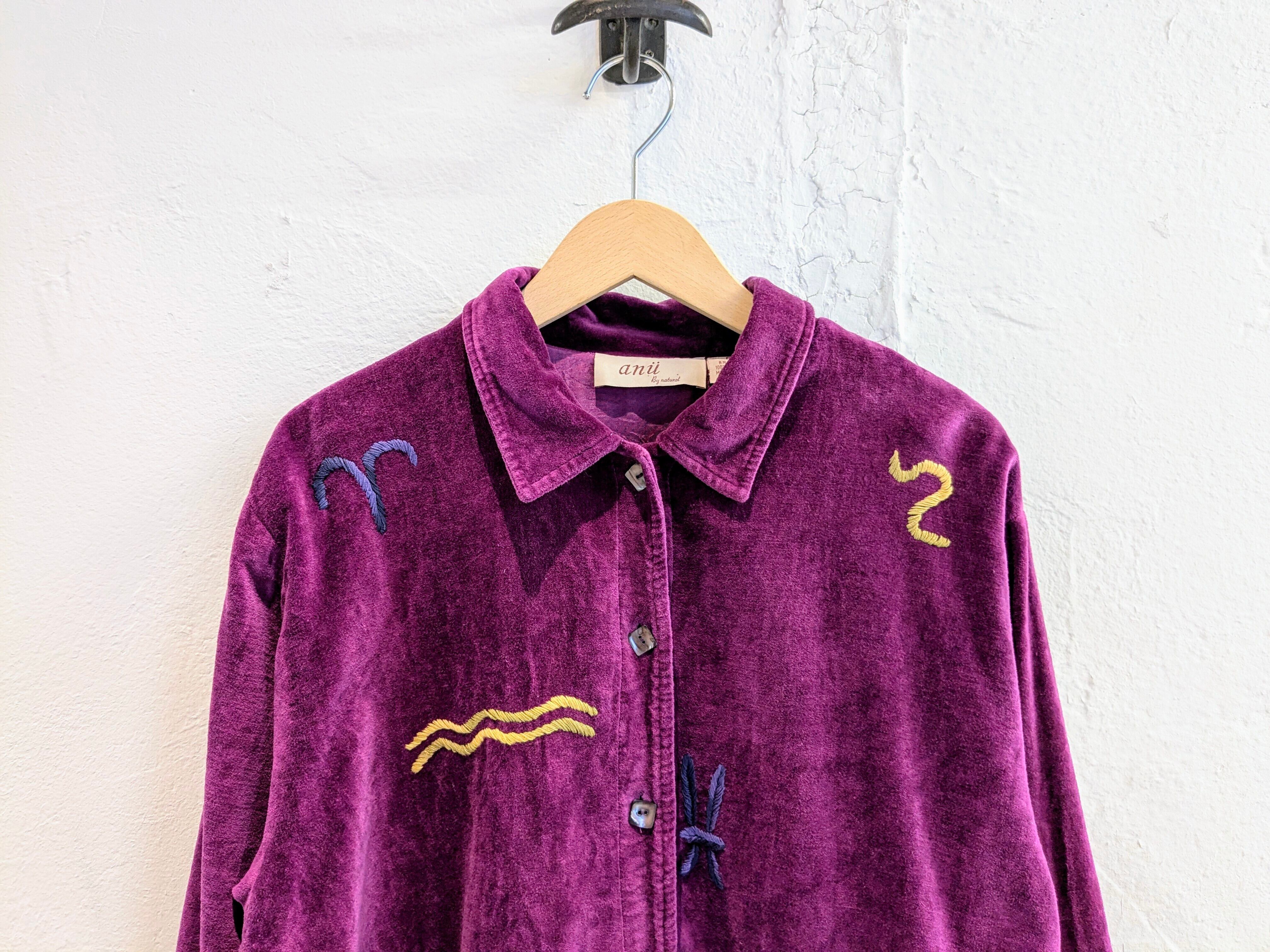 ロープのような刺繍、変形型の刺繍が入っています。ベロアの生地で存在感がありますが、さらに刺繍が入ることでデザイン性がより強いアイテム。ボタンも四角のシェルボタンを使用、細部までこだわりの感じられる一着。トップボタンが割れてしまっています。