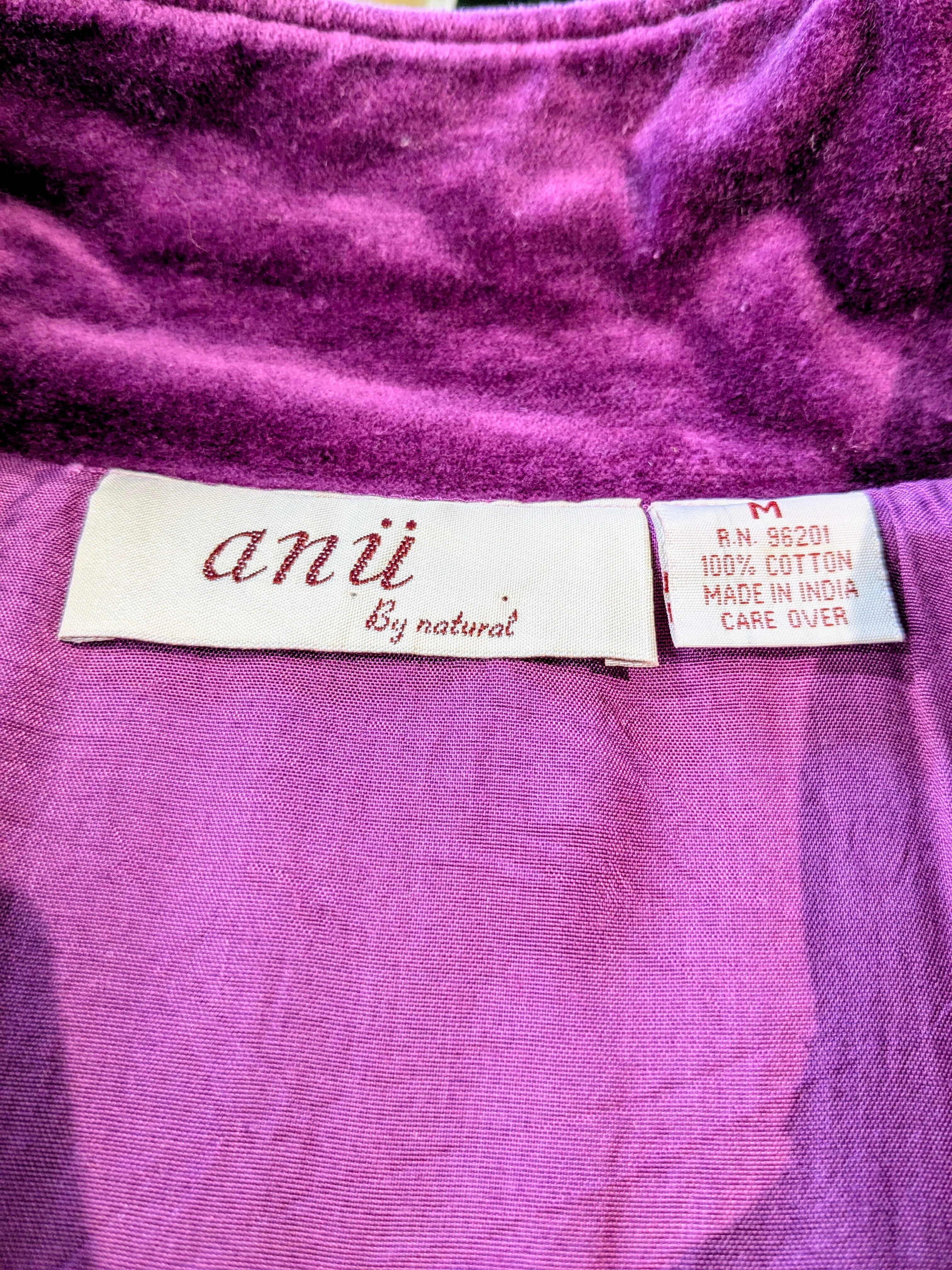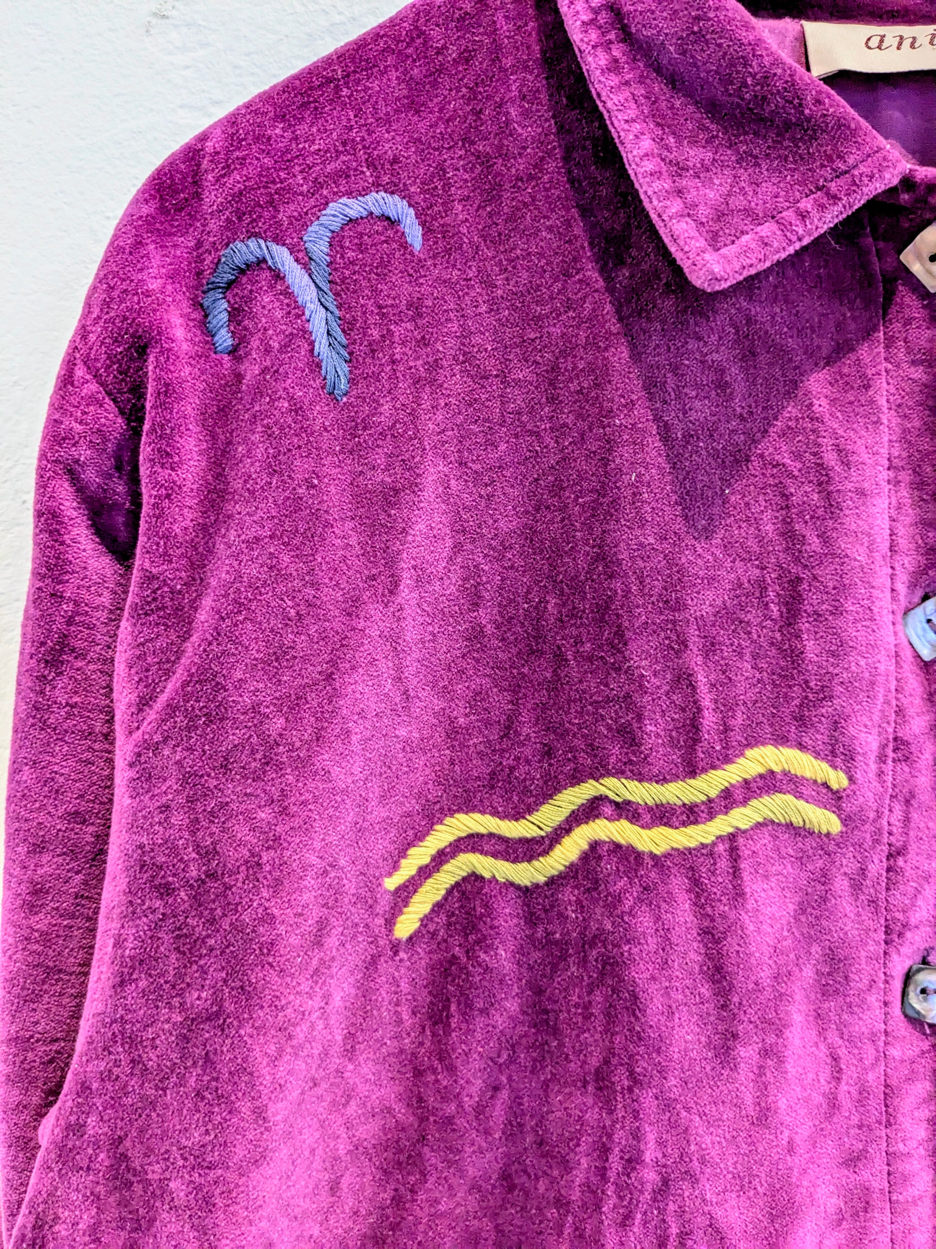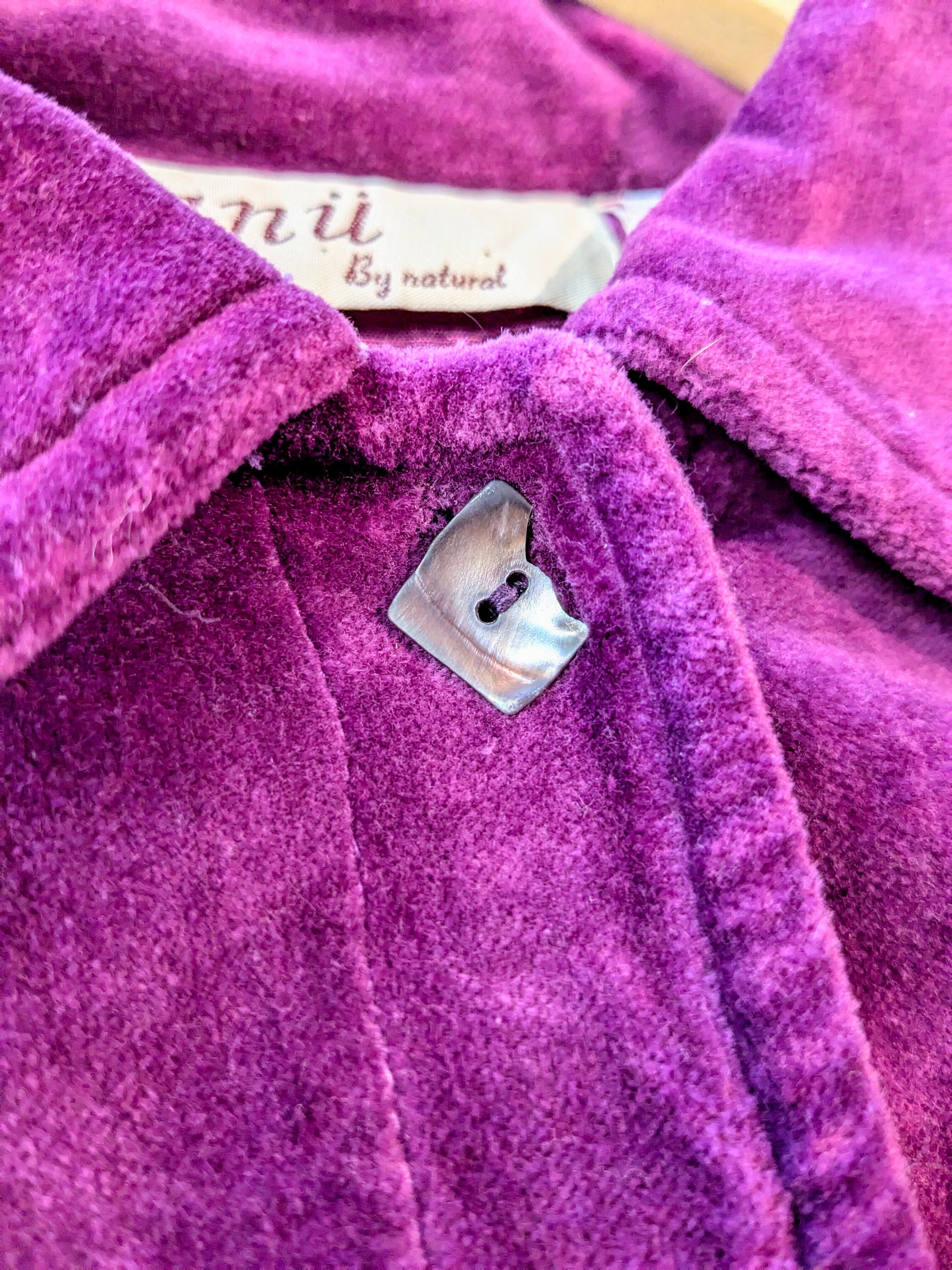 ロープのような刺繍、変形型の刺繍が入っています。ベロアの生地で存在感がありますが、さらに刺繍が入ることでデザイン性がより強いアイテム。ボタンも四角のシェルボタンを使用、細部までこだわりの感じられる一着。トップボタンが割れてしまっています。