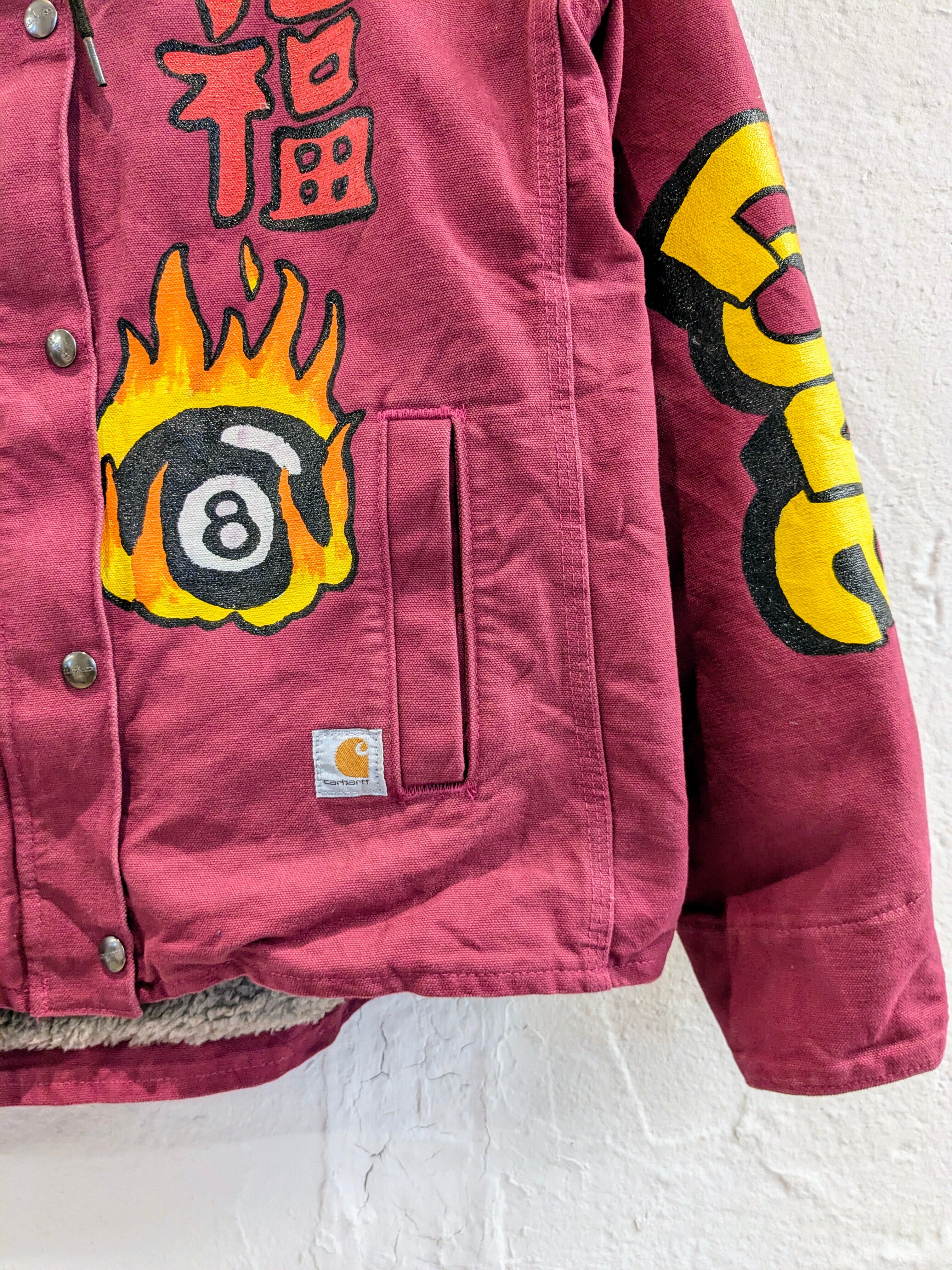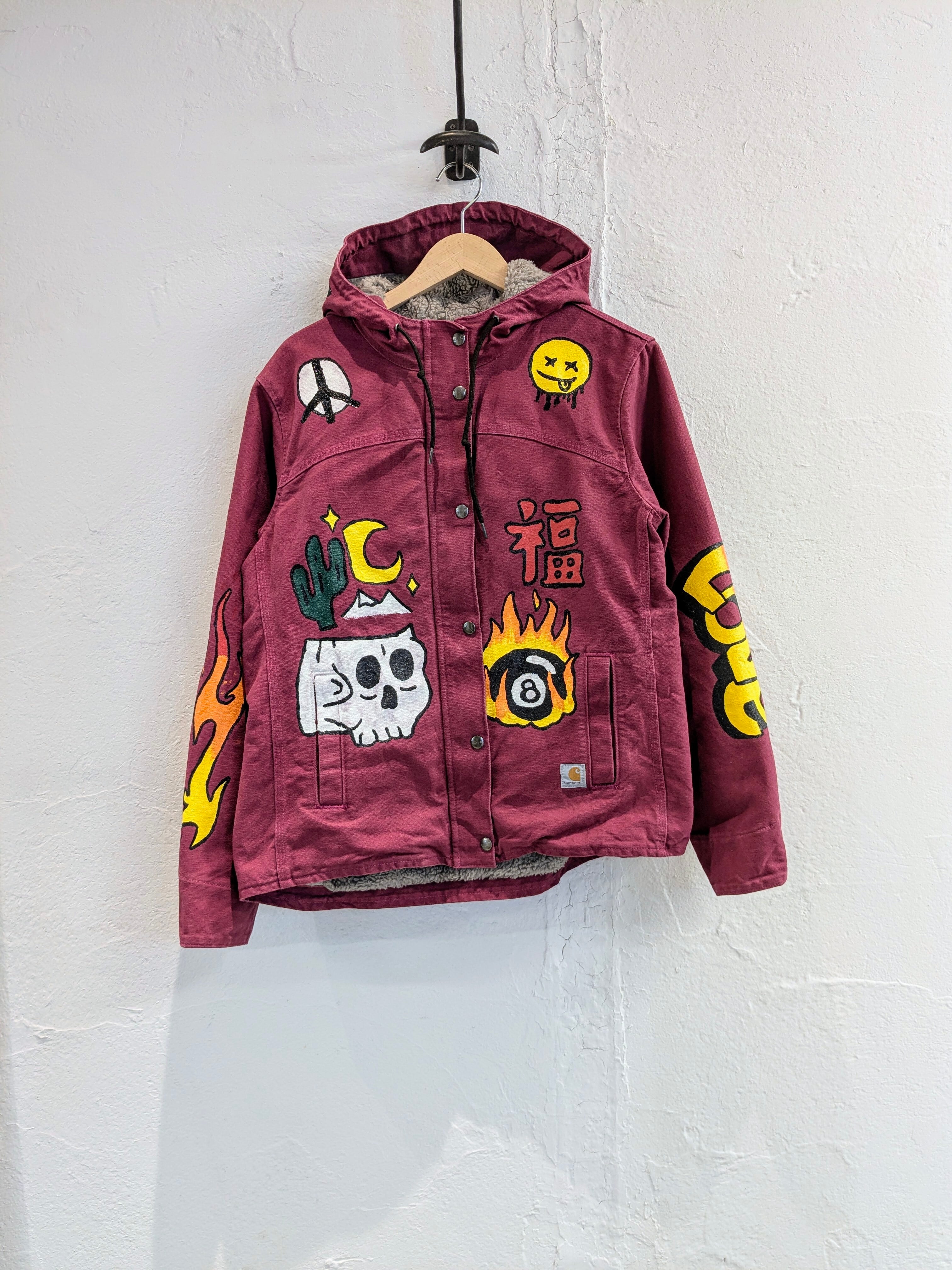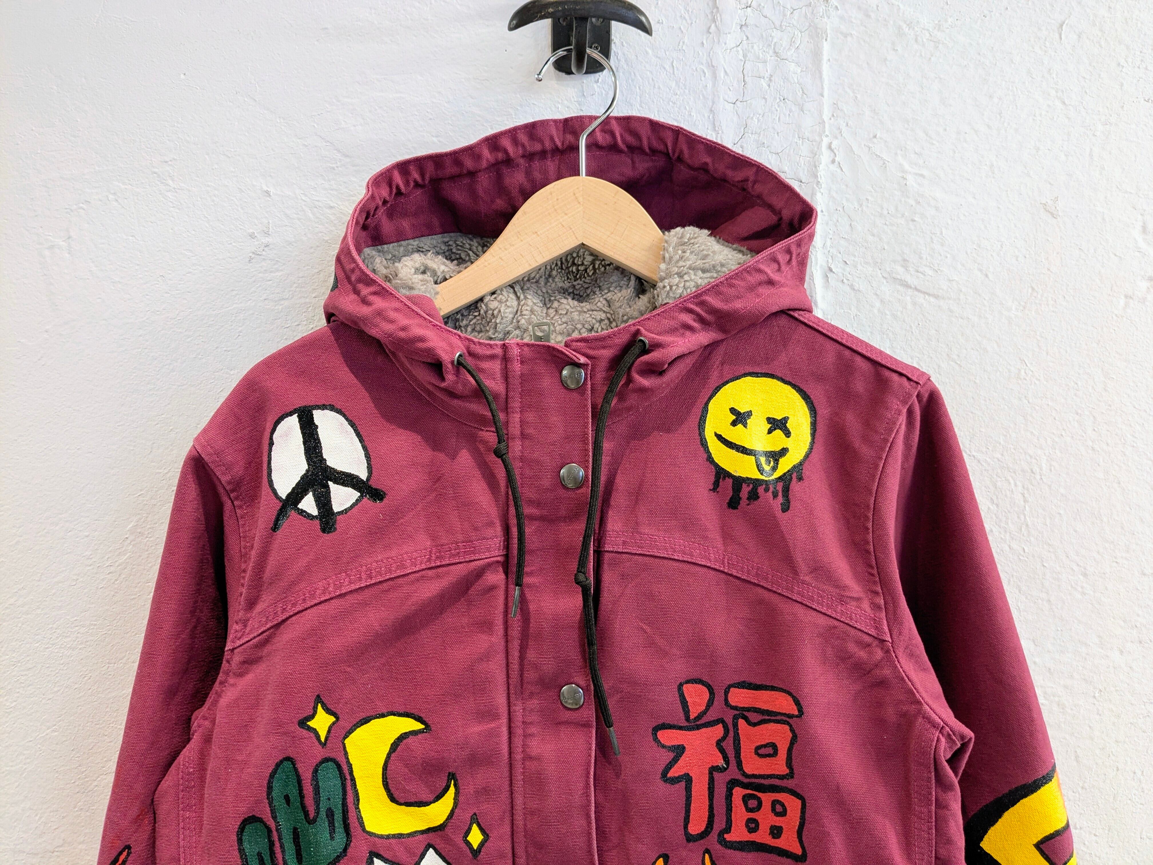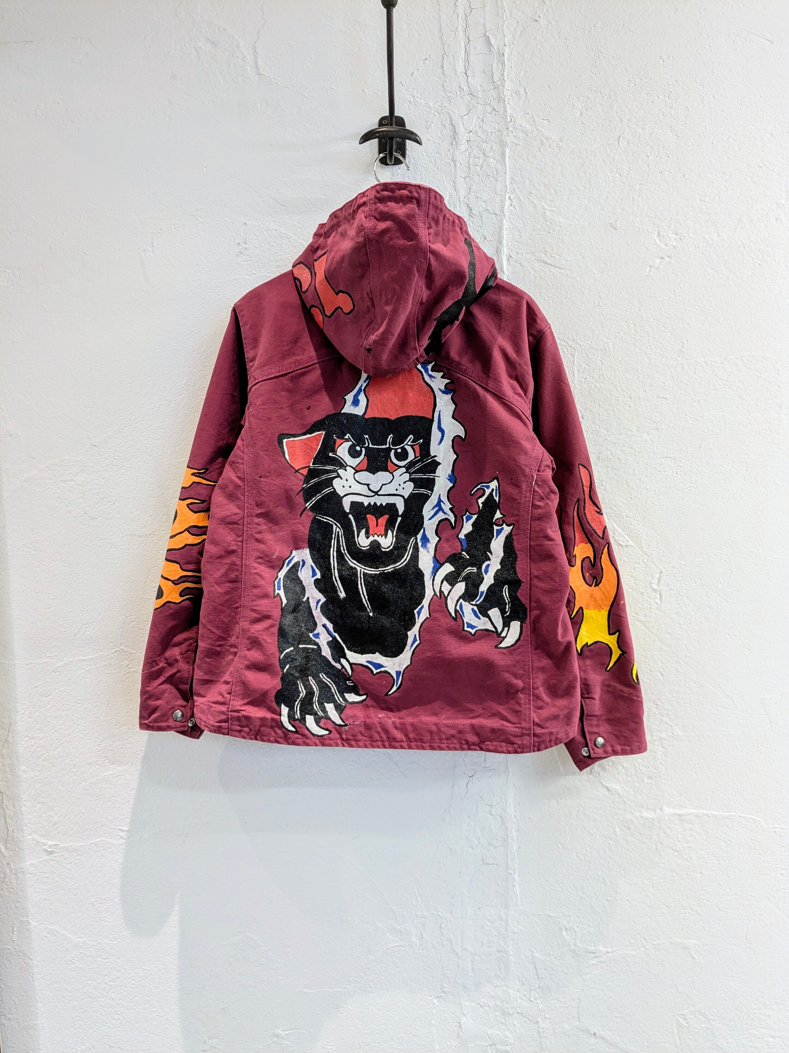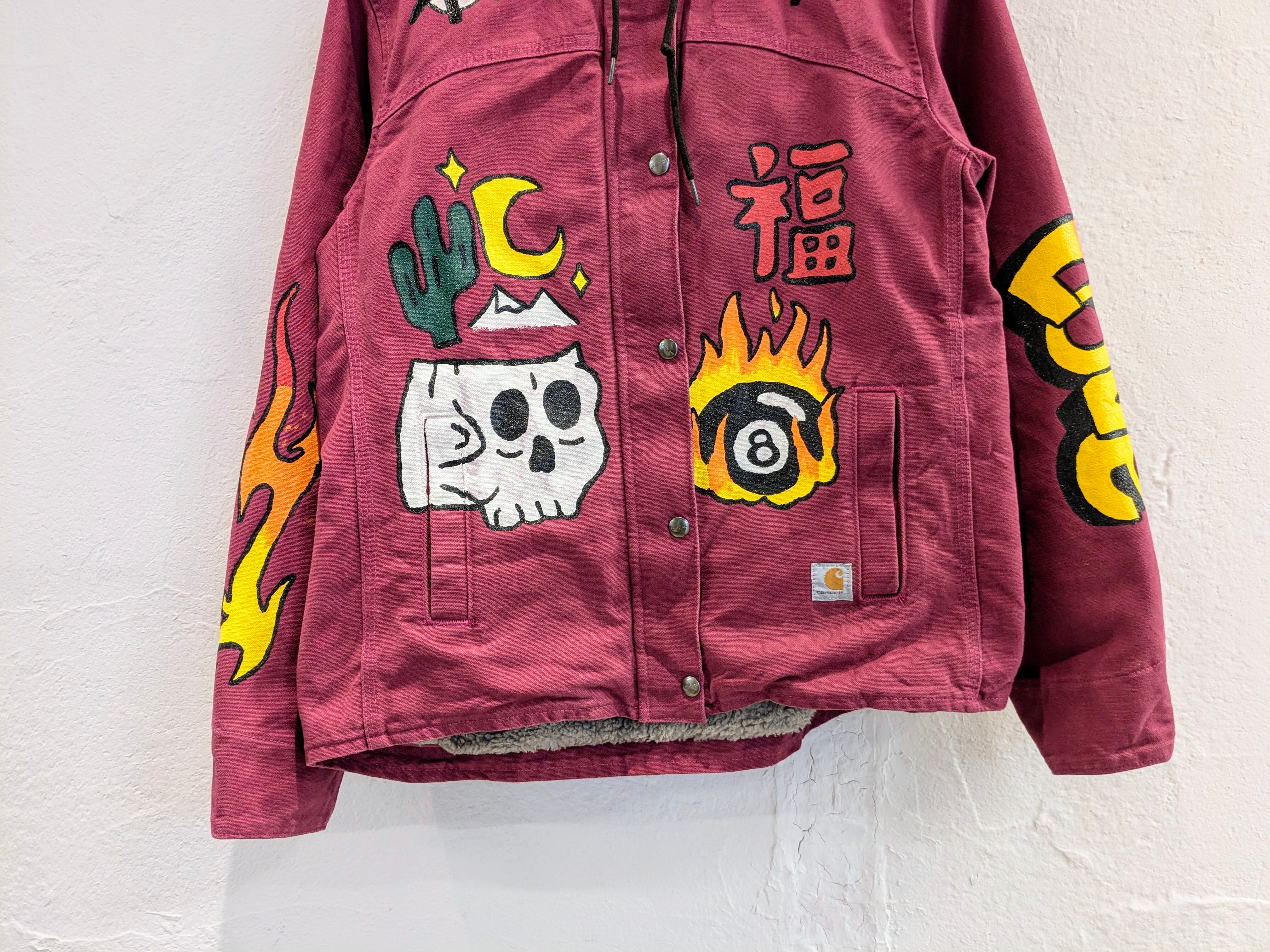 カーハートのアクティブジャケットに手描きイラストを加えてもらっています。袖のファイヤーパターンしかり、バッグの黒豹?のイラストなどめちゃくちゃ存在感があります。裏地にはボアが張ってあり、今の時期におすすめ。人気のカーハートですが、普通じゃない、他の人とは被りたくない人などにおすすめ。