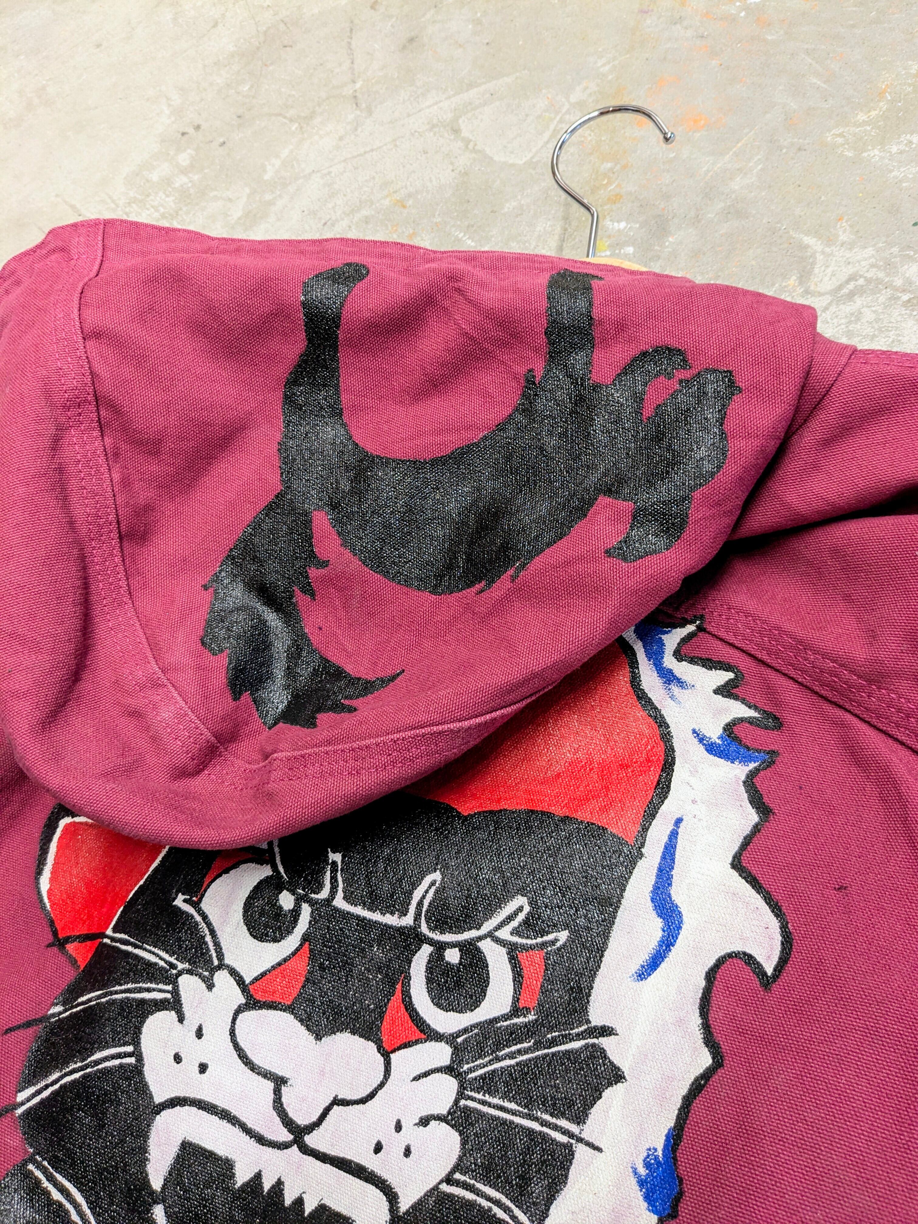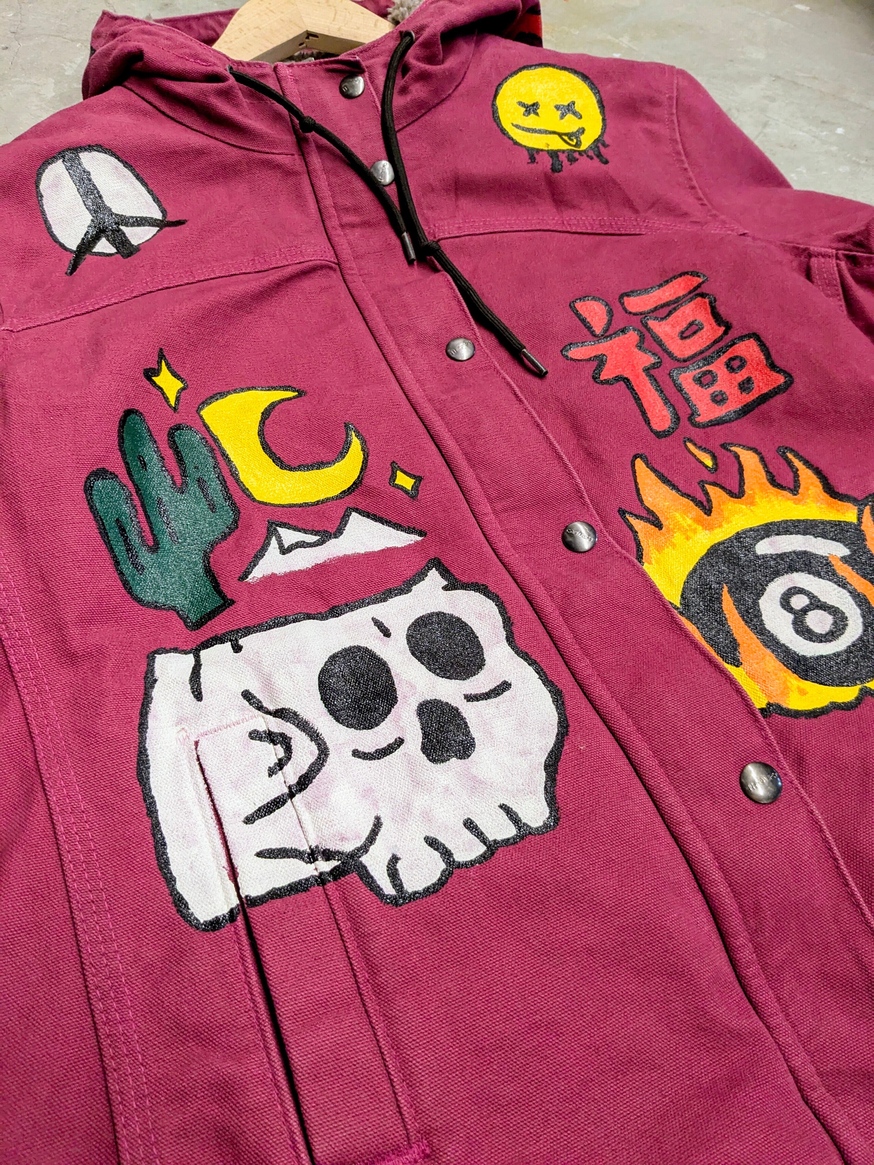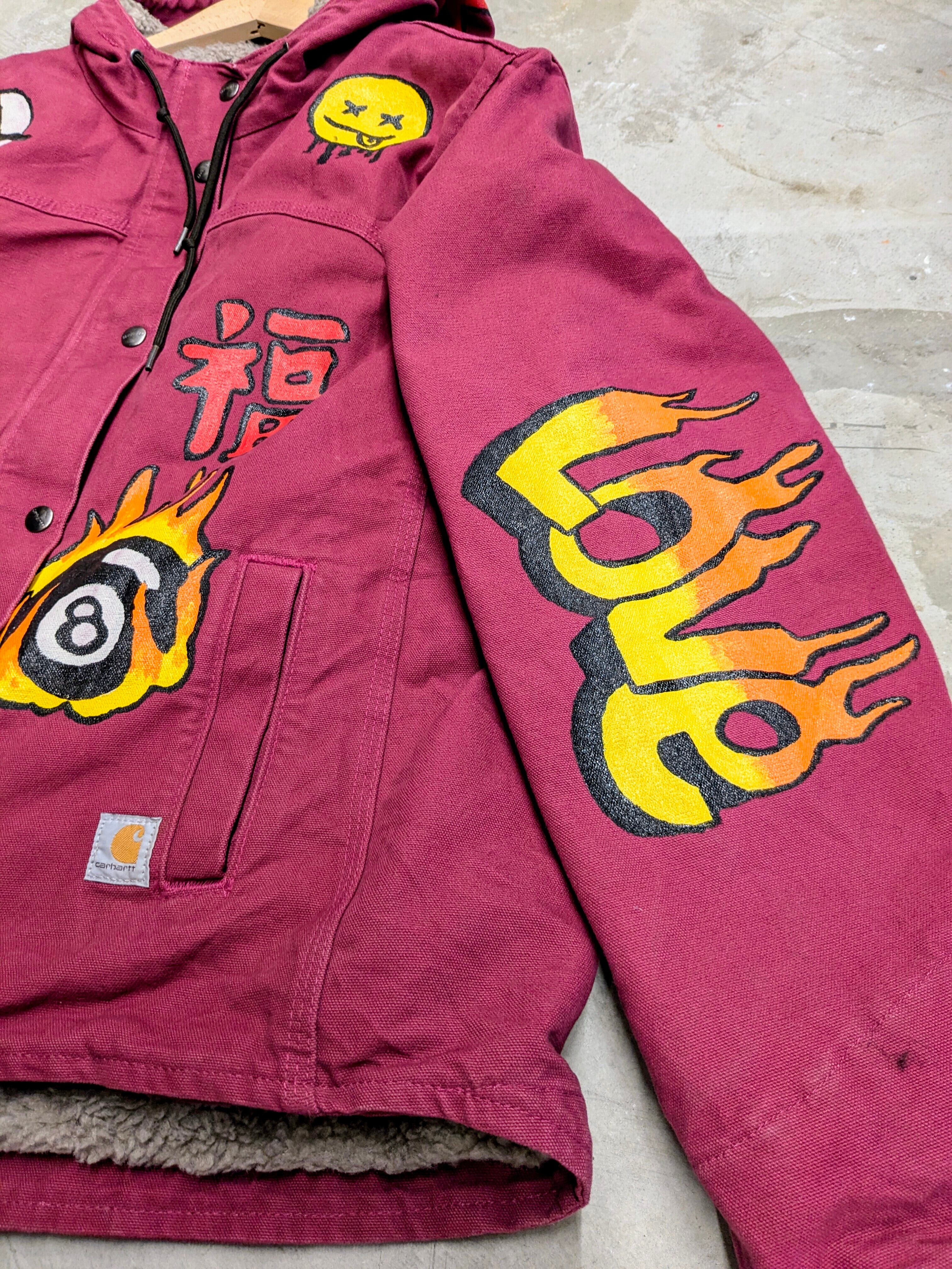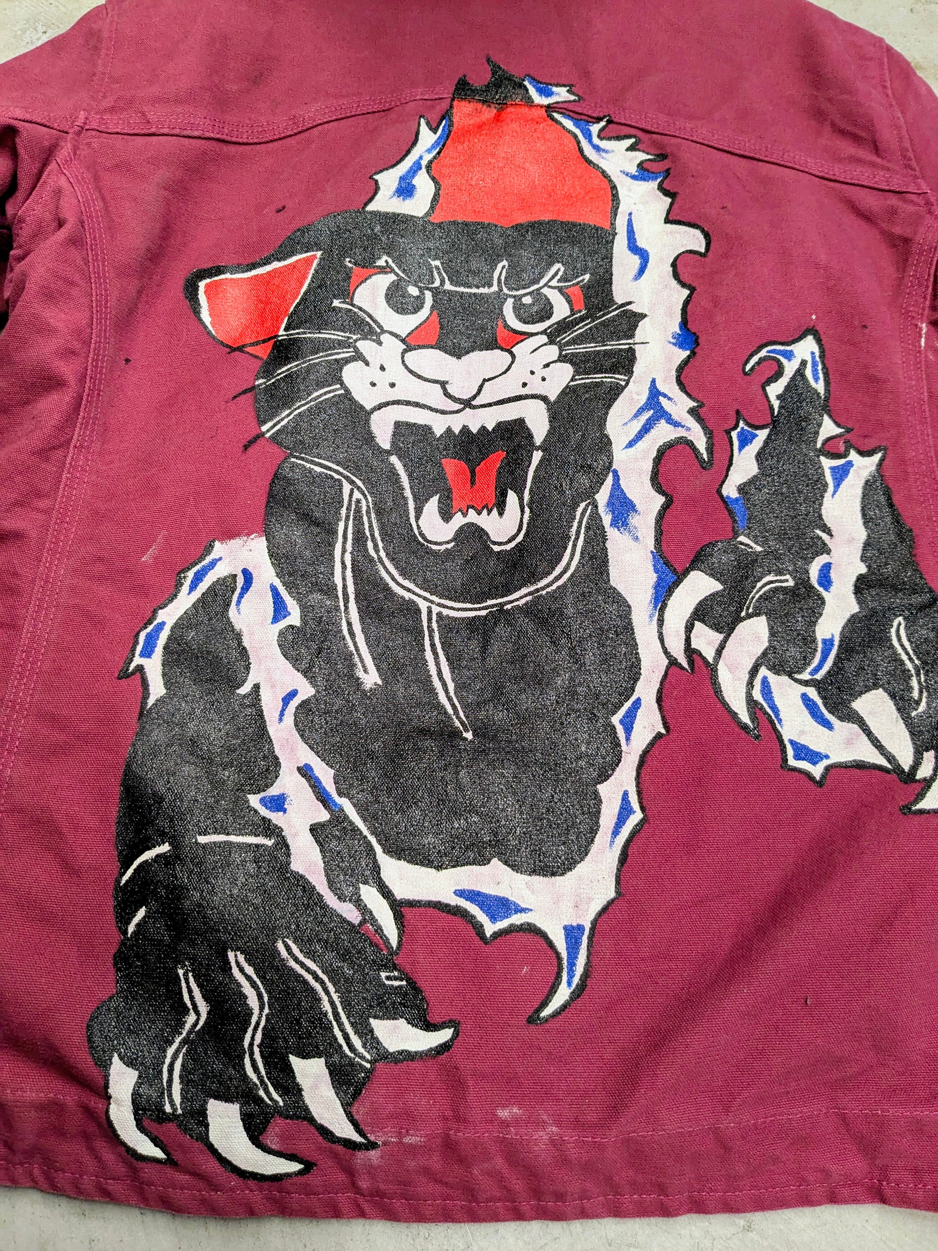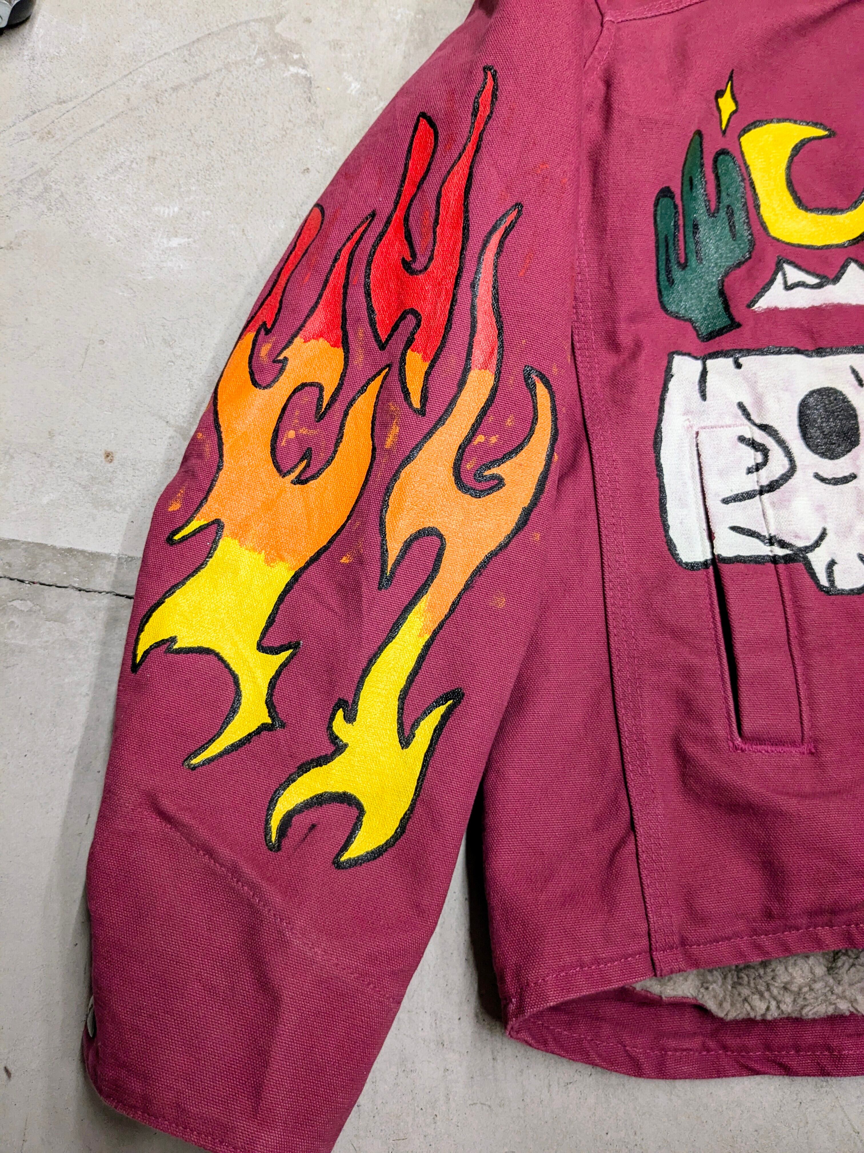 カーハートのアクティブジャケットに手描きイラストを加えてもらっています。袖のファイヤーパターンしかり、バッグの黒豹?のイラストなどめちゃくちゃ存在感があります。裏地にはボアが張ってあり、今の時期におすすめ。人気のカーハートですが、普通じゃない、他の人とは被りたくない人などにおすすめ。