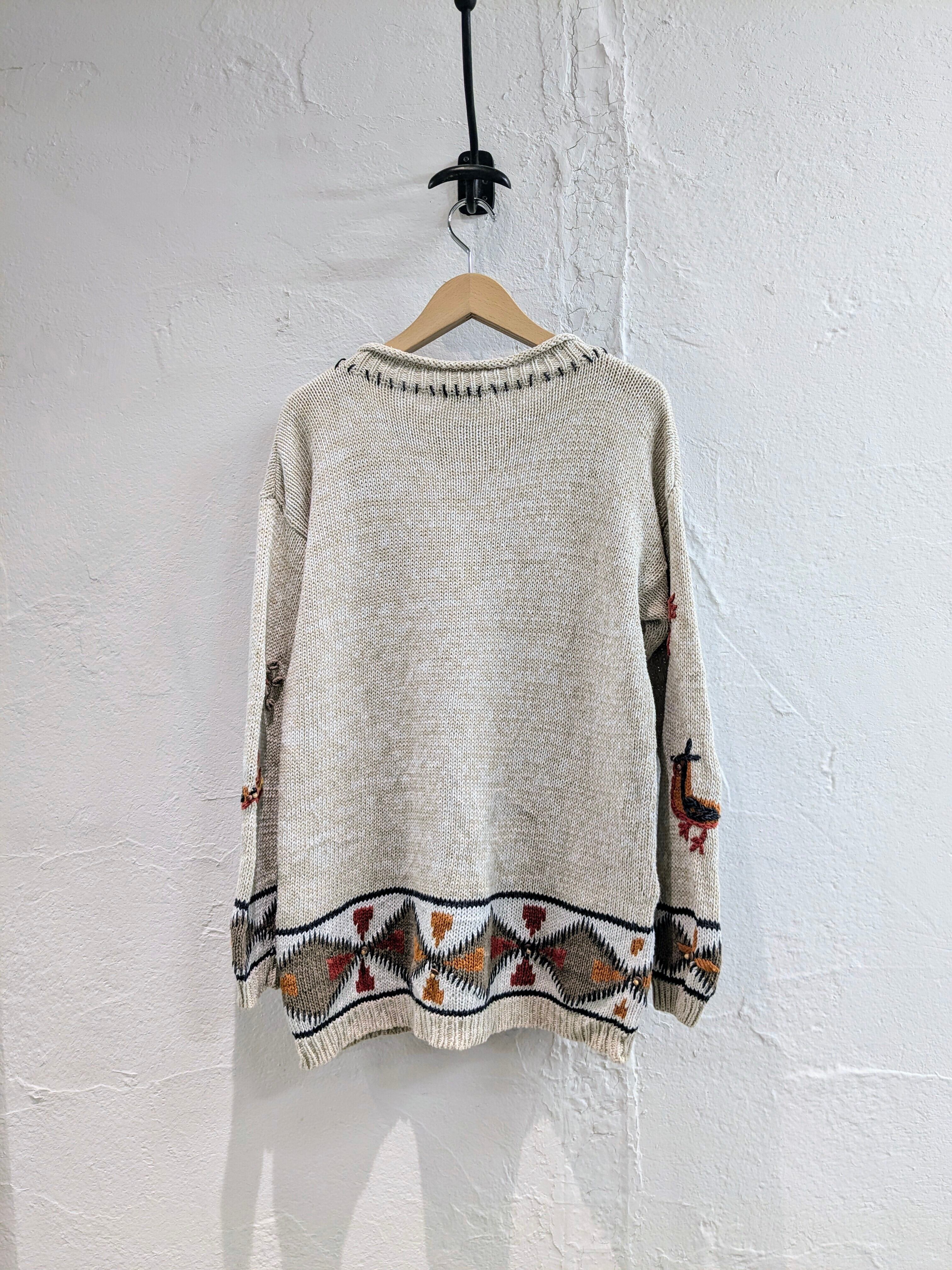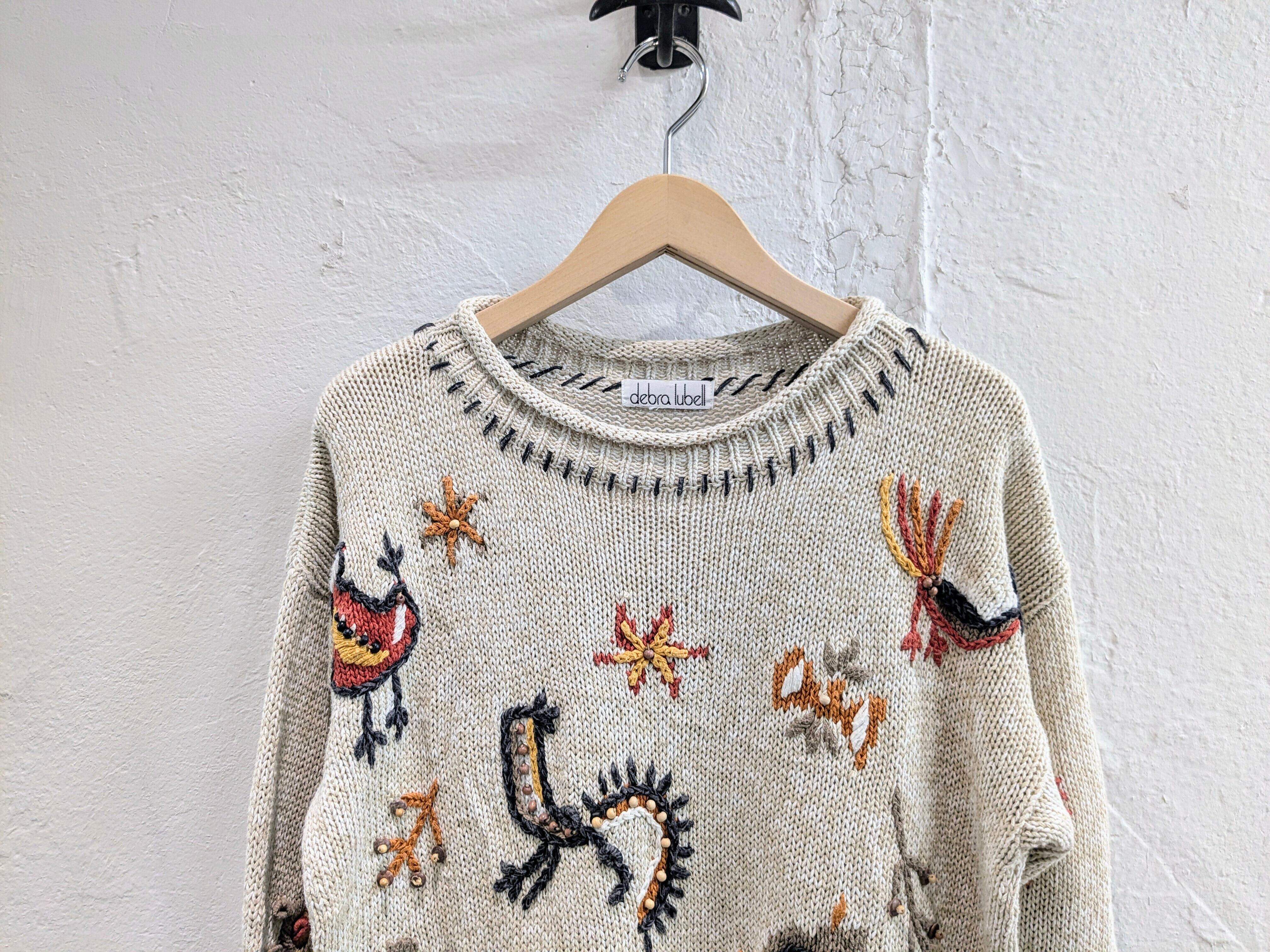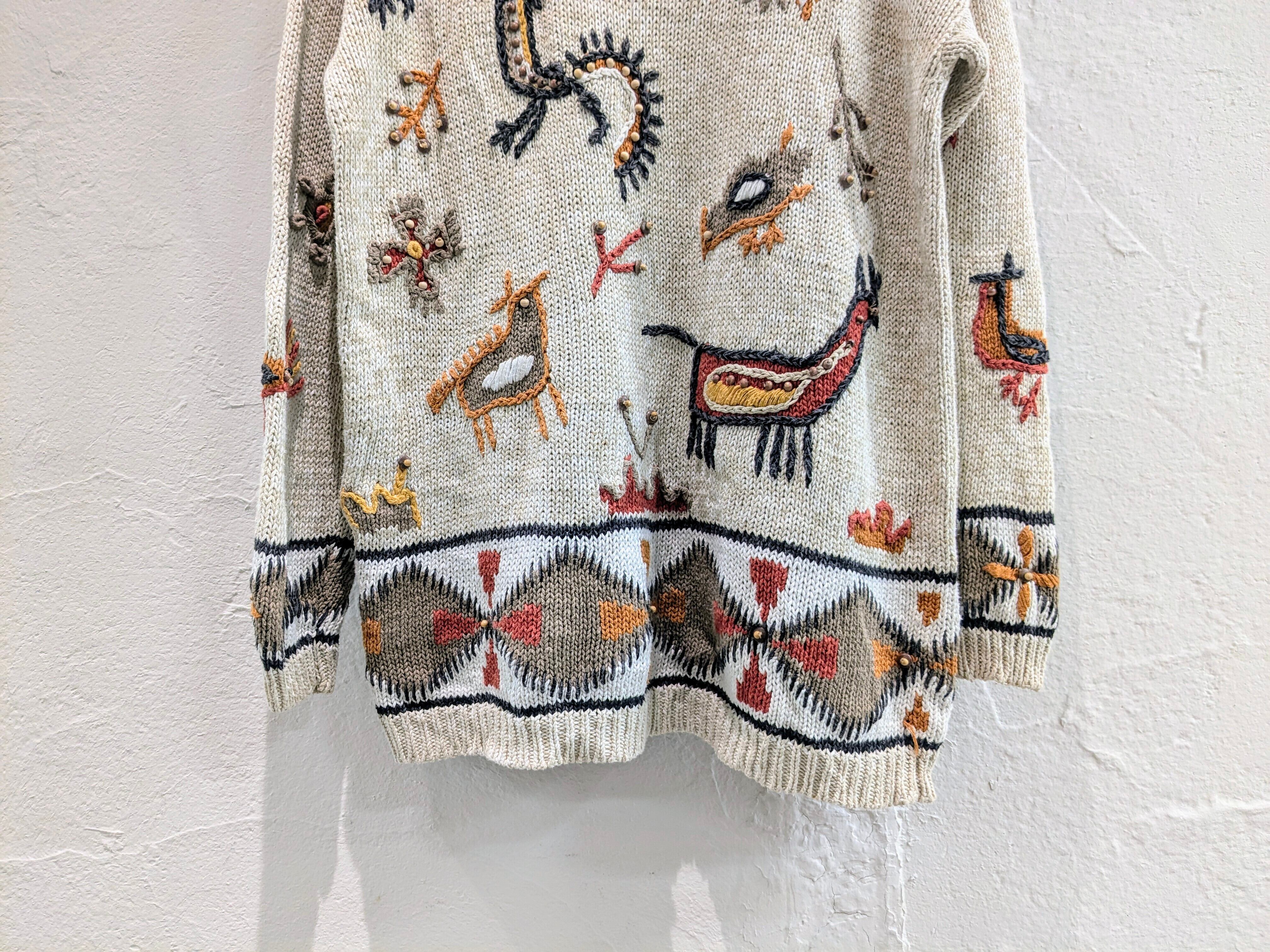 ぱっと見で目を引く一着。素材表記はないですが、おそらくコットンニットになります。ロールネック、ステッチのデザインなどあまり見ないデザインかと思います。今の時期から春も使えるので、時期的にも長くとれるのでおすすめです。