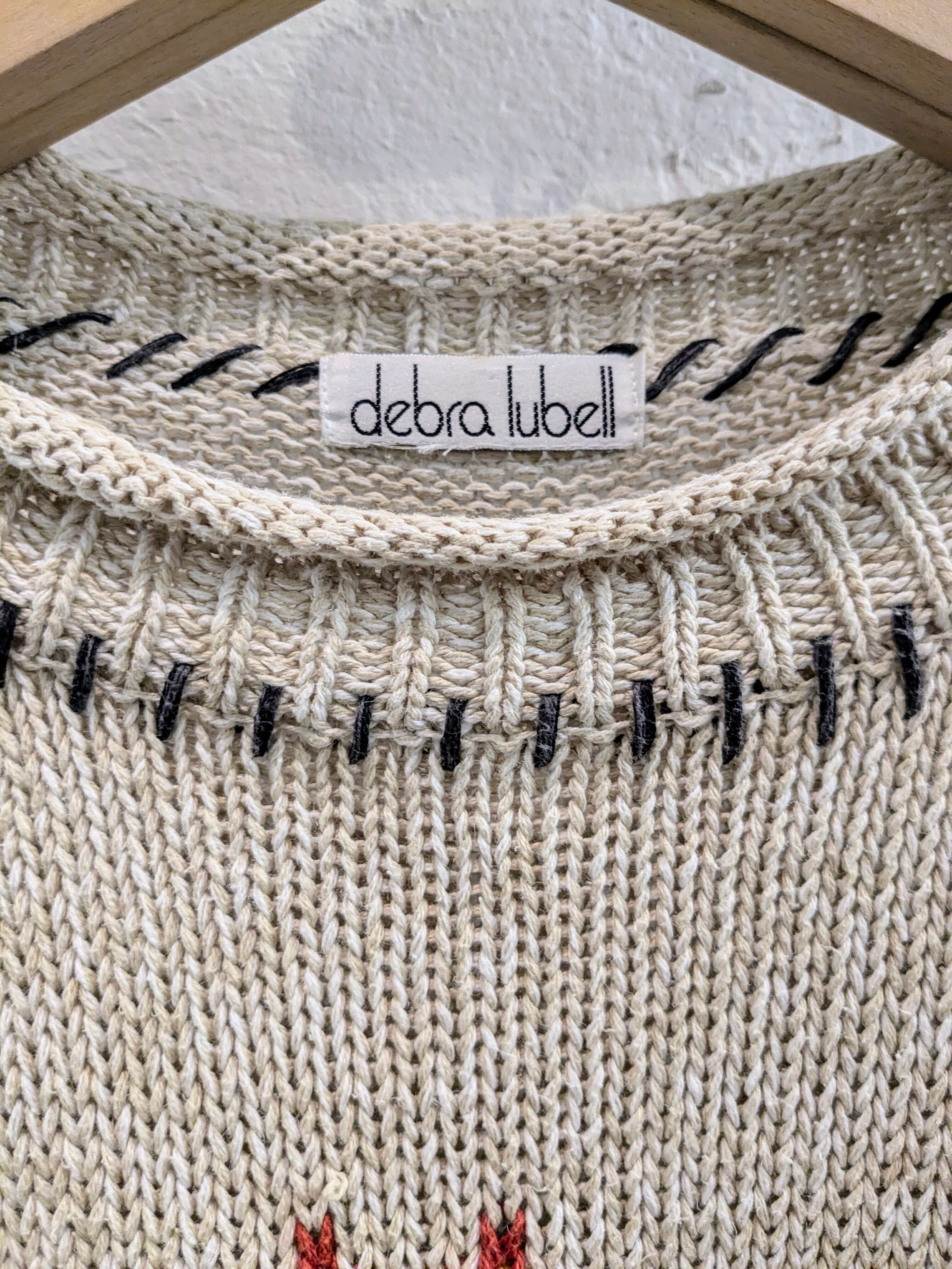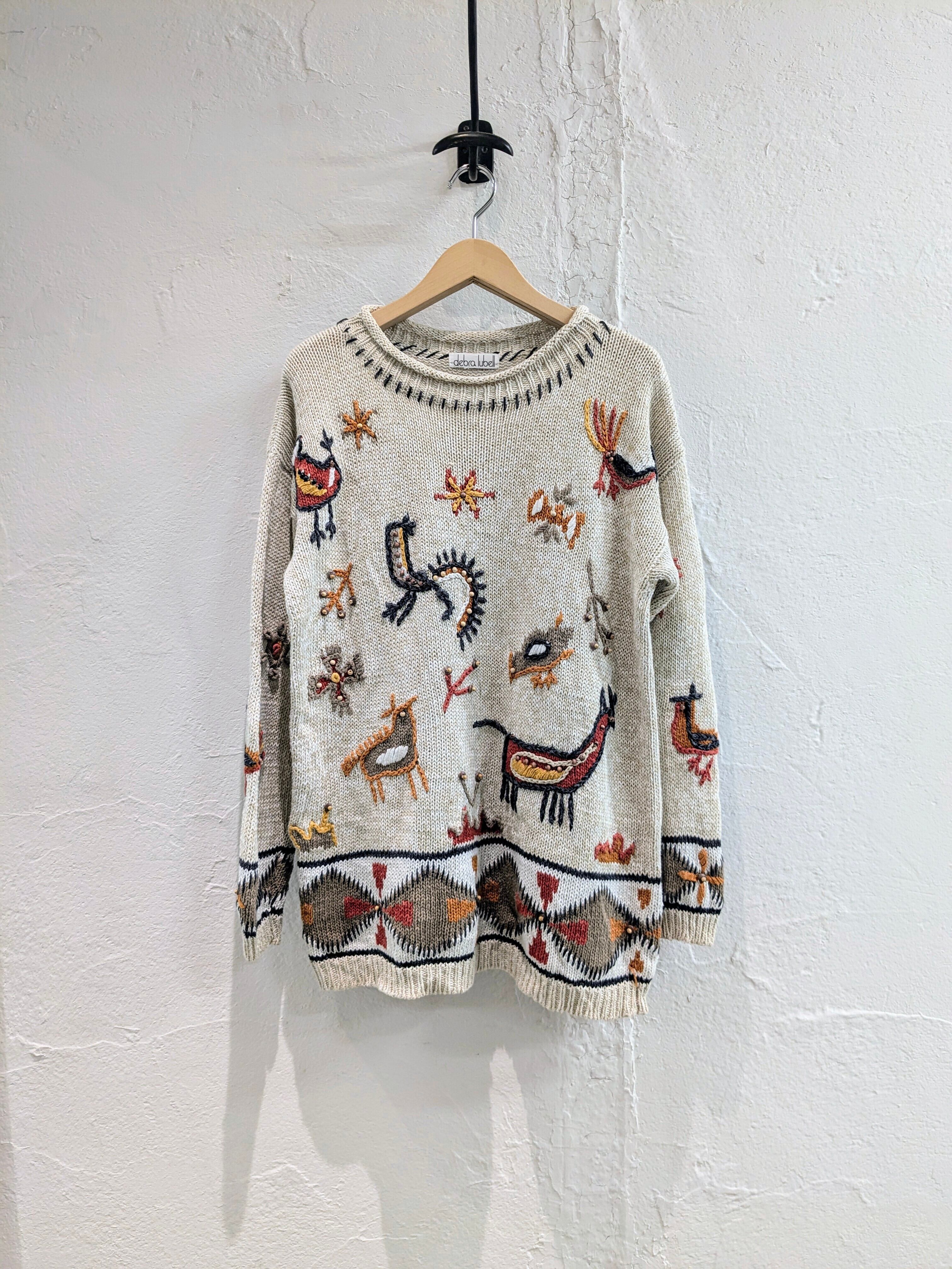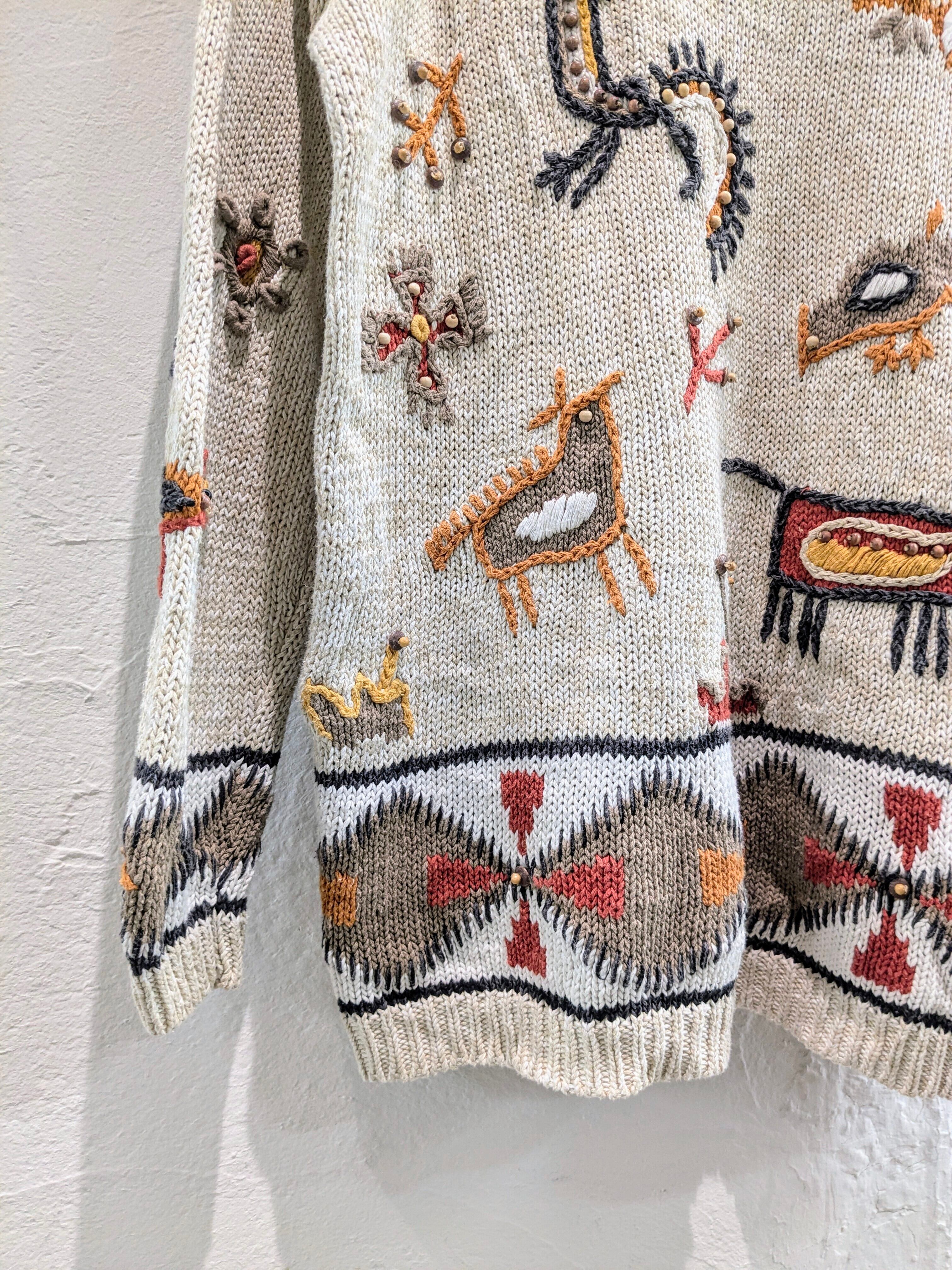 ぱっと見で目を引く一着。素材表記はないですが、おそらくコットンニットになります。ロールネック、ステッチのデザインなどあまり見ないデザインかと思います。今の時期から春も使えるので、時期的にも長くとれるのでおすすめです。