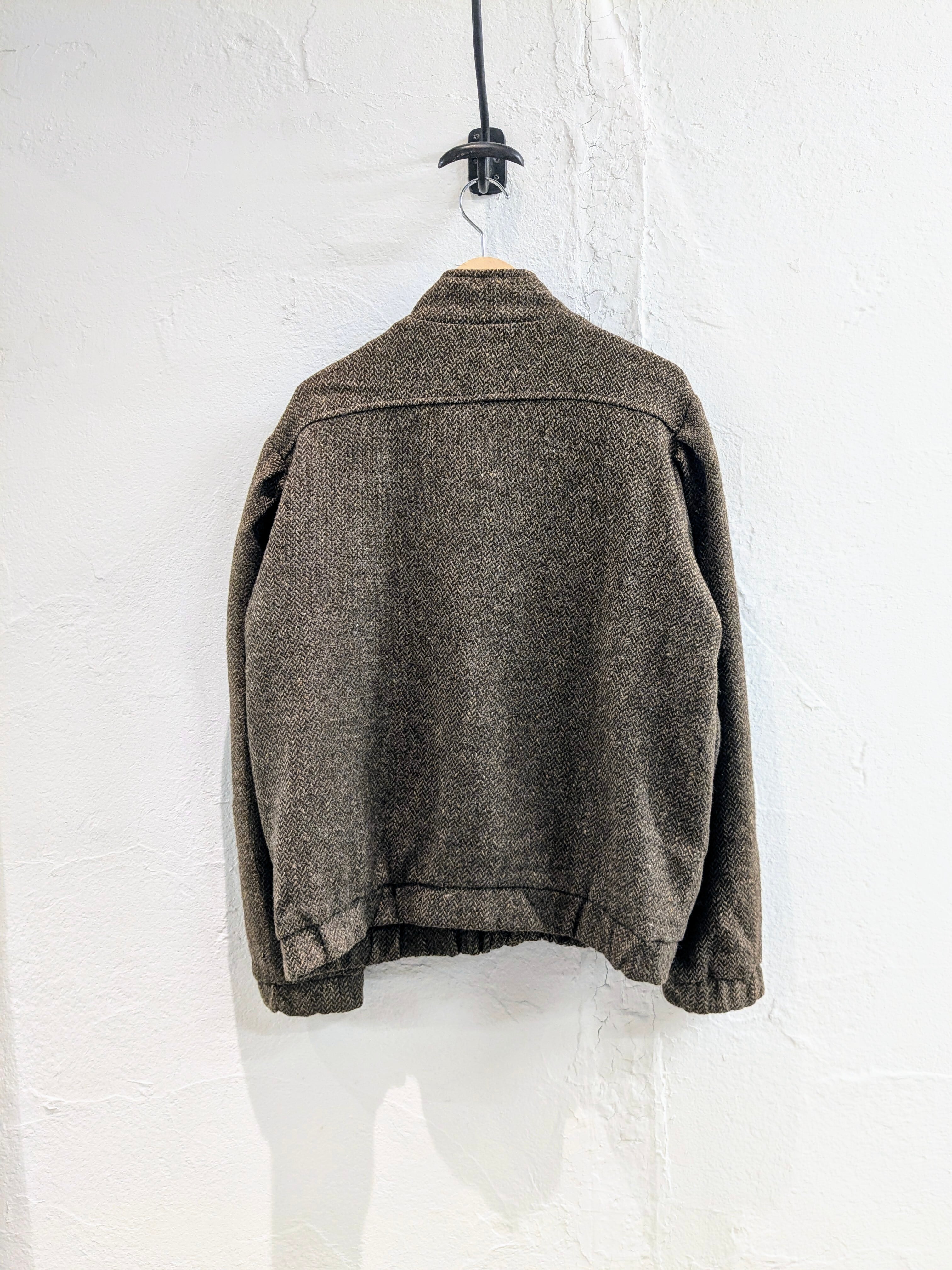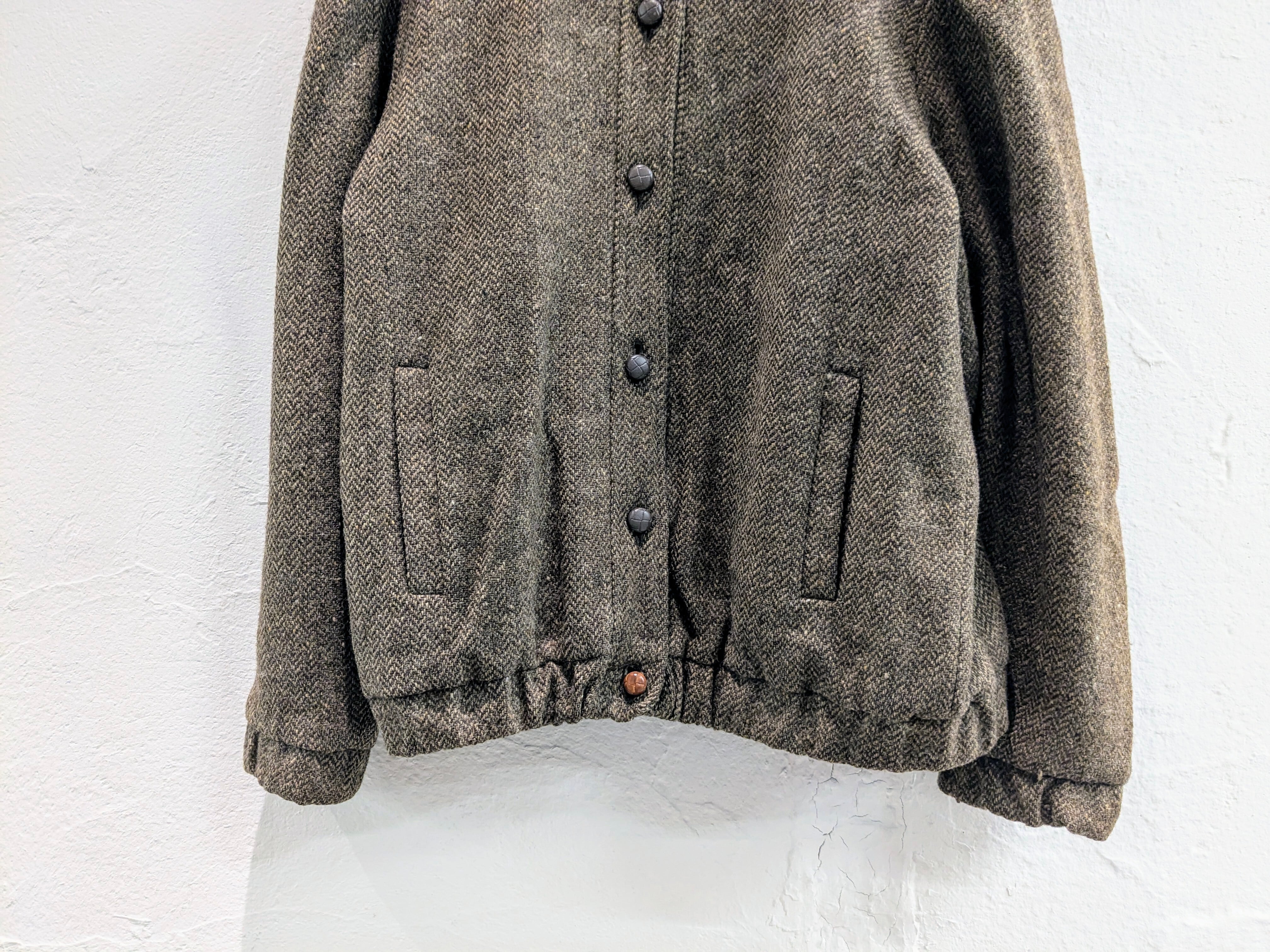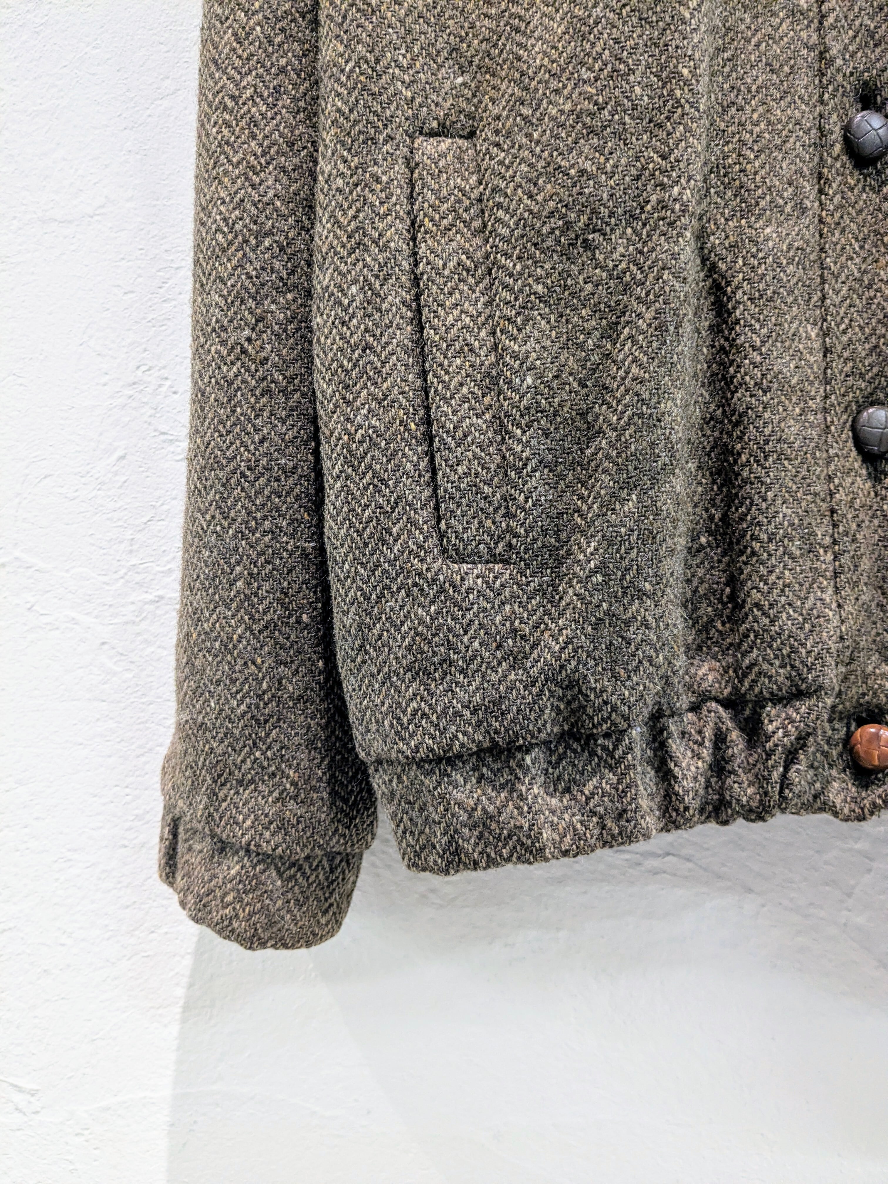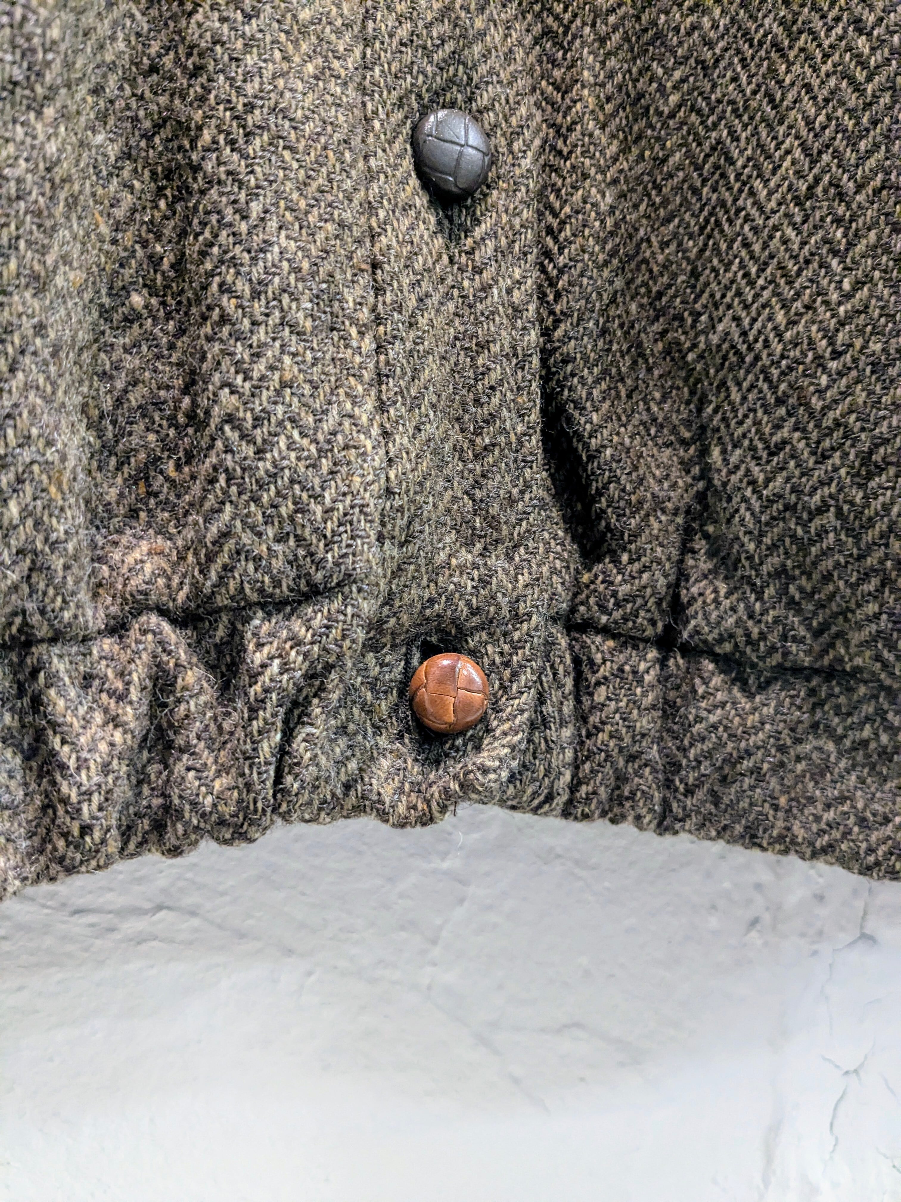 腕の付け根のところには、タックが入っており、可動域が広めにとってあるので、かなり着やすいようにデザインされています。ショート丈ながらも、身幅広めなのでボックスシルエットで着ていただけます。一番下のボタンがおそらく付け替えれており、外れやすくなっています。