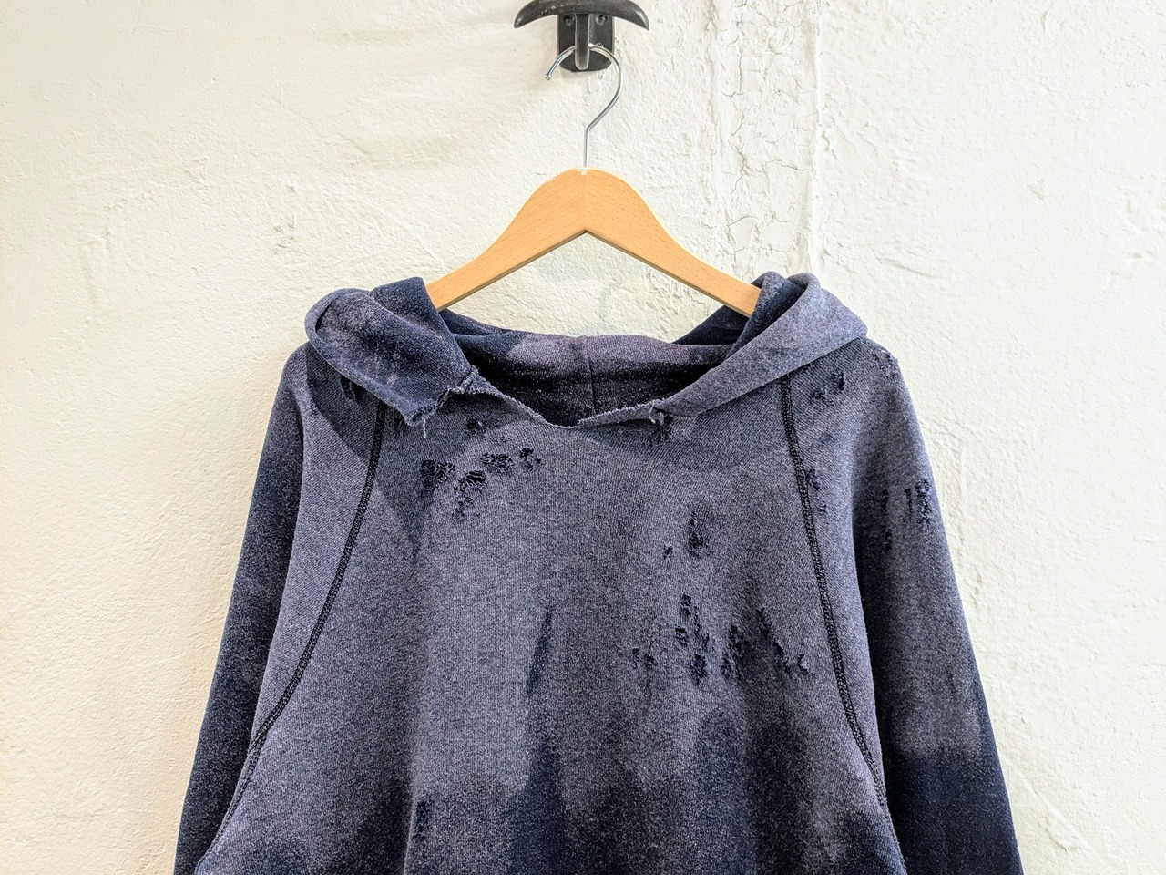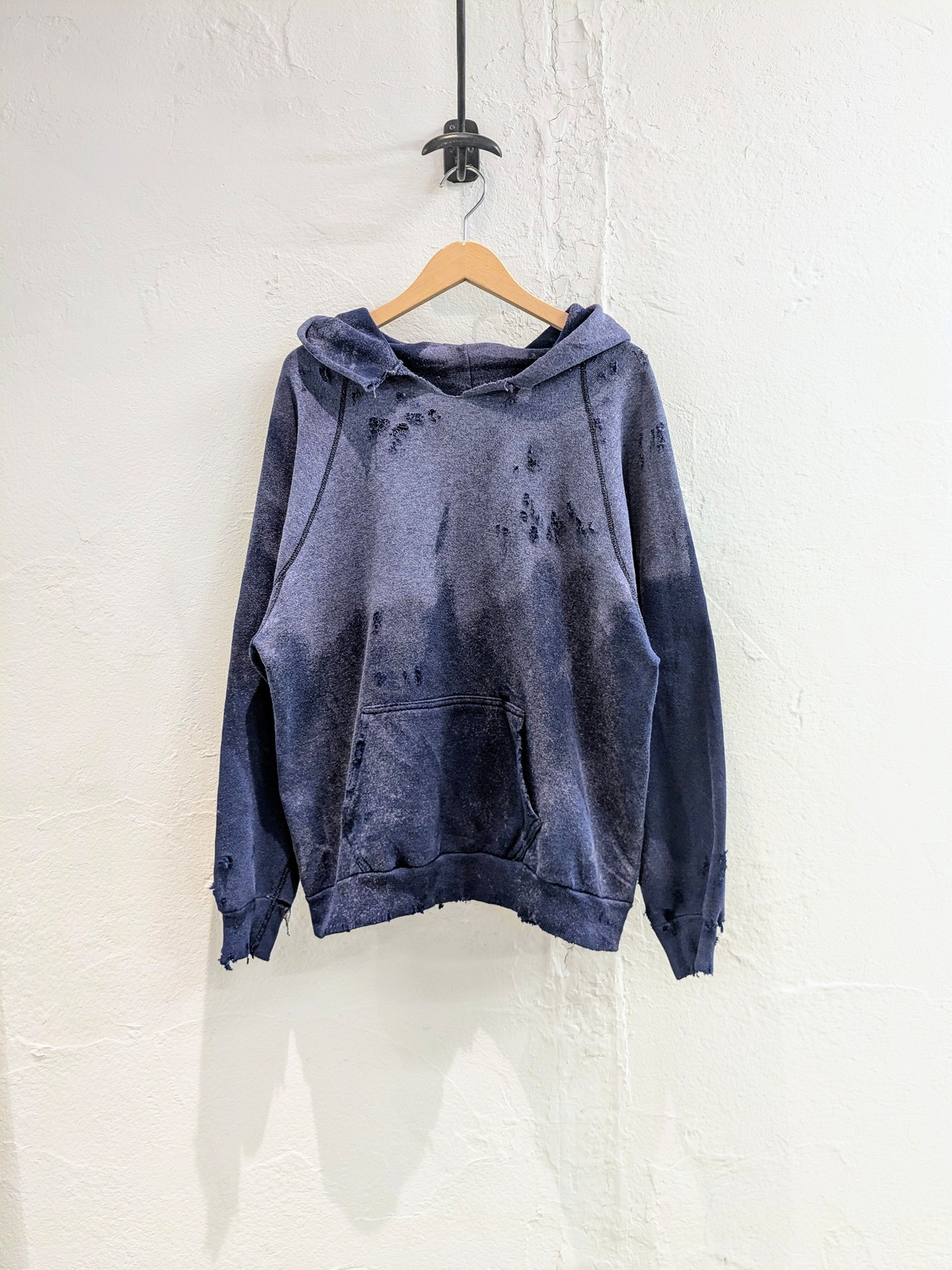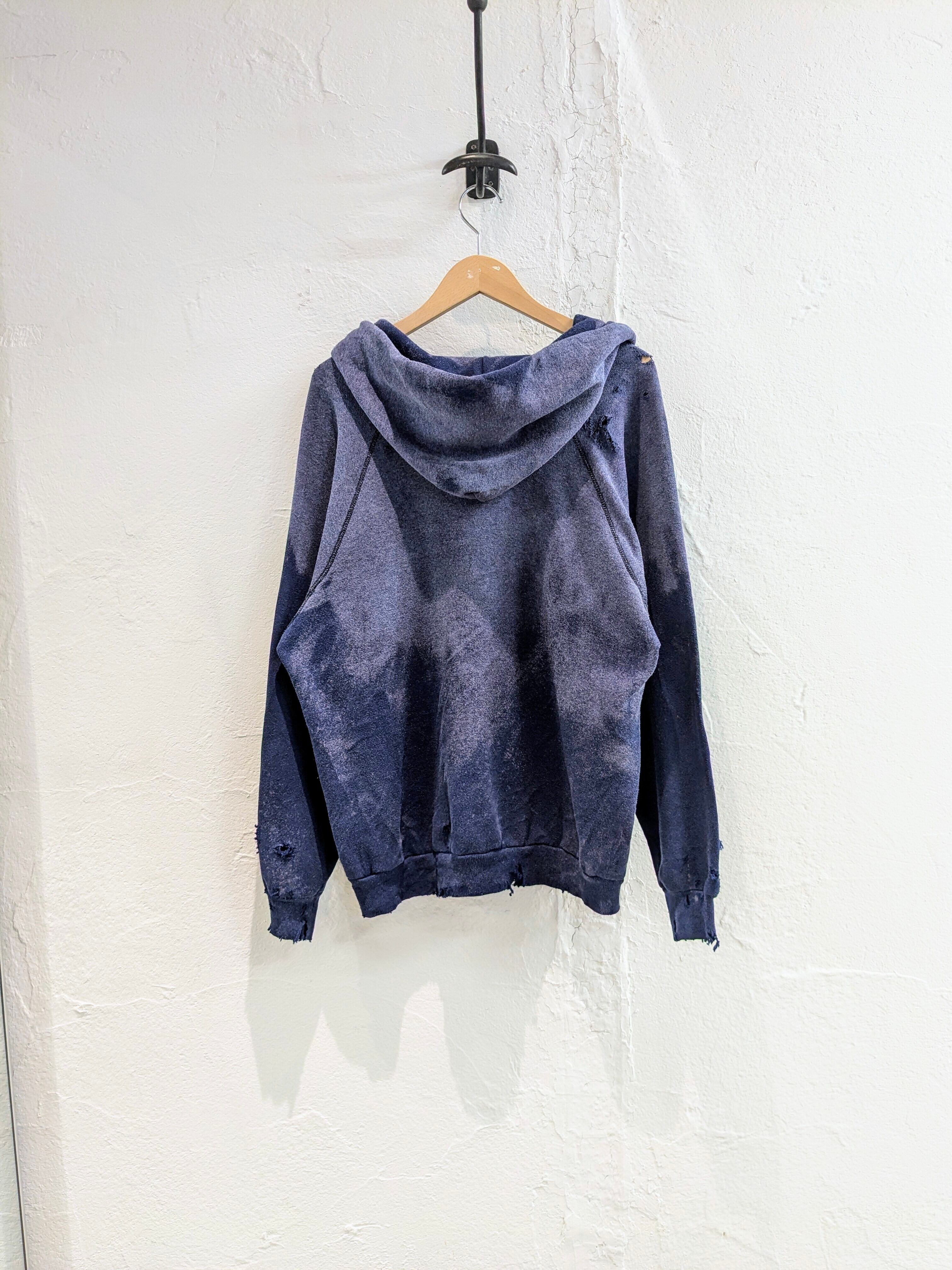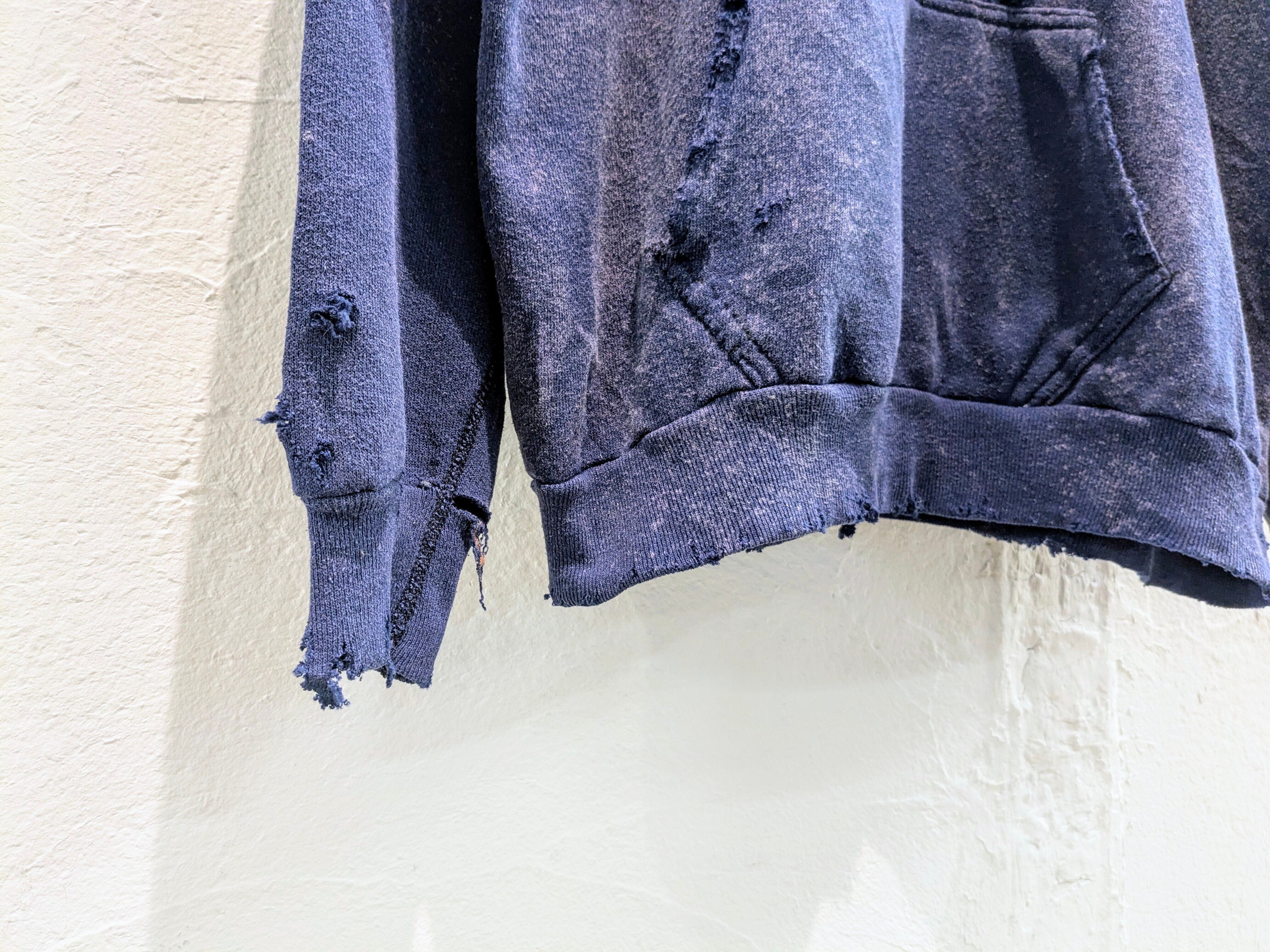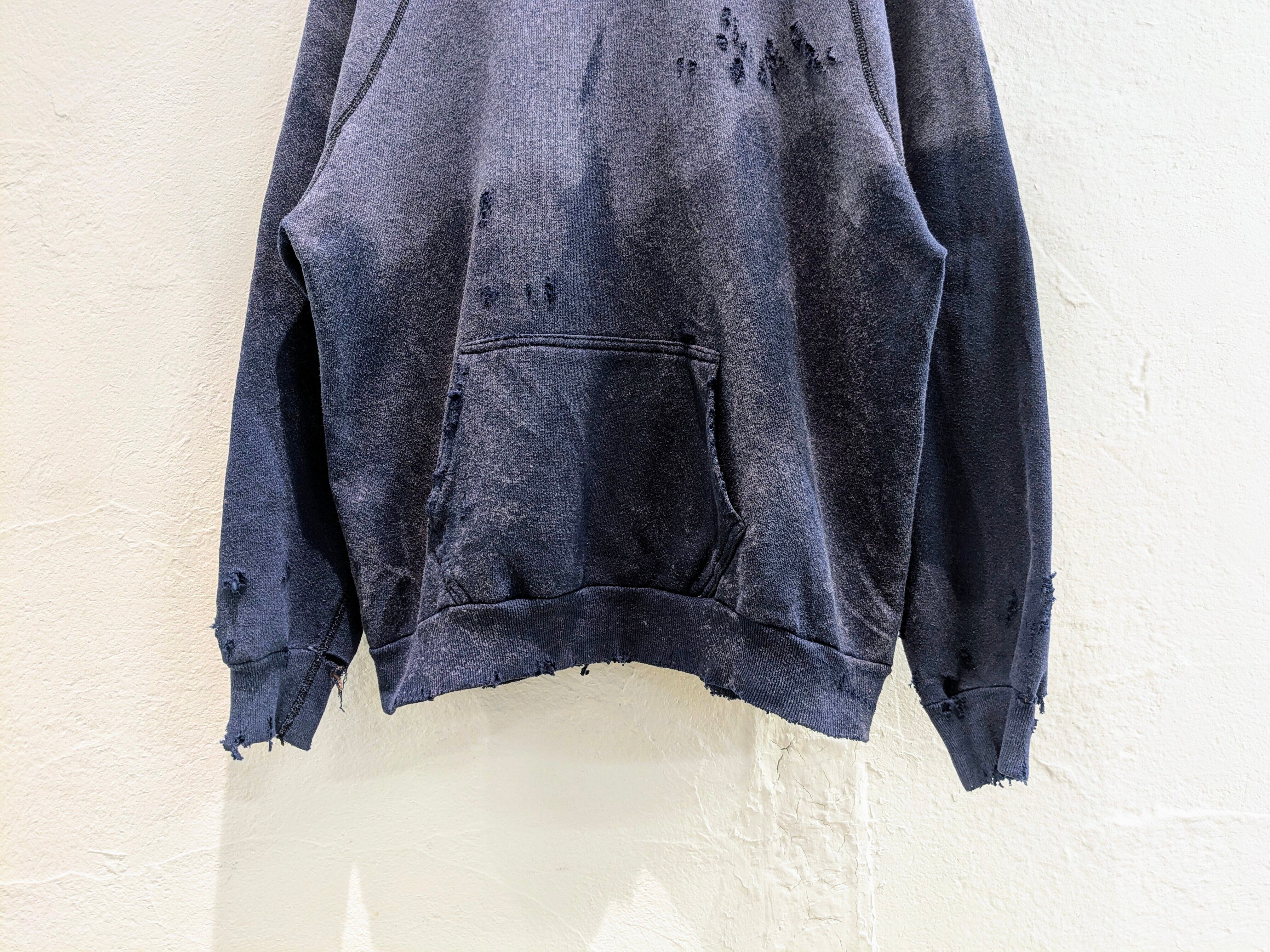 1980'sのDiscusのボディを使用。フェードと、元々首周りが切れていたり、ダメージは入っていたのですが、そこにダメージを足してもらっています。かなり雰囲気もあり、カッコいい一着だと思います。大きさも大きすぎずで、インナー使いもしやすいかと。ラグランスリーブなので、肩周りのサイズ気にすることなく着れるのもいいところかと。
