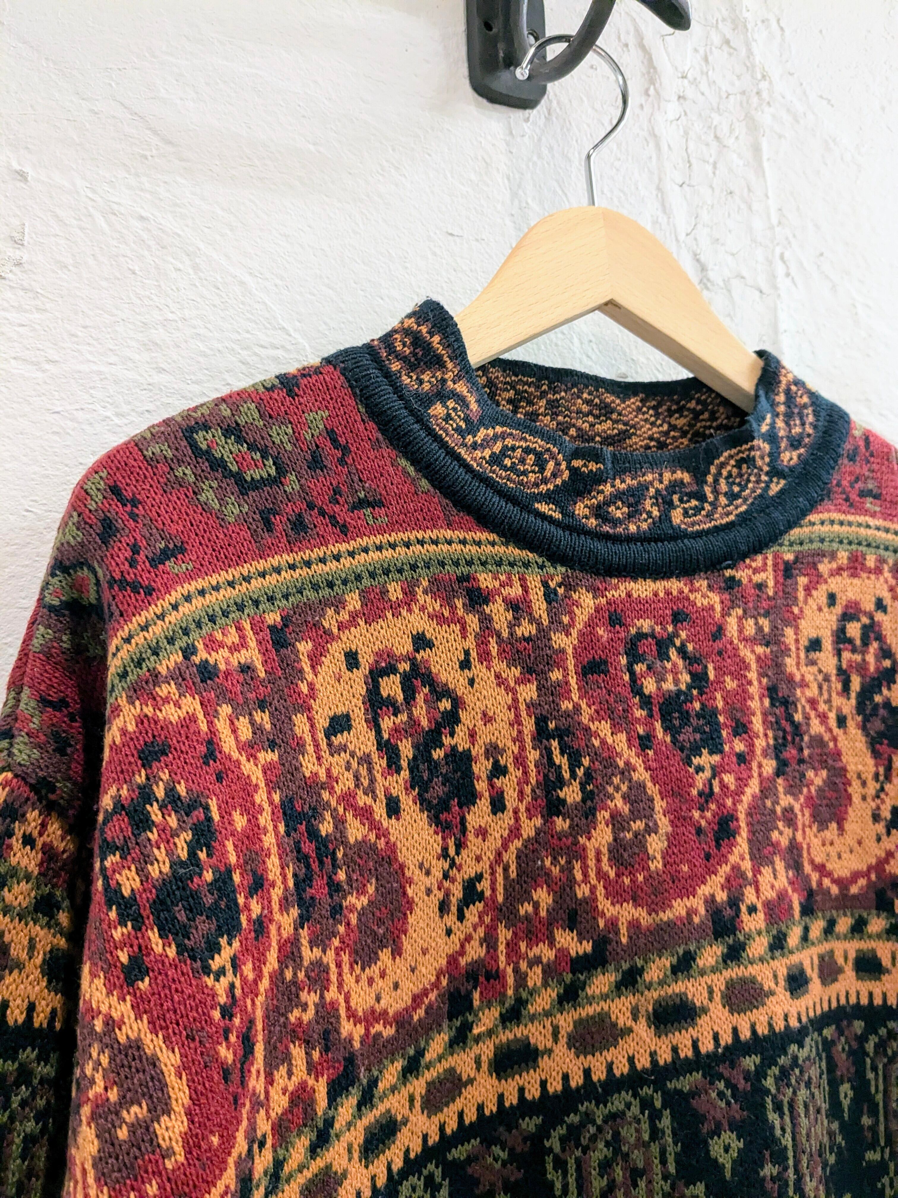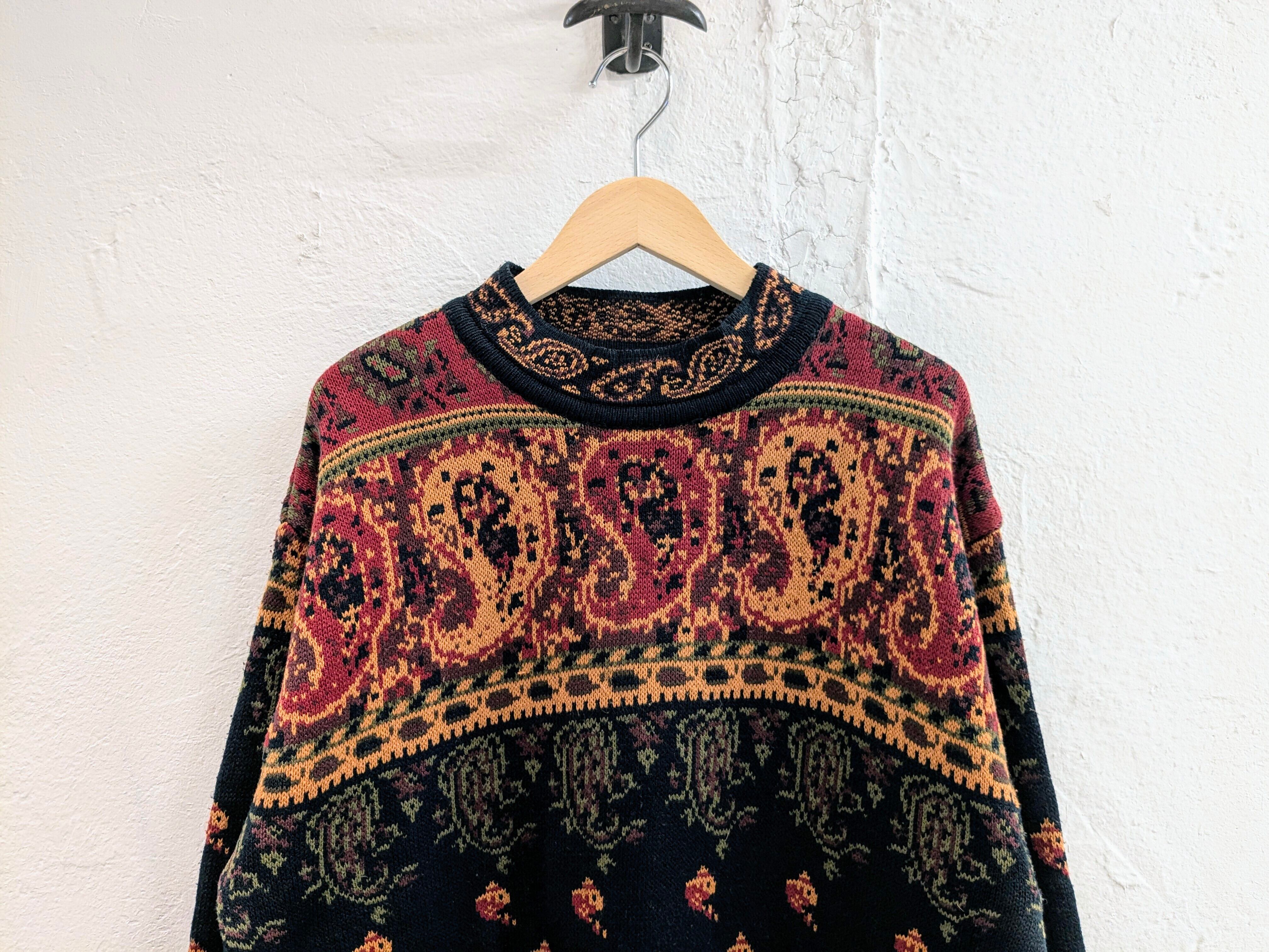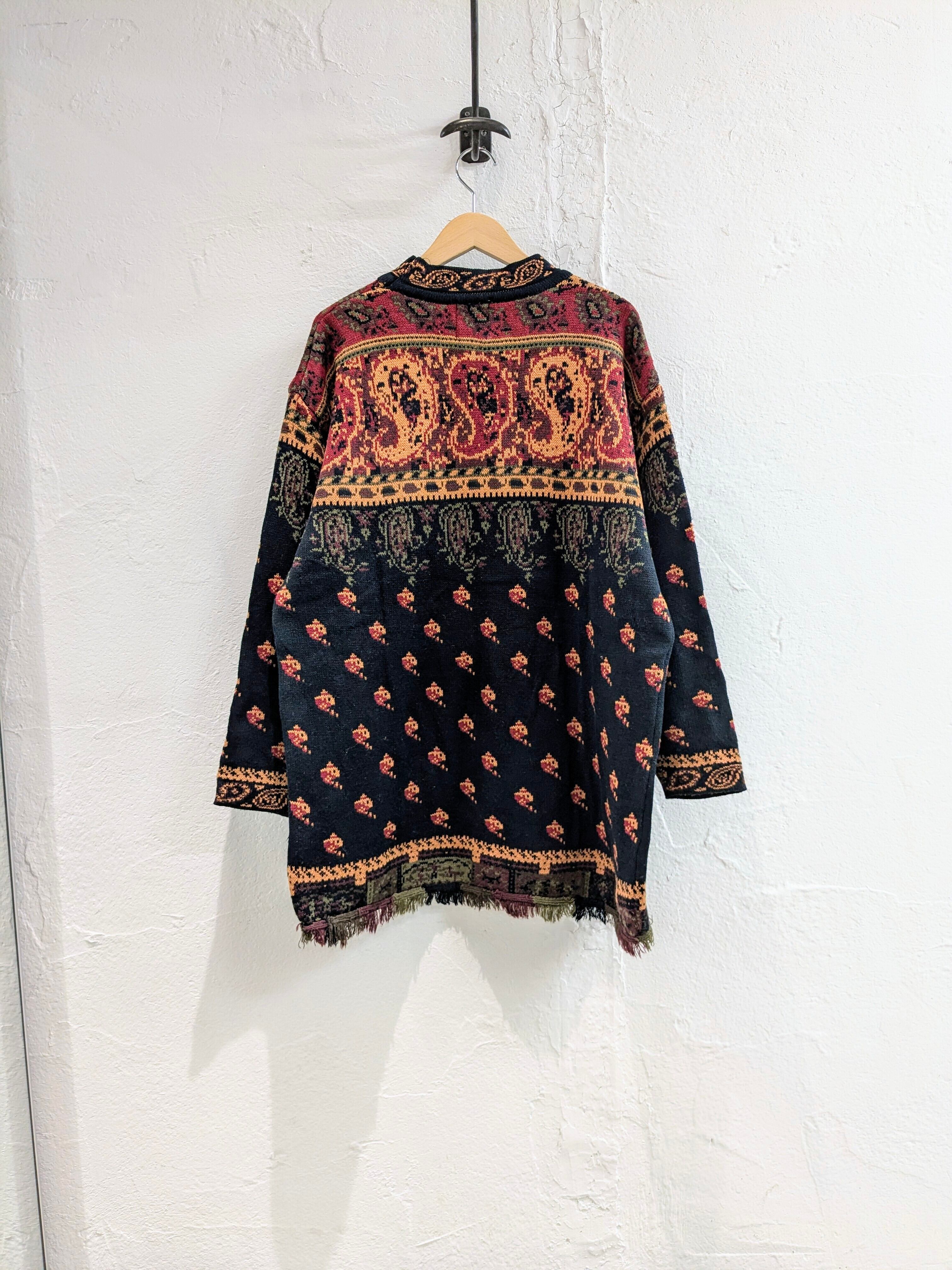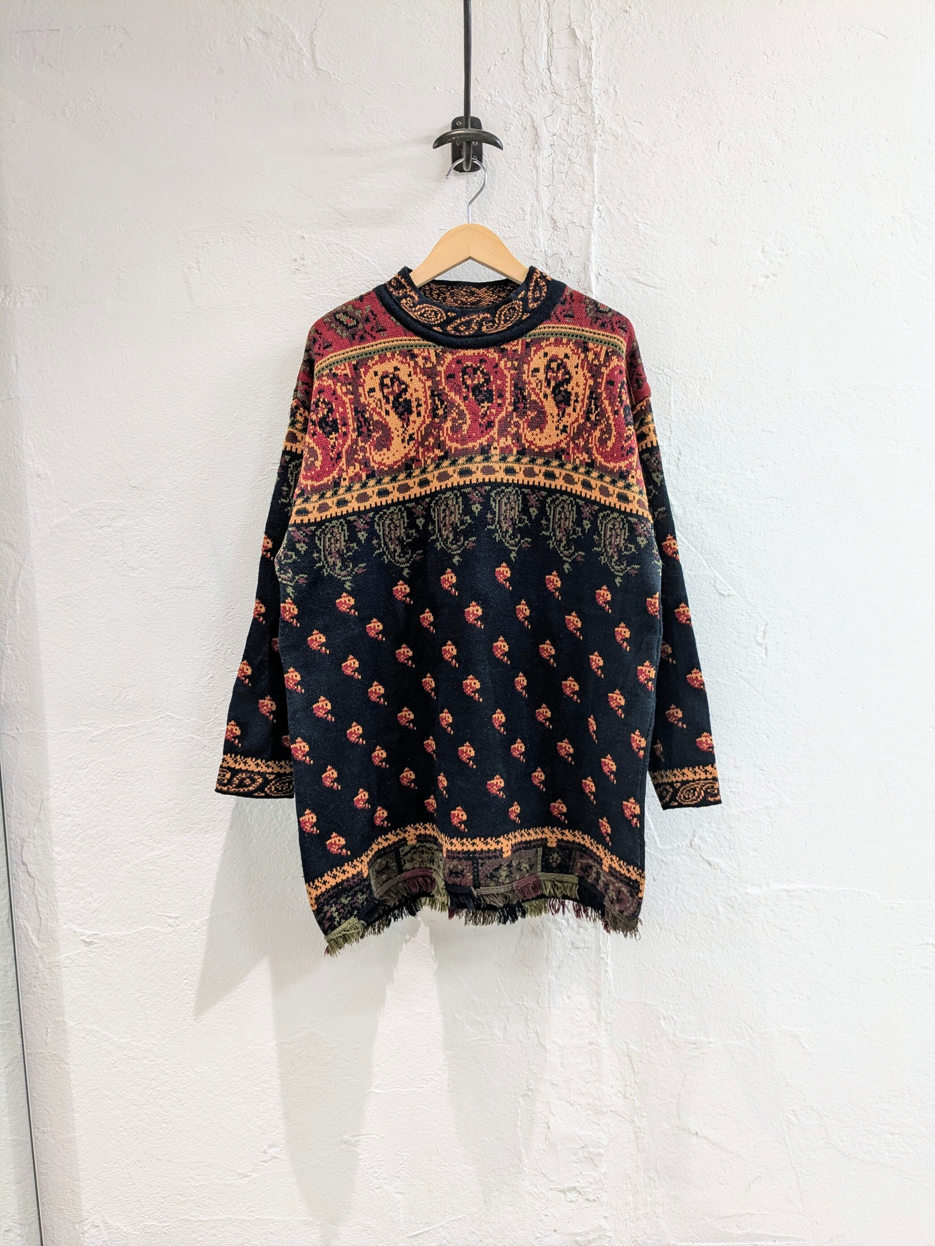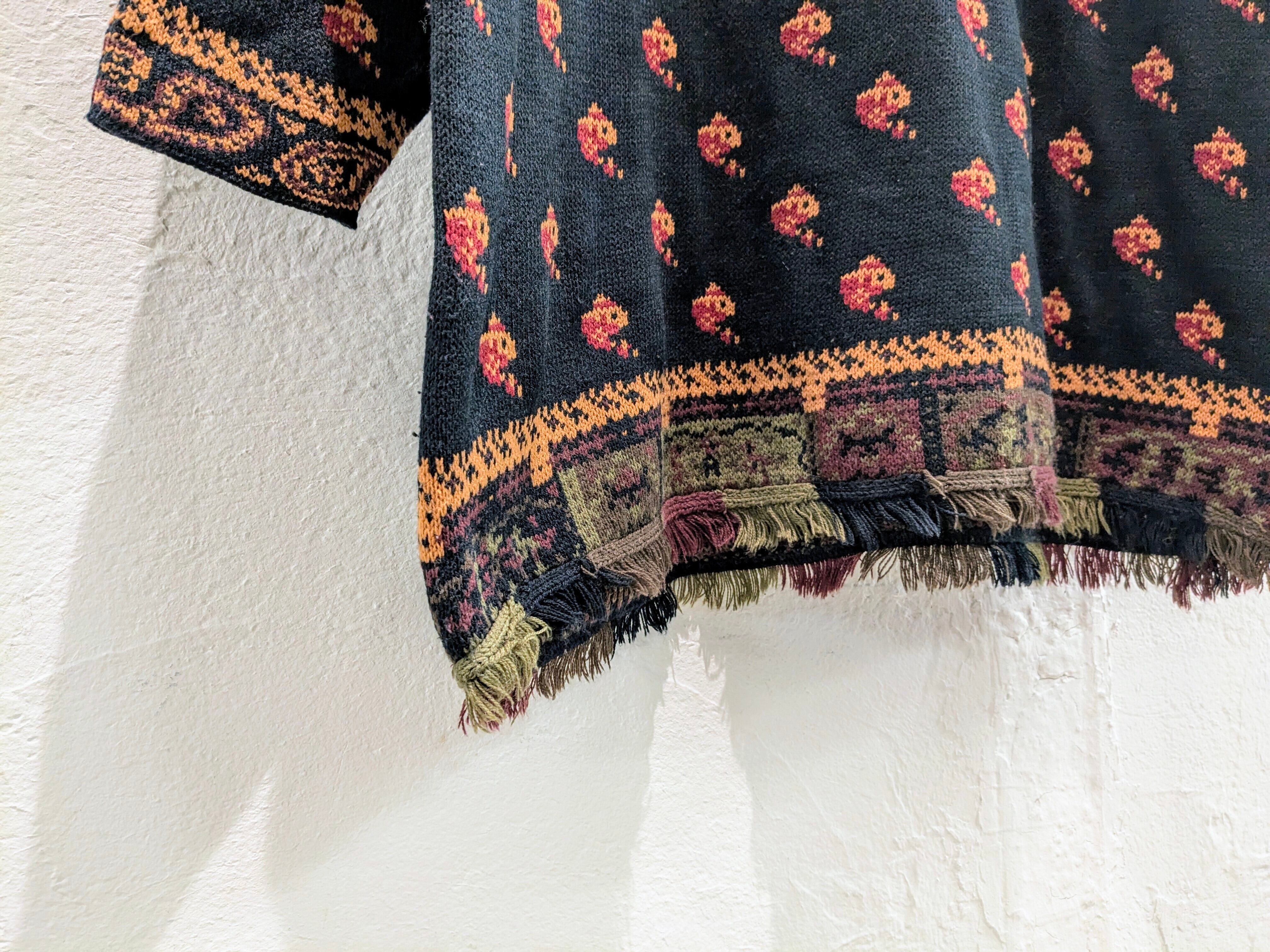 総柄でヴィンテージの絨毯とかにありそうな柄になっています。ペイズリー柄、魚?柄などが全面に入っています。モックネックの首周りにまでしっかりとペイズリー柄があります。そして、柄だけでなく裾がフリンジのデザイン。短丈のアウターの裾から覗かせても可愛いかと。素材はアクリルなので、夏以外のシーズン使えるので着れる時期は長くみていただけます。