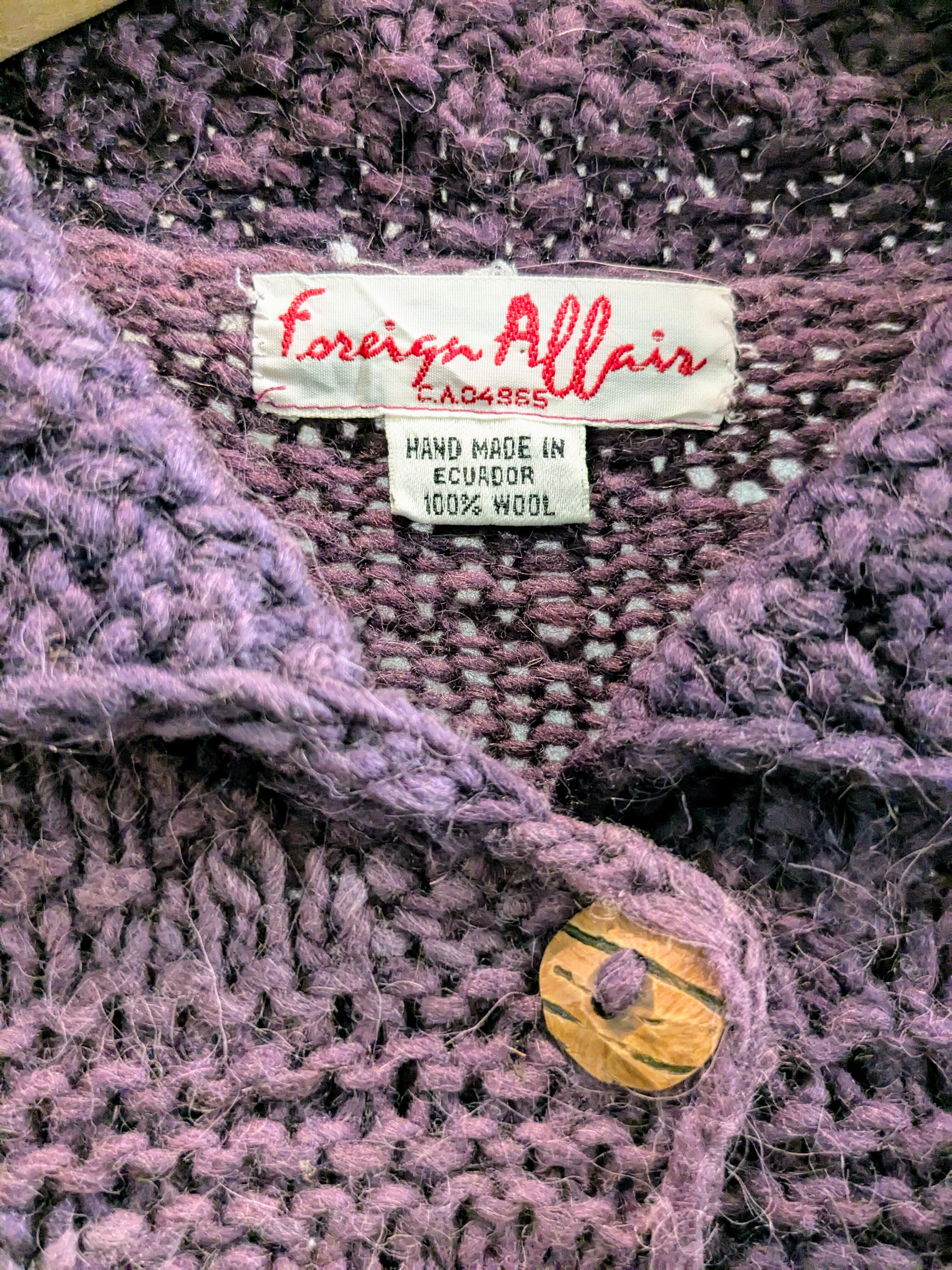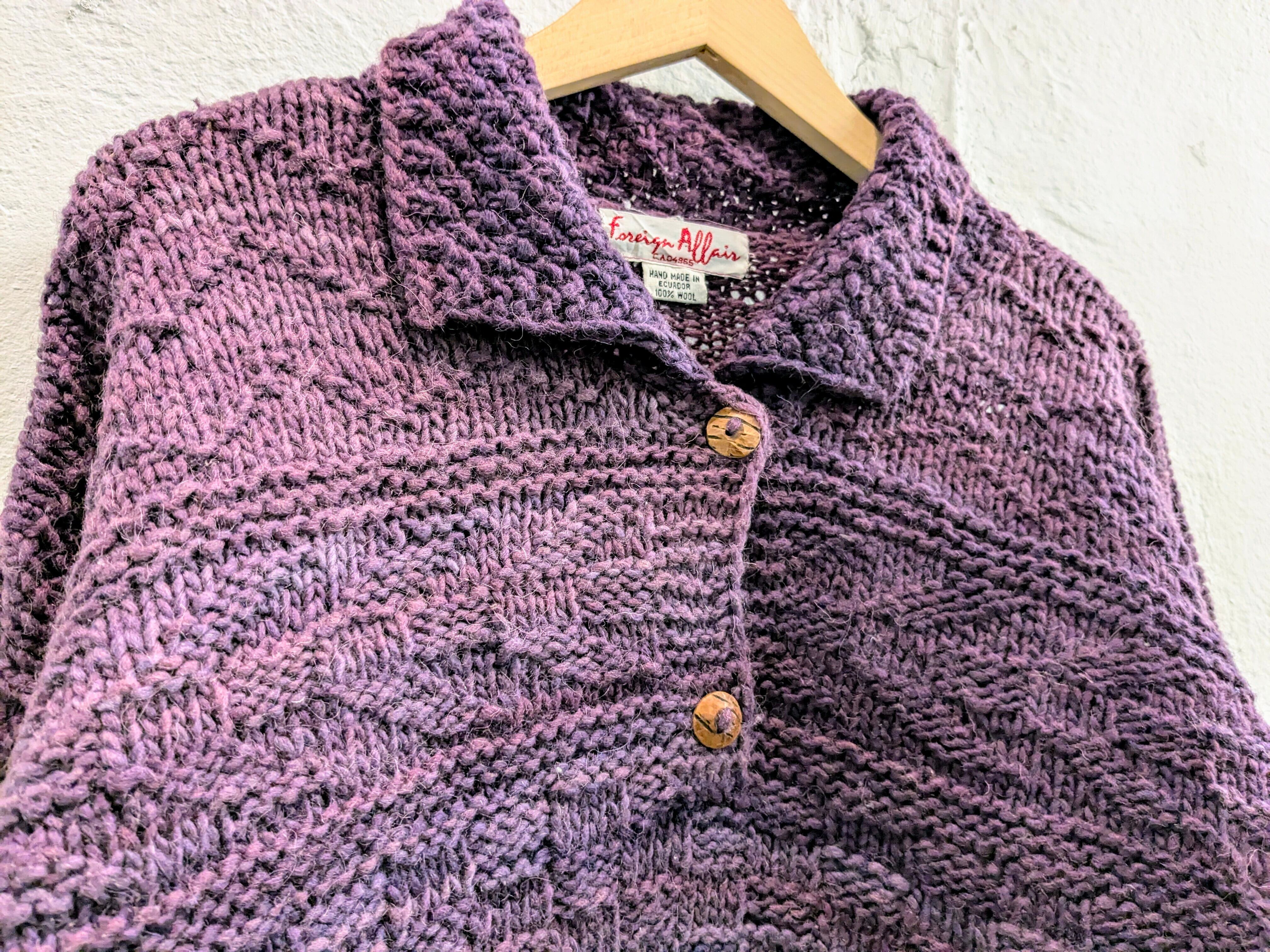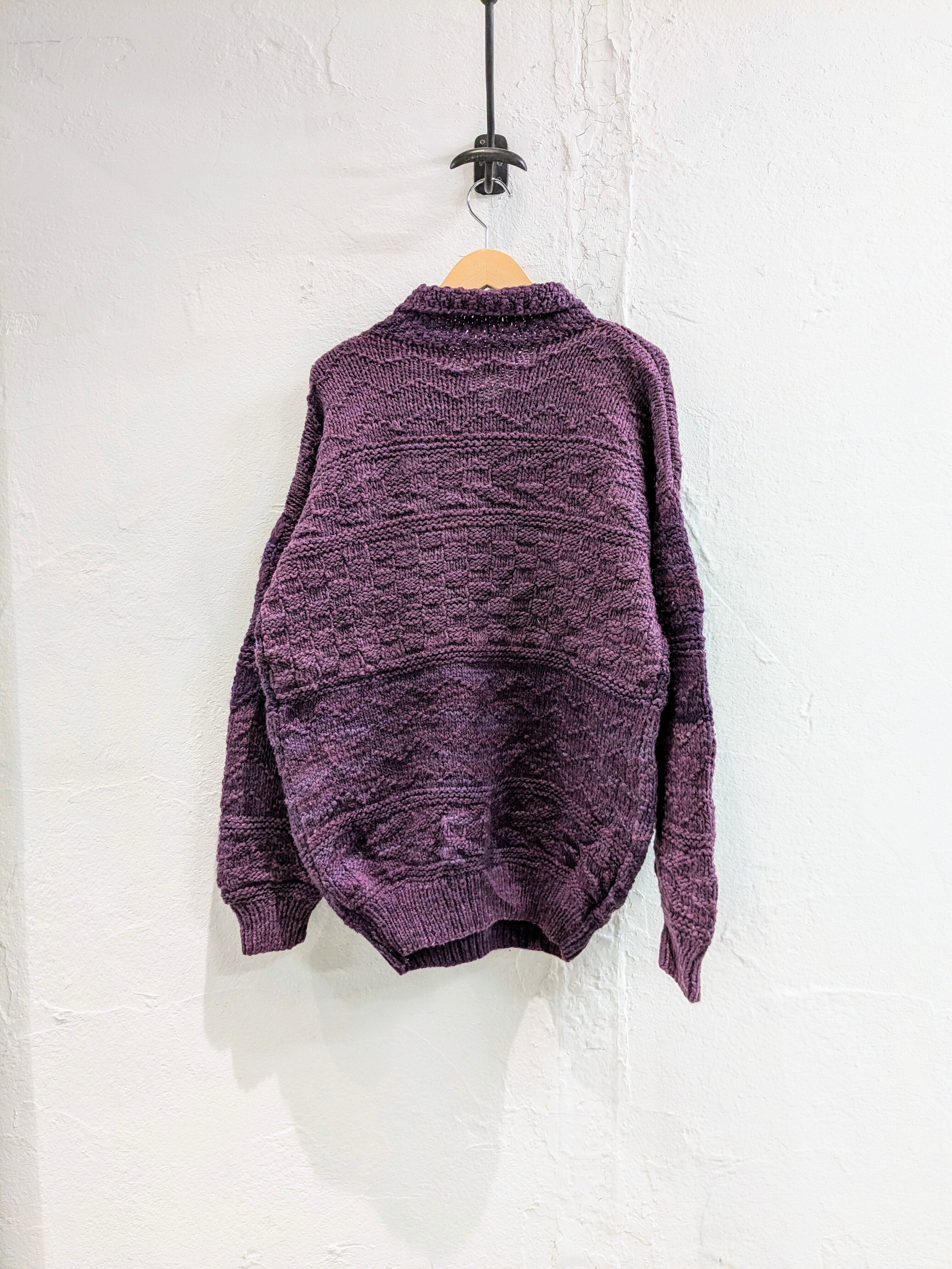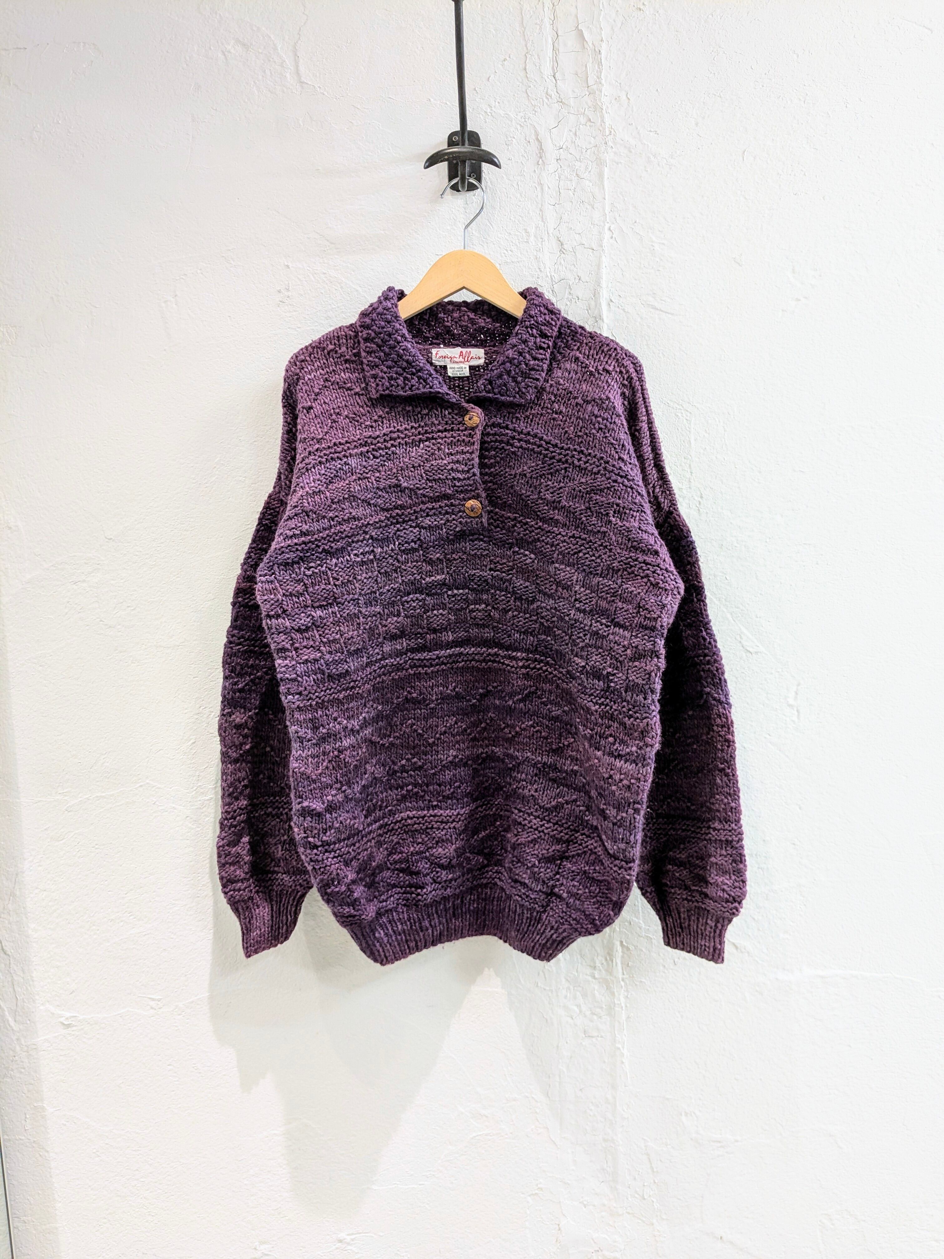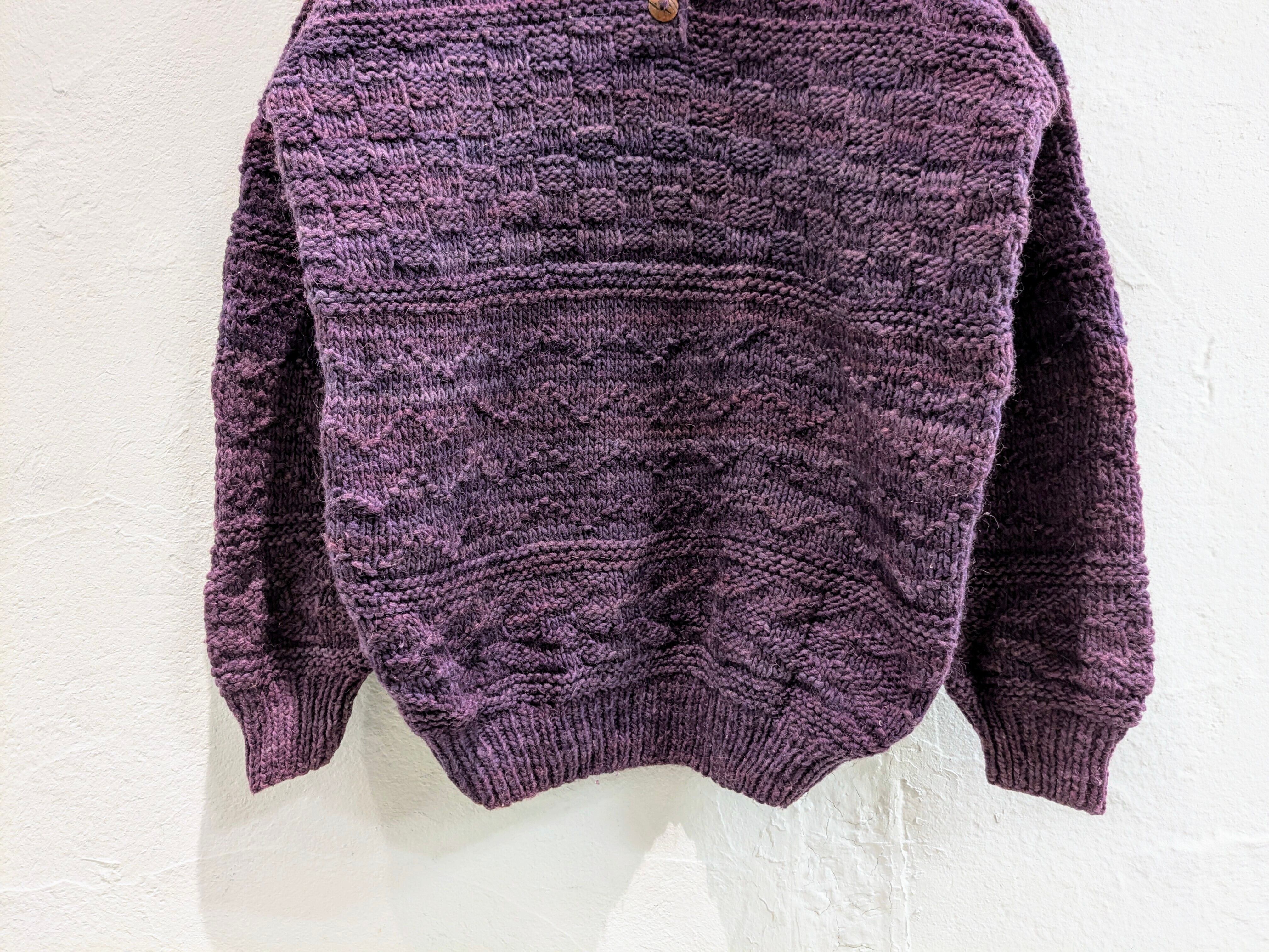 ラガーシャツのような形になっており、そのうえで織り柄が入っているとても可愛いニット。紫も単色ではなく、色ムラのように紫でグラデーションのようになっています。ボタンもウッドボタンを使用していたり、細部までこだわっている一着。毛羽立ちあり。