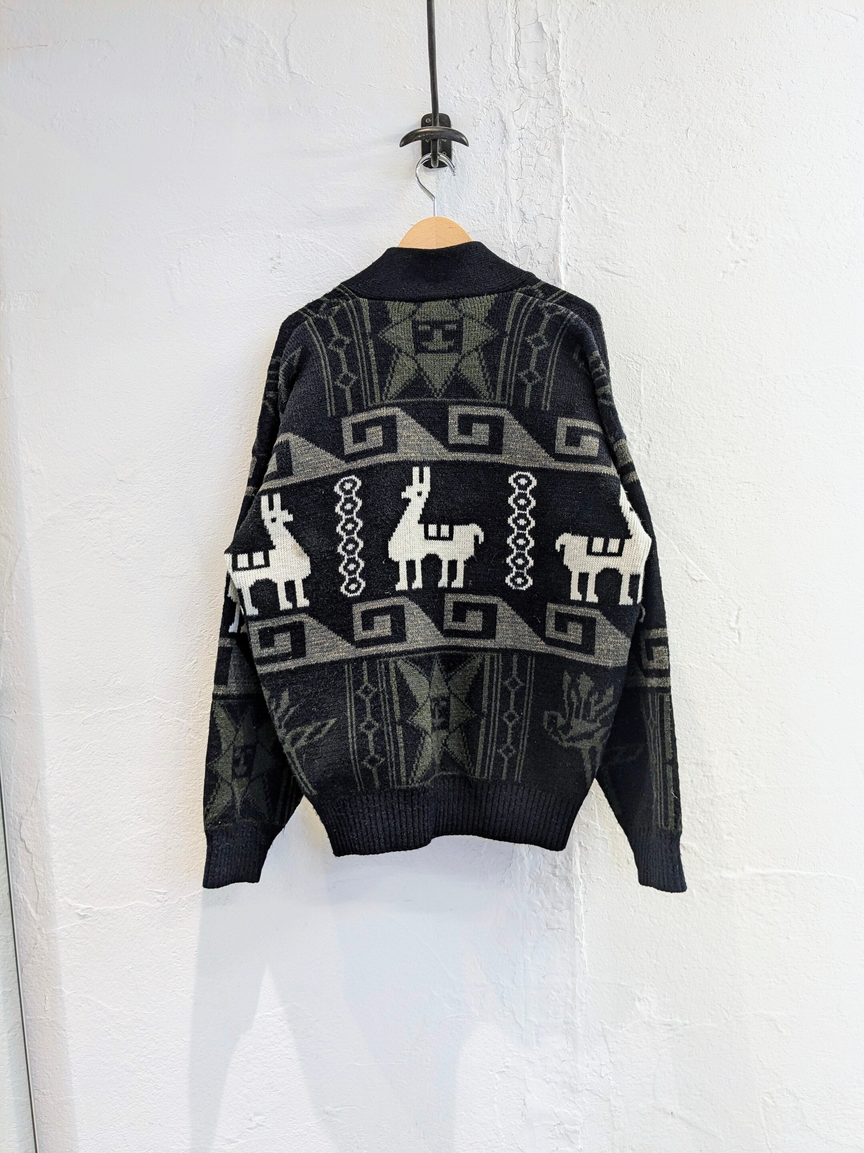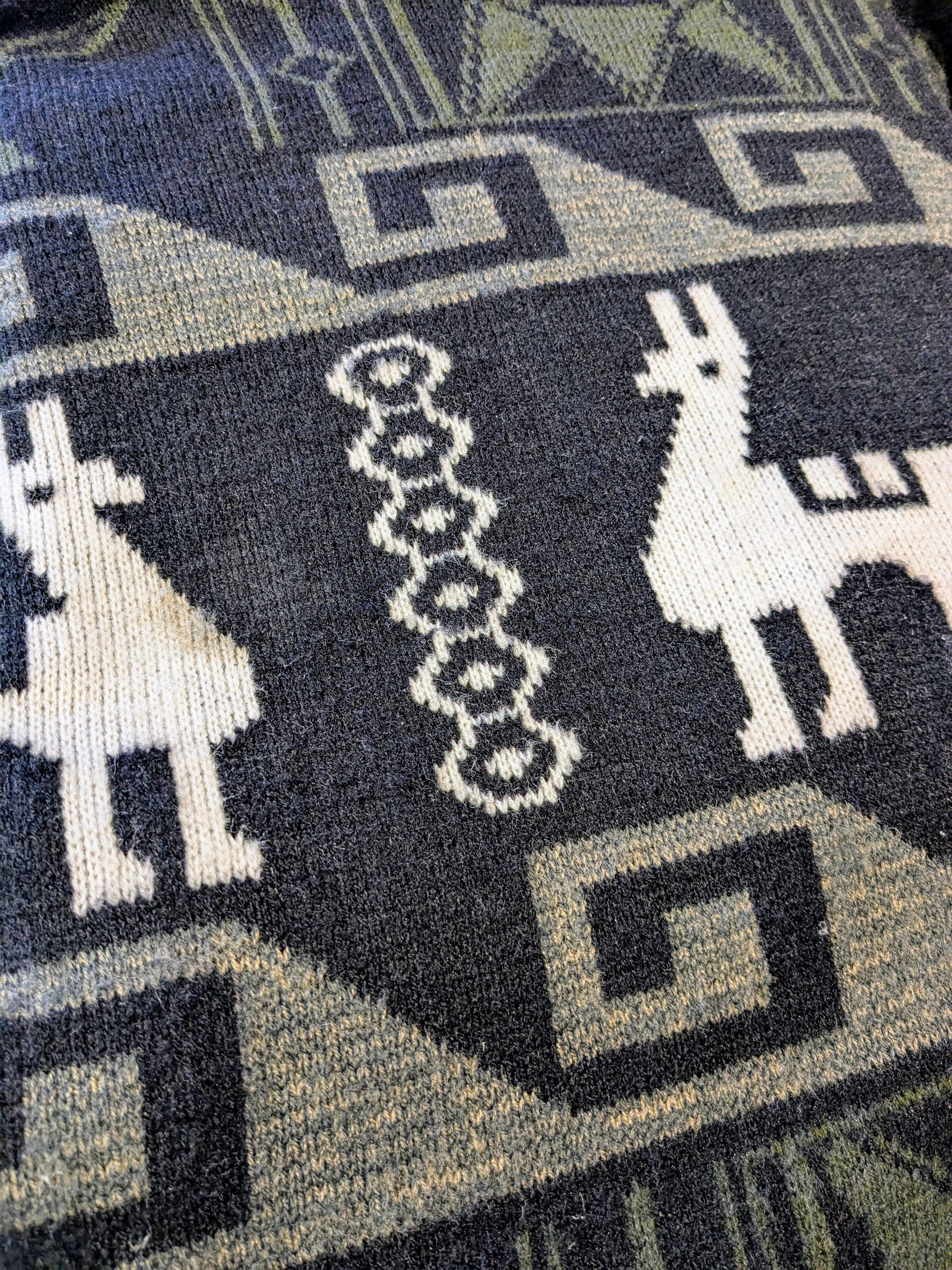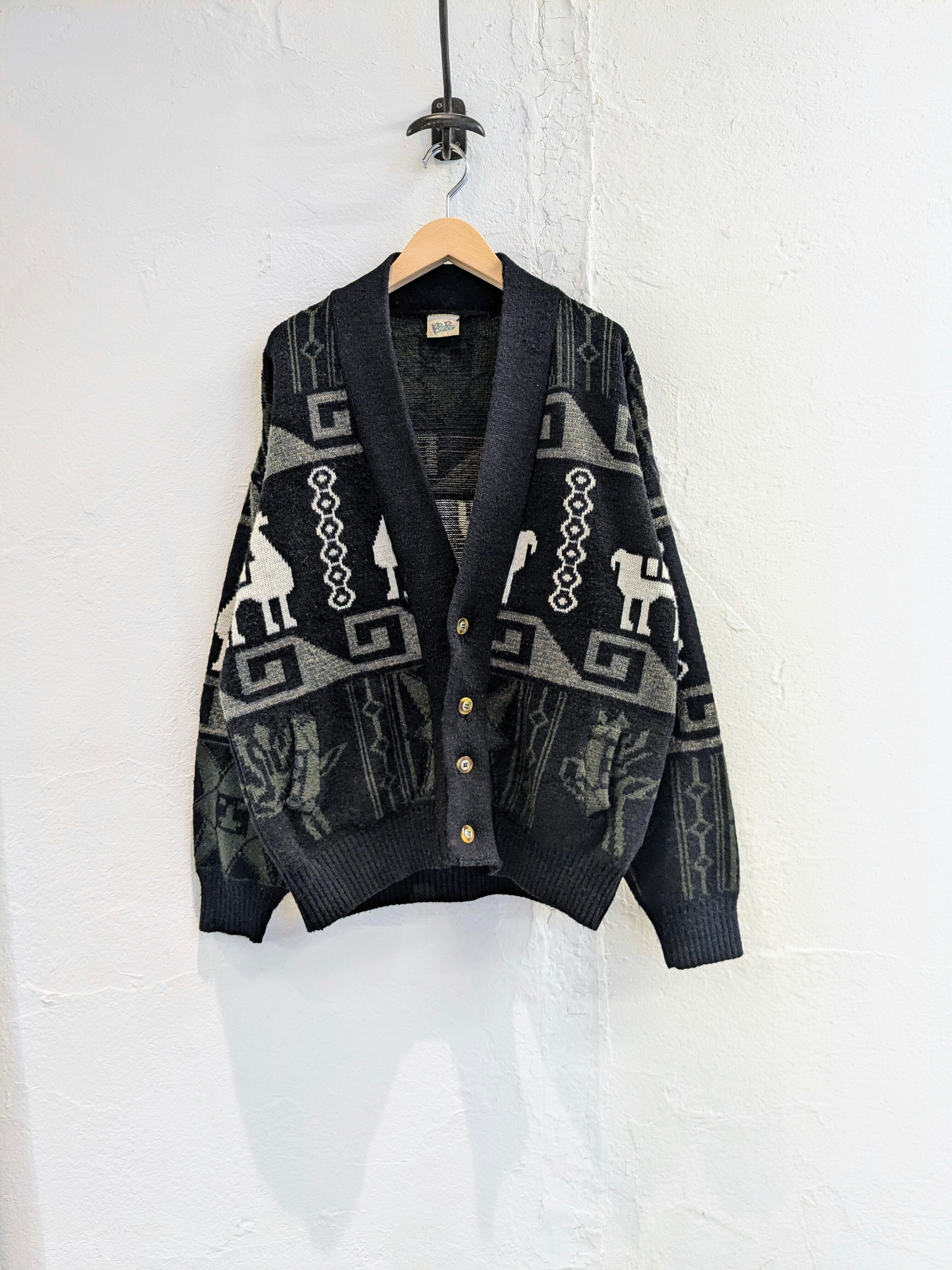 アルパカ?柄がとても可愛いデザインとなっています。生地は肉厚でニットアウターのような感覚で着ていただけます。アームホールもゆったりとしているので、インナーも選ばずスタイリングができます。毛羽立ちがあり。