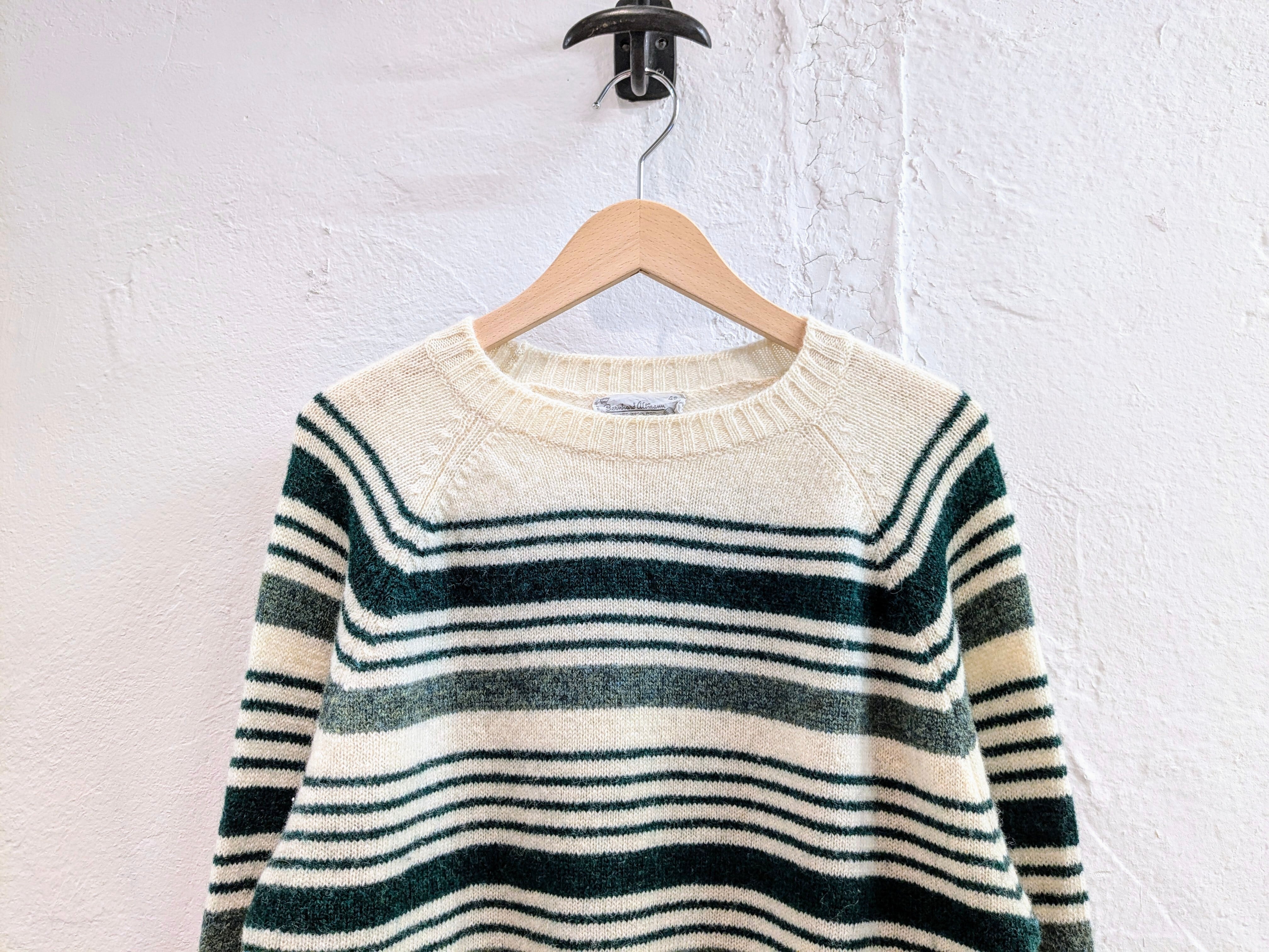 リブの太さなどがまたたまらない一着。肩はラグランスリーブになっており、ストレスフリーで綺麗に着ていただけます。ボディの色は、白ですが生成りに近い色になっています。持ってるとつい着てしまうアイテムかと。