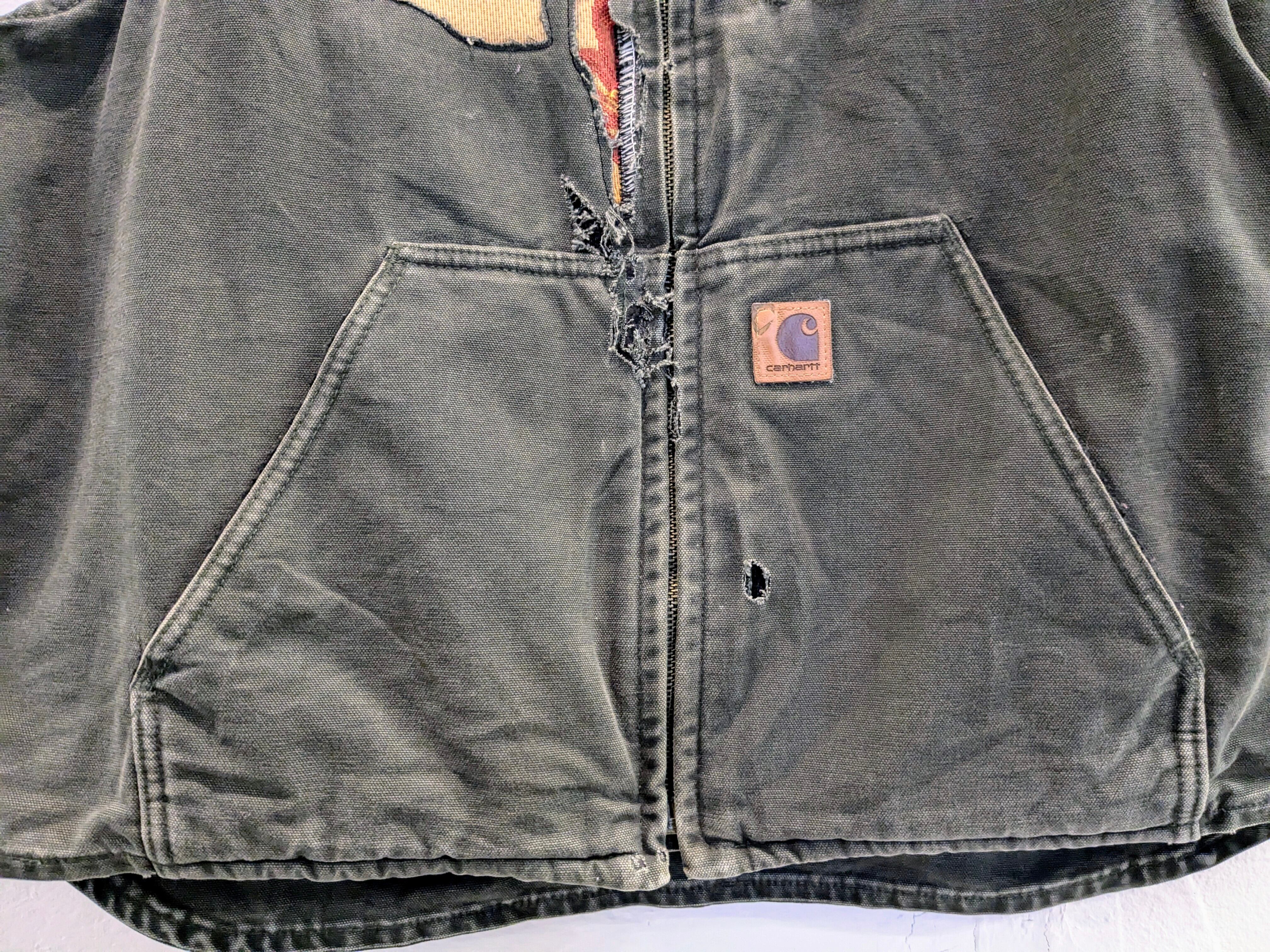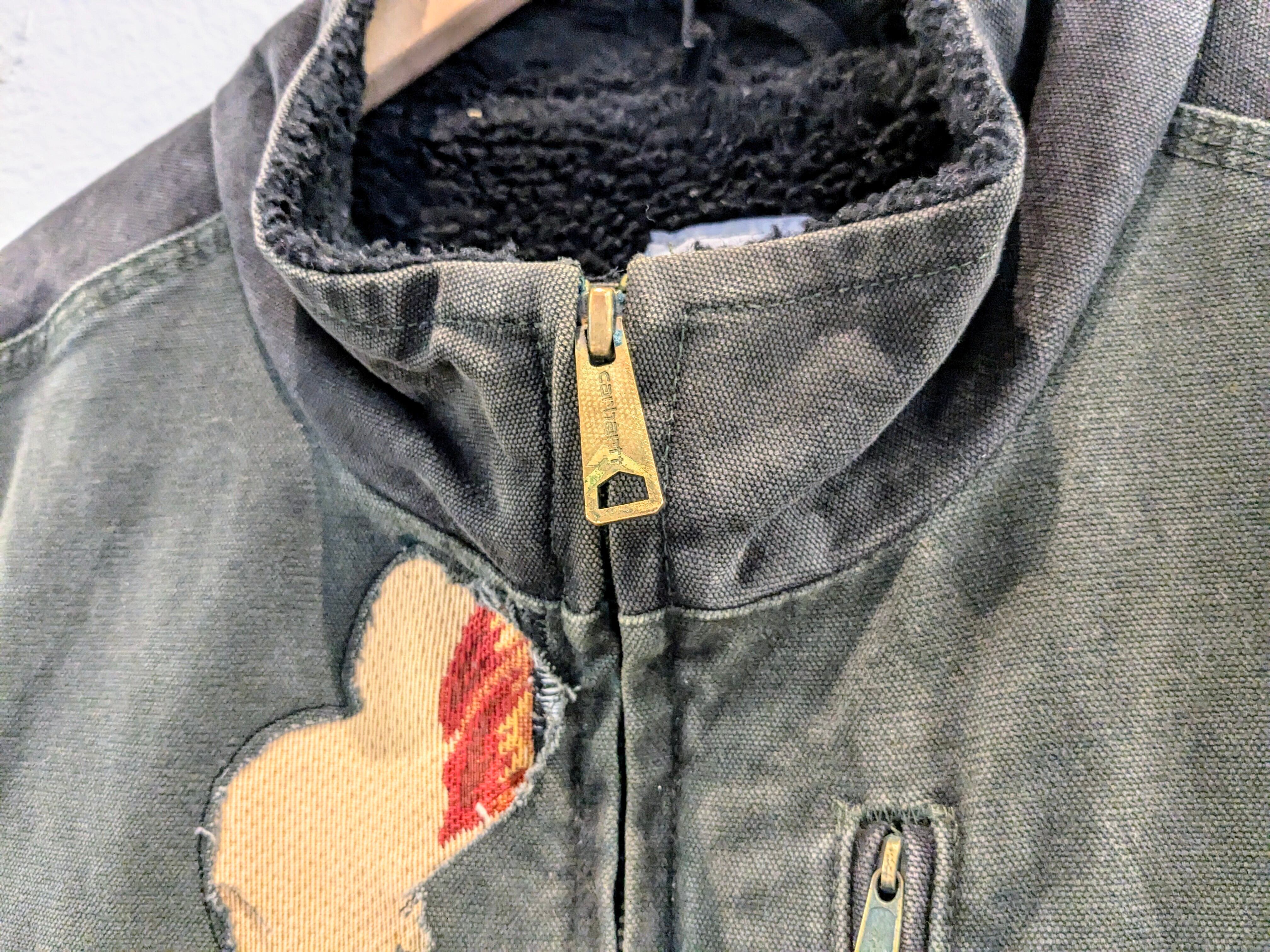 元々ダメージのあるカーハートのダックのボロベストを使用。ダメージ部分をラグの生地をあて、デザインのあるリペアにし、背中にはそれに合わせた花柄のイラストを加えてあります。カーハートのワーク、無骨さを少し緩和してくれるデザインとなっています。