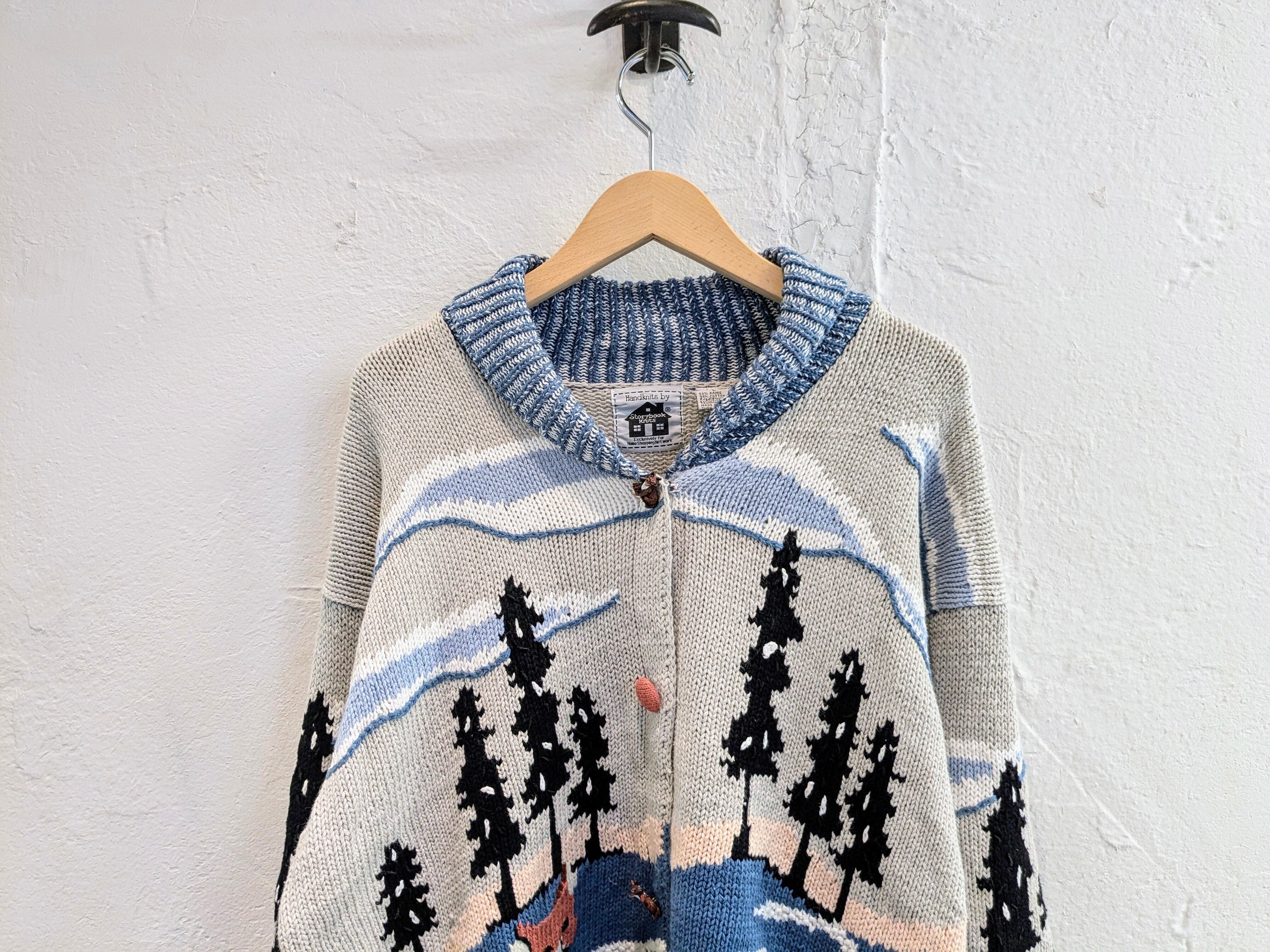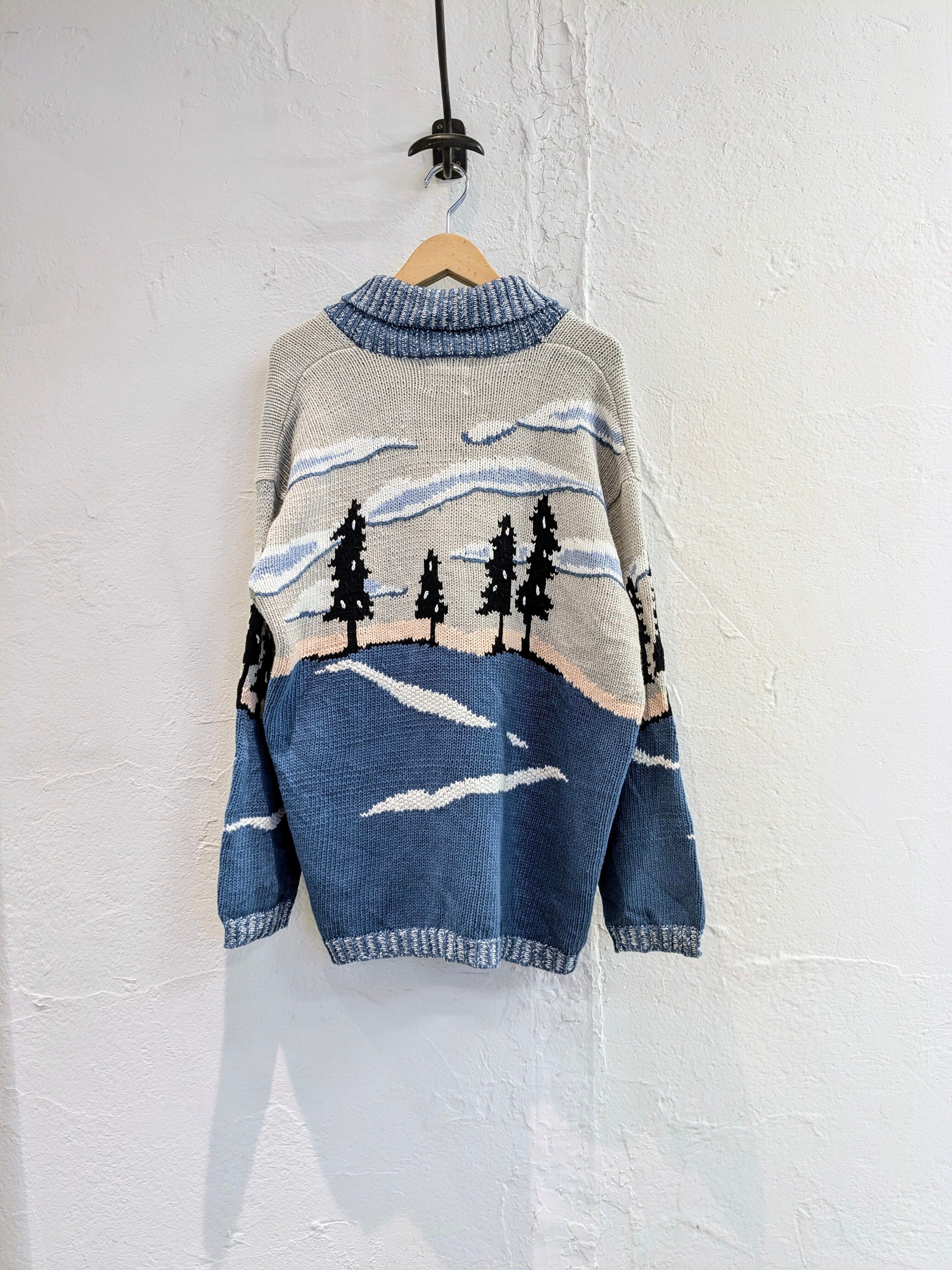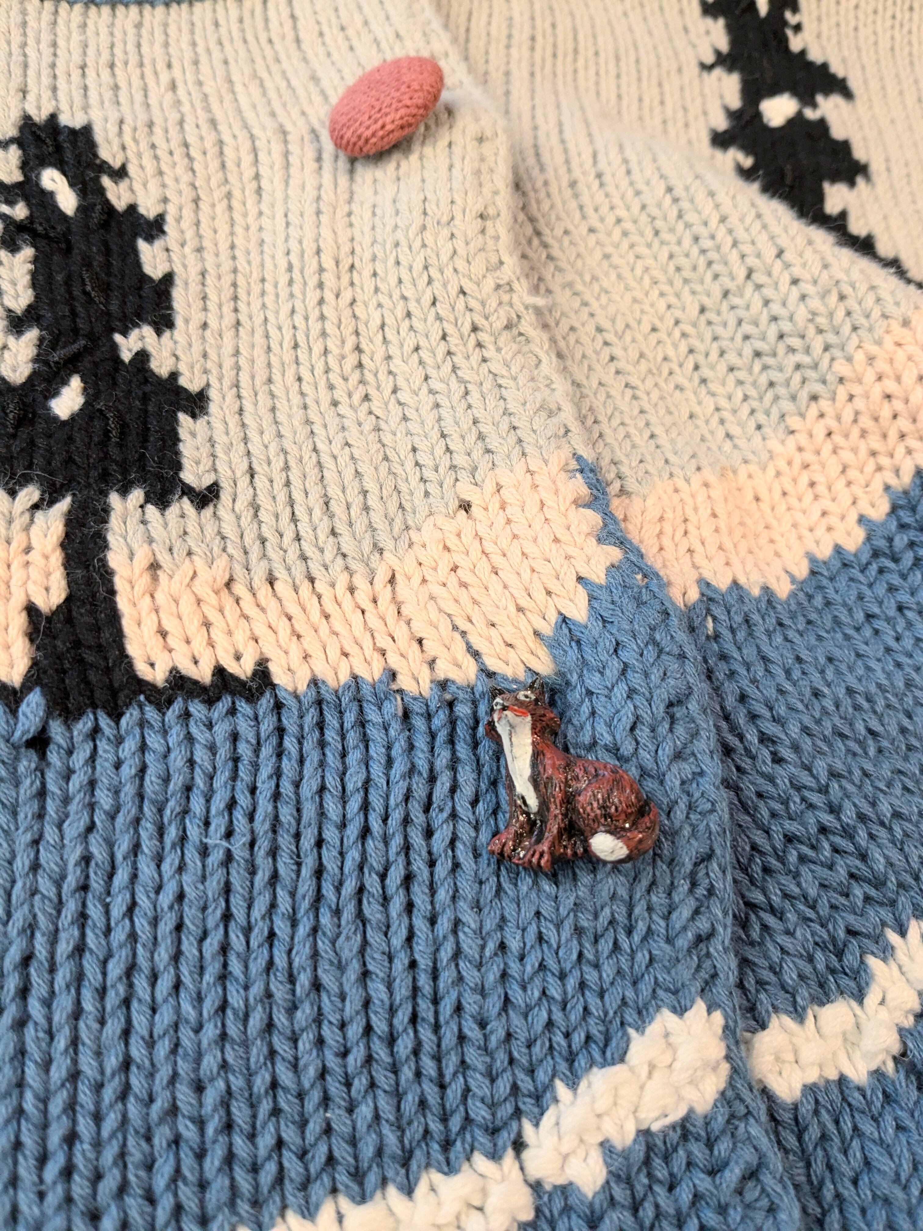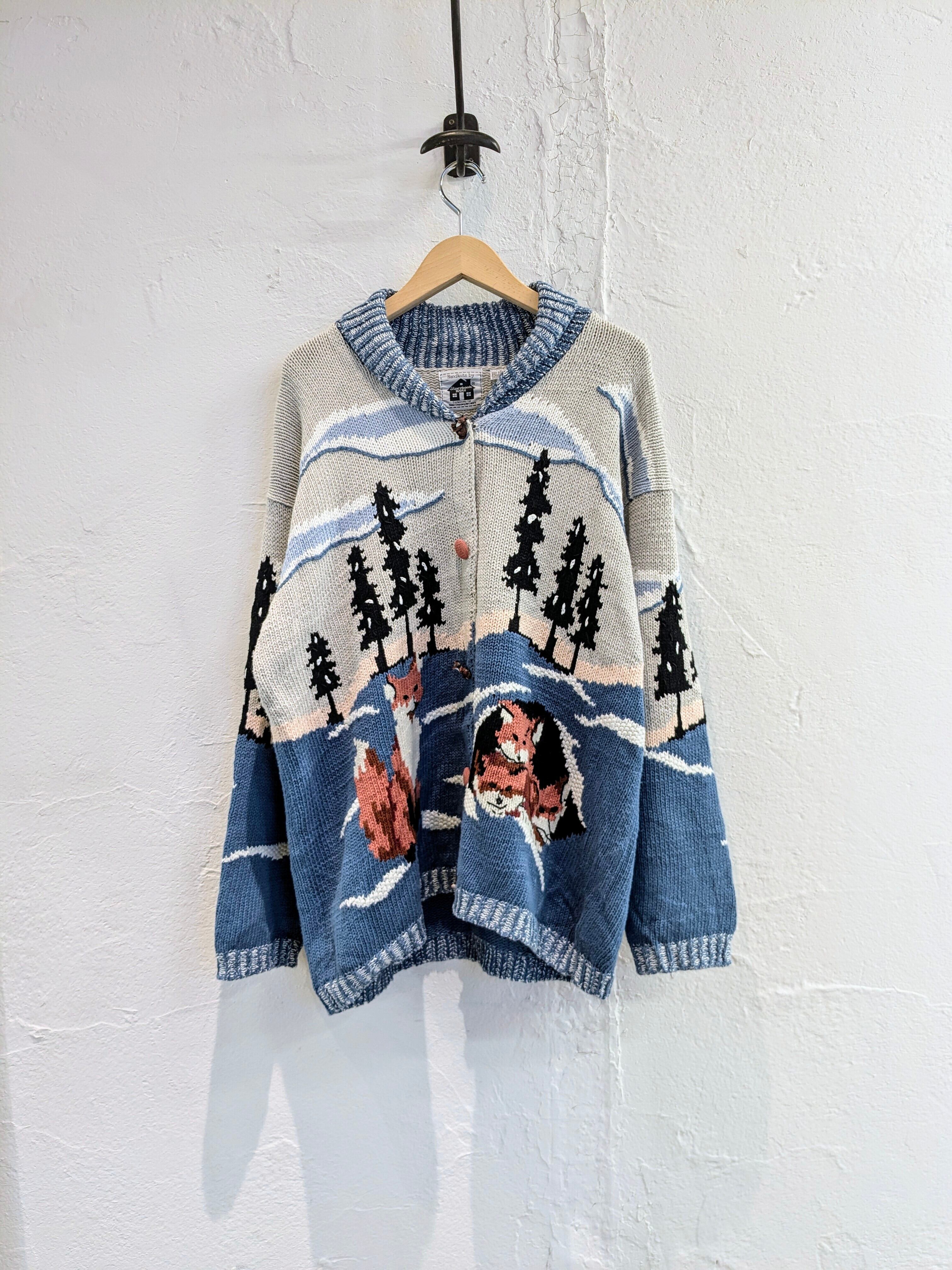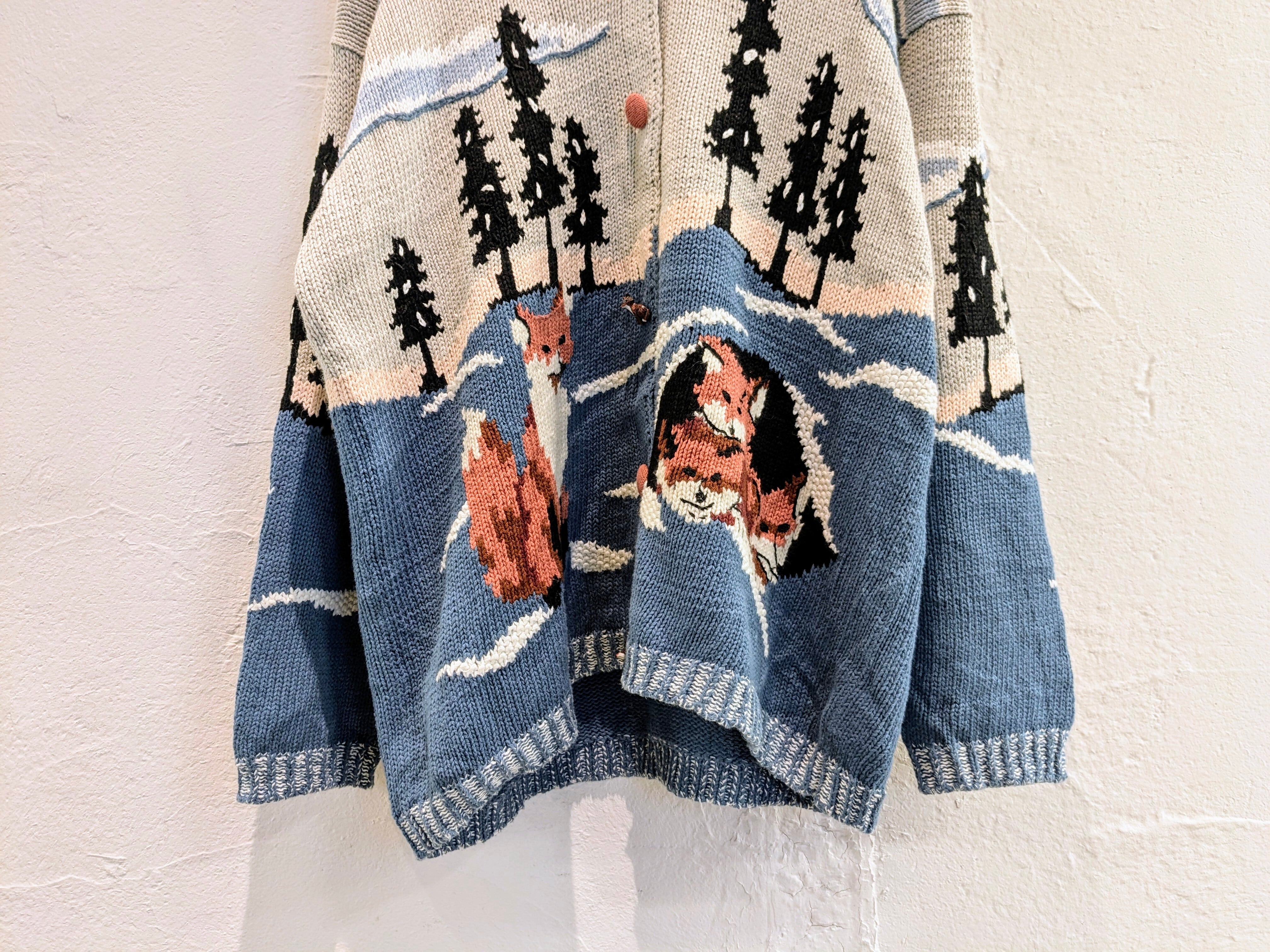 こちらはキツネのデザインとなっています。カウチンセーターなどでも探そうとすると意外に見つからないようなデザイン。こちらはコットンニットなので、カウチンセーターなどよりも軽くほぼオールシーズン使っていただけます。編み柄でキツネがいたり、ボタンまでキツネのデザインがされていたりと細部までこだわっている一着。ゆったりめのデザインなので、今はインナーにバーカーなどを着ても良いかと。