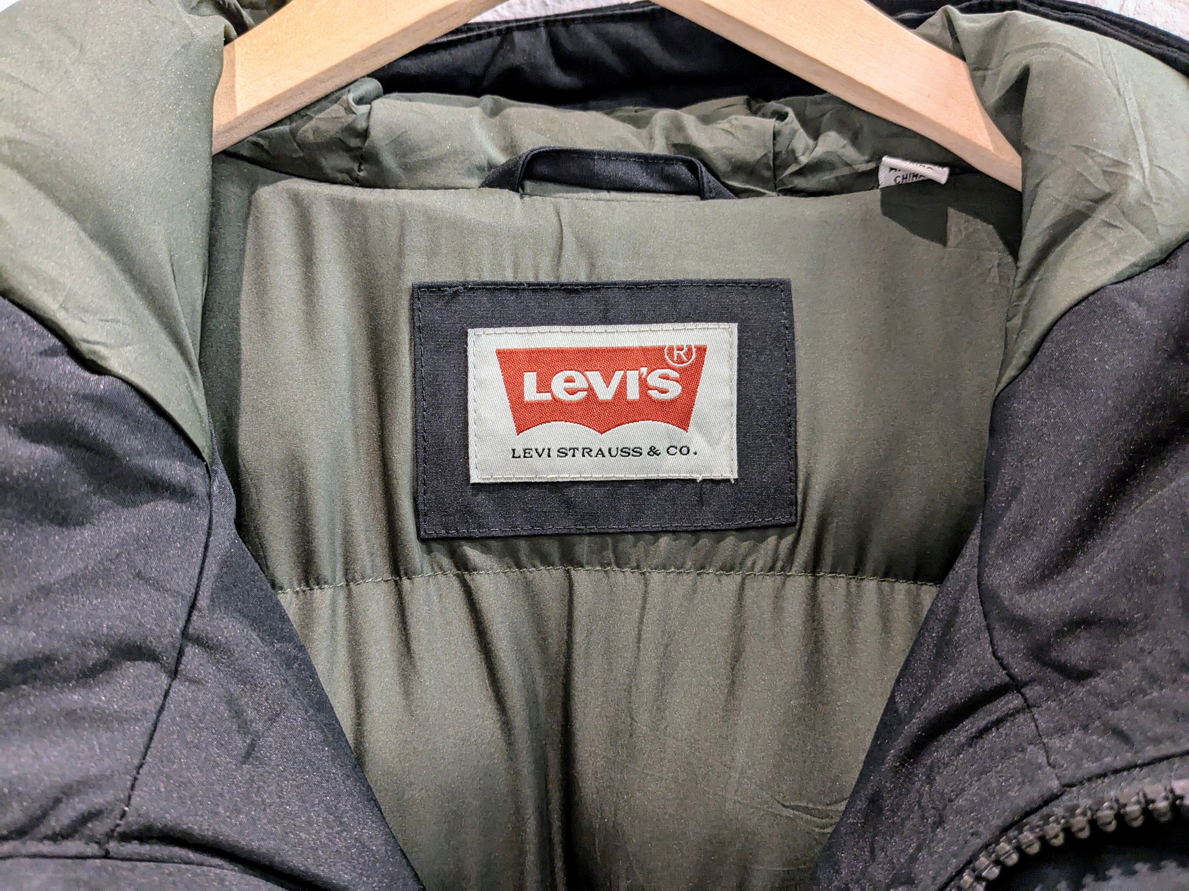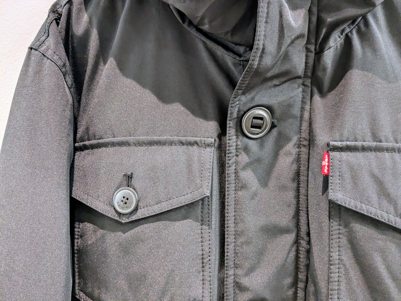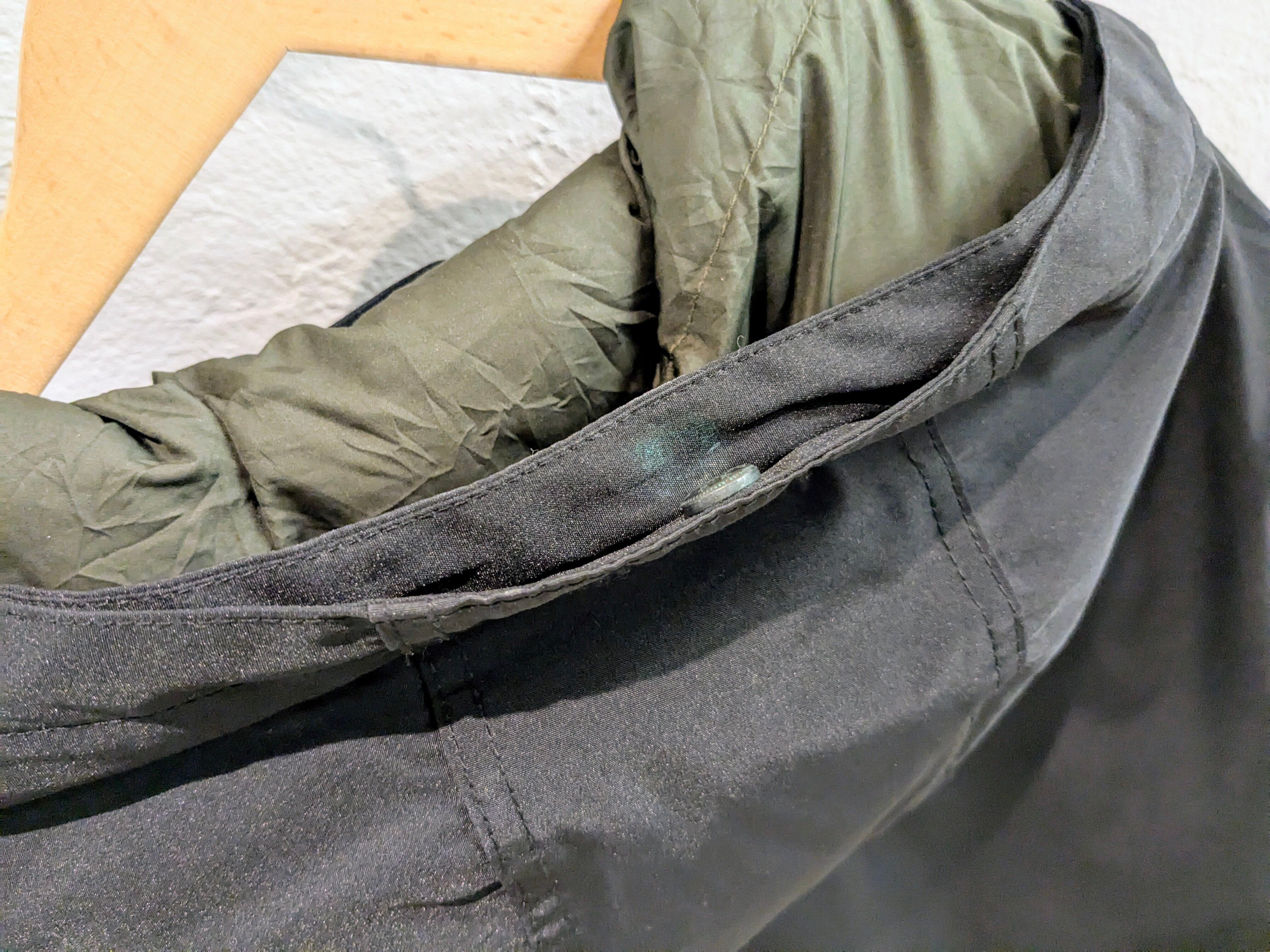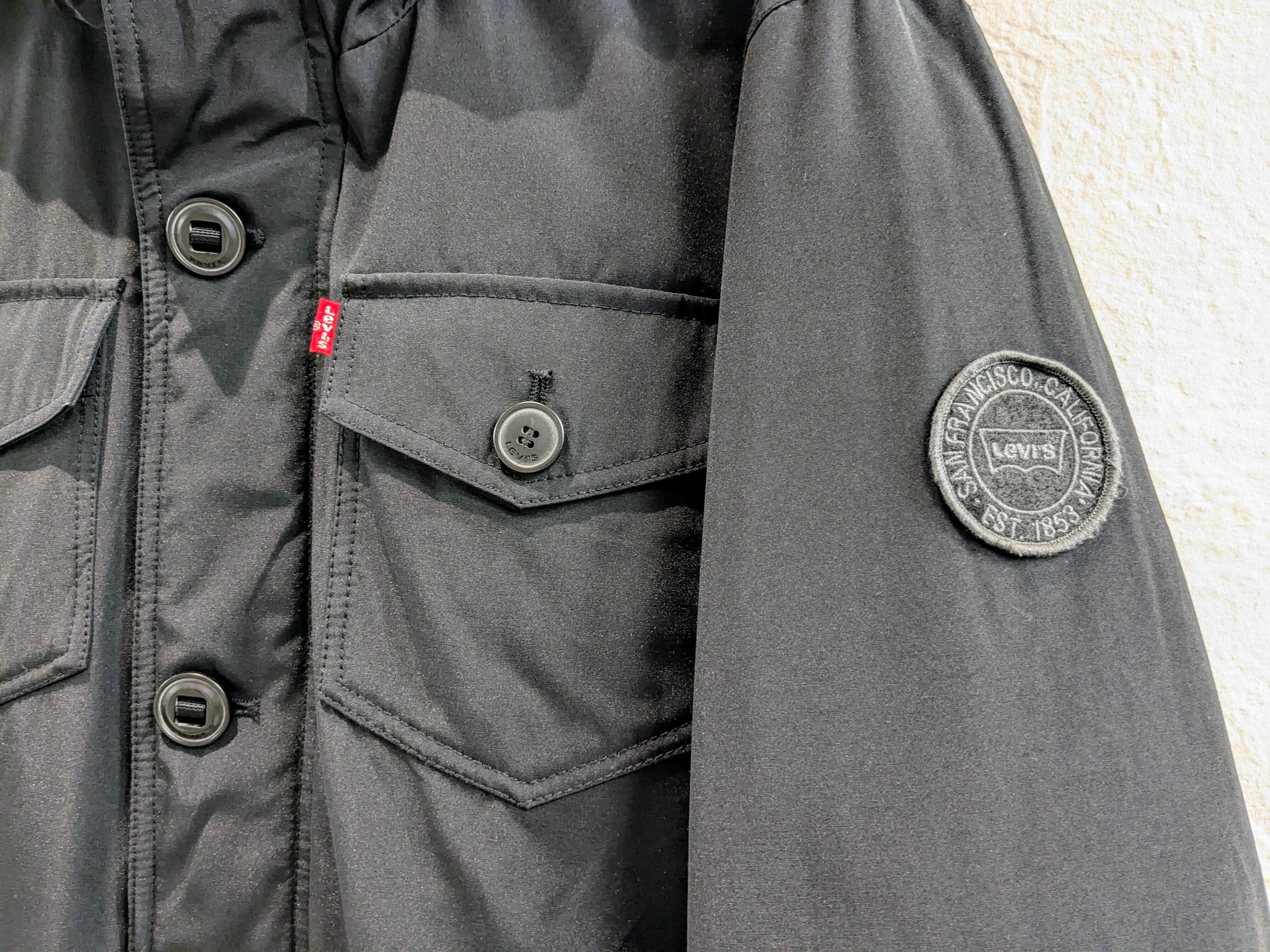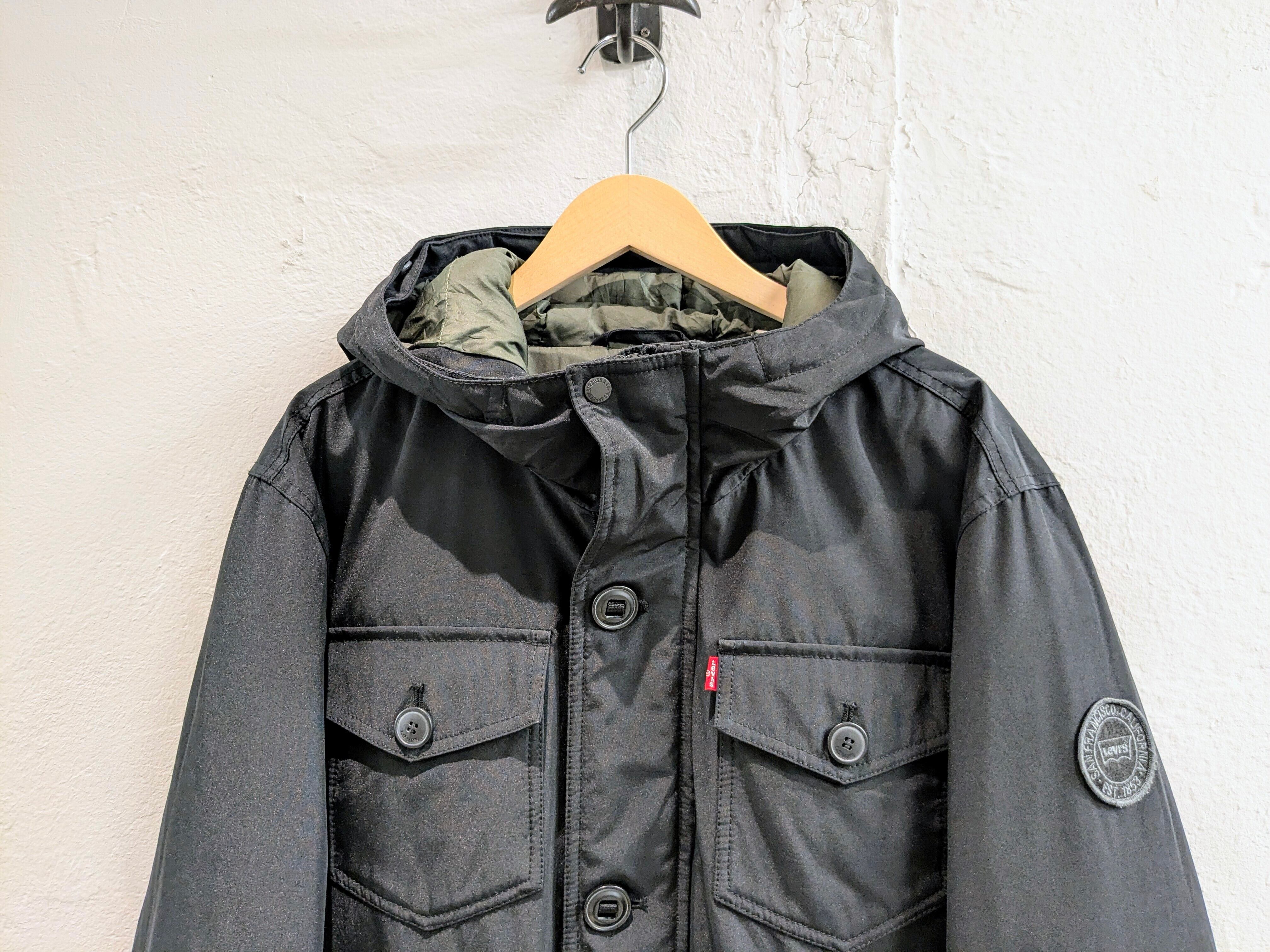 形はもはやカナダグースのジャスパーパーカーそのもの。ワッペン、パラシュートボタンなどもそっくりなデザイン。袖口も隠しリブがあり、防寒性にも優れています。内側にはドローコードが付いており、シルエット調整も可能となります。この見た目でリーバイスというのが個人的にはそそられて、買付に至りました。中綿のほうがフェザーが飛び出さなくていいなど利点もあります。中綿もパンパンなので保温性などはしっかりとあります。表地は、60/40クロスまでいかないですが、ポリ、コットンで水、雪などにも強く対応しています。フードの内側にボタンがあります。おそらく、付属でファーなどがあったものかと、そちらは欠損しています。