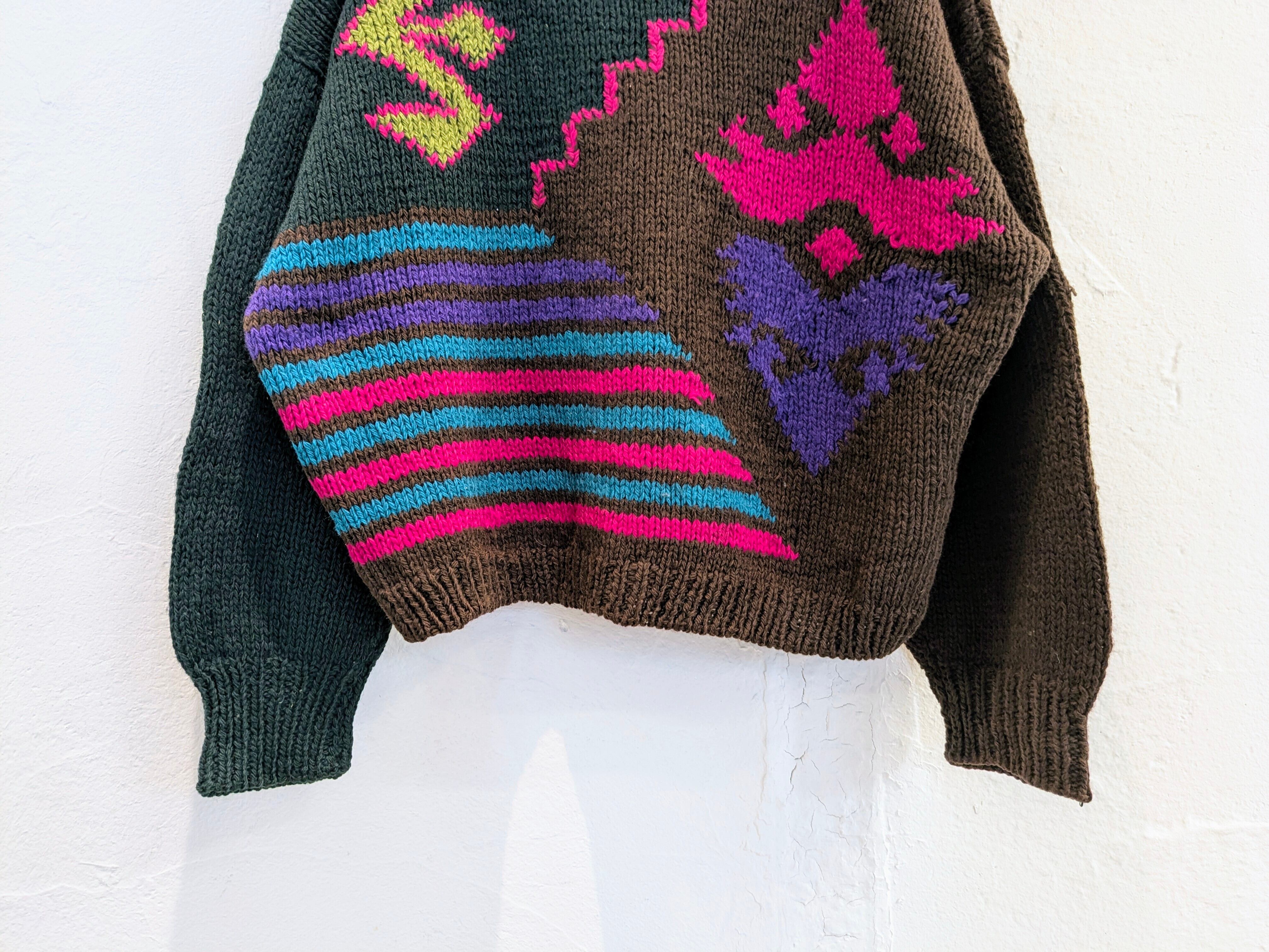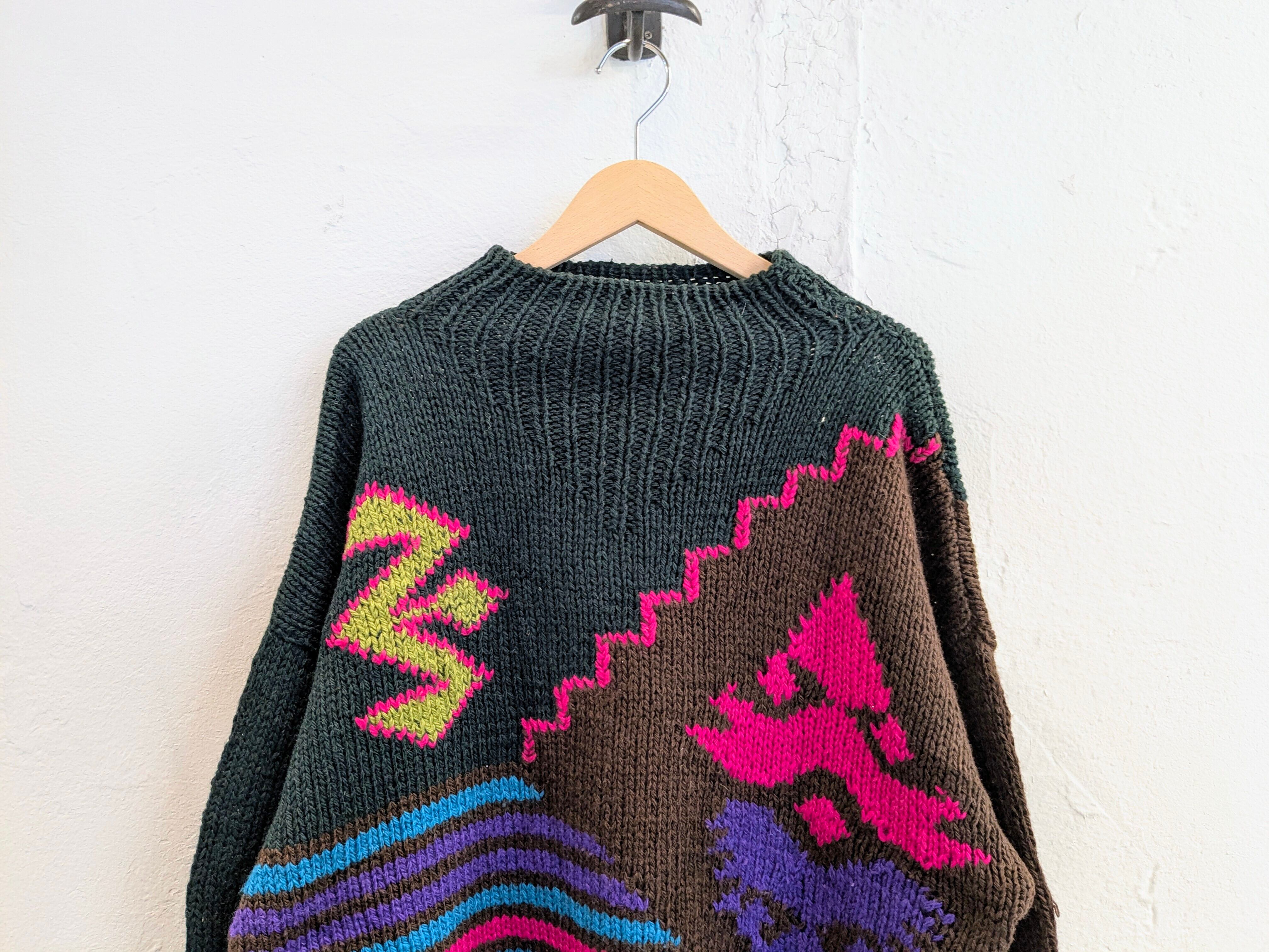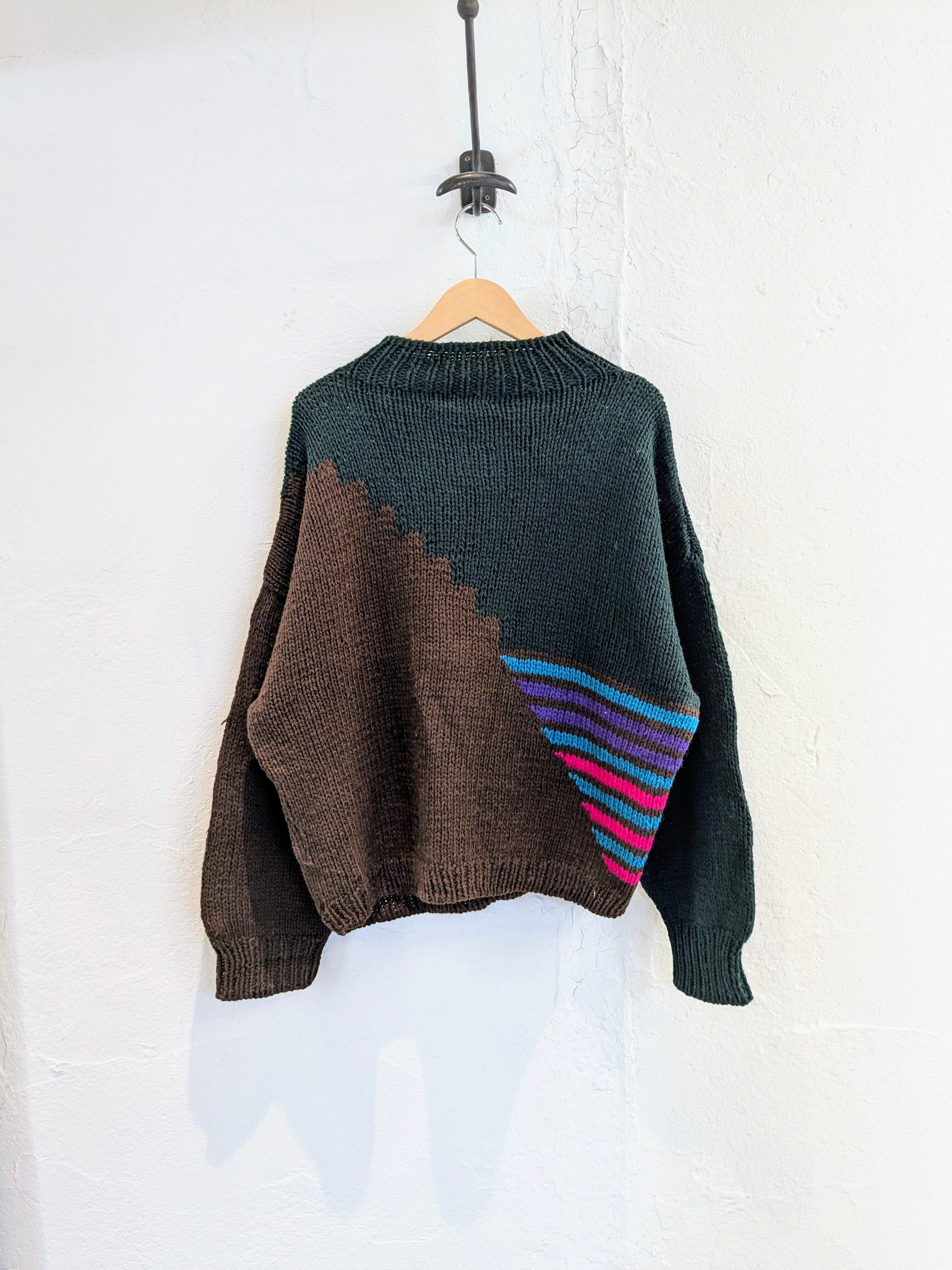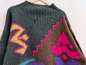 半々で色が変わっていたり、幾何学柄のようになっていたりと説明が難しいデザインとなっています。イタリアのニットは色が綺麗なのが特徴で、こちらも発色のいい色が使われています。形も、ショート、ワイドでのシルエットが綺麗なのと、肩が落ちるようになっていたりと、あまり見ないかと。レイヤードも楽しめたりするので、スタイリングの幅が広がる一着。