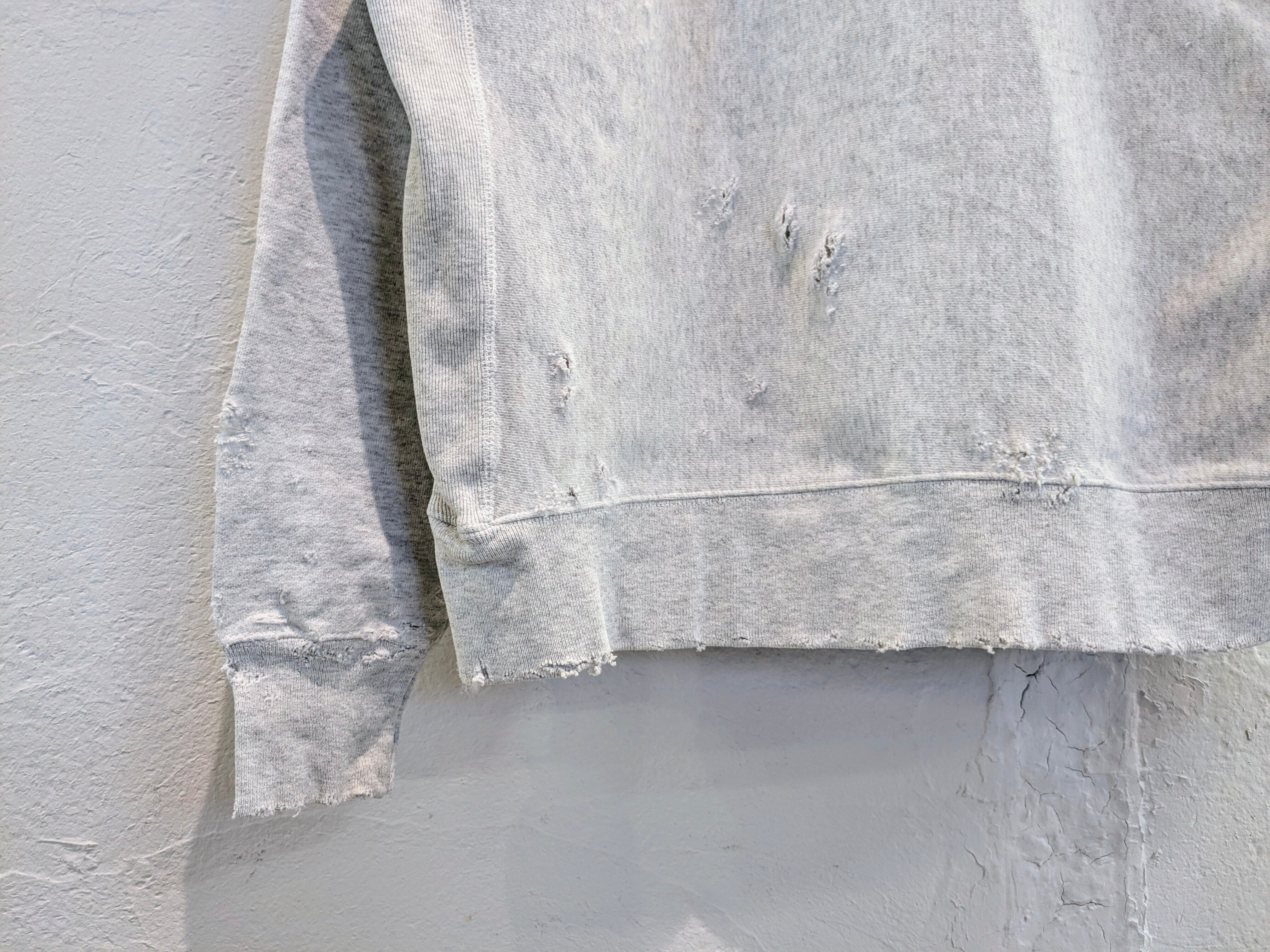 かなりハードめにダメージが入ったアイテム。裏毛なので、春先もトップスとして活躍してくれる生地感。サイズもゆったり着れるサイズ感。ダメージのところからイエロー、オレンジなど色味のあるのものをみせてもいい感じになるかと思います。
