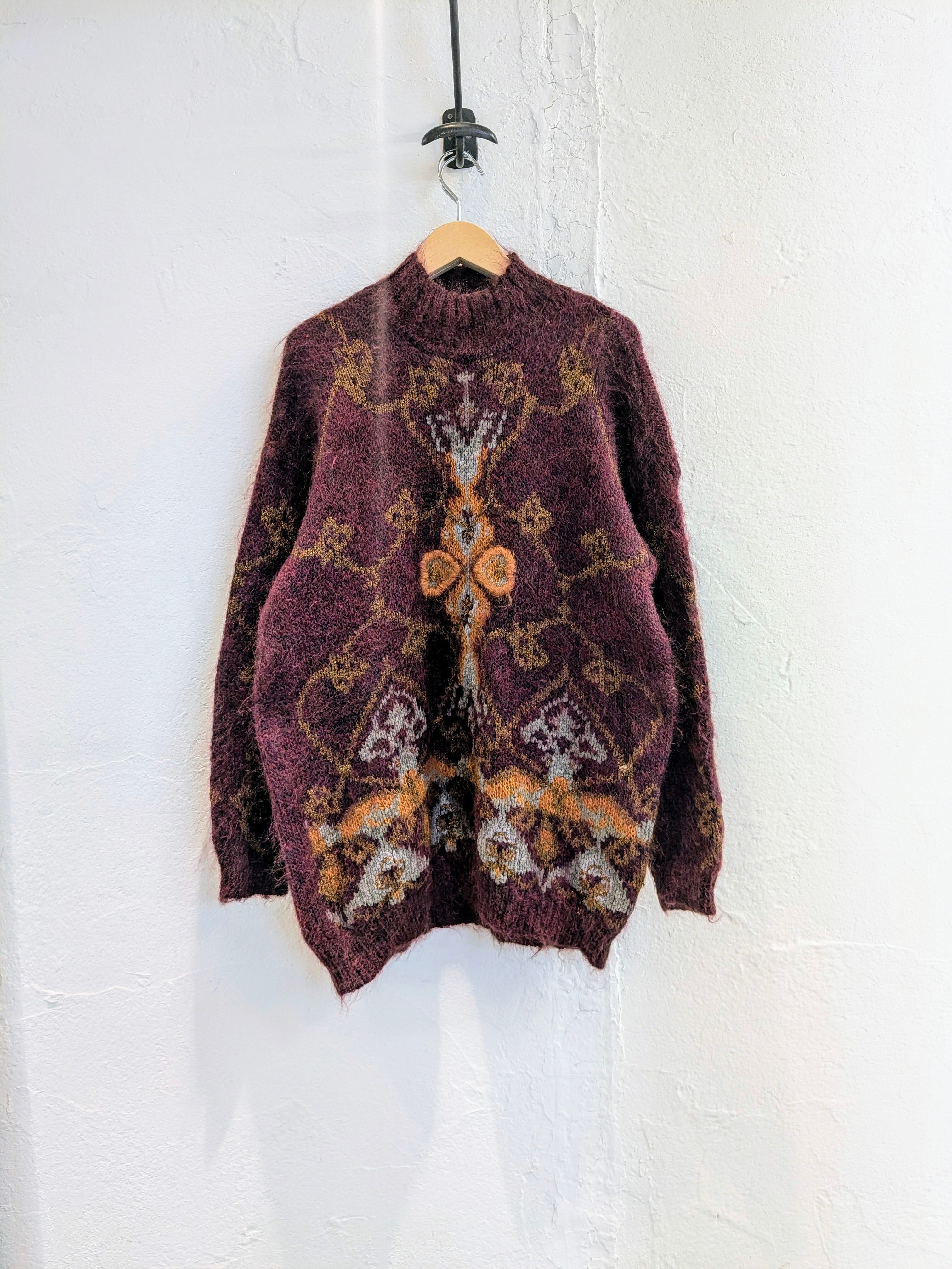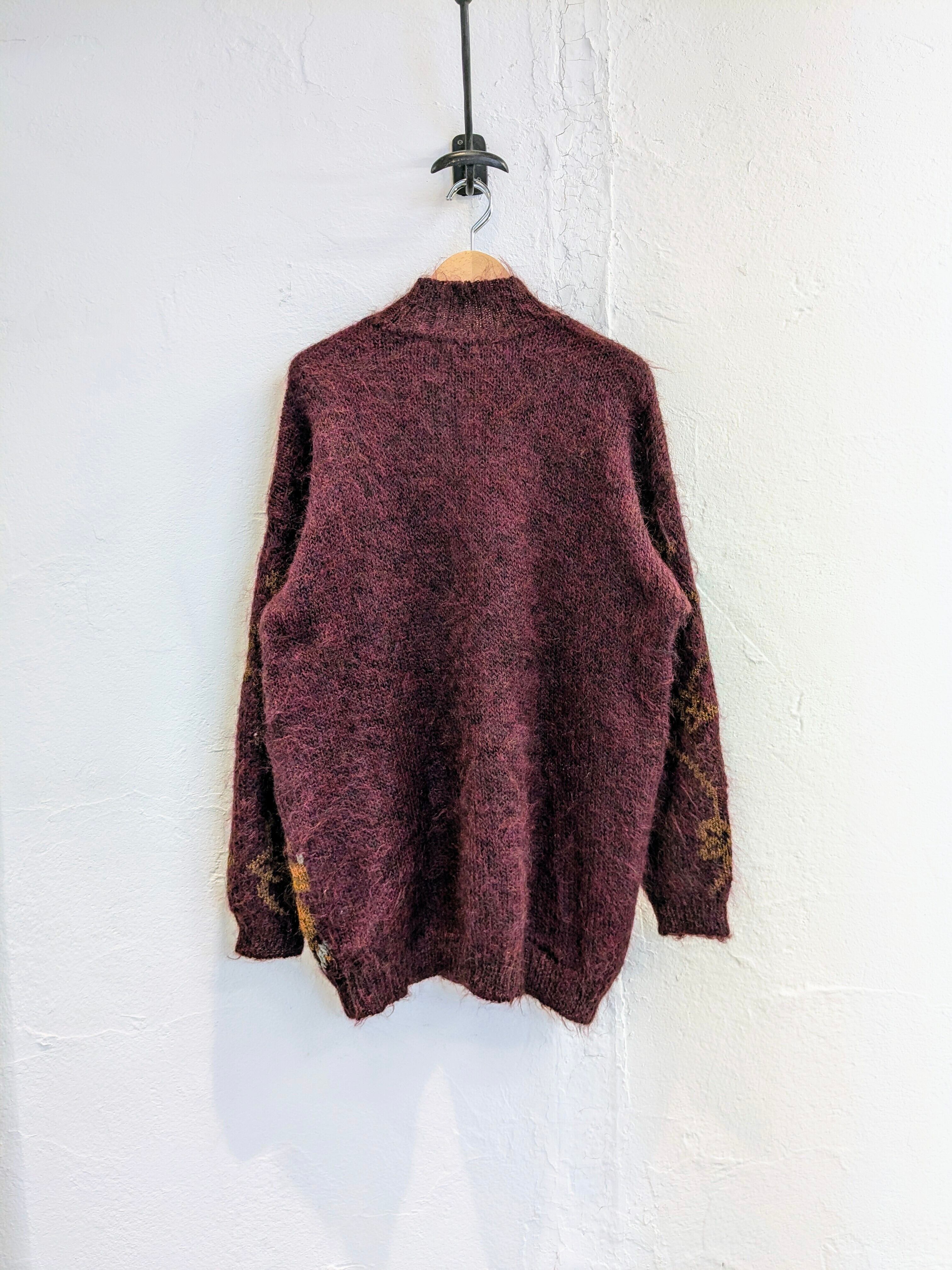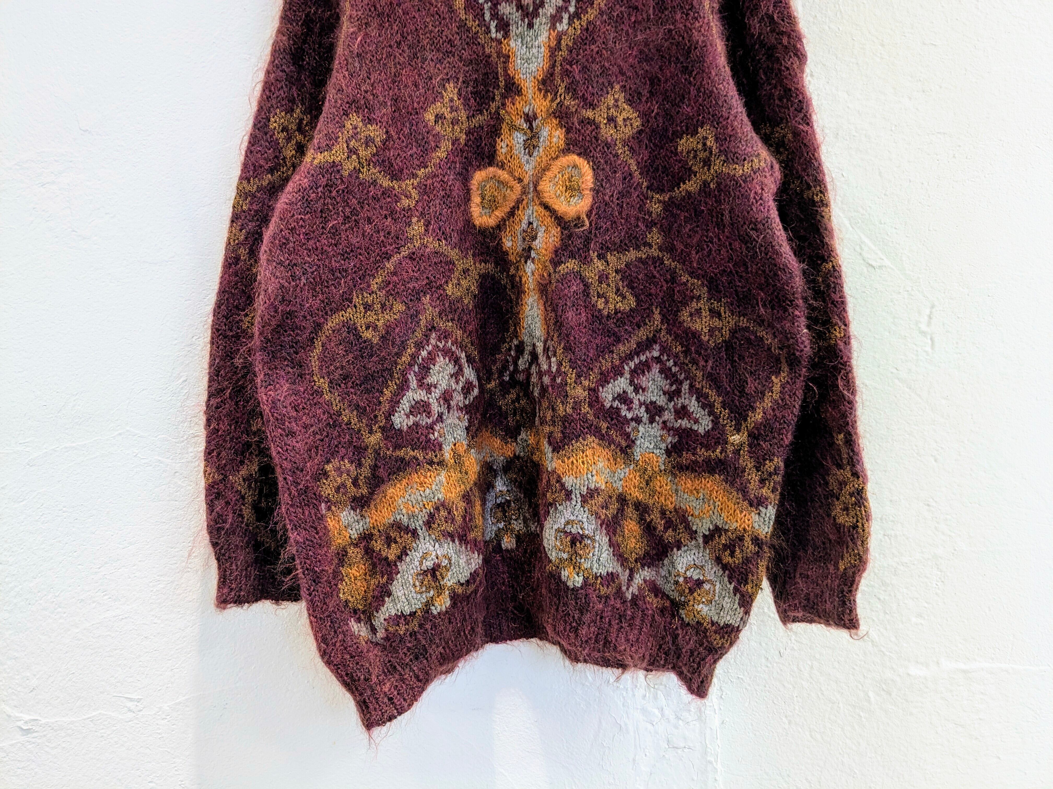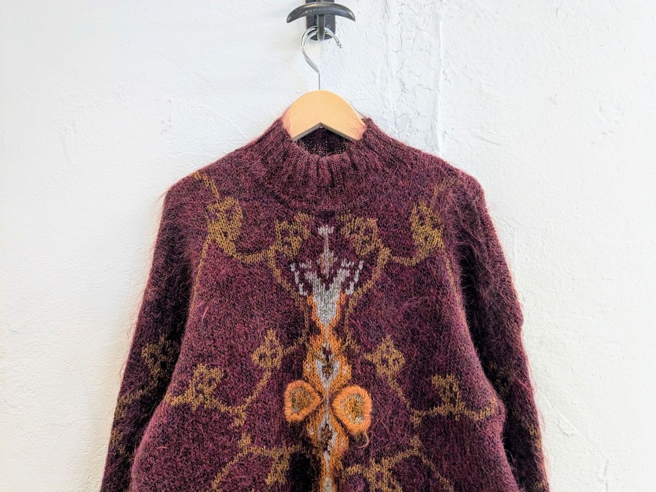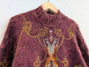 何柄と表現していいのか分かりませんが、四つ葉のクローバーみたいのもありつつ、エスニックっぽい雰囲気もあるデザイン。金糸での刺繍もあり、光沢のあるデザインもポイント。モヘアで毛足が長く、軽くて暖かい。インナー、トップスどちらでも活躍してくれます。