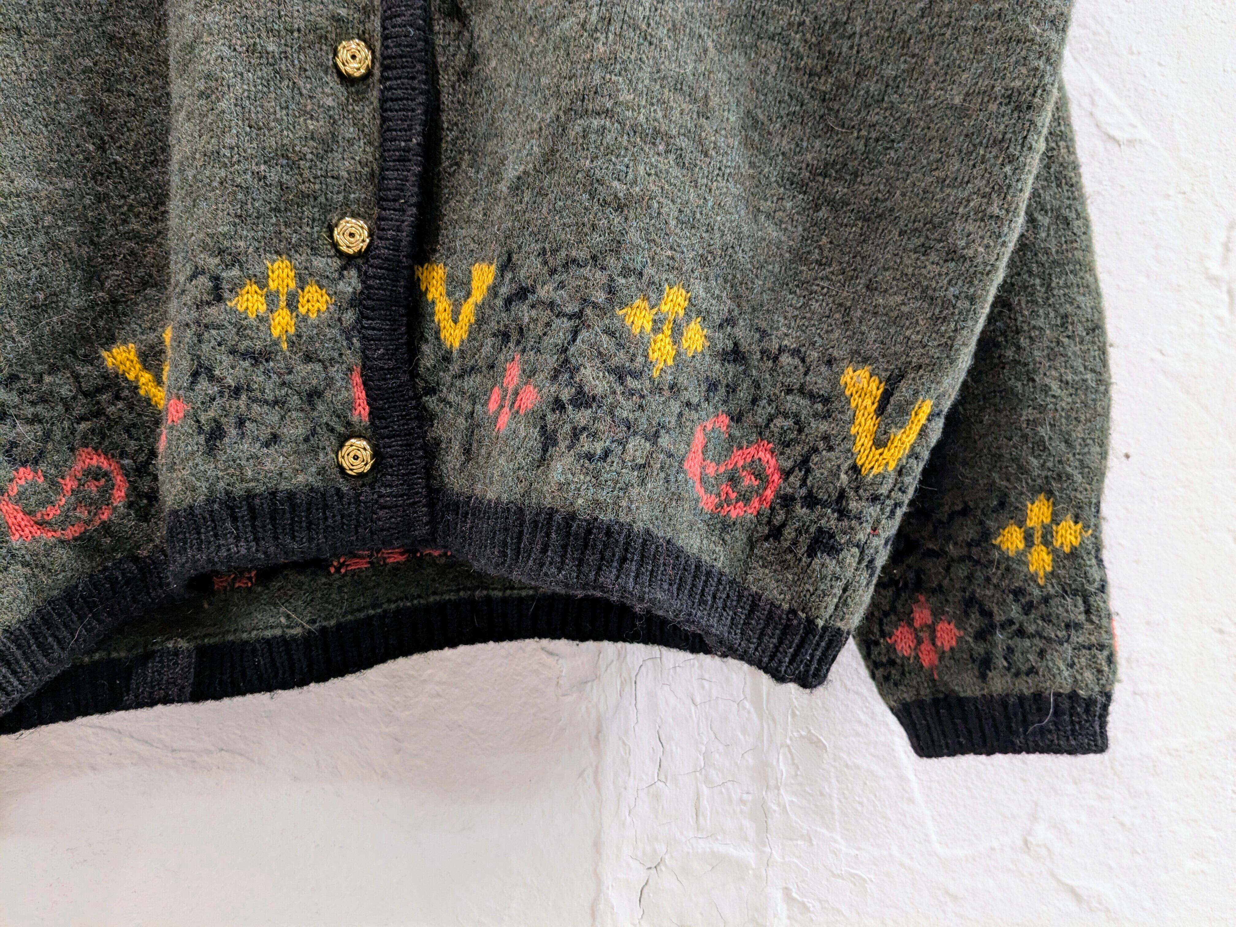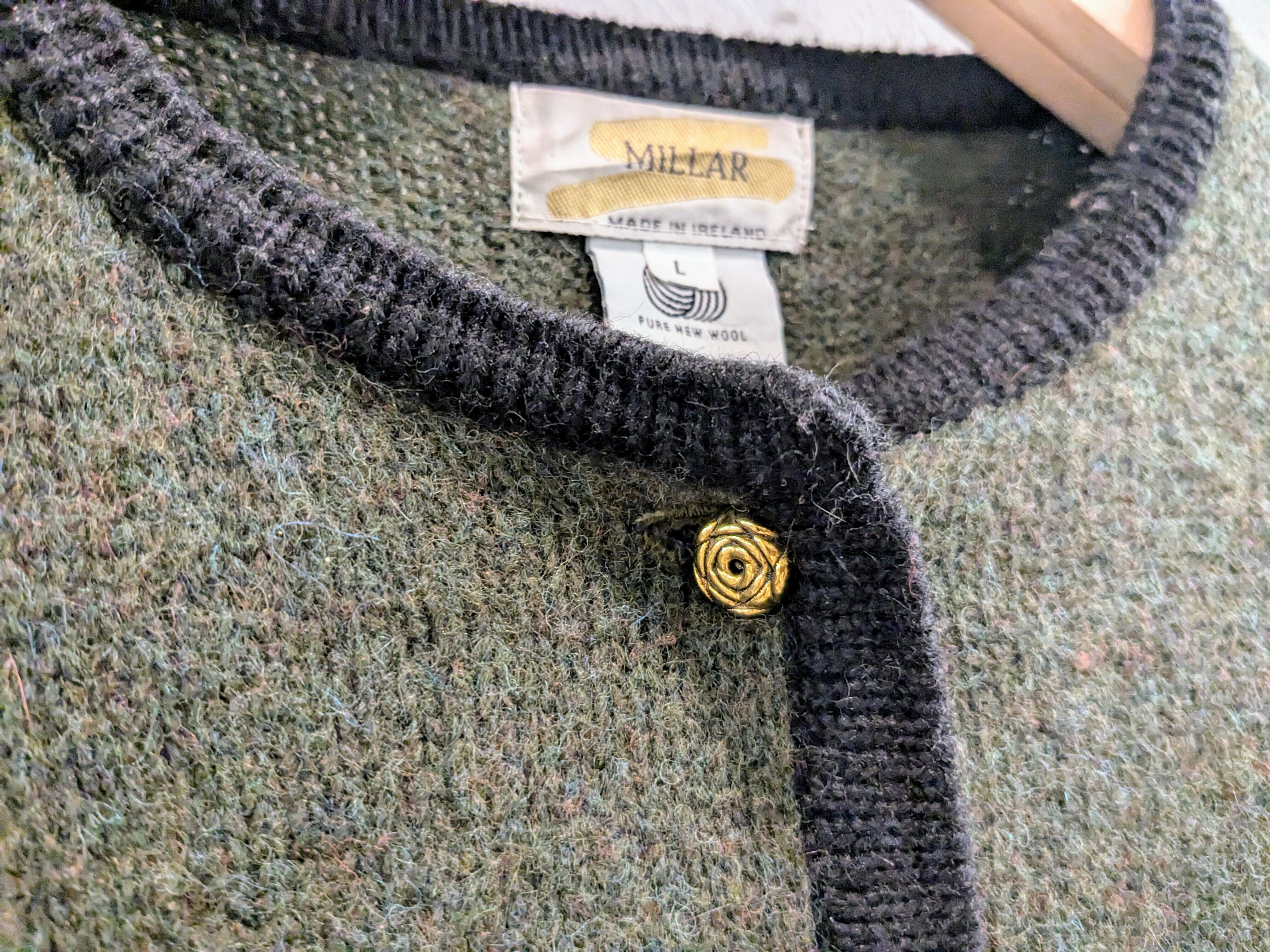 裾、袖に刺繍デザインが入っています。ボタンはバラ?ような花の形をしたものを使用しており、細部までこだわりのあるアイテムとなっています。ボディ自体も、単色ではなくメランジになっており、多色使いをしていることで、角度、光の当たり加減で見える色合いが変わるようになっています。