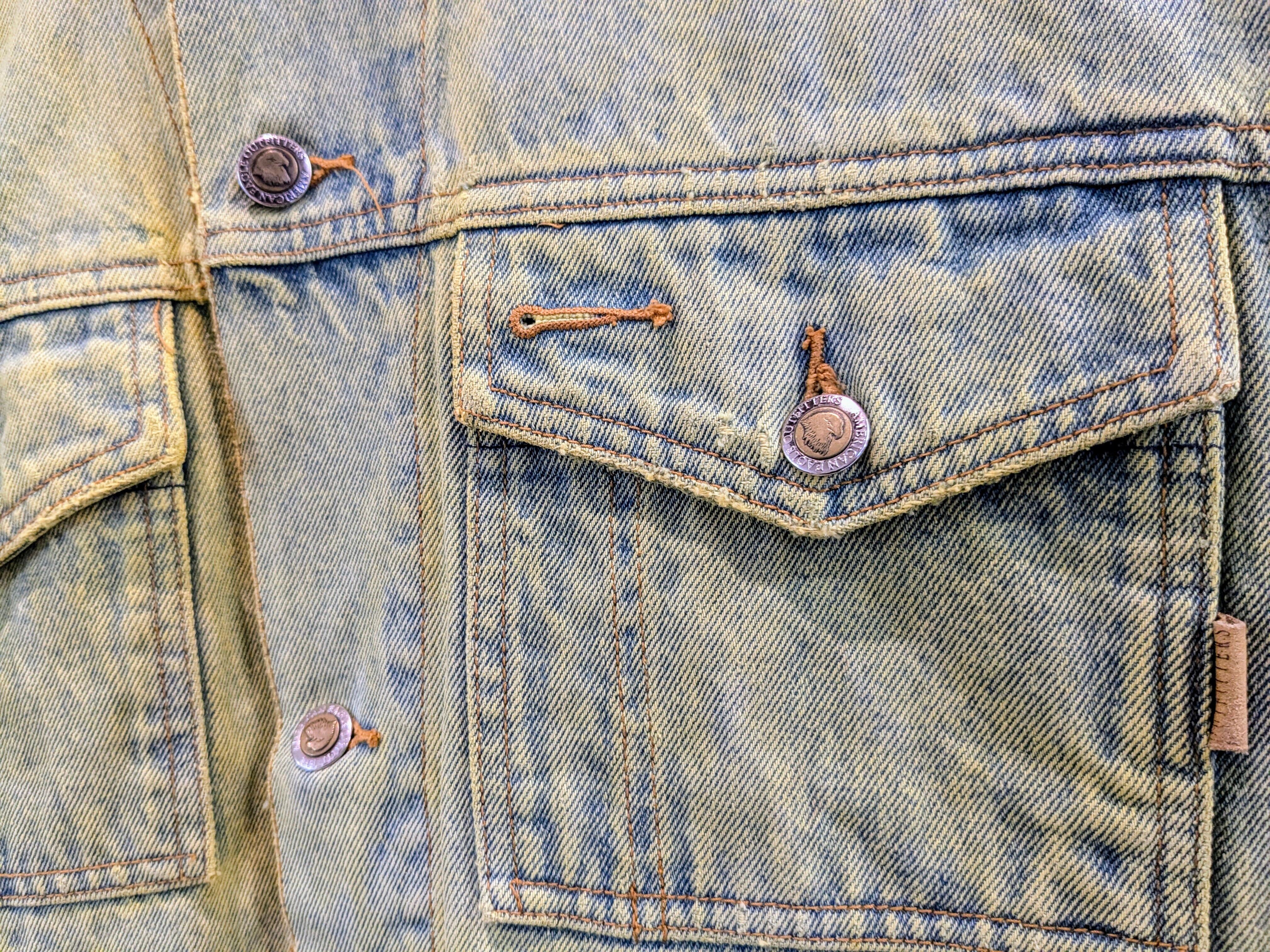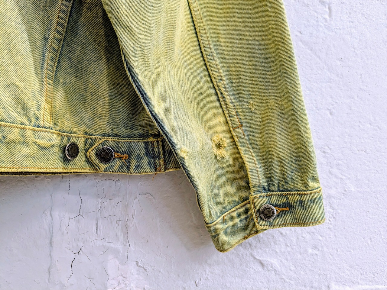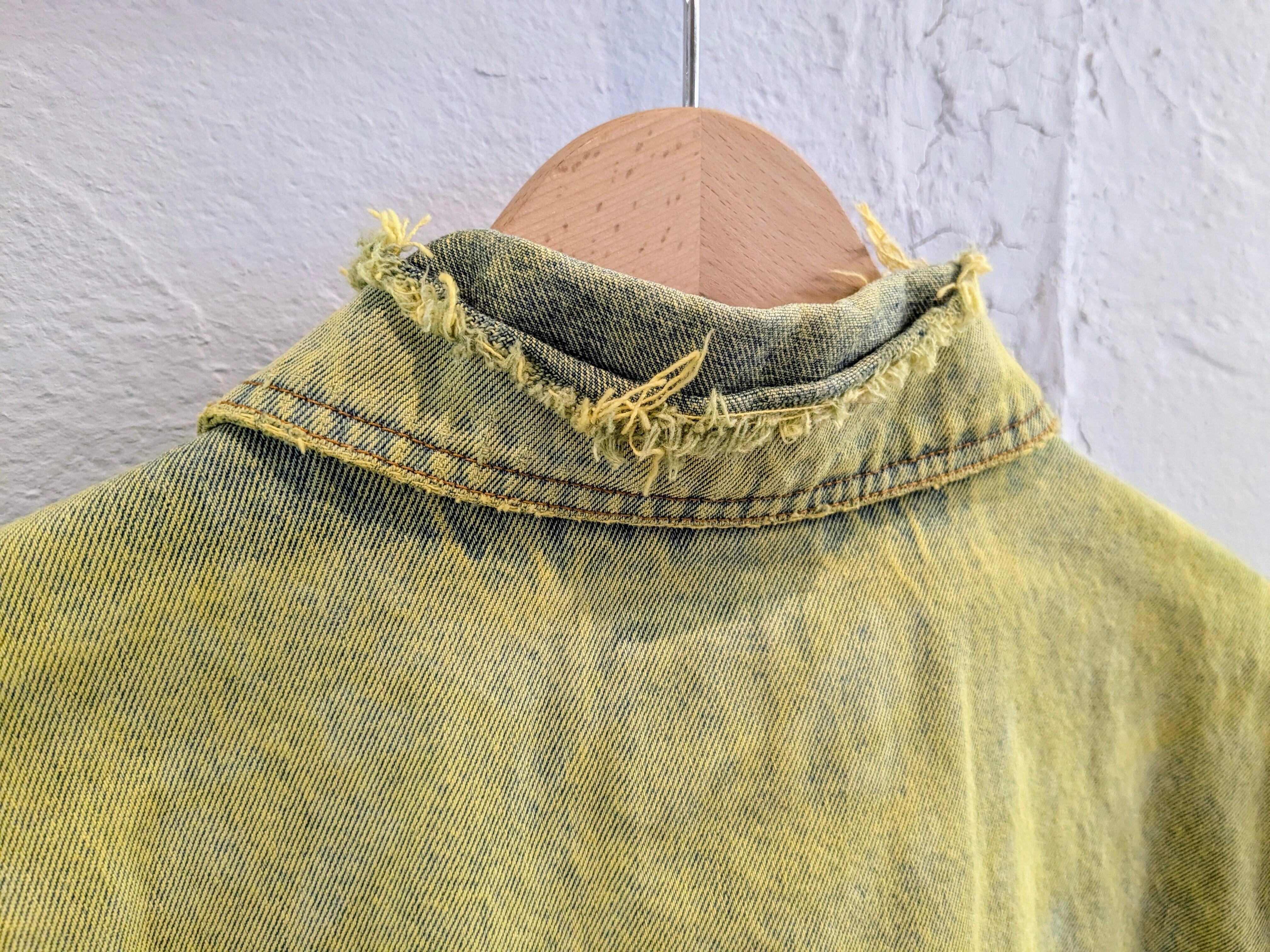 色が入りやすいように一度色を抜き、そこから染色をしてもらっています。ダメージなどは元々の個体のものになります。そのダメージの感じもまた雰囲気があり良い感じです。個体差もそうですが、色の出方など全て変わってしまうので全て1点物となっています。古着などで探すとなかなか出てこないかと。