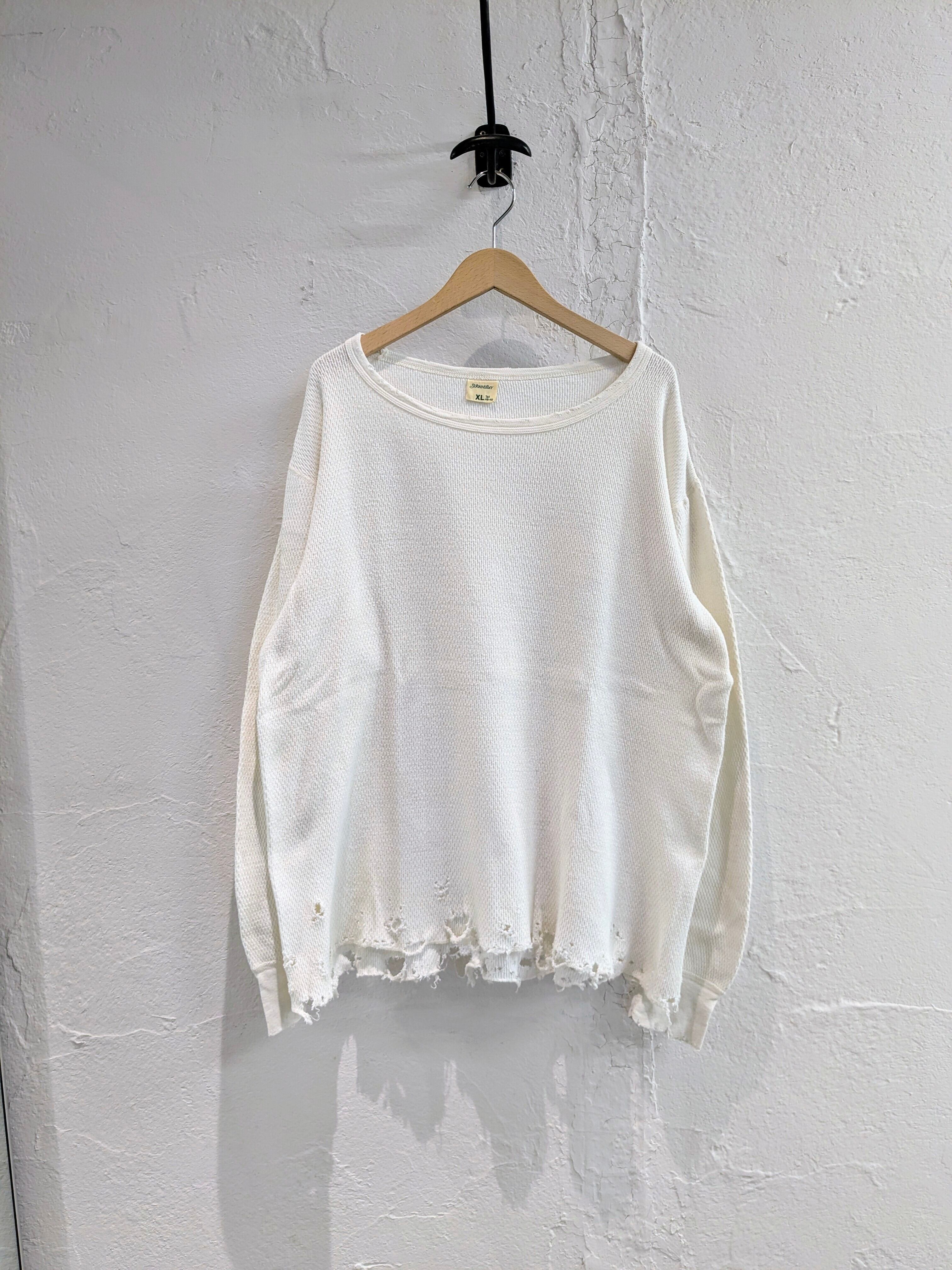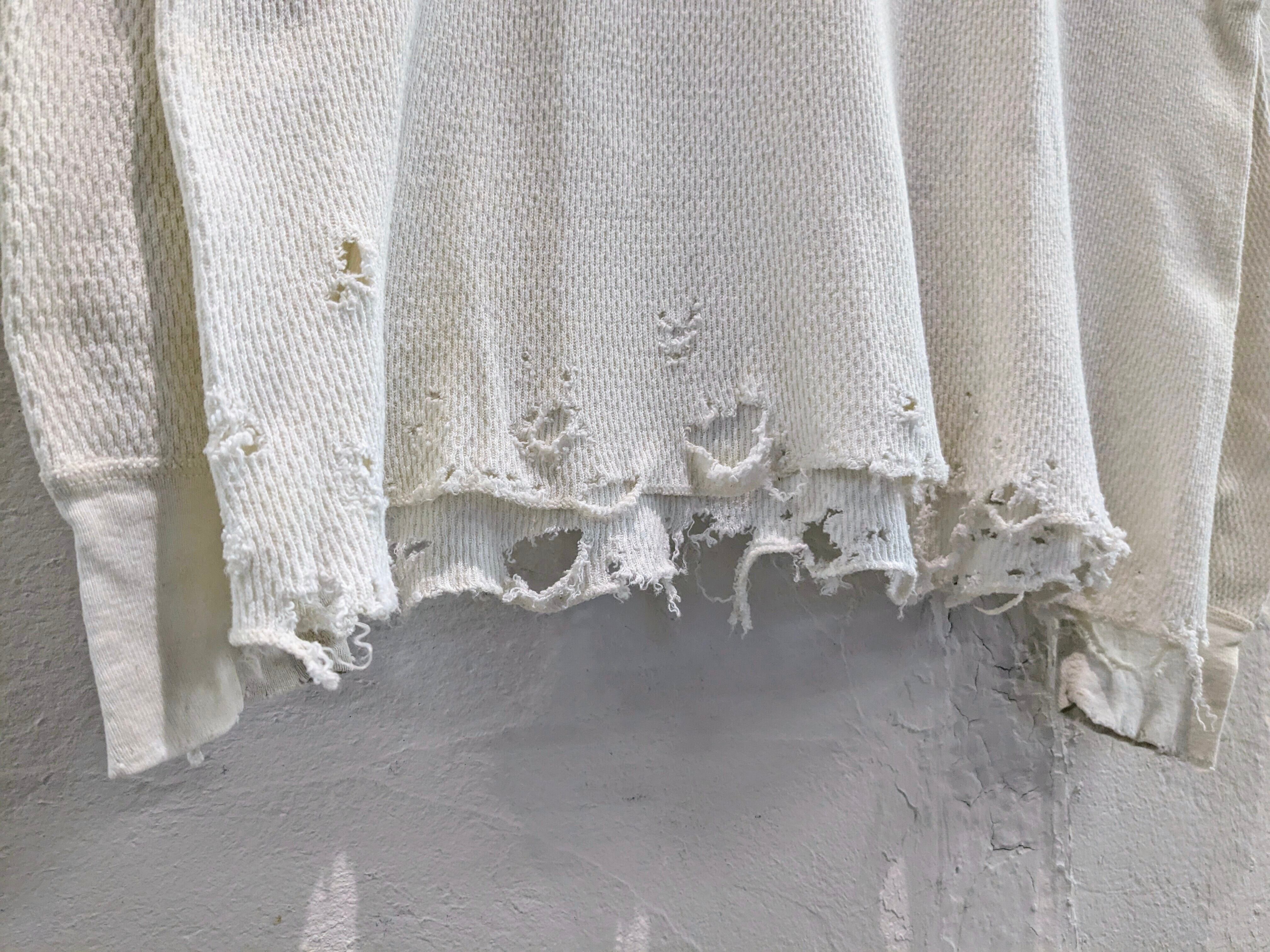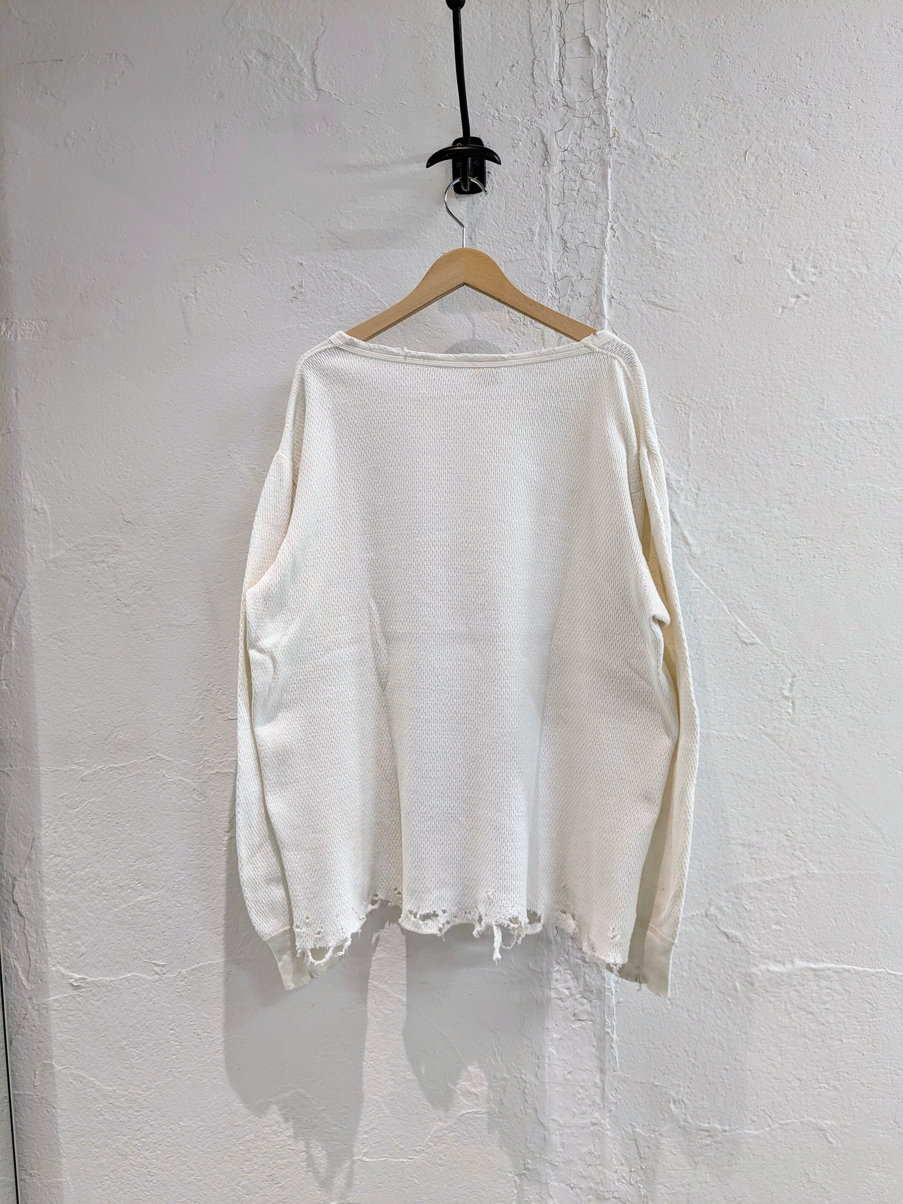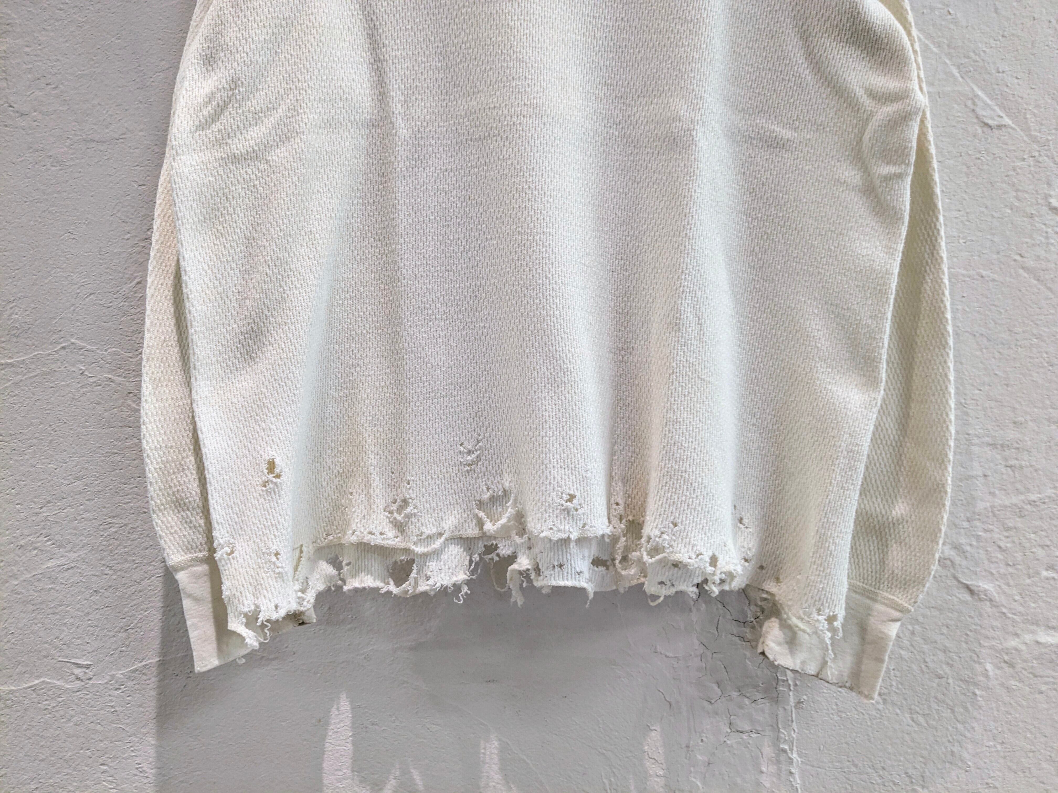 レイヤードに使いたいという希望から作ってもらったシリーズ。シャツ、ニット、ブルゾンなどの裾からダメージの部分画見えるように使いたいと個人的には思っていますが、生地がしっかりしているので個体によってはトップスとしても活躍する万能なアイテム。個体差があり、元々の汚れ、ダメージも入っているものもあります。手入れは手洗い推奨。