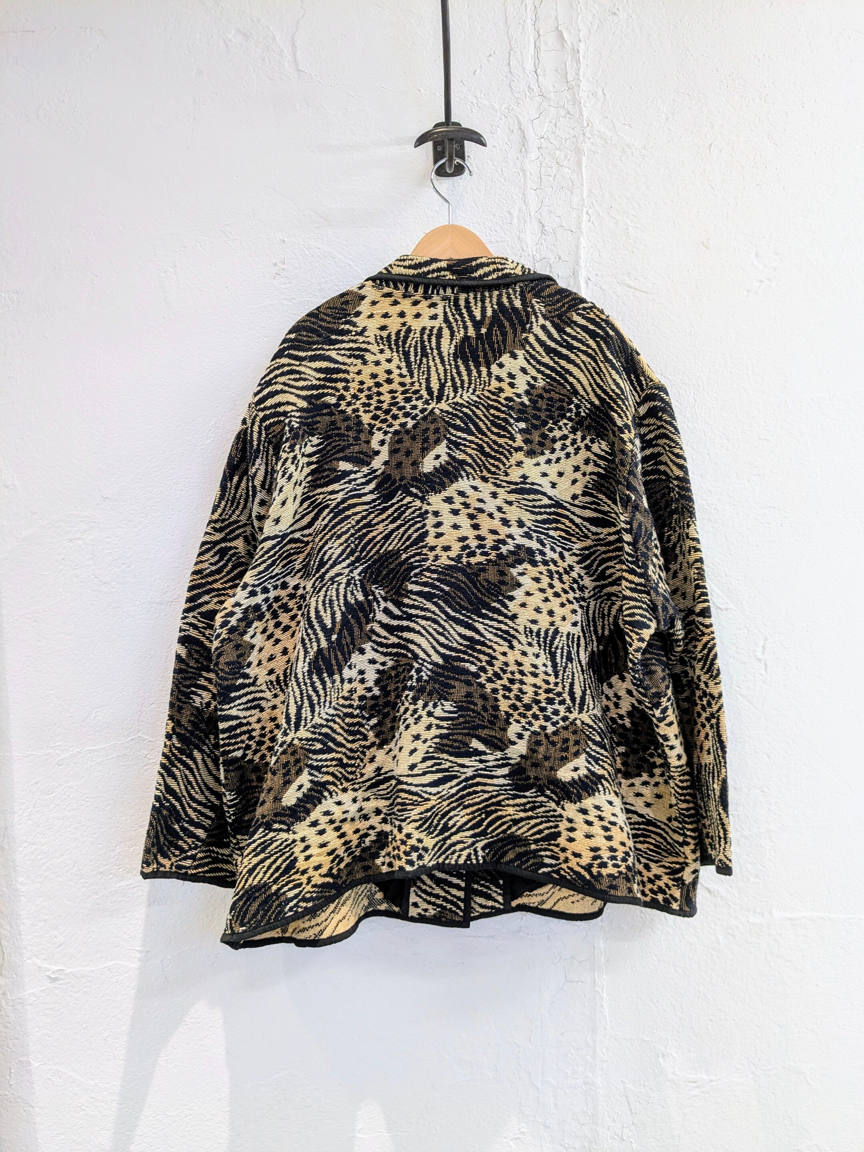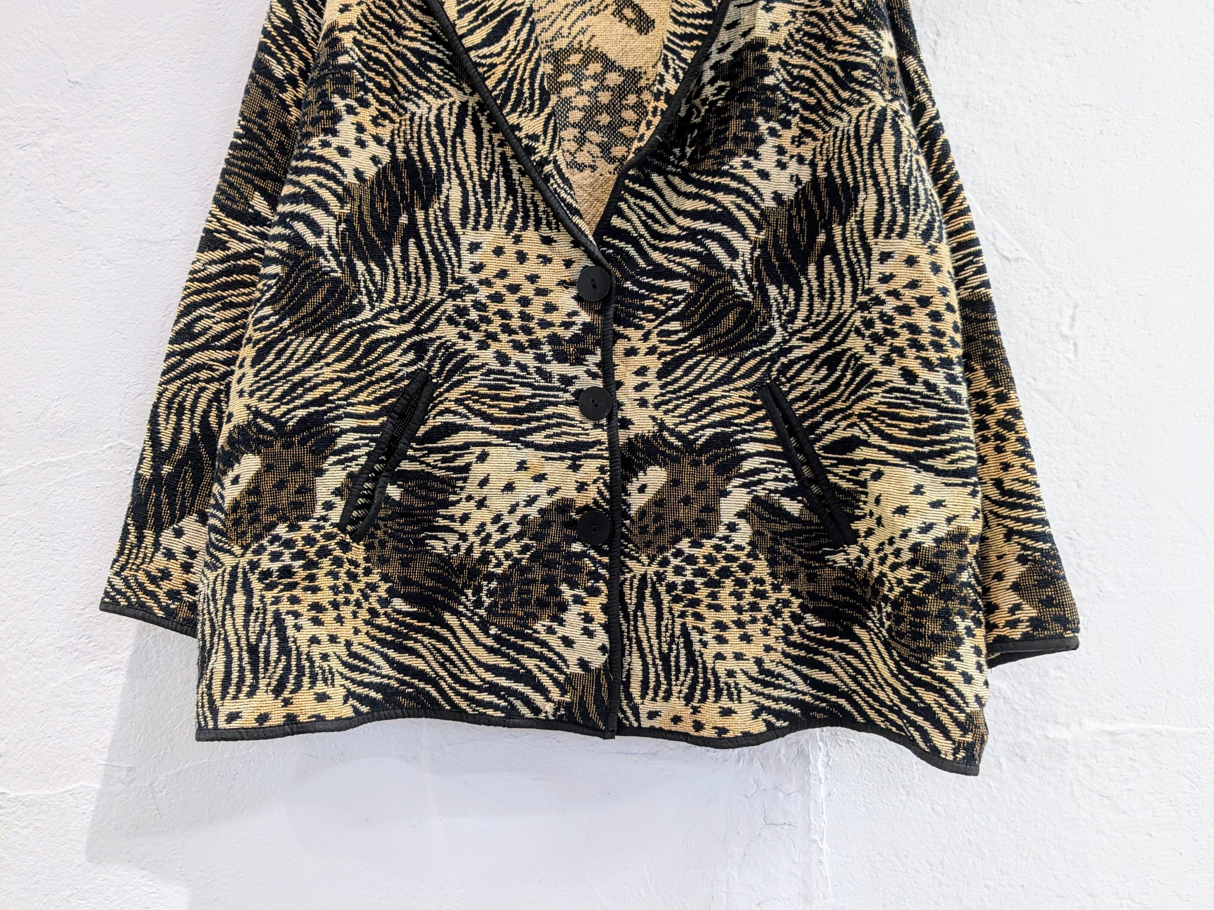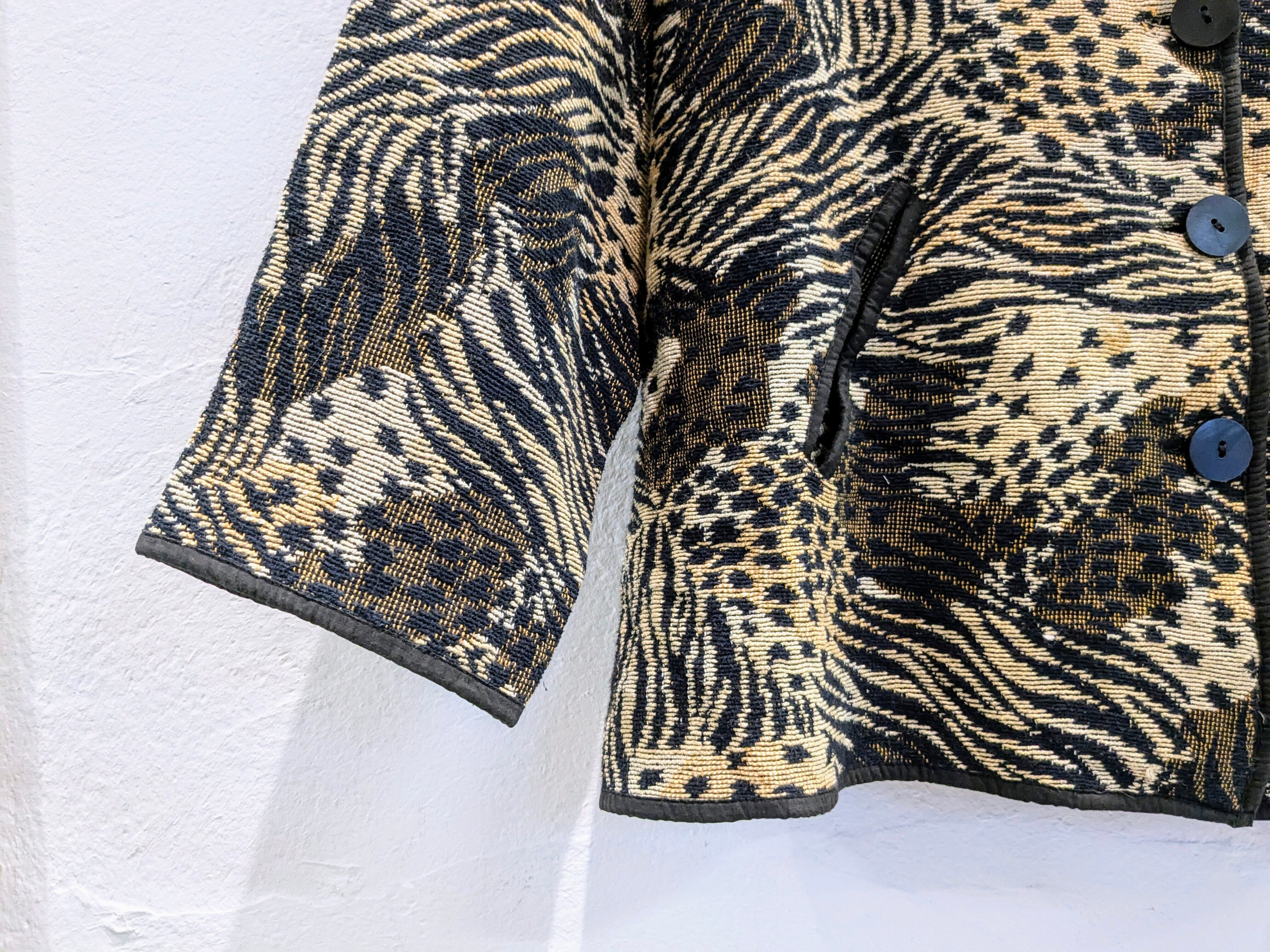 ゼブラ柄であっているのか、、、アニマル柄のゴブランジャケット。部分的にはレオパード柄にも見え、とにかくアニマル感が強いアイテム。裏地なしですが、生地はガシッとしっかりめになっています。短丈、ワイドのシルエットなので、ボトムも選ばず、使いやすい形となります。
