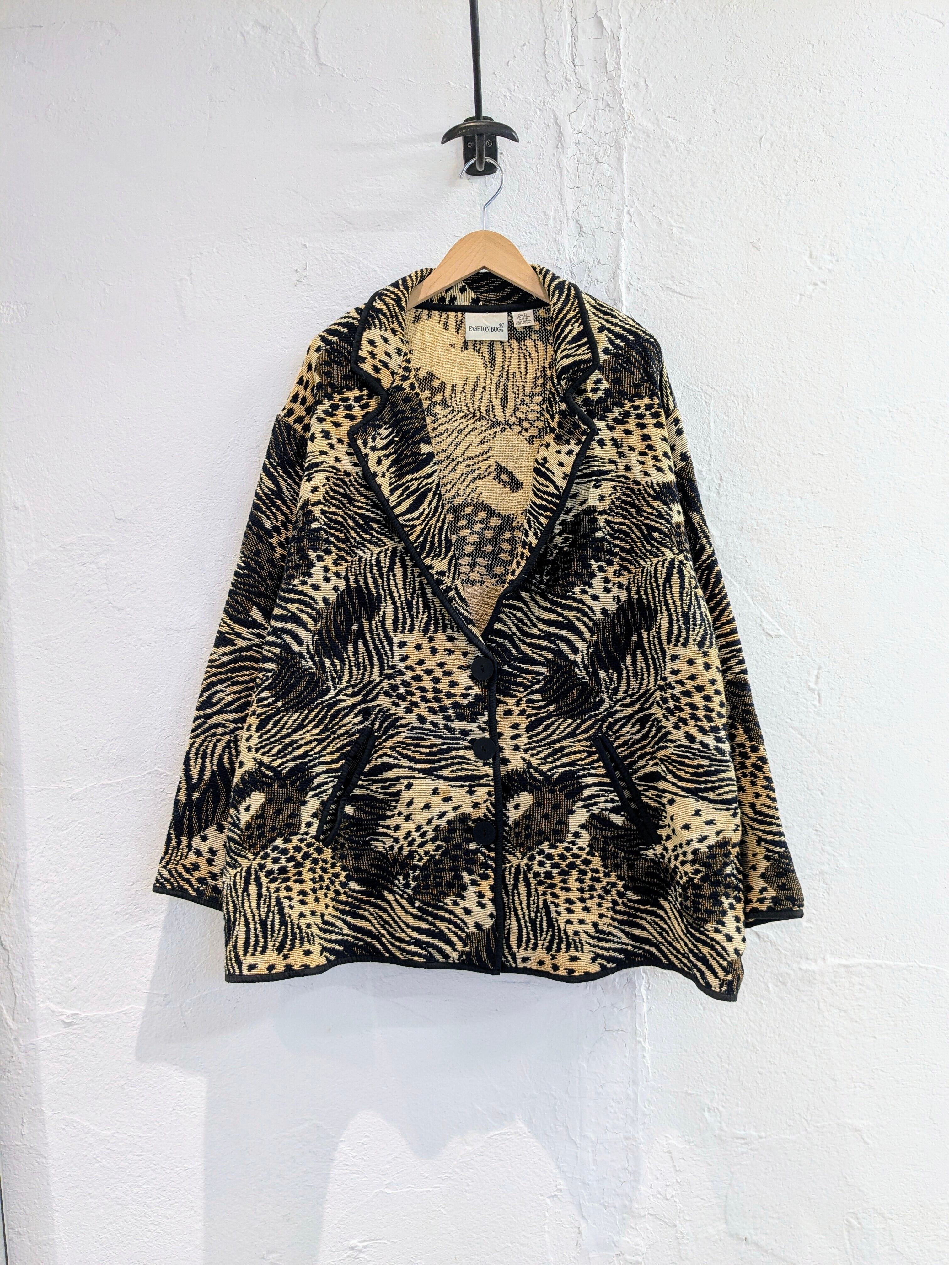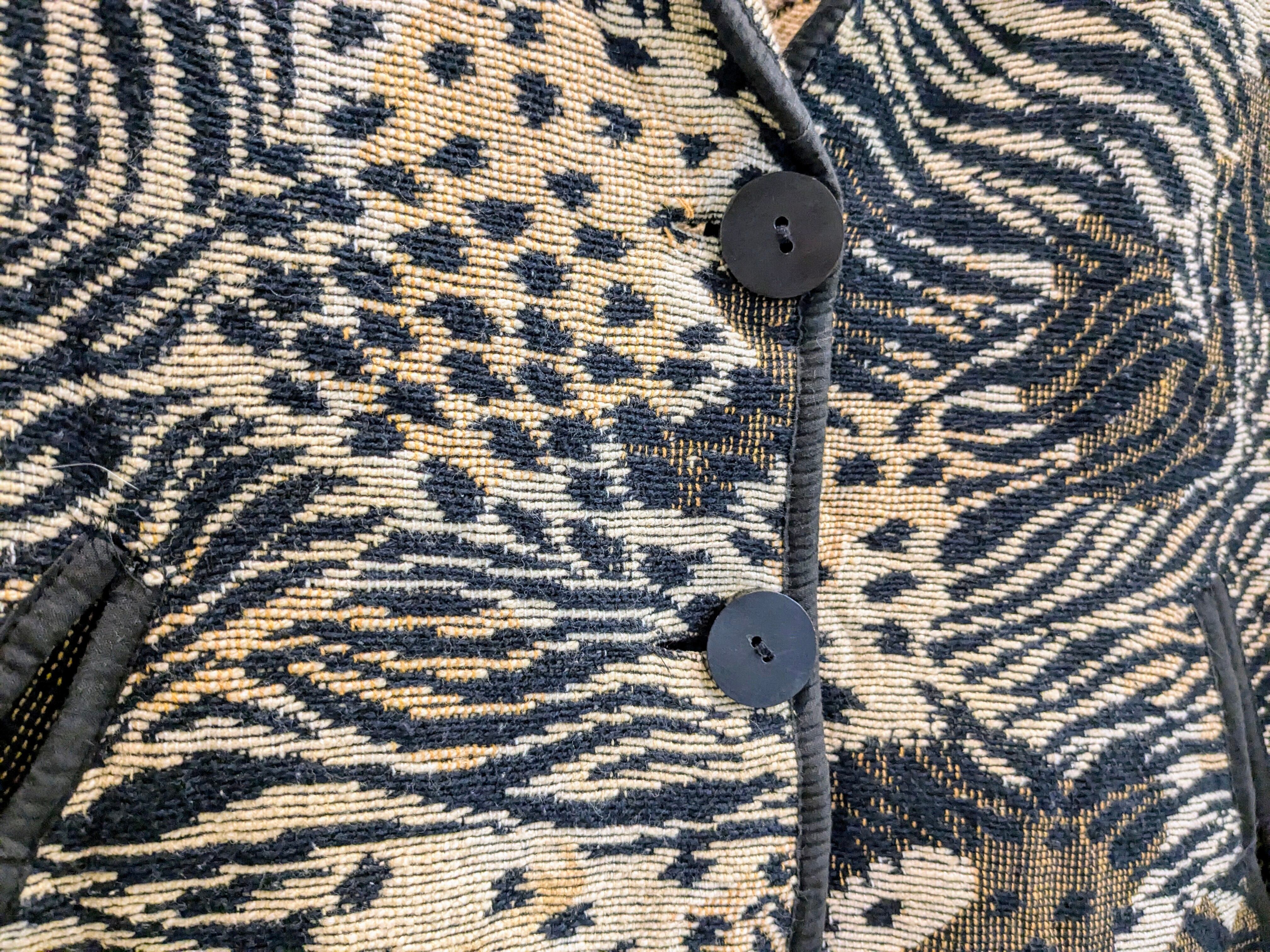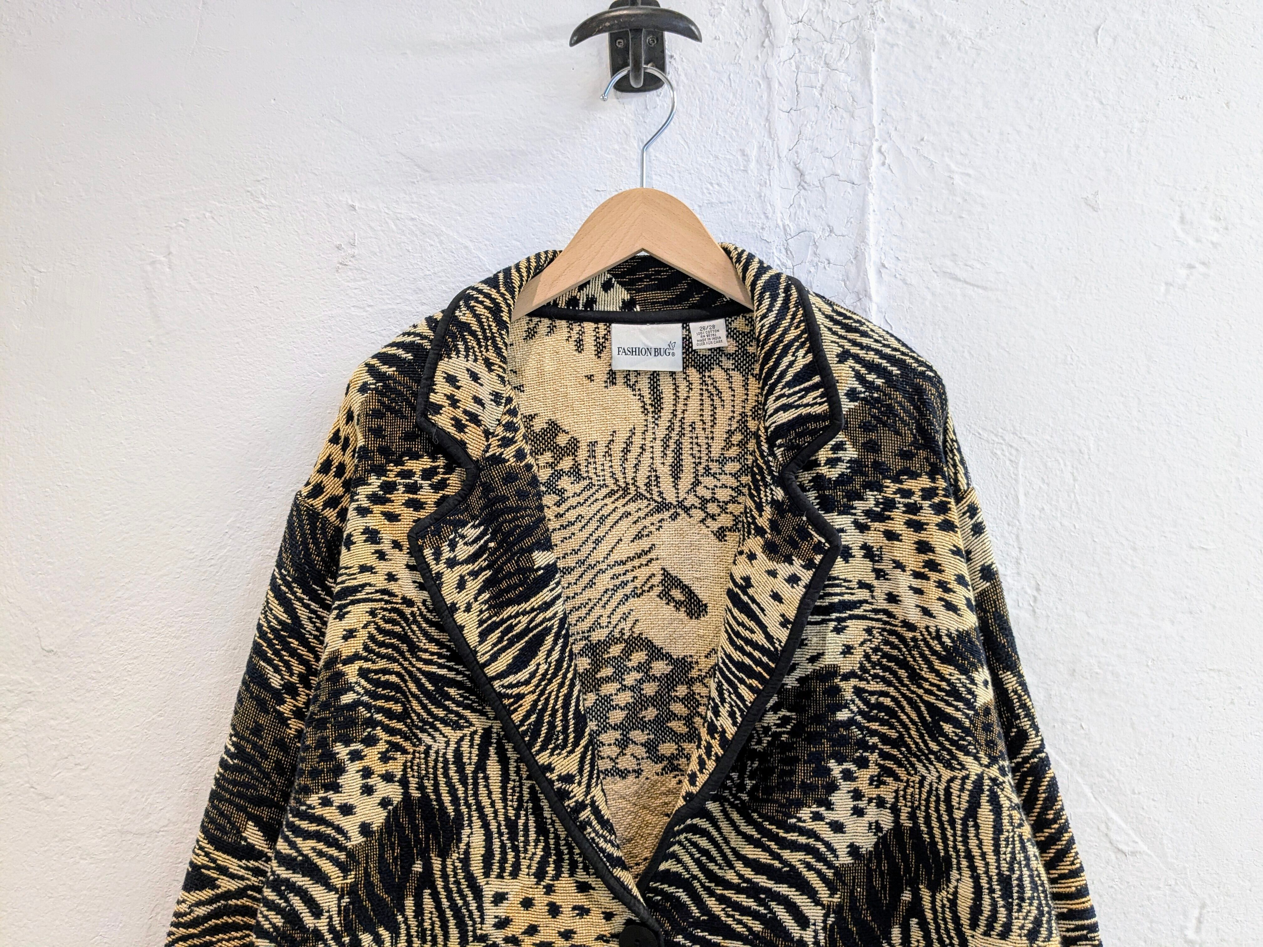 ゼブラ柄であっているのか、、、アニマル柄のゴブランジャケット。部分的にはレオパード柄にも見え、とにかくアニマル感が強いアイテム。裏地なしですが、生地はガシッとしっかりめになっています。短丈、ワイドのシルエットなので、ボトムも選ばず、使いやすい形となります。