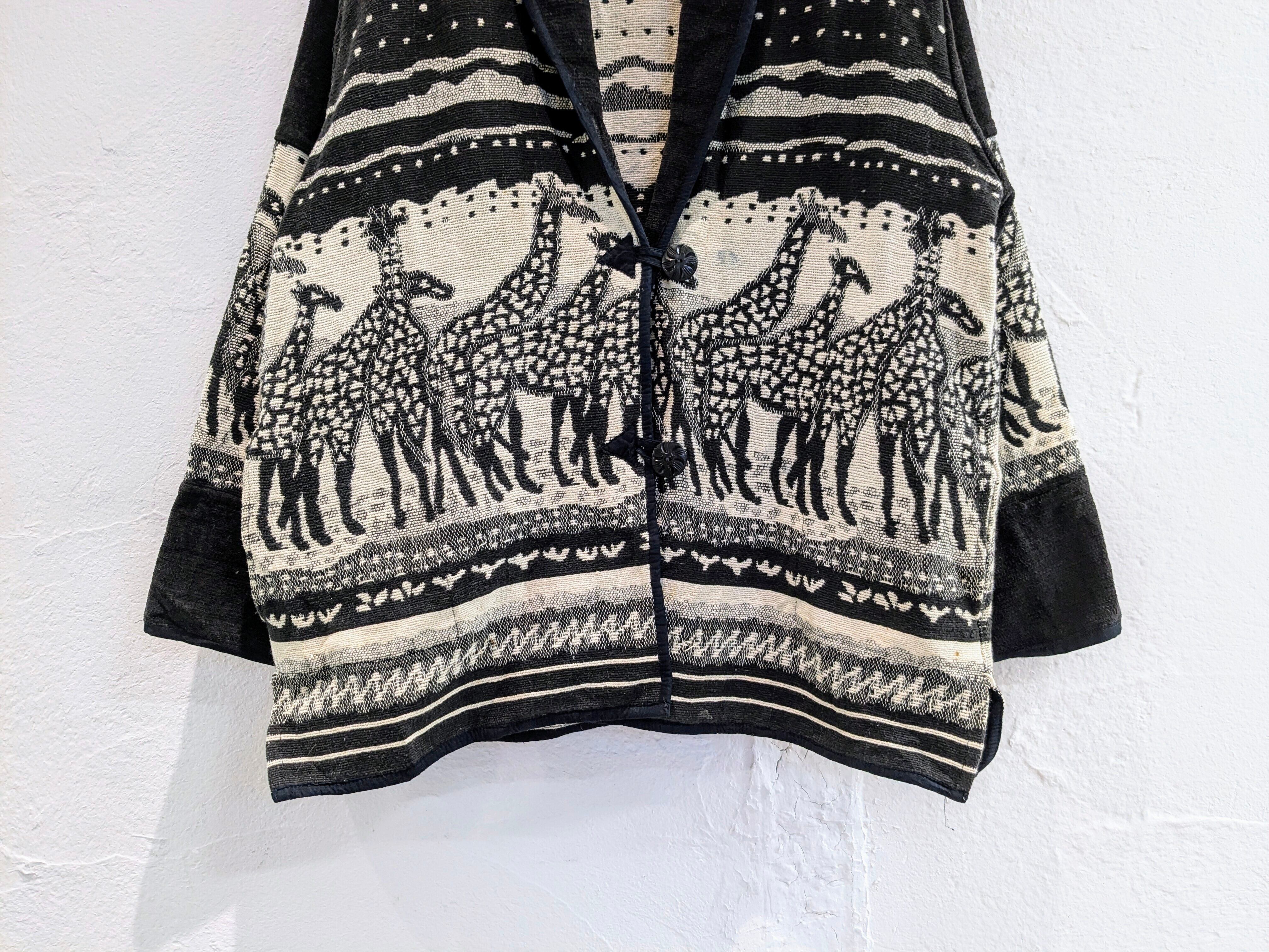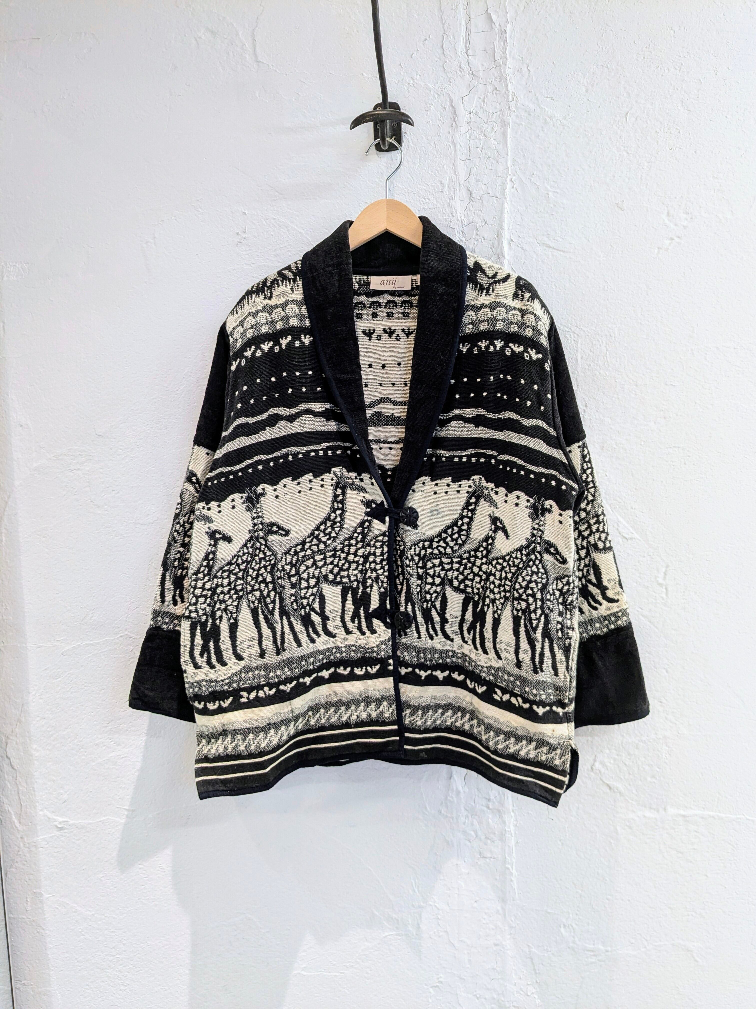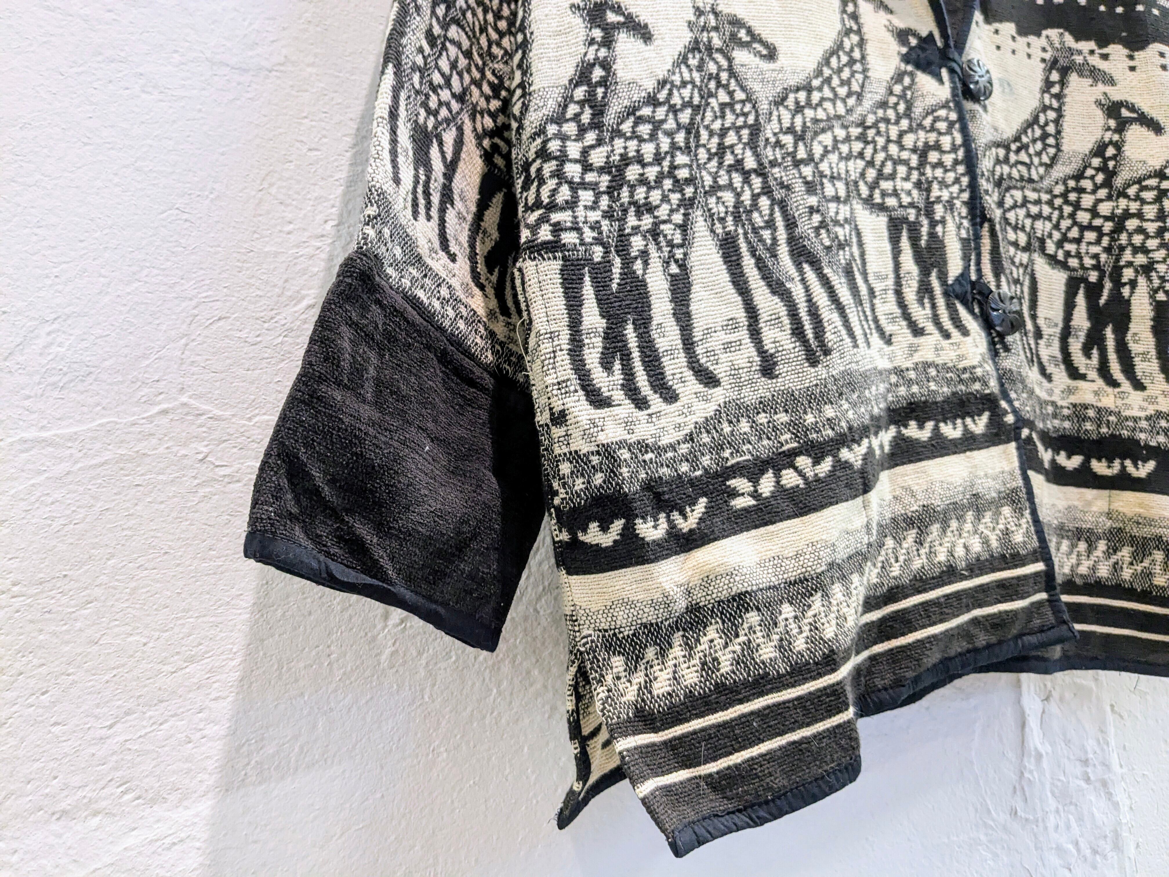 キリンがぐるりと一周しているゴブランジャケット。柄は結構強めですが、モノトーンの配色で意外に落ち着いて着れる一着。腕周り、身幅とゆったりとしているので気合わせも色々としやすいです。シンプルなスタイリングに1個こういったアイテムがあるとスタイリングに幅が出るかと思います。ヨゴレあり。