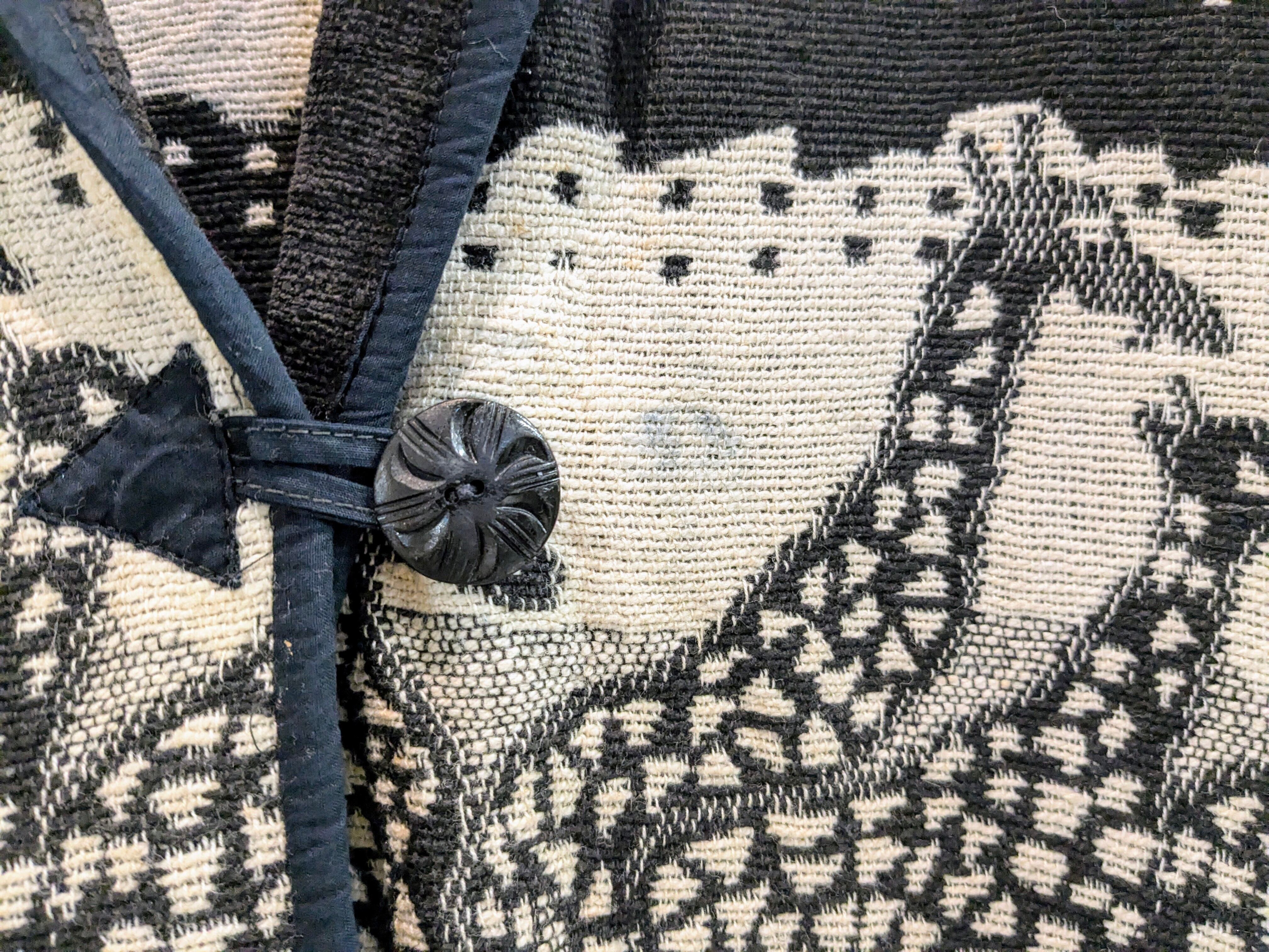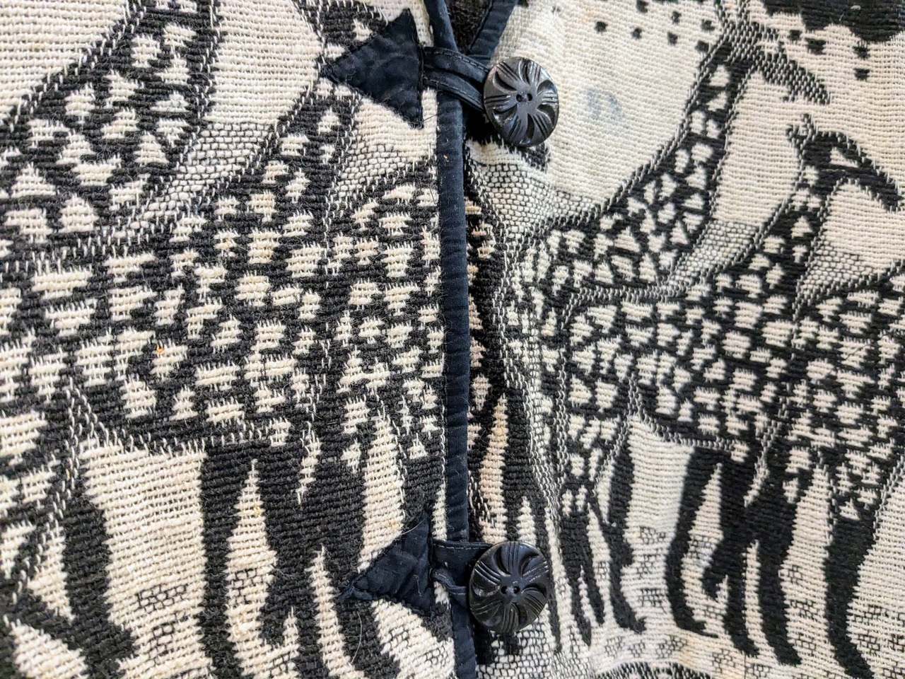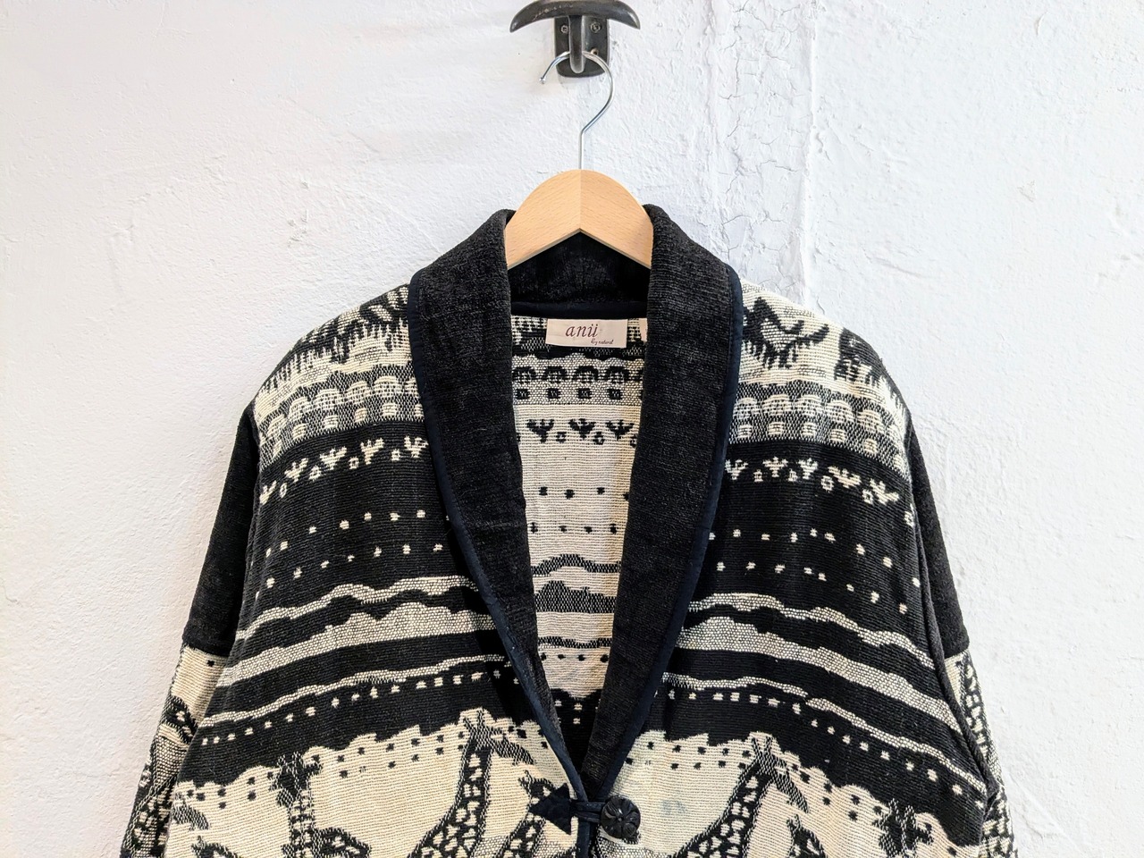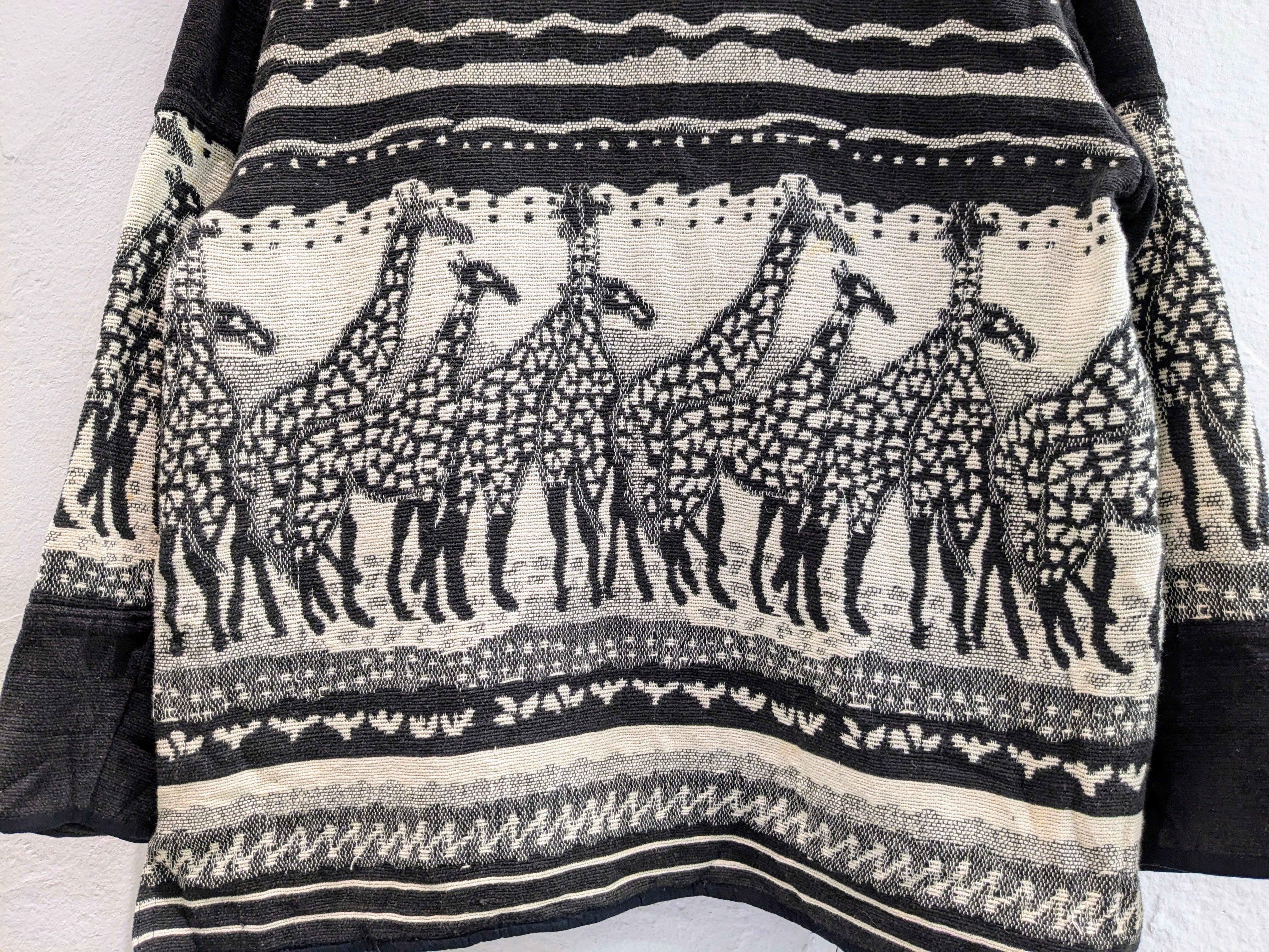 キリンがぐるりと一周しているゴブランジャケット。柄は結構強めですが、モノトーンの配色で意外に落ち着いて着れる一着。腕周り、身幅とゆったりとしているので気合わせも色々としやすいです。シンプルなスタイリングに1個こういったアイテムがあるとスタイリングに幅が出るかと思います。ヨゴレあり。