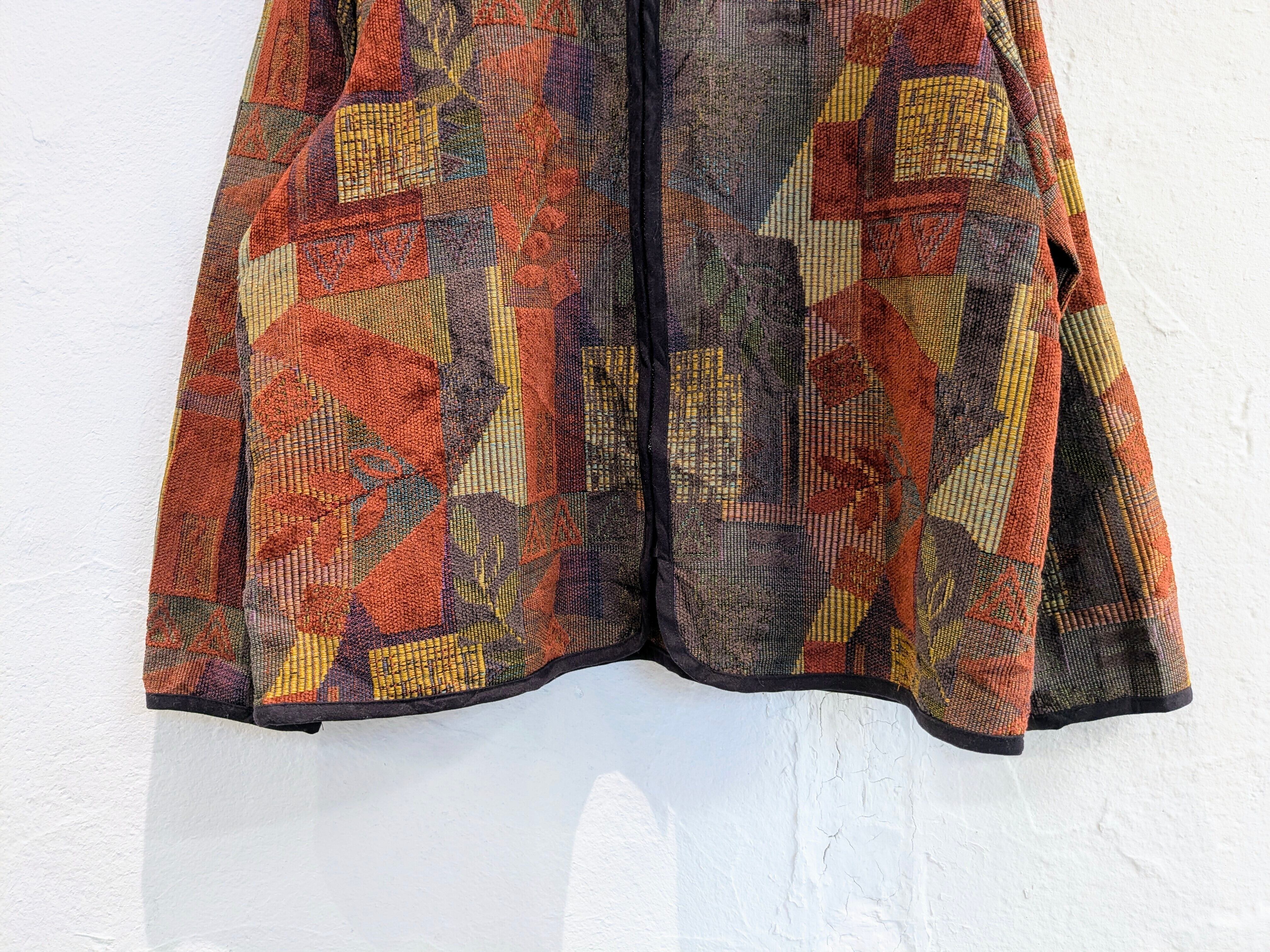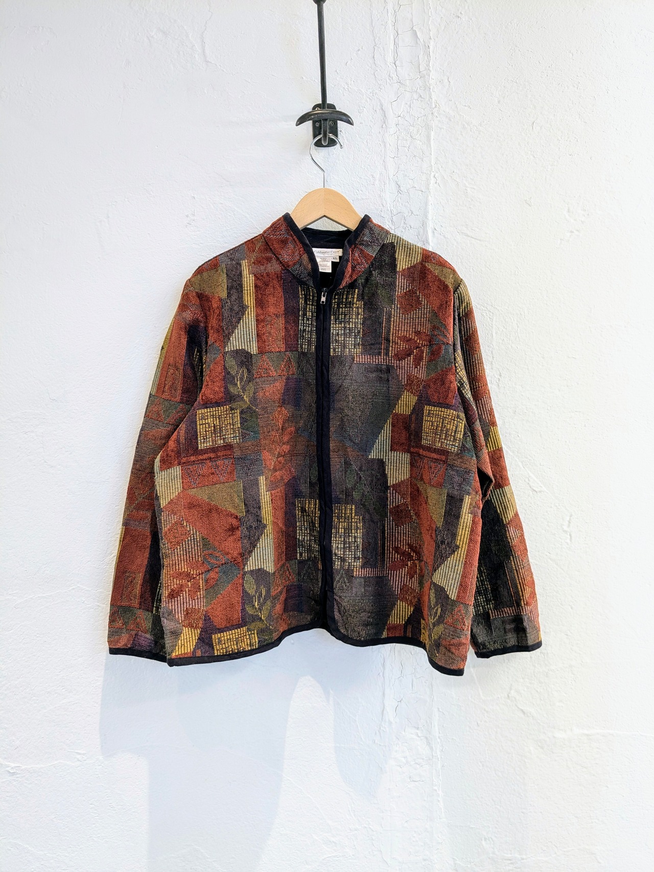 全体的にうっすらですが、葉っぱなど色々な柄が盛り込まれています。全体的に色のトーンは落ち着いたものになりますので、色合わせもしやすく、上品な一着。形はトラックジャケットに近しいモノになります。従来のアディダスなどのスポーティな感じではなく、大人なトラックジャケットに感じていただけます。ゆえに、この上にジャケット、コートなど着ていただくのもいいかと。