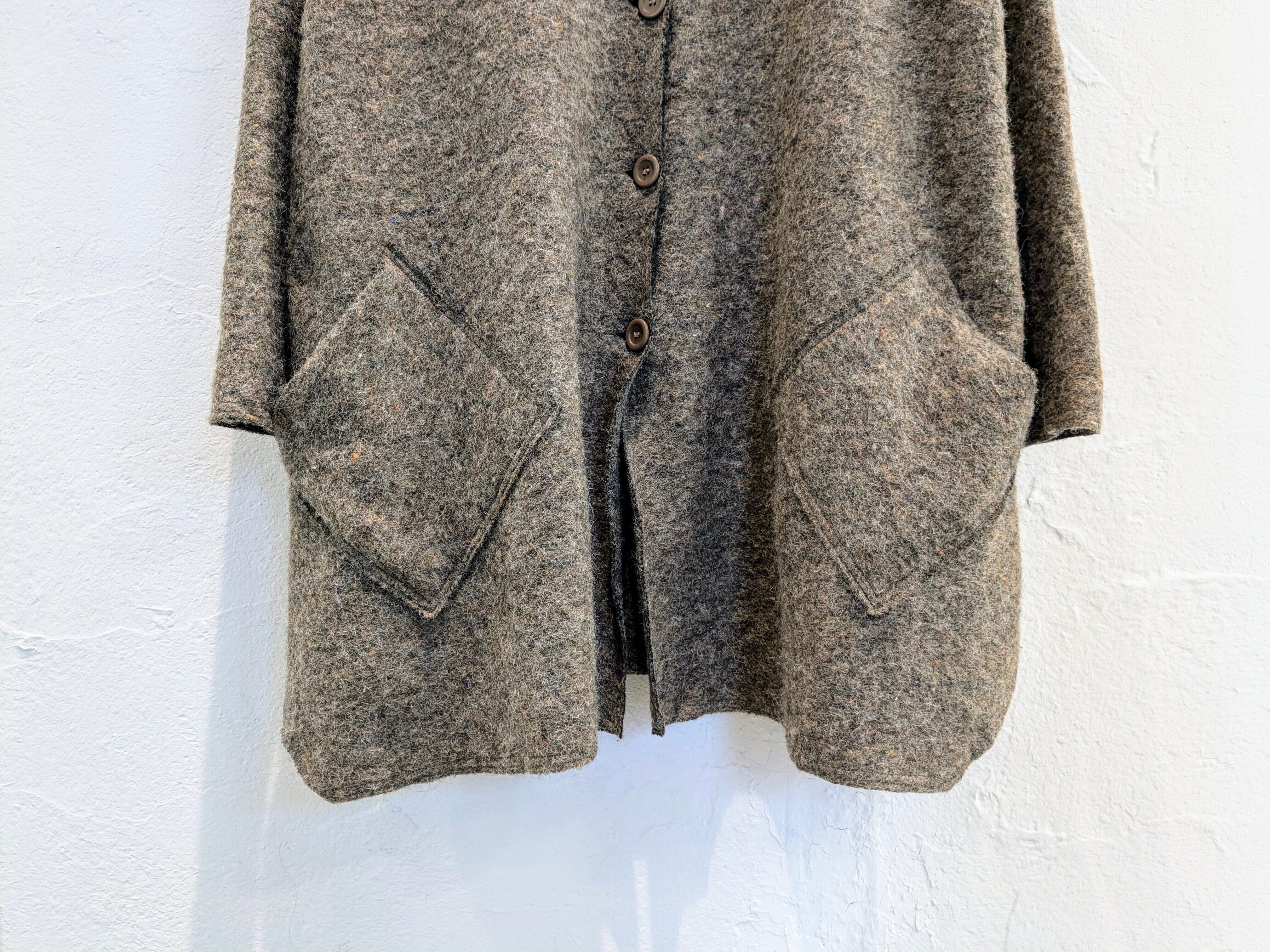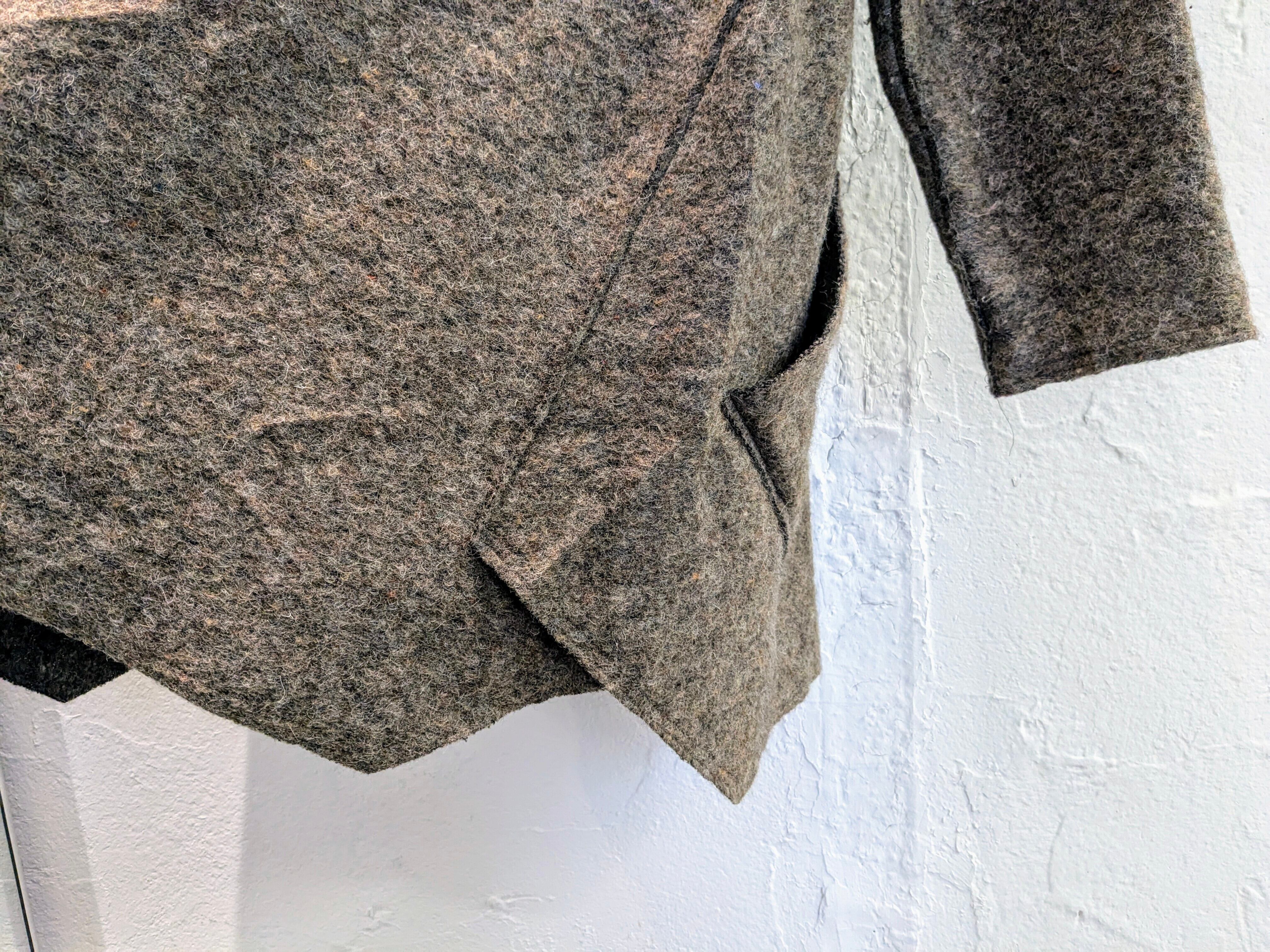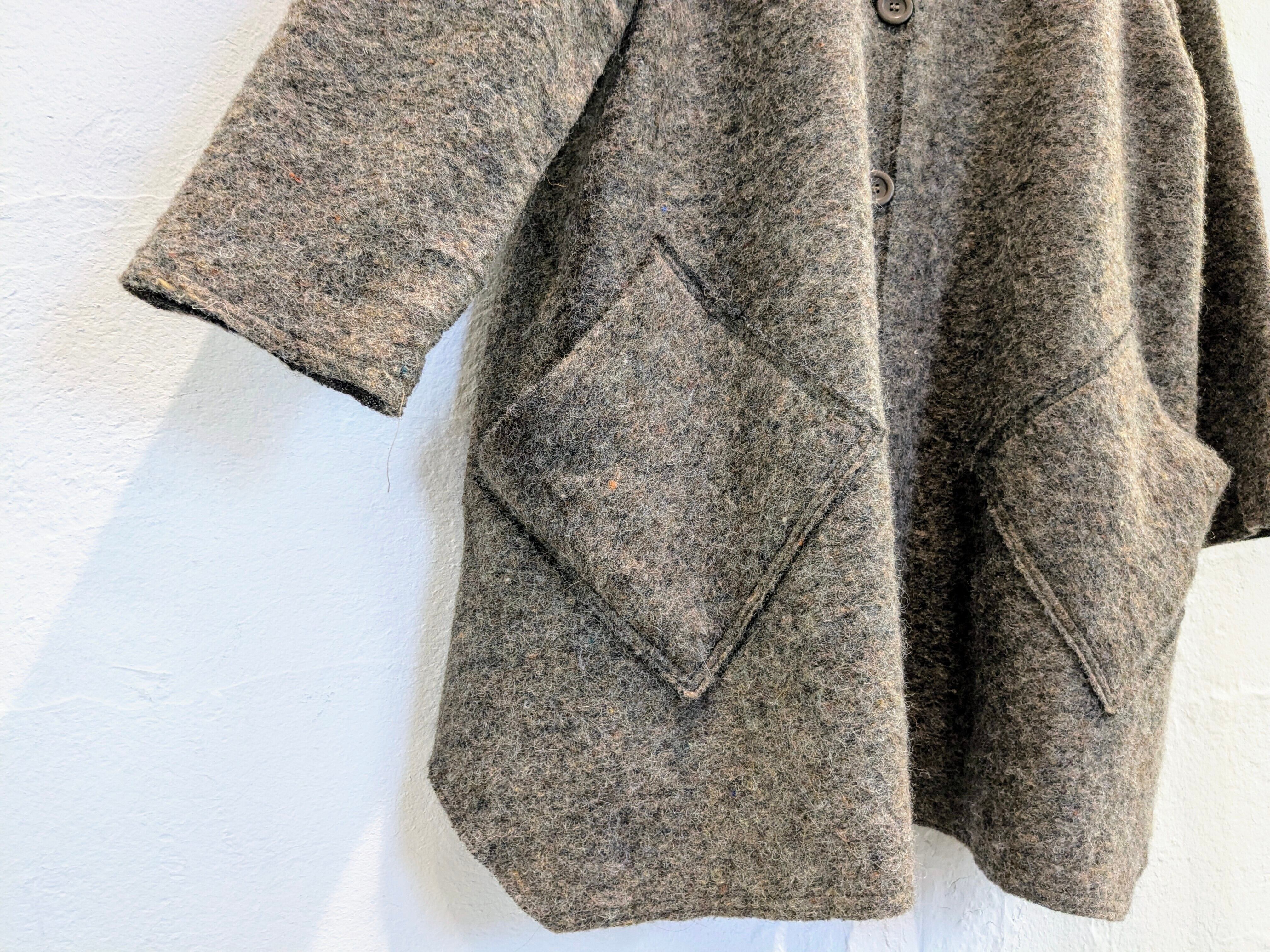 ブランケット、フェルト生地となっています。とても軽く着やすく、色も単色ではなく多色に見え、着やすさとデザイン性を兼ね備えた一着。また、ポケットの付け方、生地の縫い合わせ、カッティングなども特徴的で要所にお洒落ポイントが詰め込まれたアイテム。