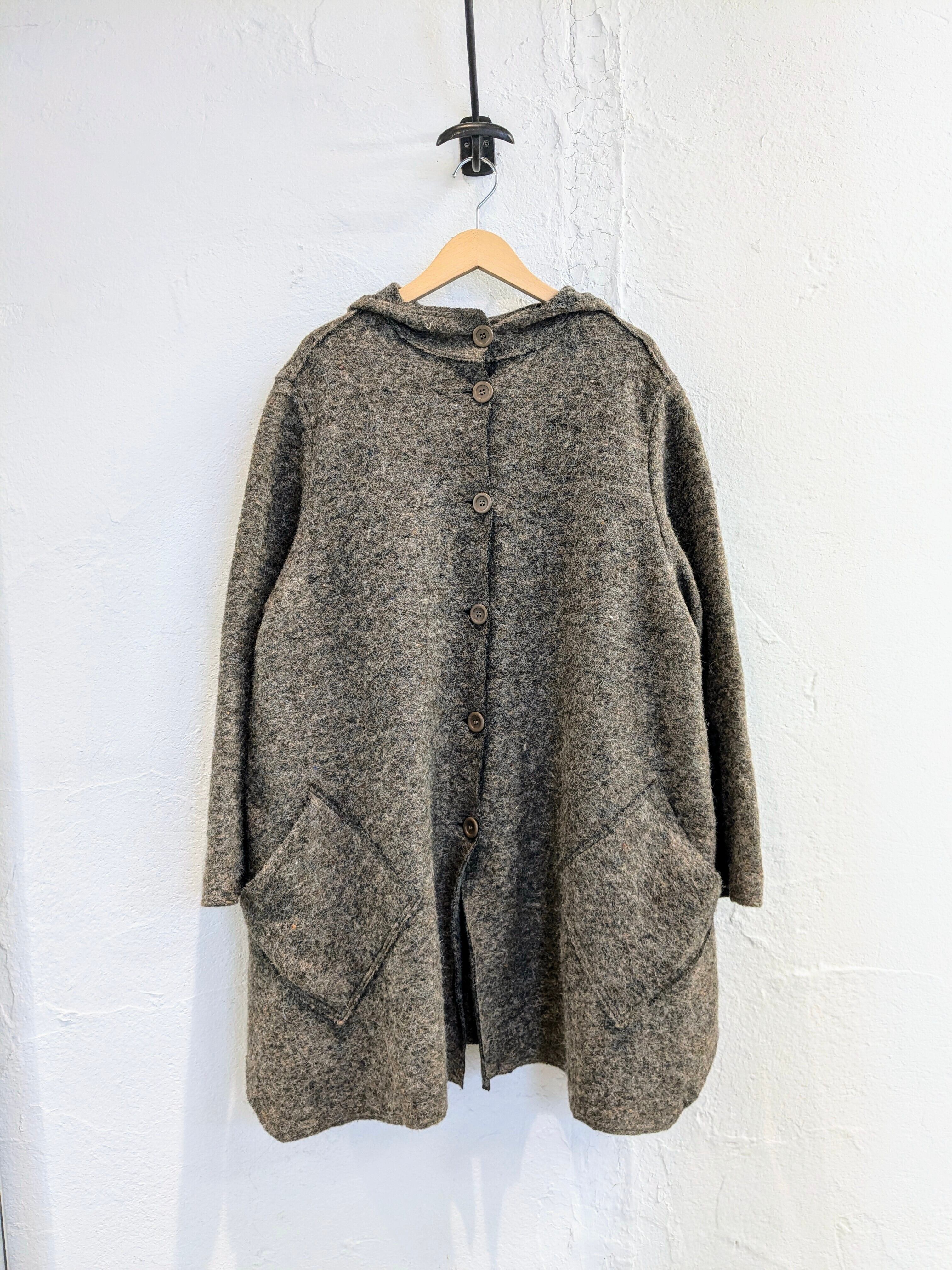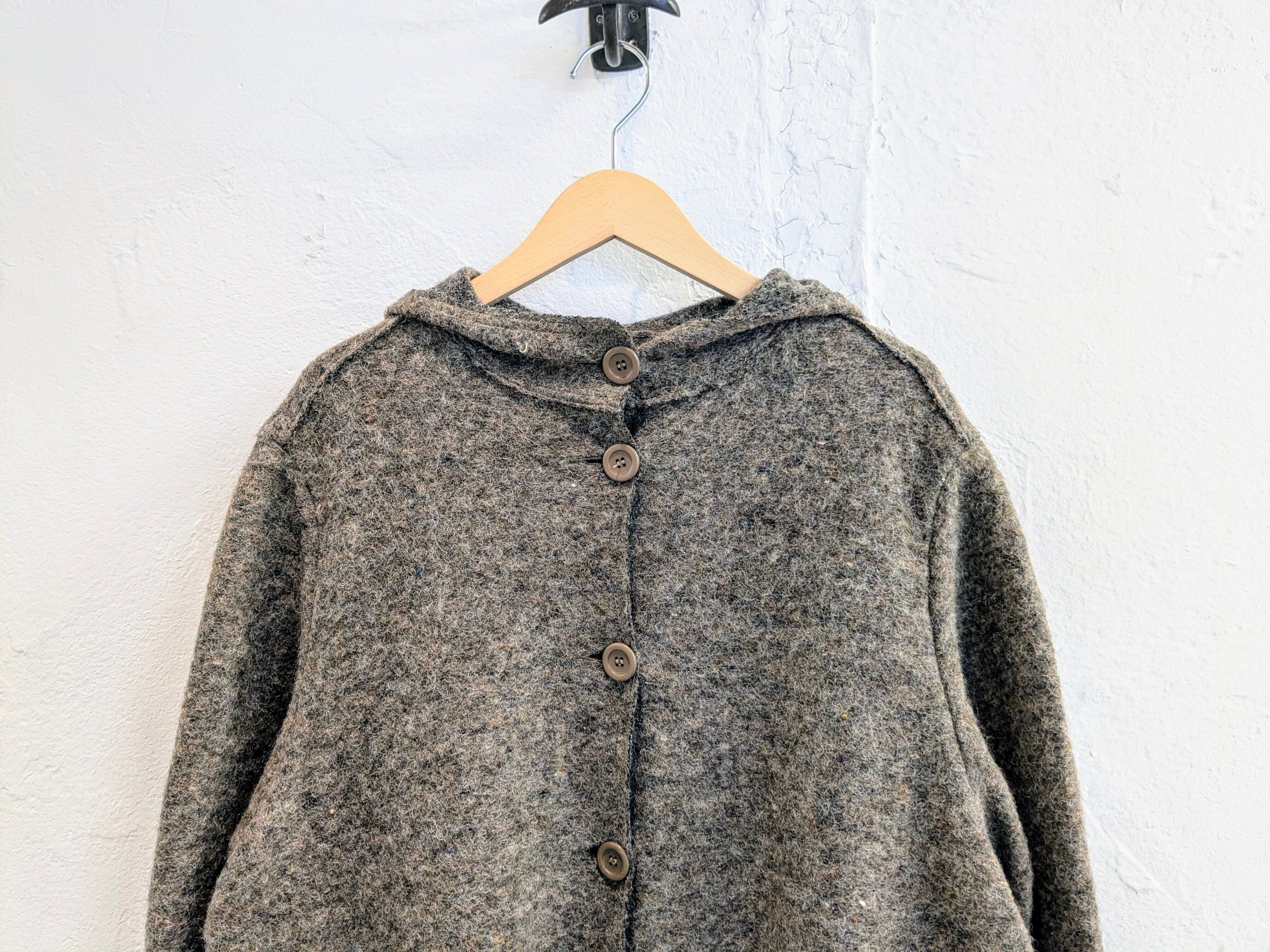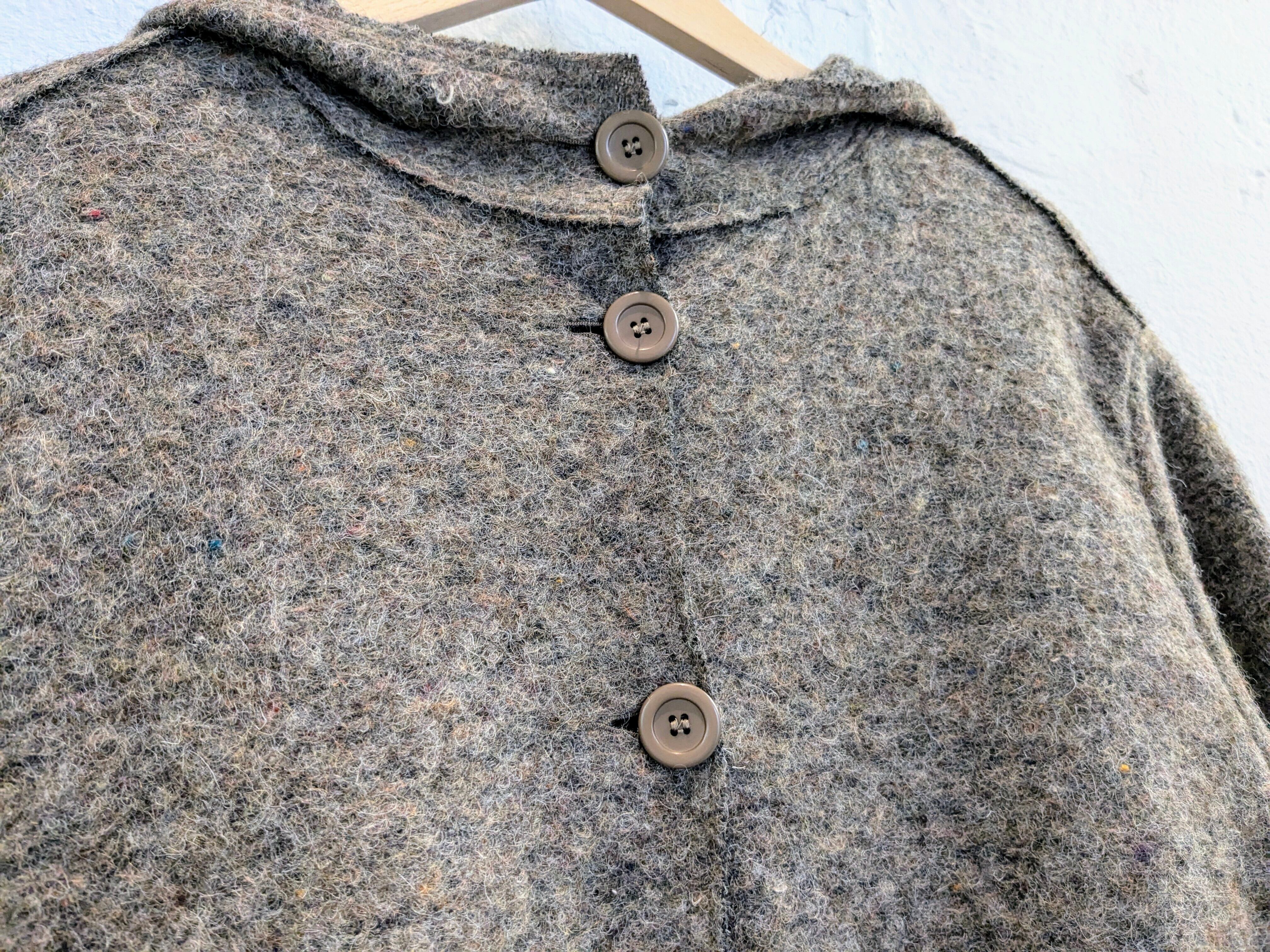 ブランケット、フェルト生地となっています。とても軽く着やすく、色も単色ではなく多色に見え、着やすさとデザイン性を兼ね備えた一着。また、ポケットの付け方、生地の縫い合わせ、カッティングなども特徴的で要所にお洒落ポイントが詰め込まれたアイテム。