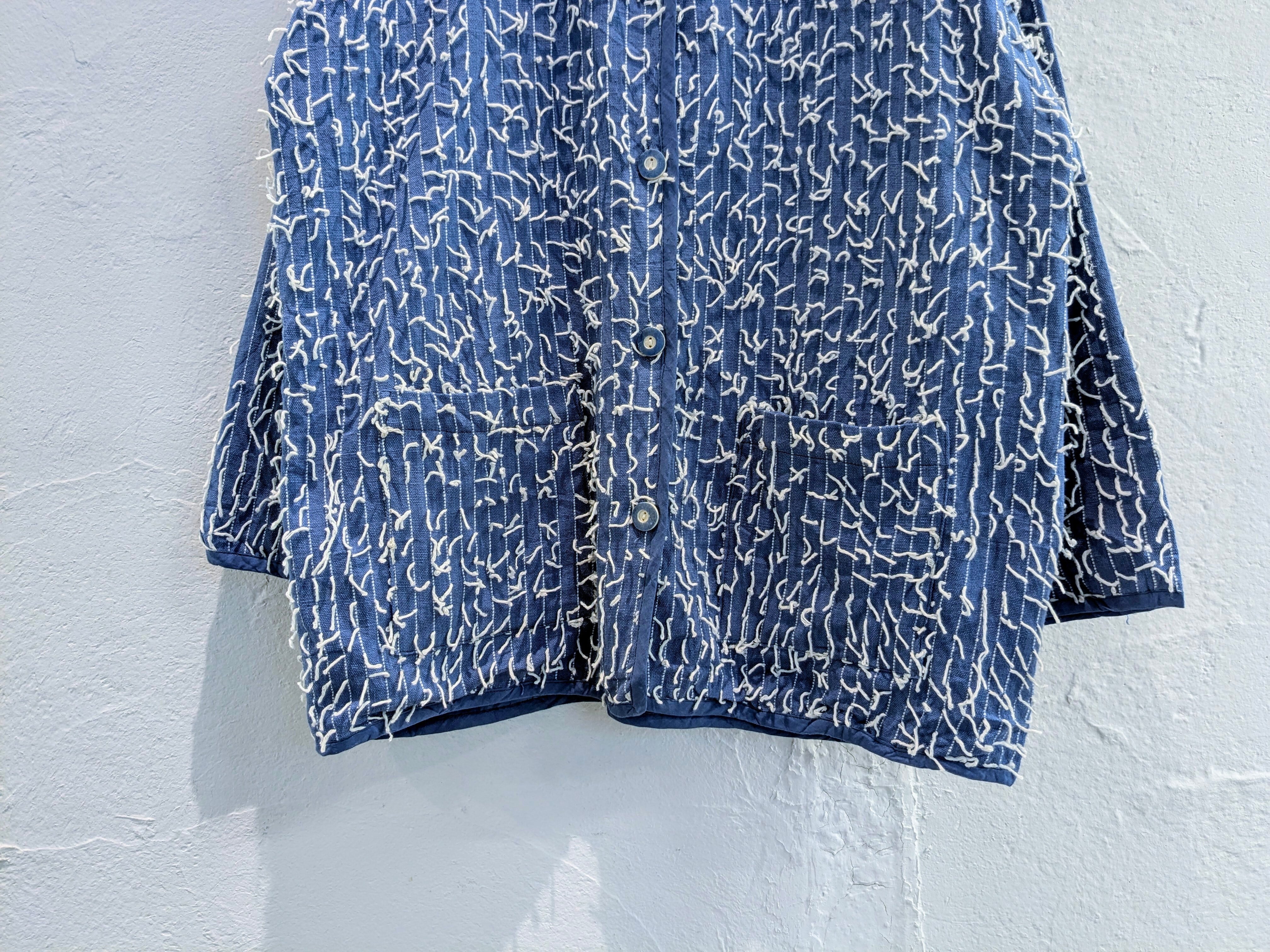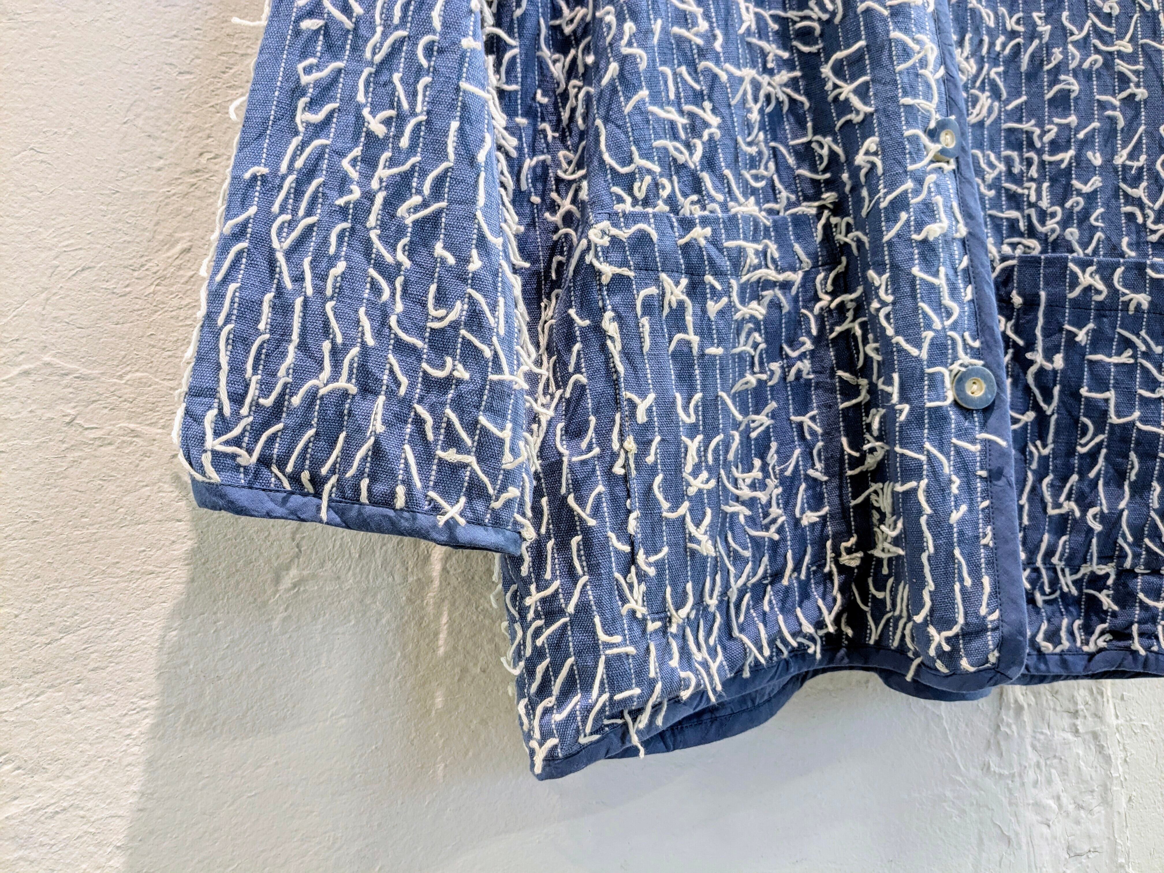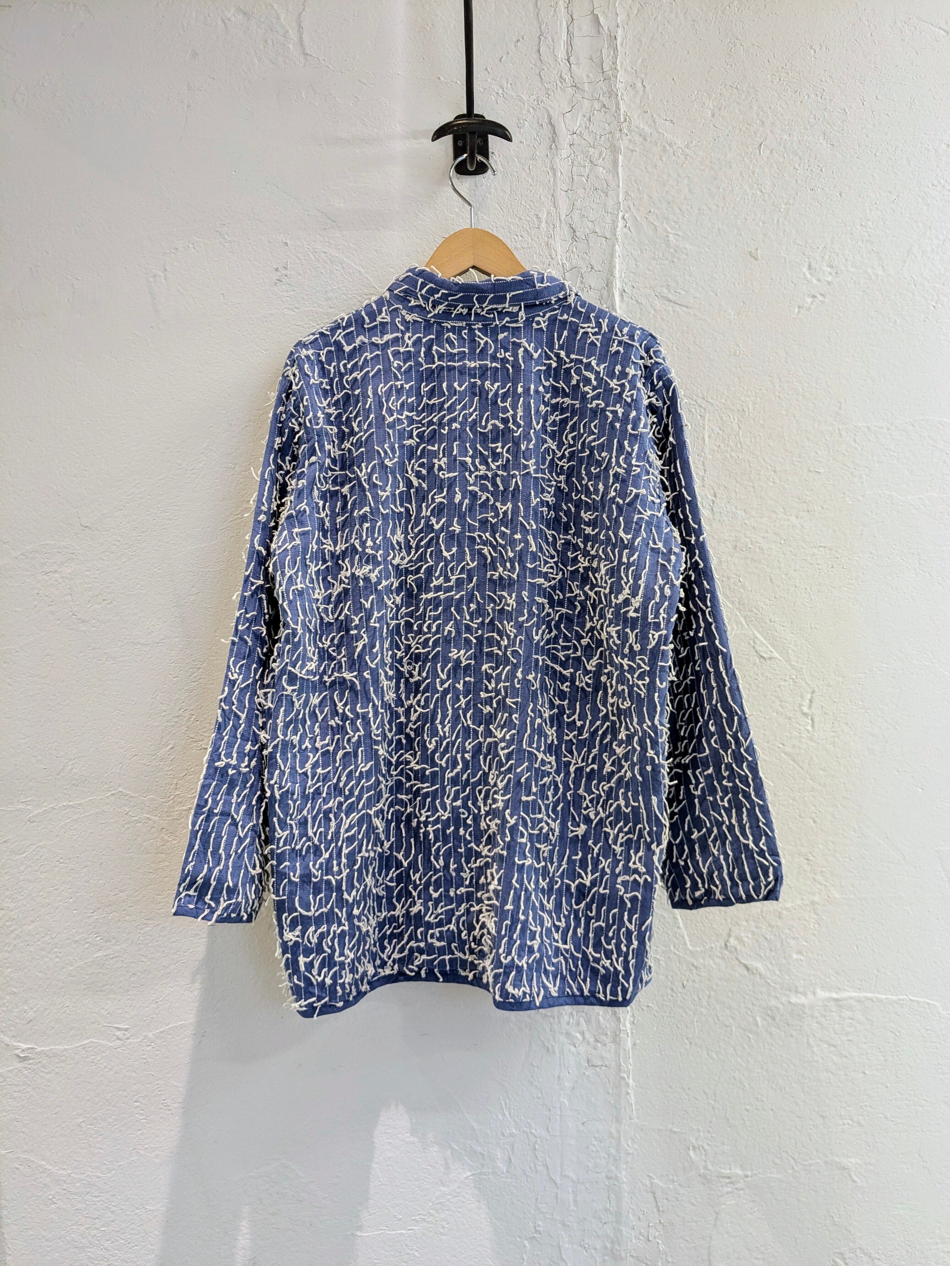 インド製のランダムに糸が飛び出しているデザインのブルゾンになります。シャツのような生地感ですが、裏地が張ってありますので、ハリ感のあるモノになります。形はカバーオールに近いデザインになります。不規則に糸が飛び出しているデザインが斬新でとてもデザイン性があります。こちらは紙タグ付きでデッドストックのモノになっています。