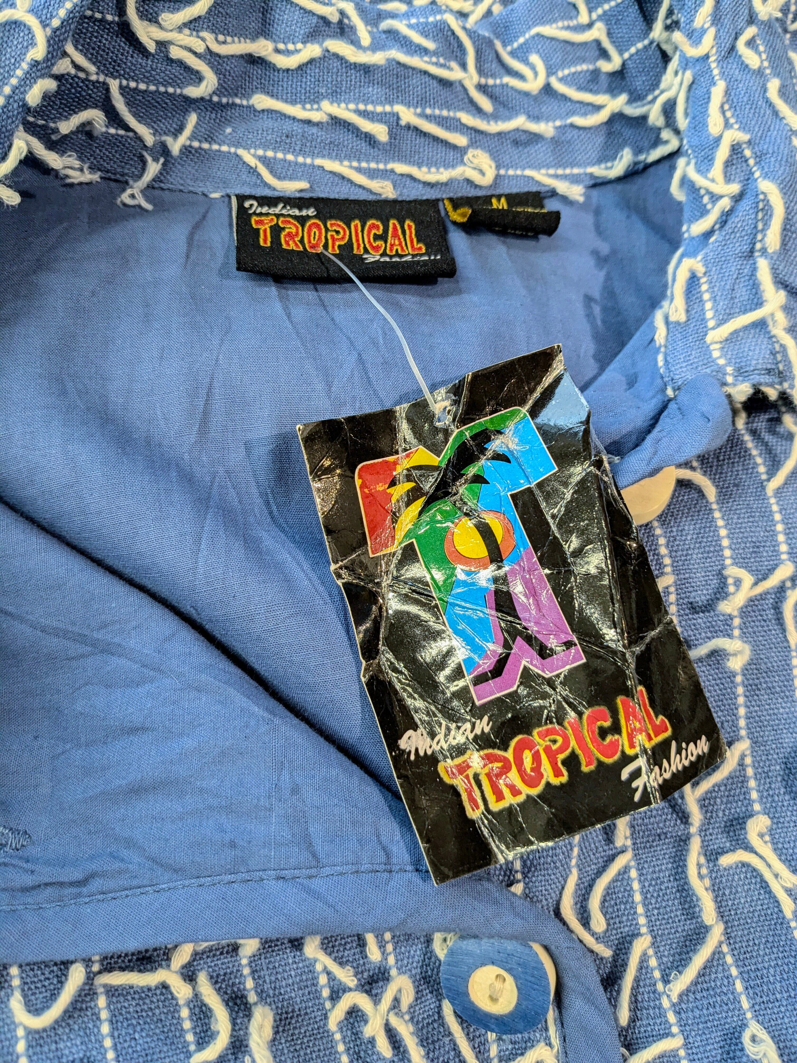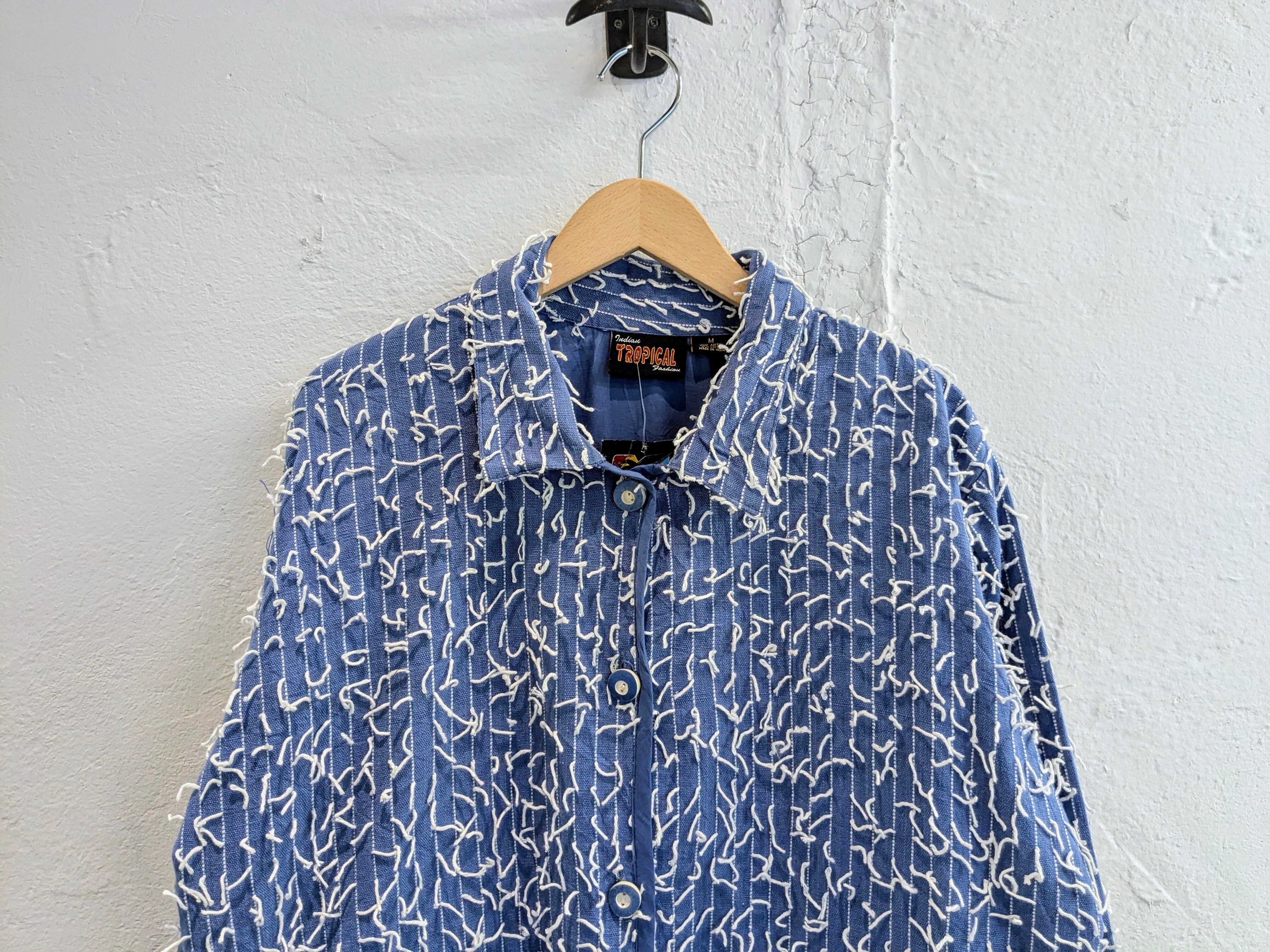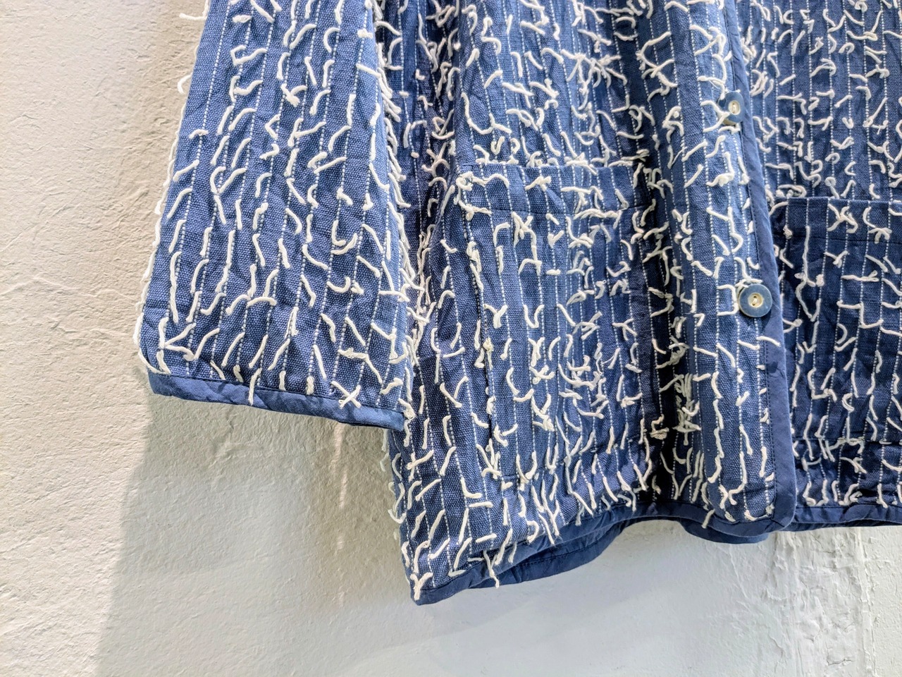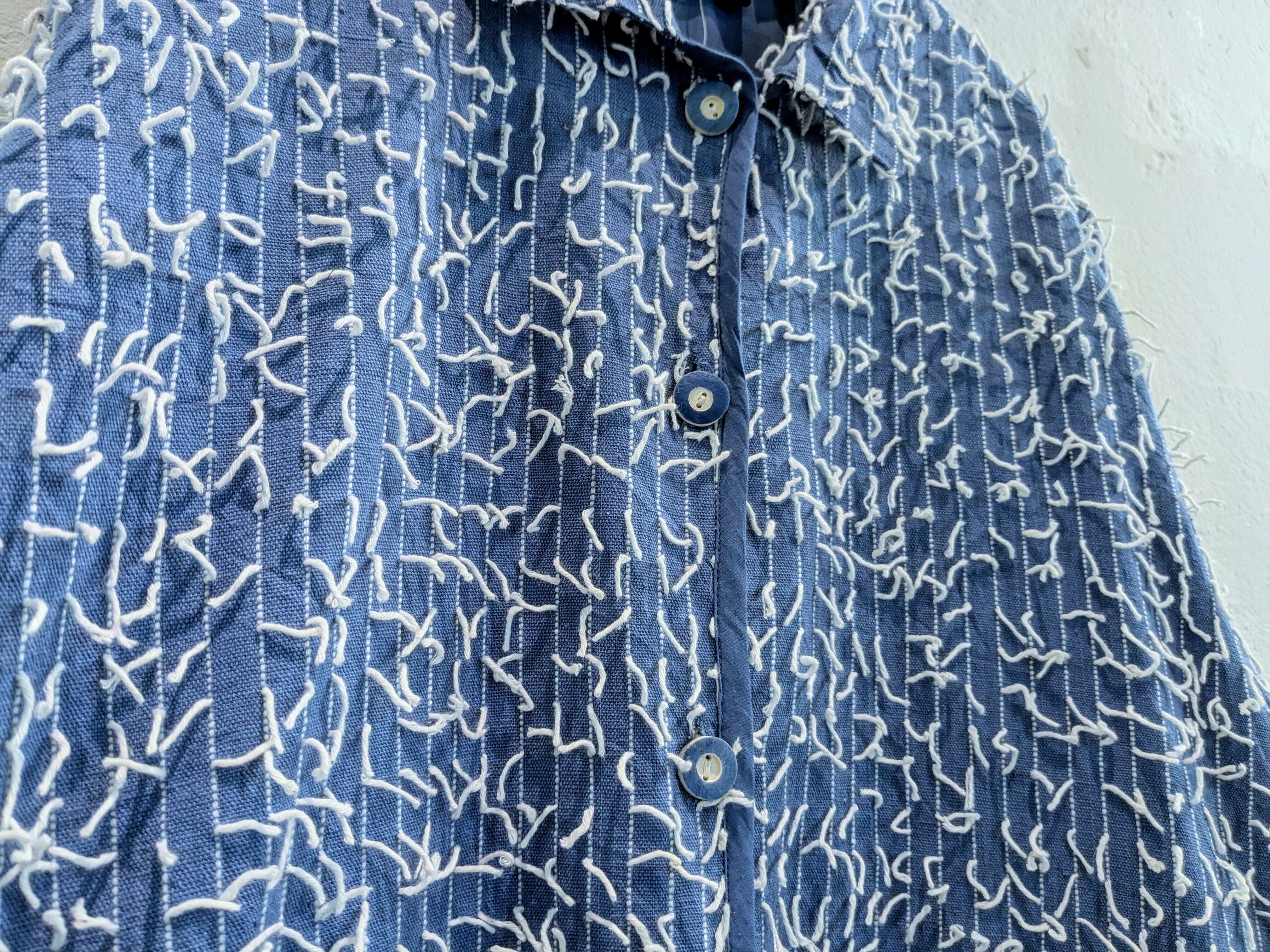 インド製のランダムに糸が飛び出しているデザインのブルゾンになります。シャツのような生地感ですが、裏地が張ってありますので、ハリ感のあるモノになります。形はカバーオールに近いデザインになります。不規則に糸が飛び出しているデザインが斬新でとてもデザイン性があります。こちらは紙タグ付きでデッドストックのモノになっています。